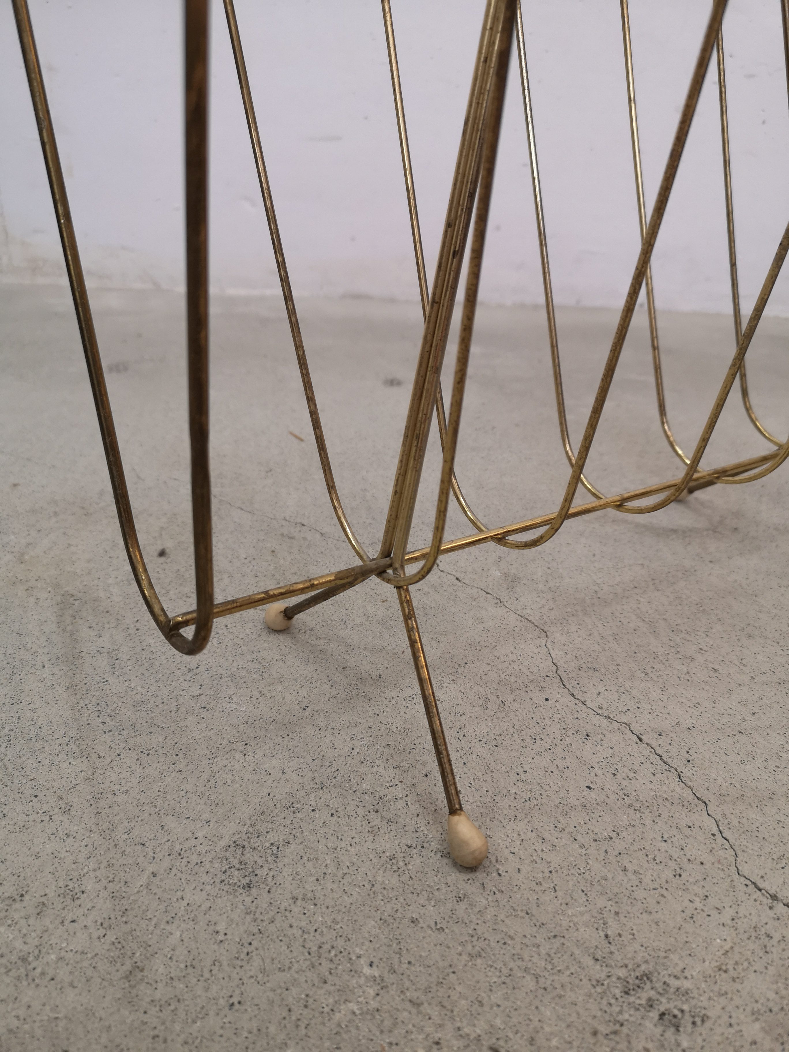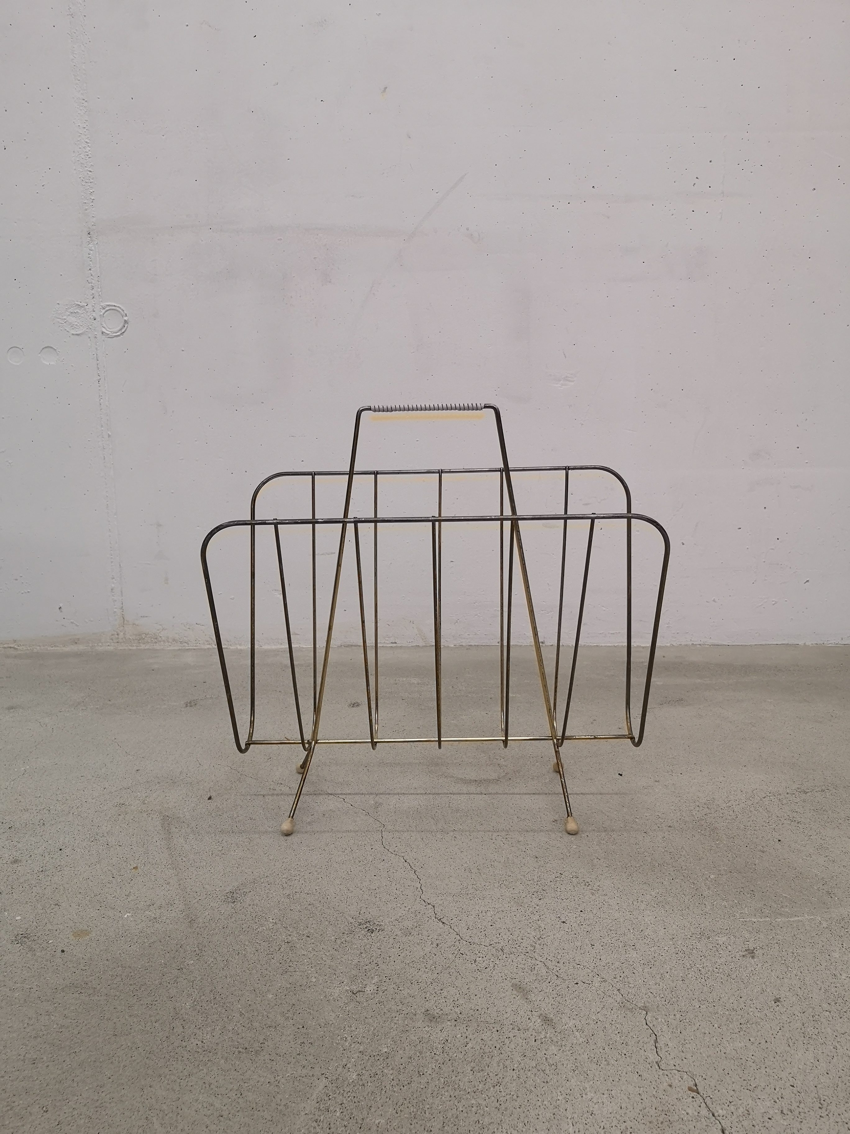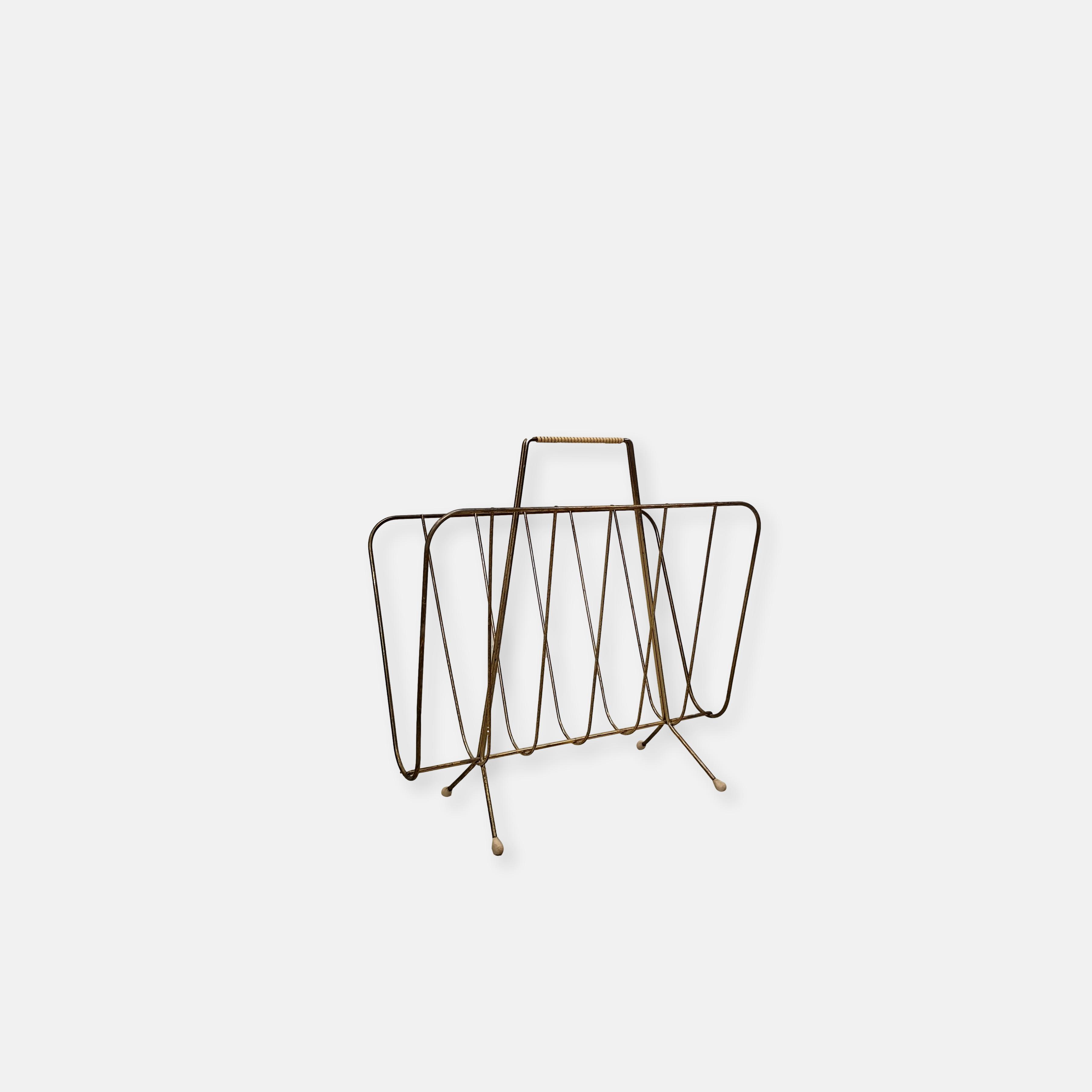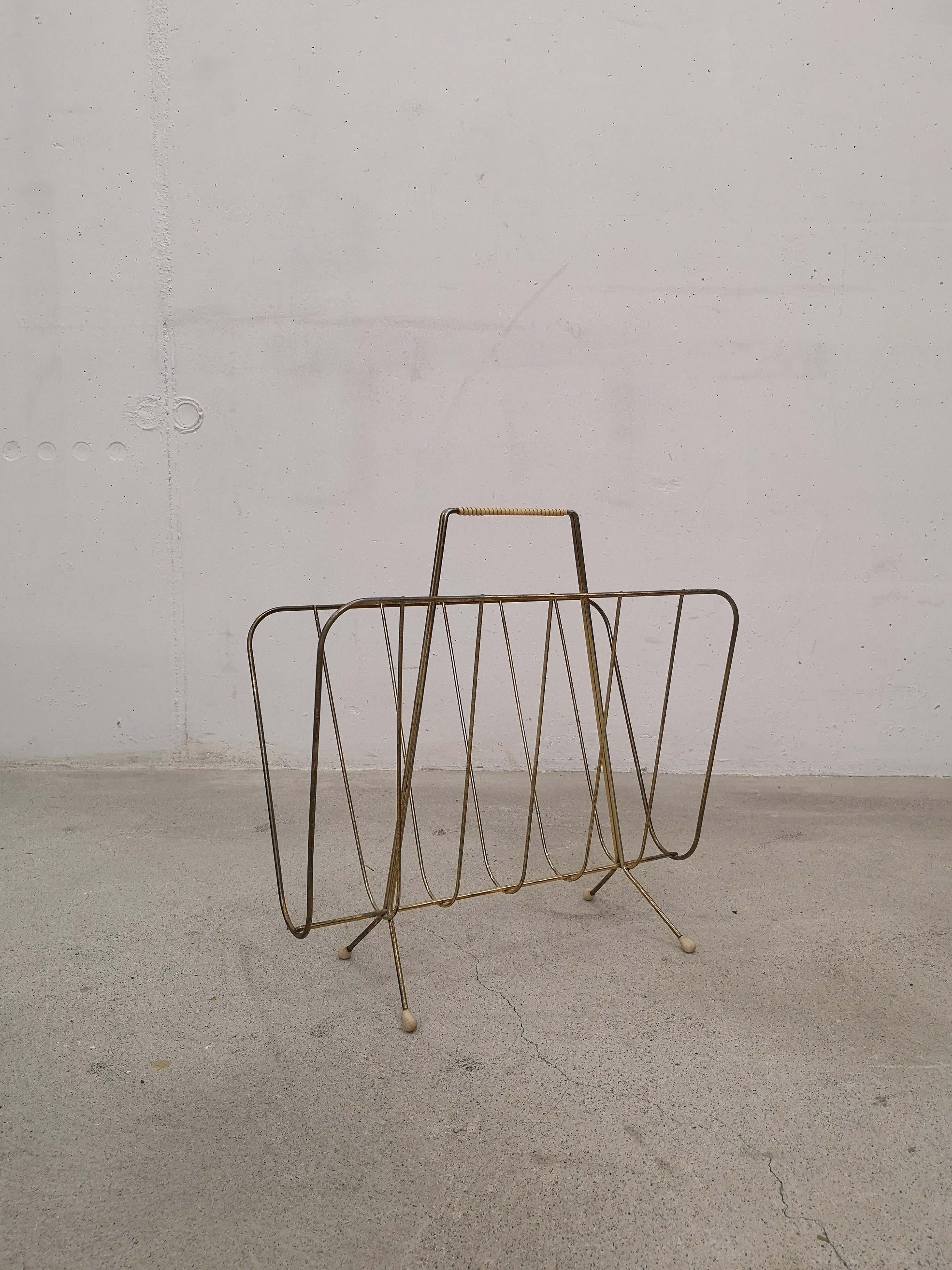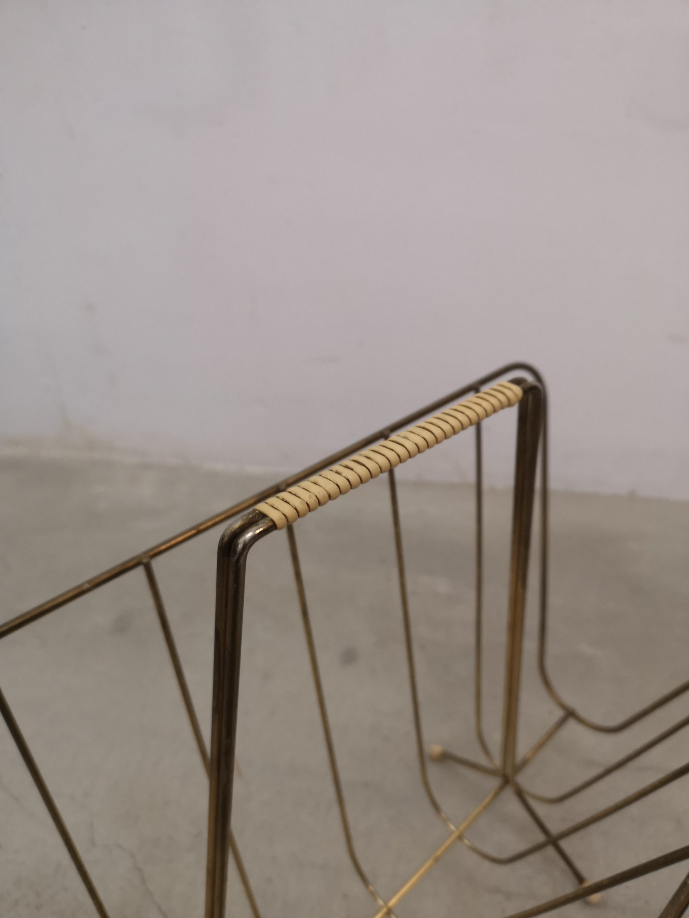Produit venduPorte-journaux en métal laitonné et poignée en scoubidou. Le métal n’est plus trop laitonné et est piqué à plusieurs endroits.