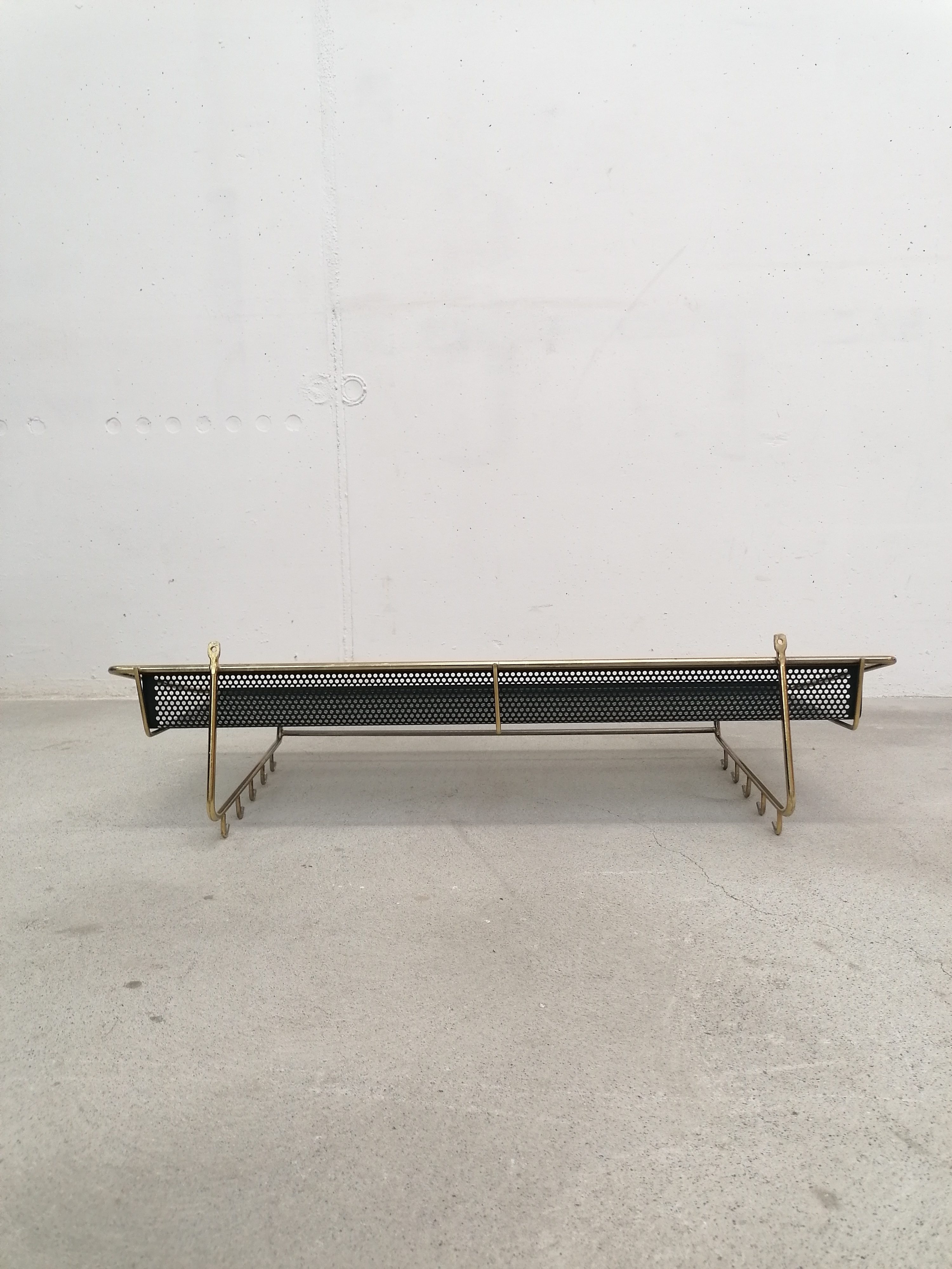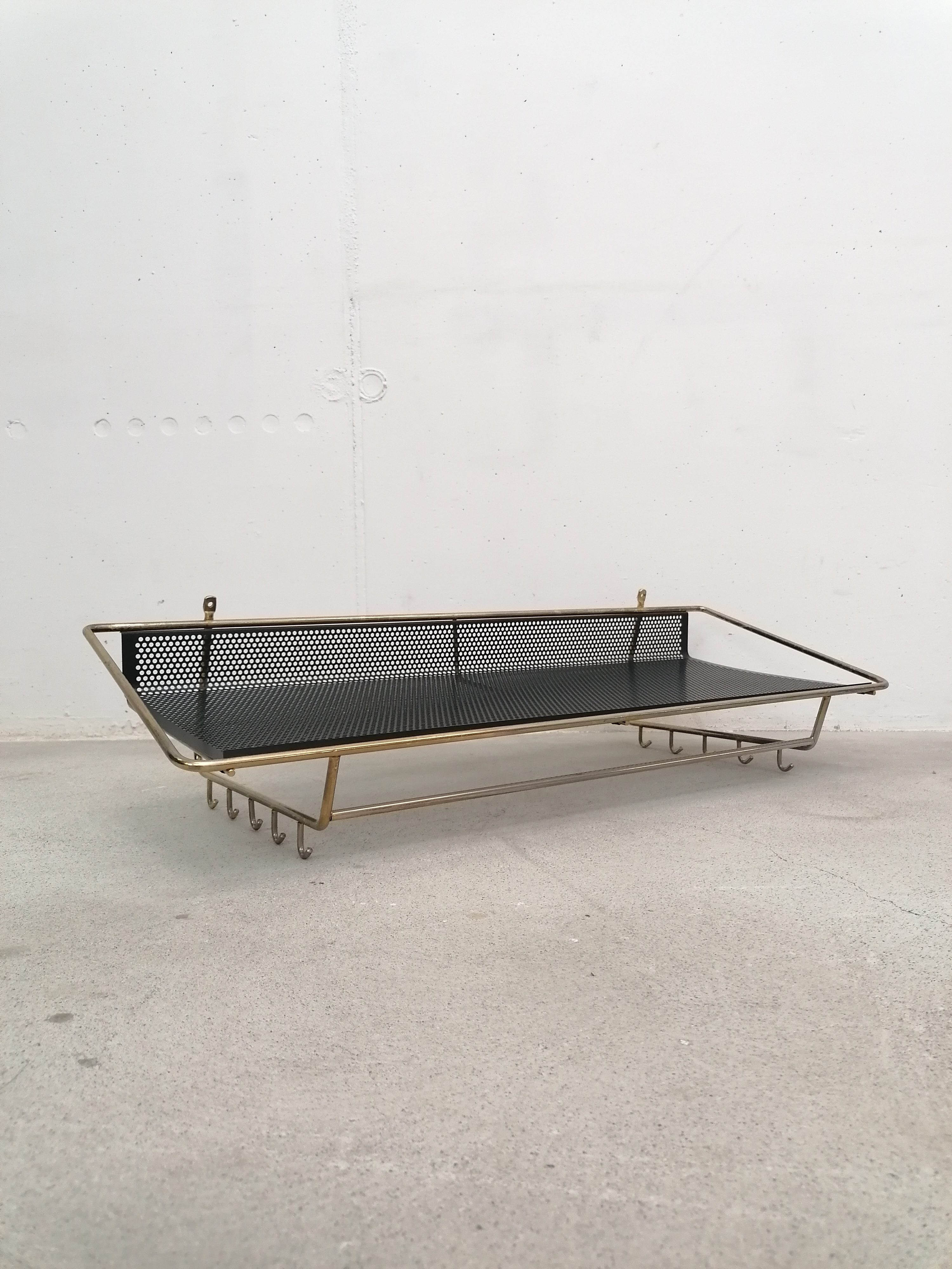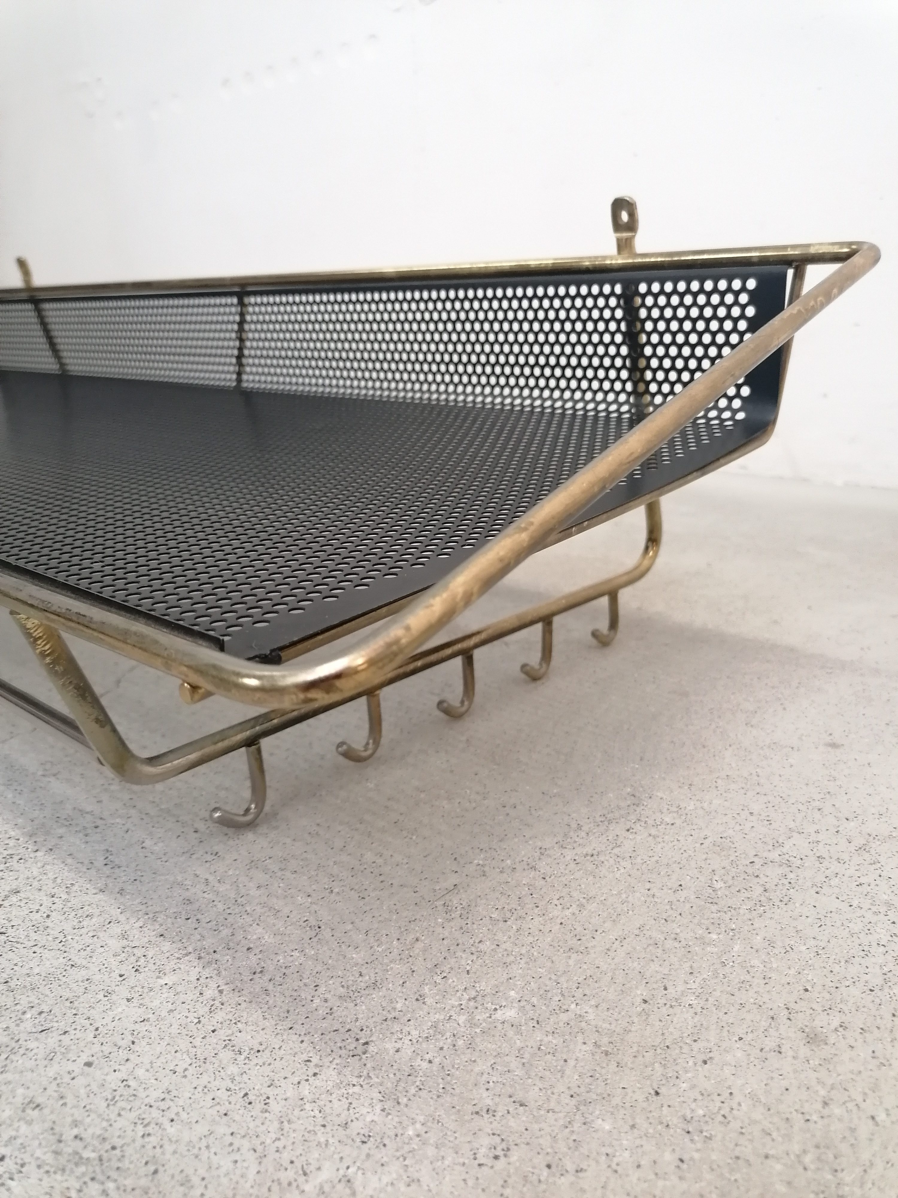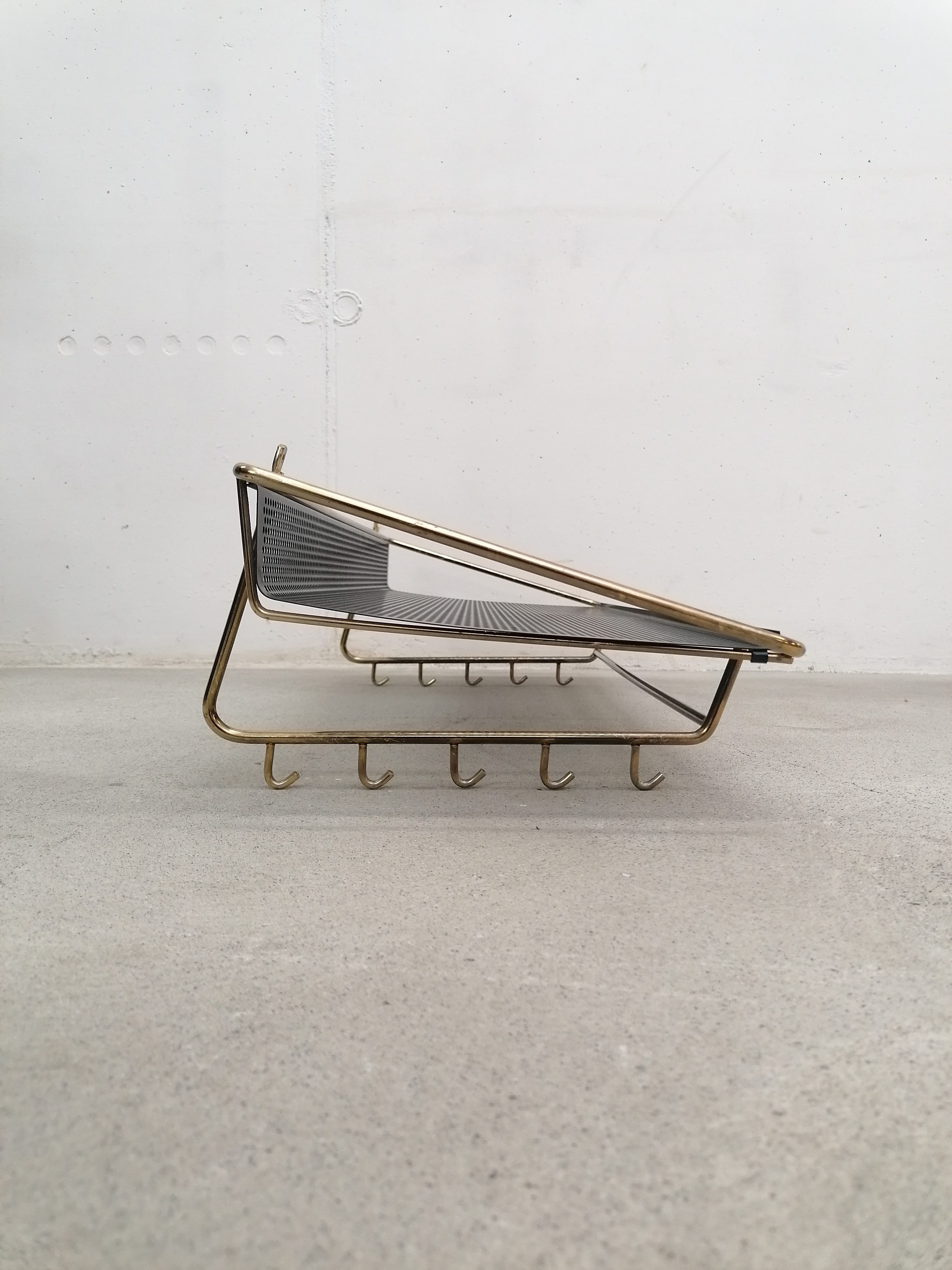 Porte-manteaux vintage en métal laitonné et métal perforé. Doté de 10 crochets sur les côtés et d’un plateau en métal perforé. À certains endroits le métal n’est plus laitonné (voir photos), le métal perforé est en parfait état. Stable et solide et très élégant.
