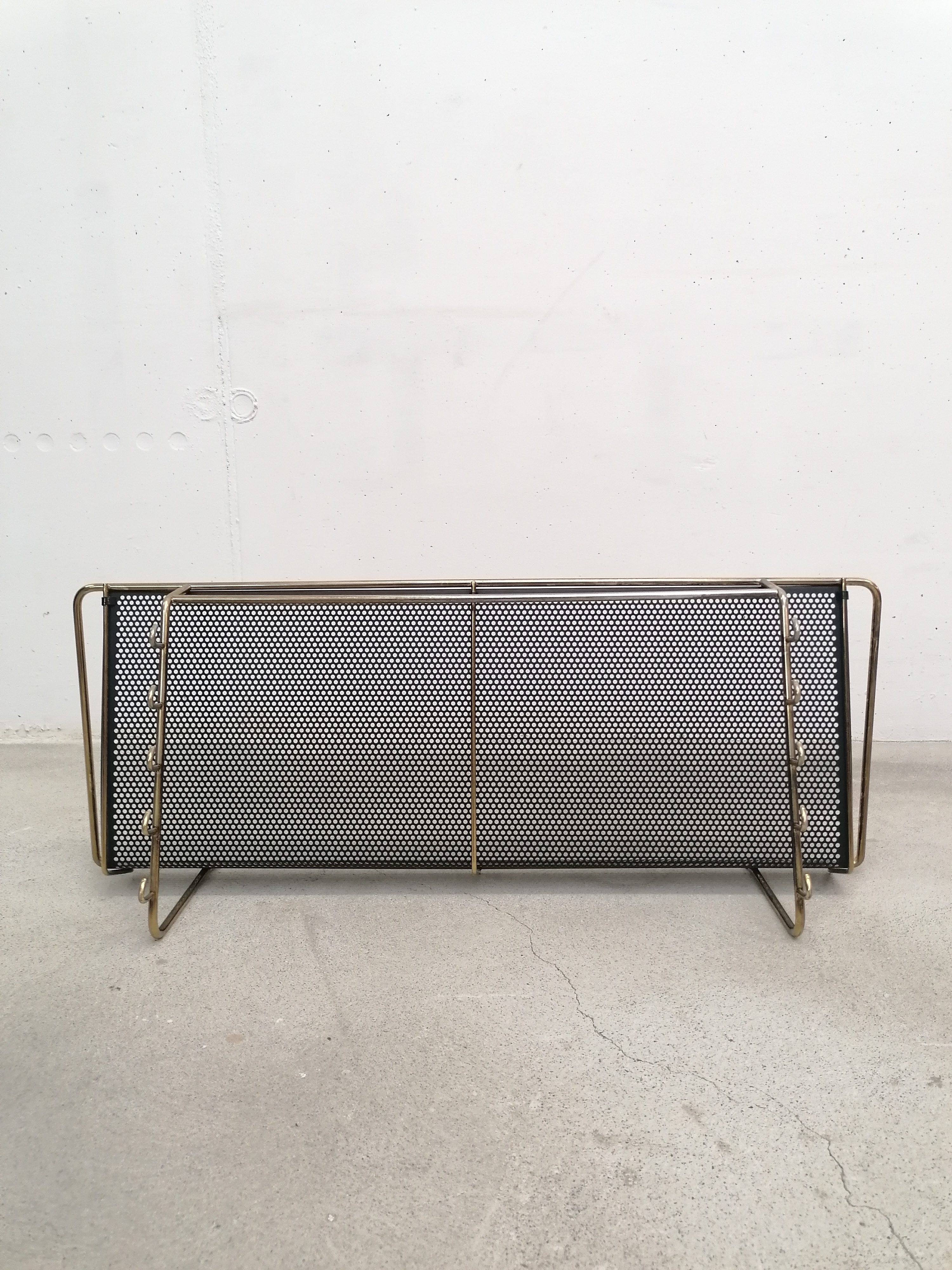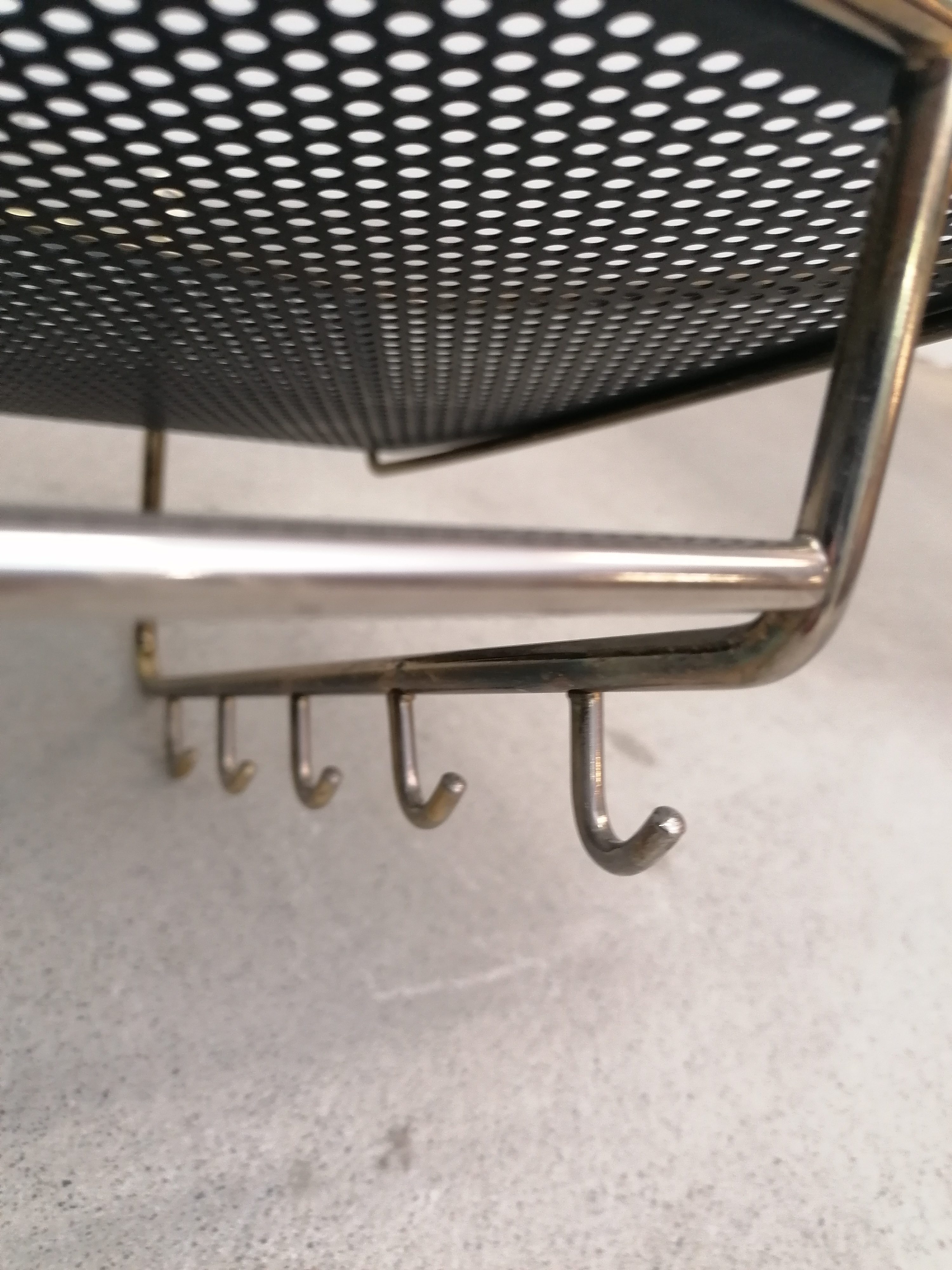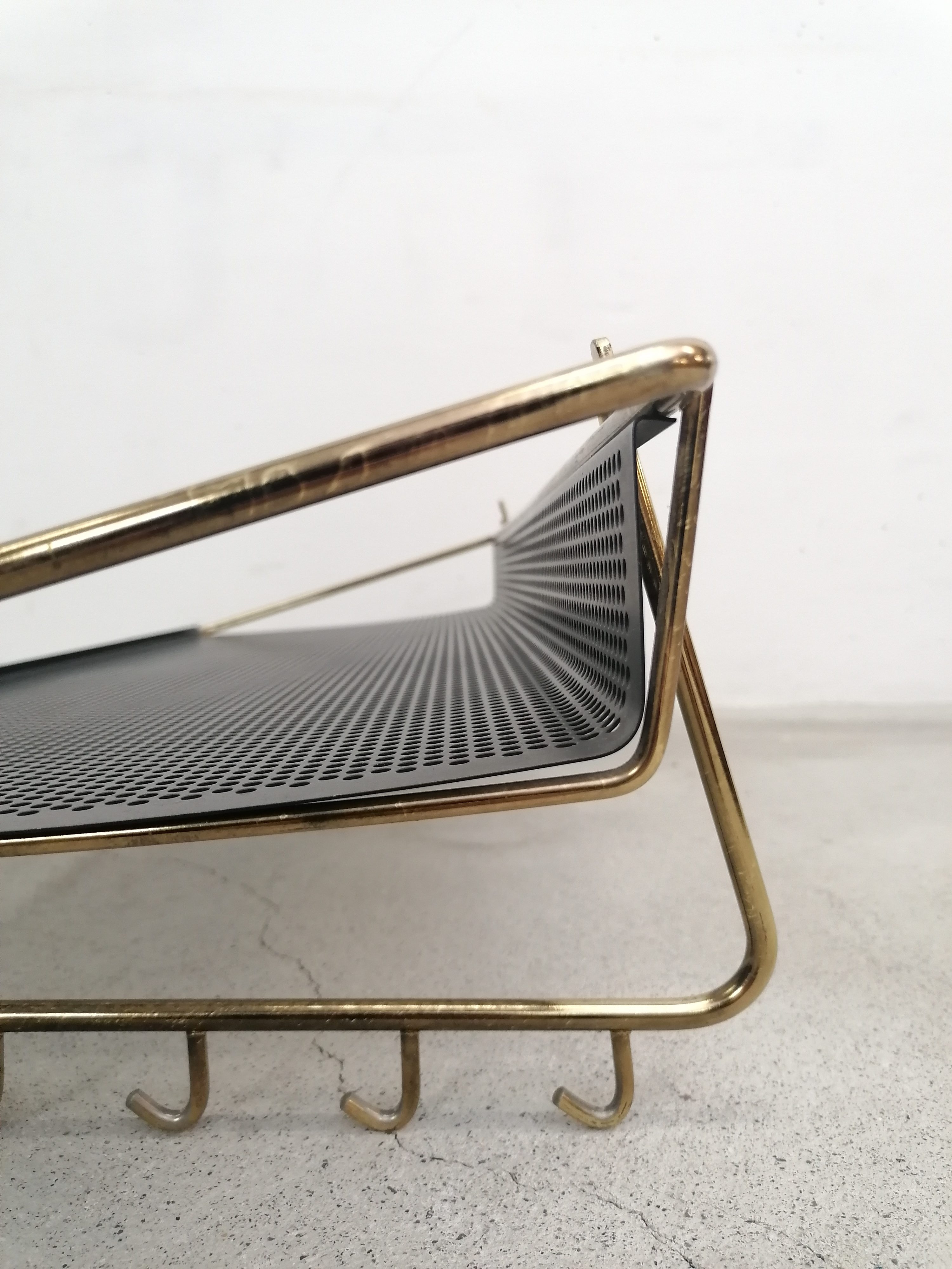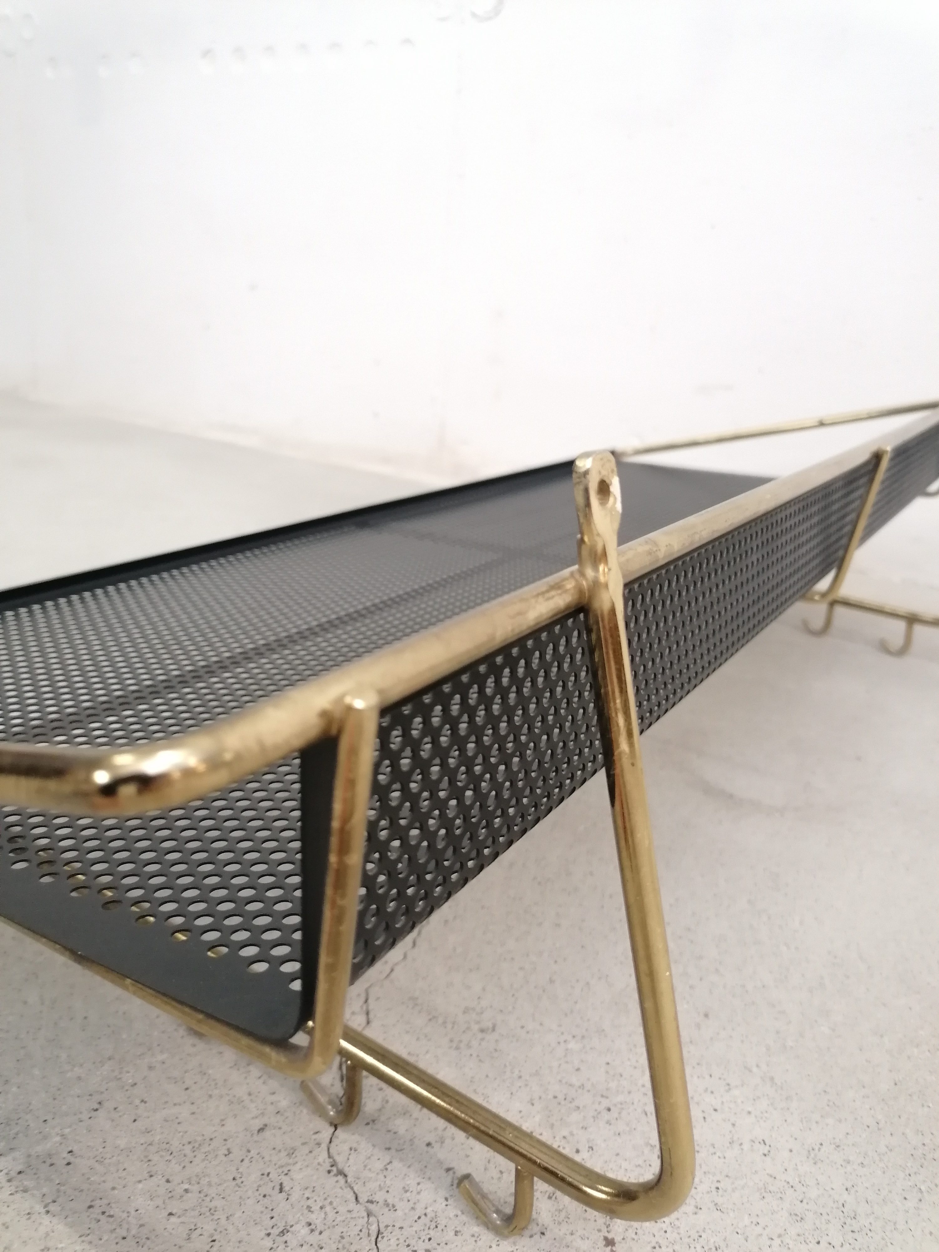 Porte-manteaux vintage en métal laitonné et métal perforé. Doté de 10 crochets sur les côtés et d’un plateau en métal perforé. À certains endroits le métal n’est plus laitonné (voir photos), le métal perforé est en parfait état. Stable et solide et très élégant.