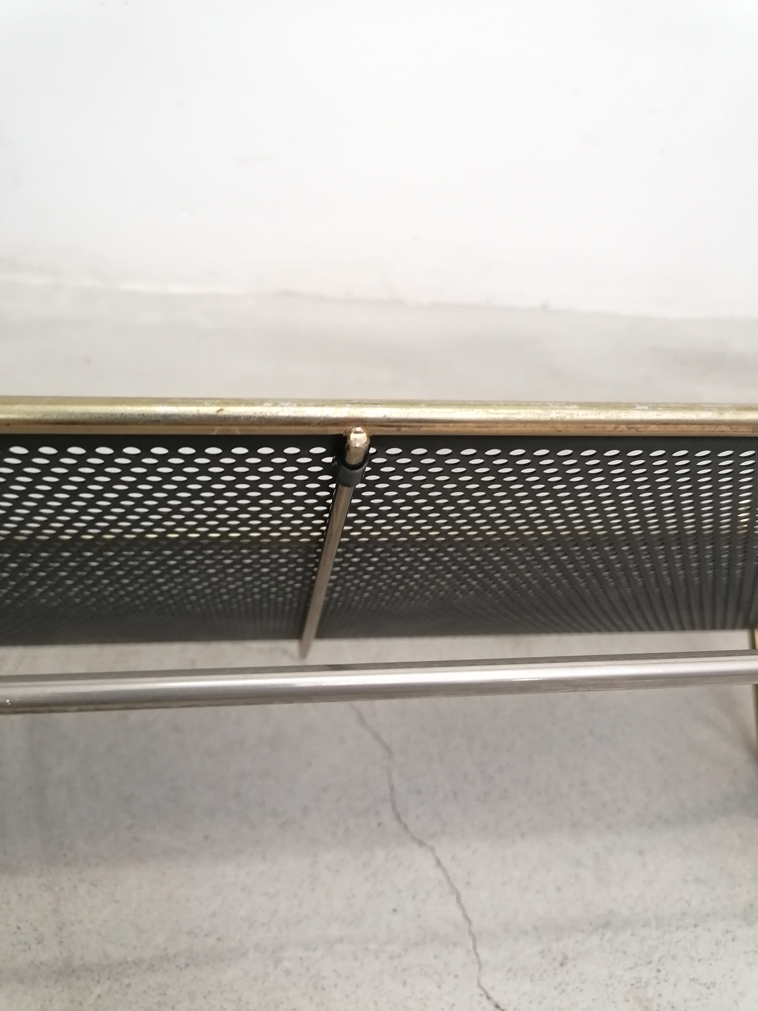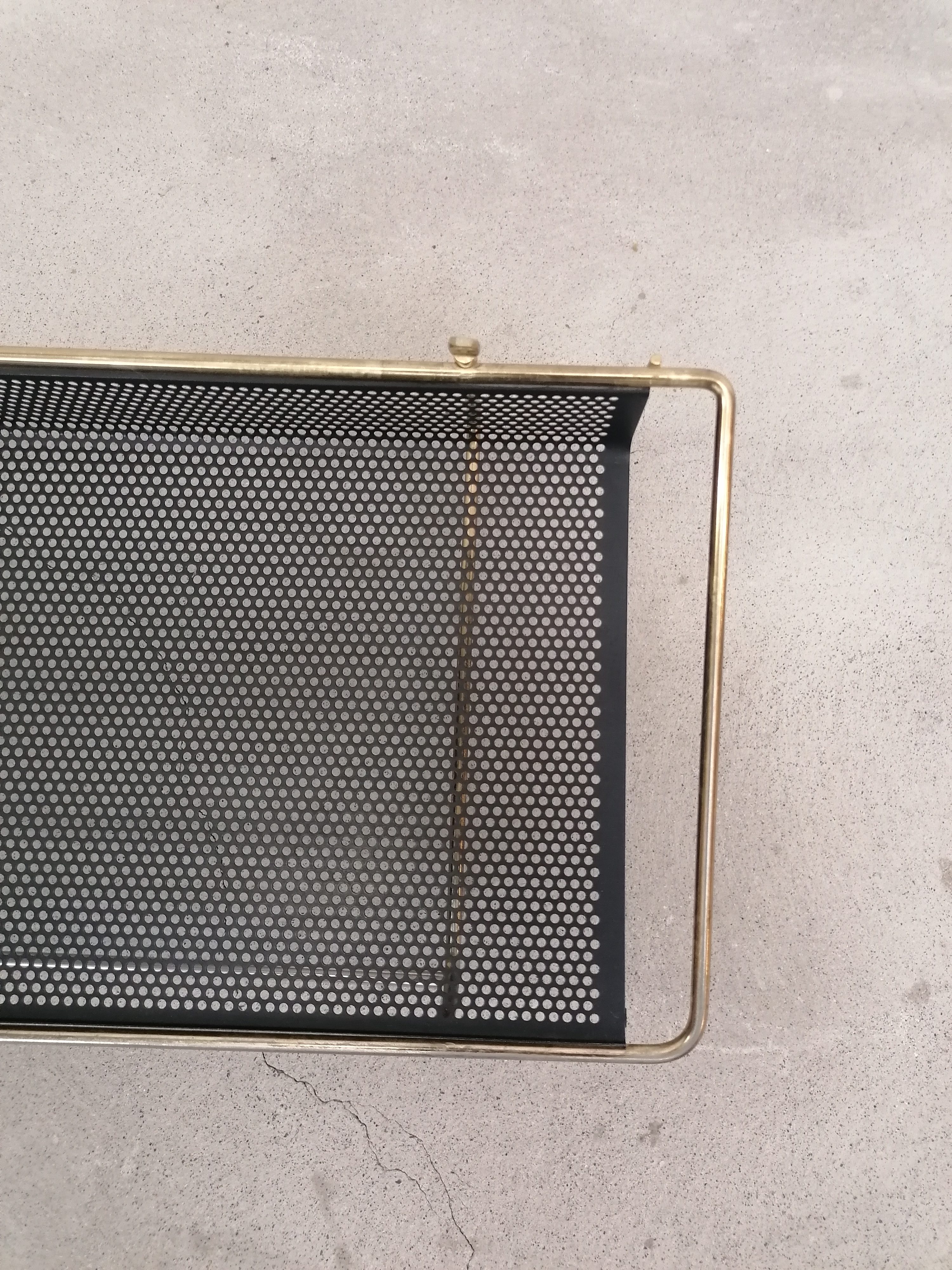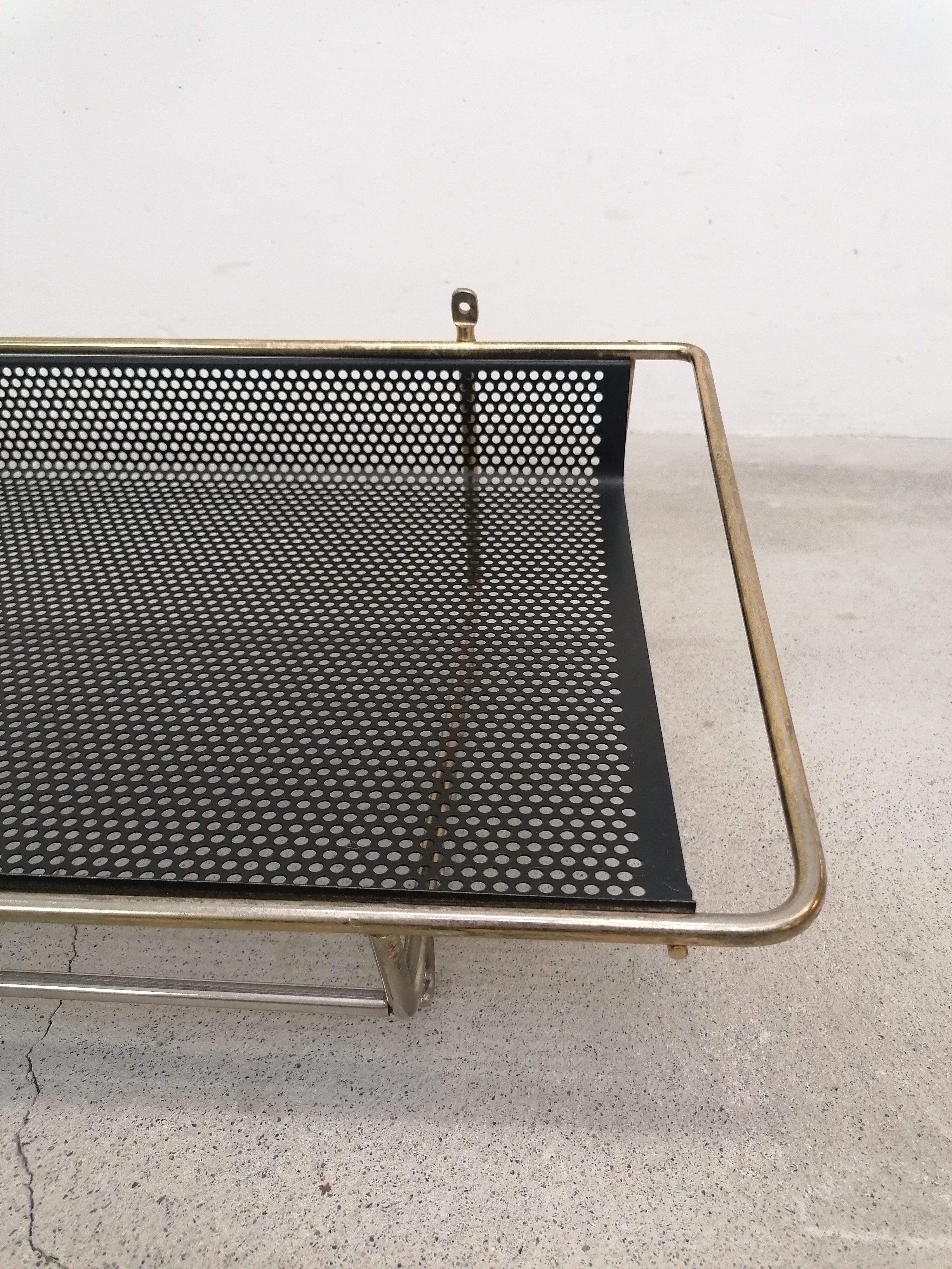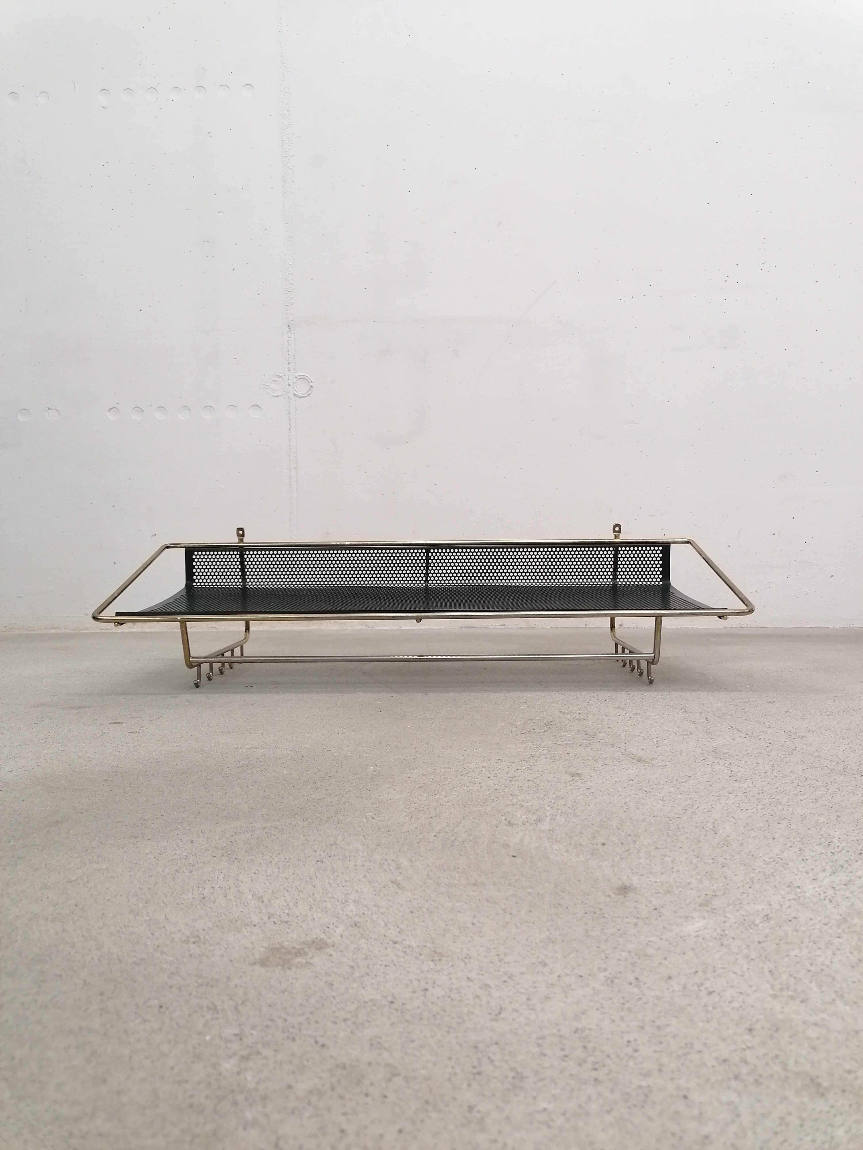Porte-manteaux vintage en métal laitonné et métal perforé. Doté de 10 crochets sur les côtés et d’un plateau en métal perforé. À certains endroits le métal n’est plus laitonné (voir photos), le métal perforé est en parfait état. Stable et solide et très élégant.