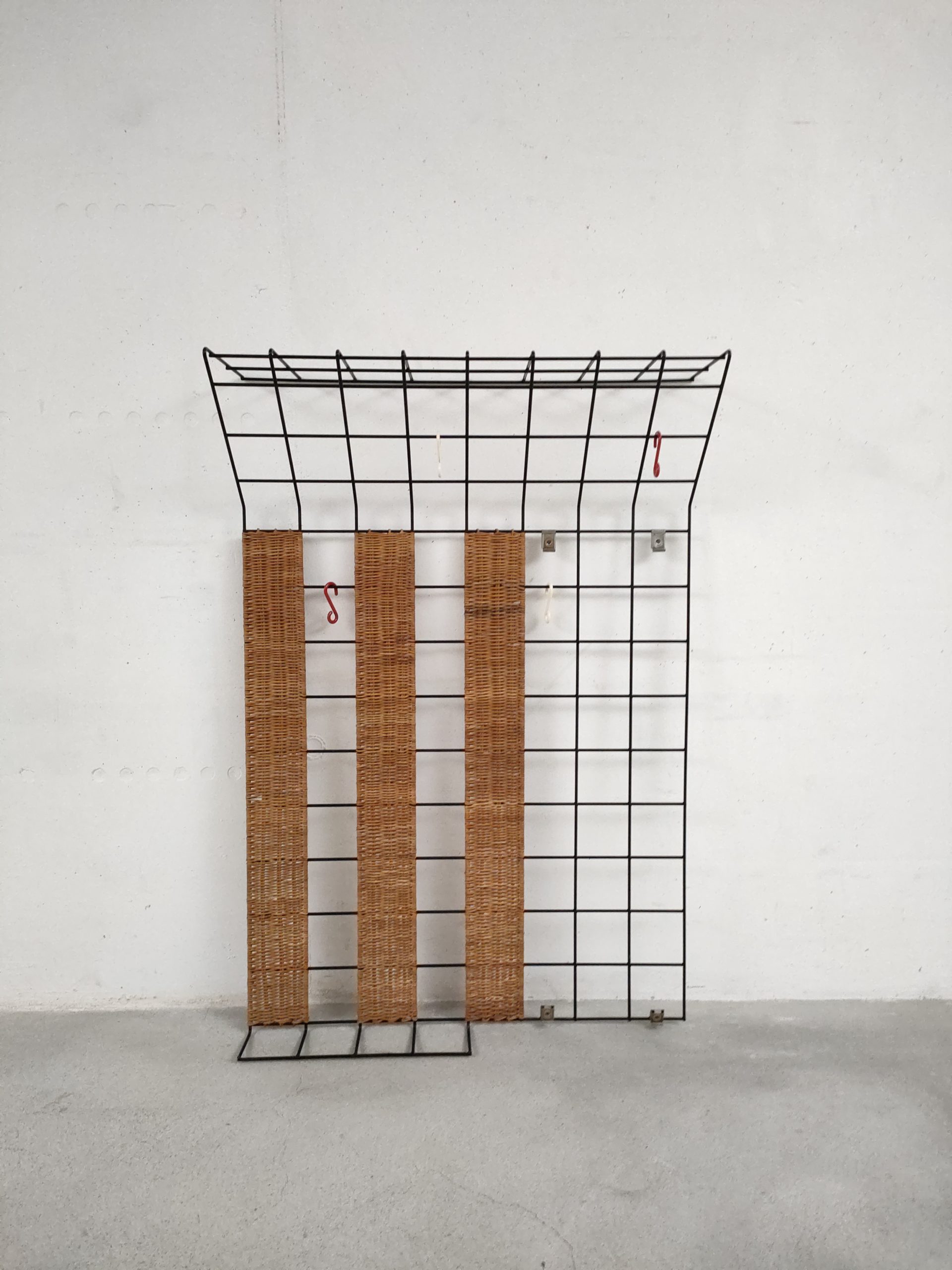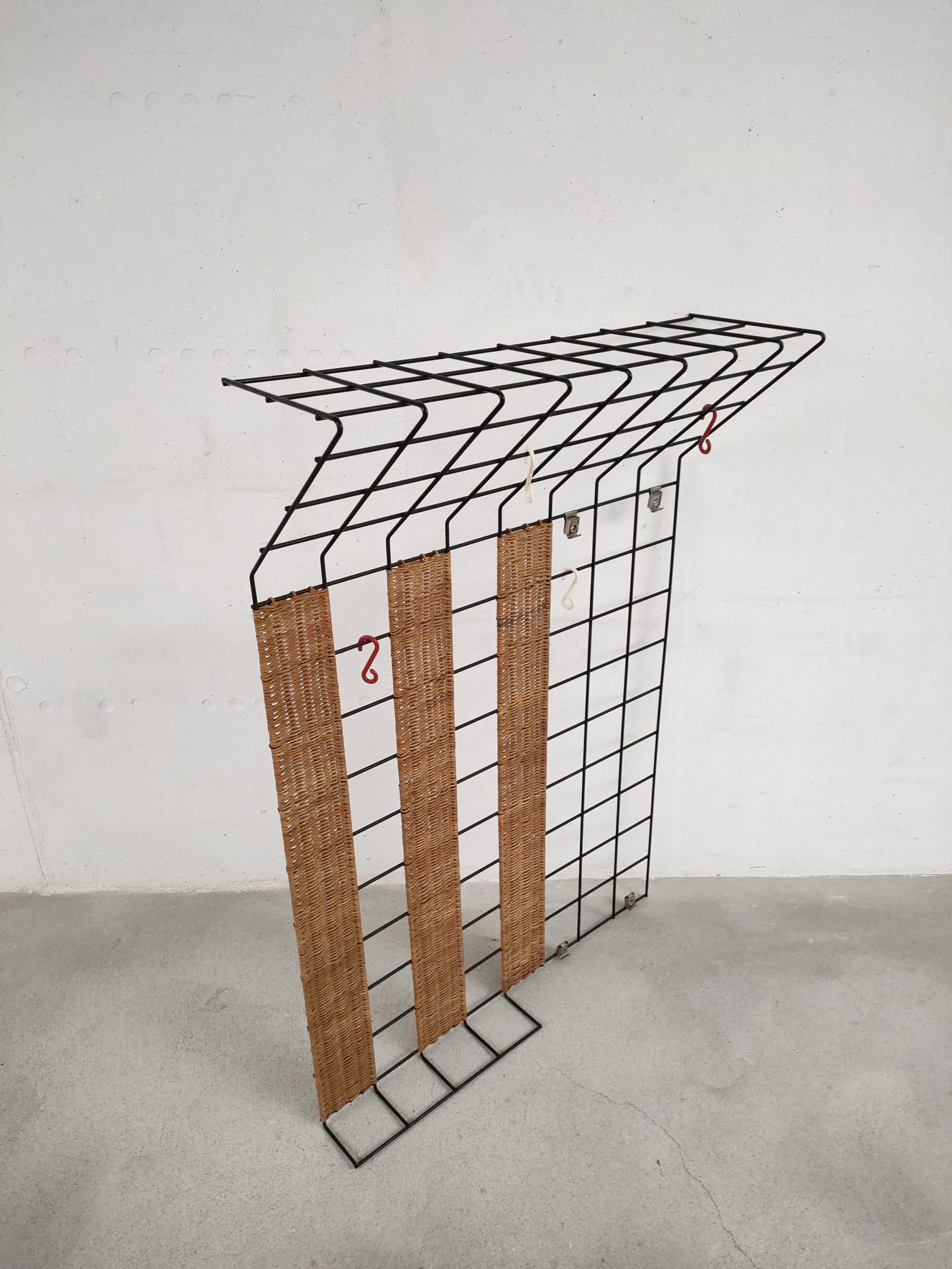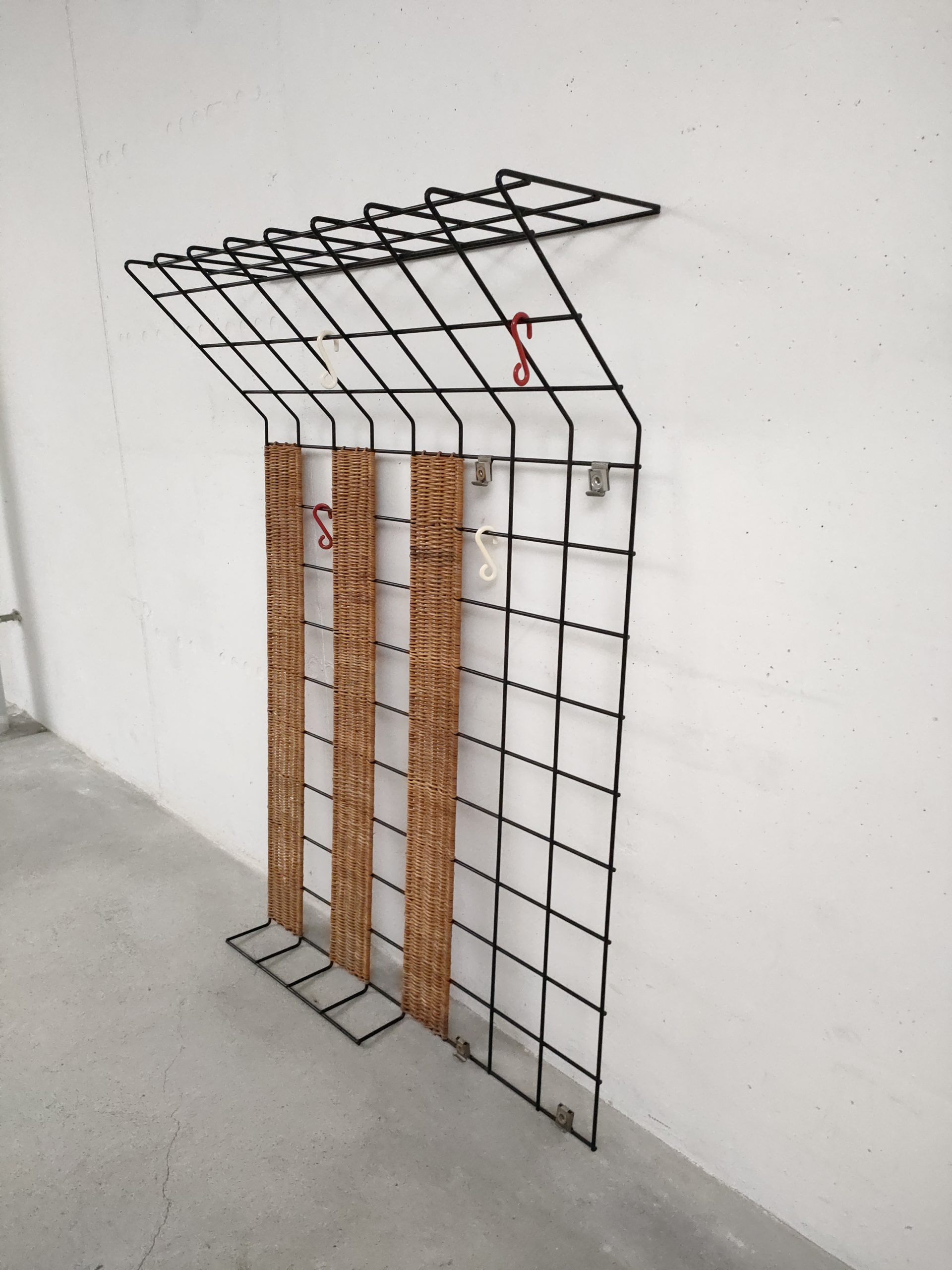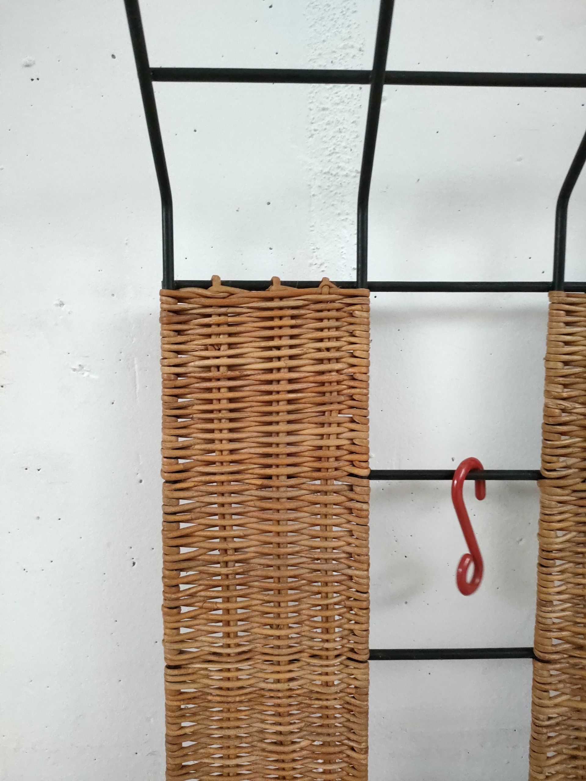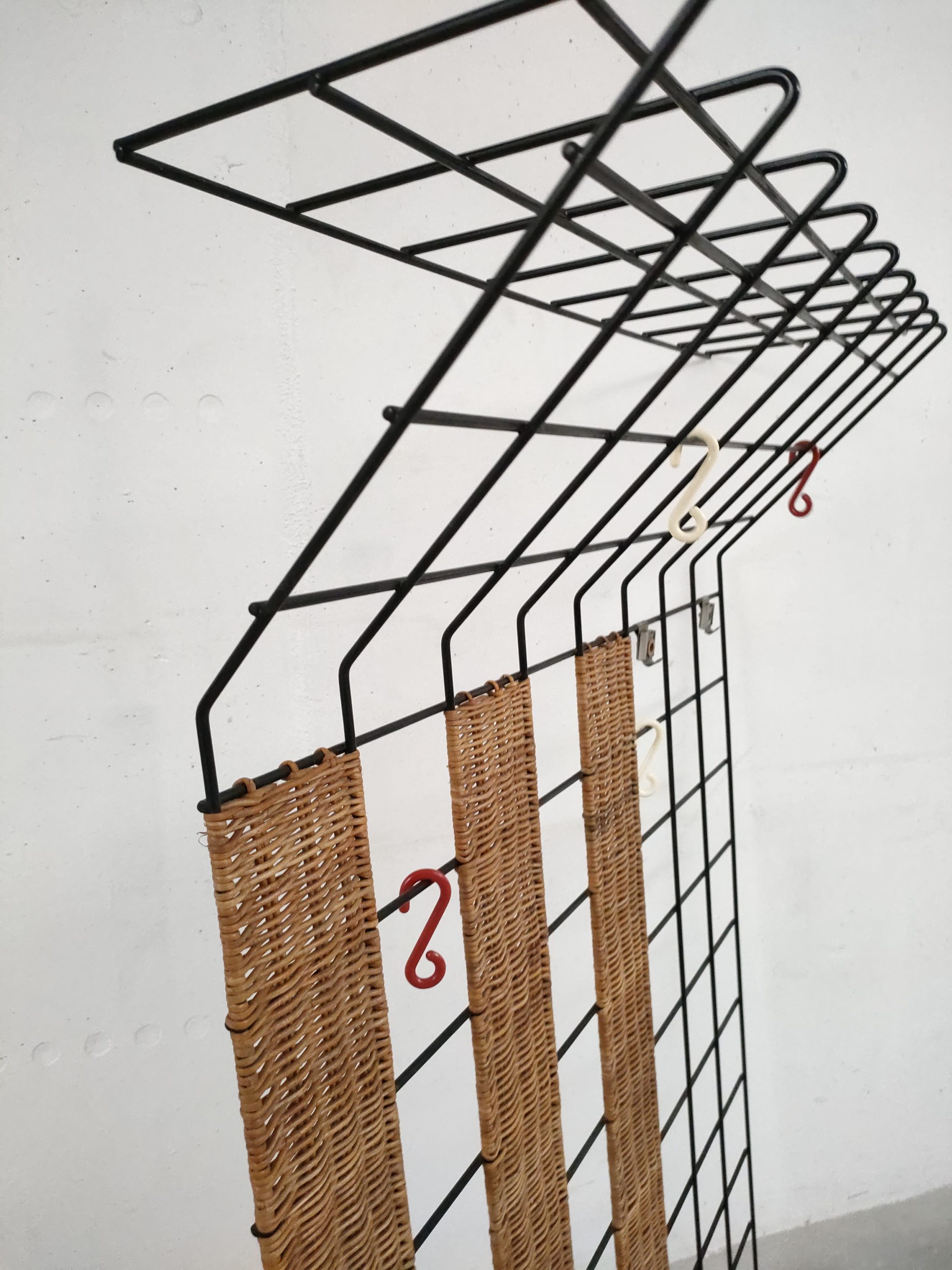 Porte-manteaux mural en métal noir et rotin tressé avec porte-chapeaux en haut et 4 crochets en plastique rouge et blanc. Conçu par le designer allemand Karl Fichtel dans les années 50. Les systèmes de fixation en métal ne sont pas fonctionnels, le porte-manteaux peut être facilment accroché au mur avec des vis ou des crochets. Stable et solide, il est parfaitement fonctionnel.