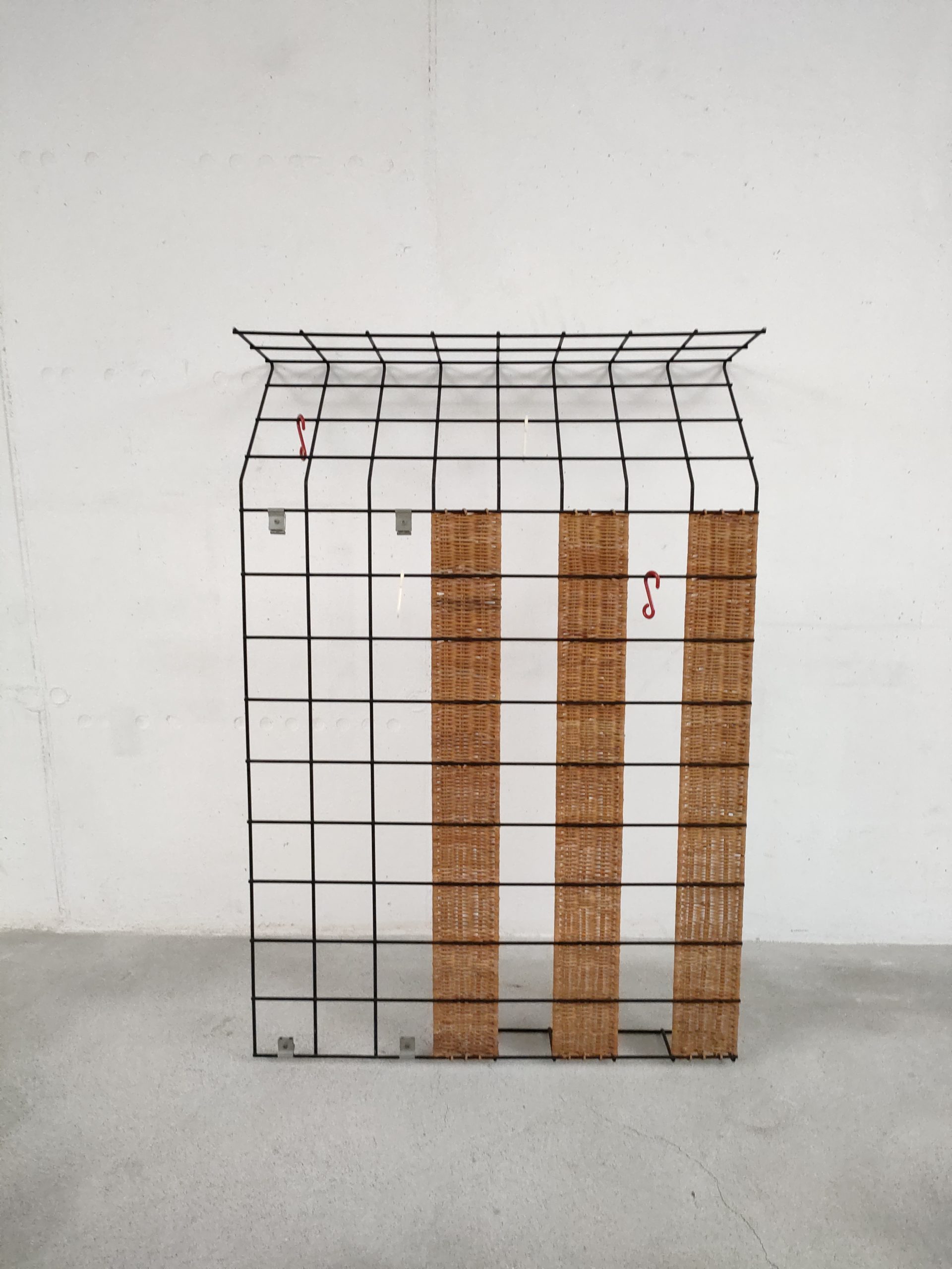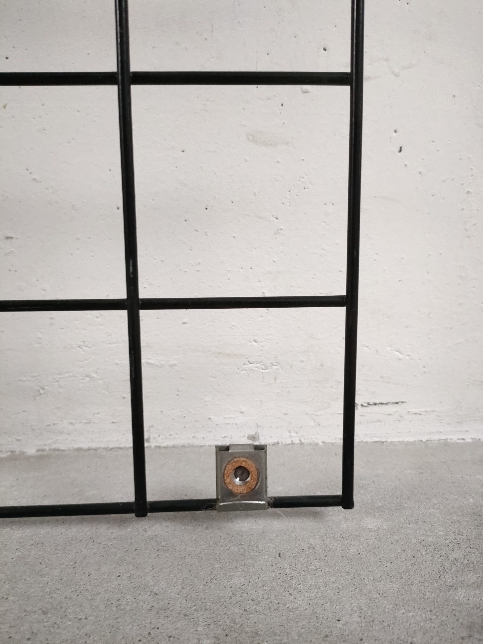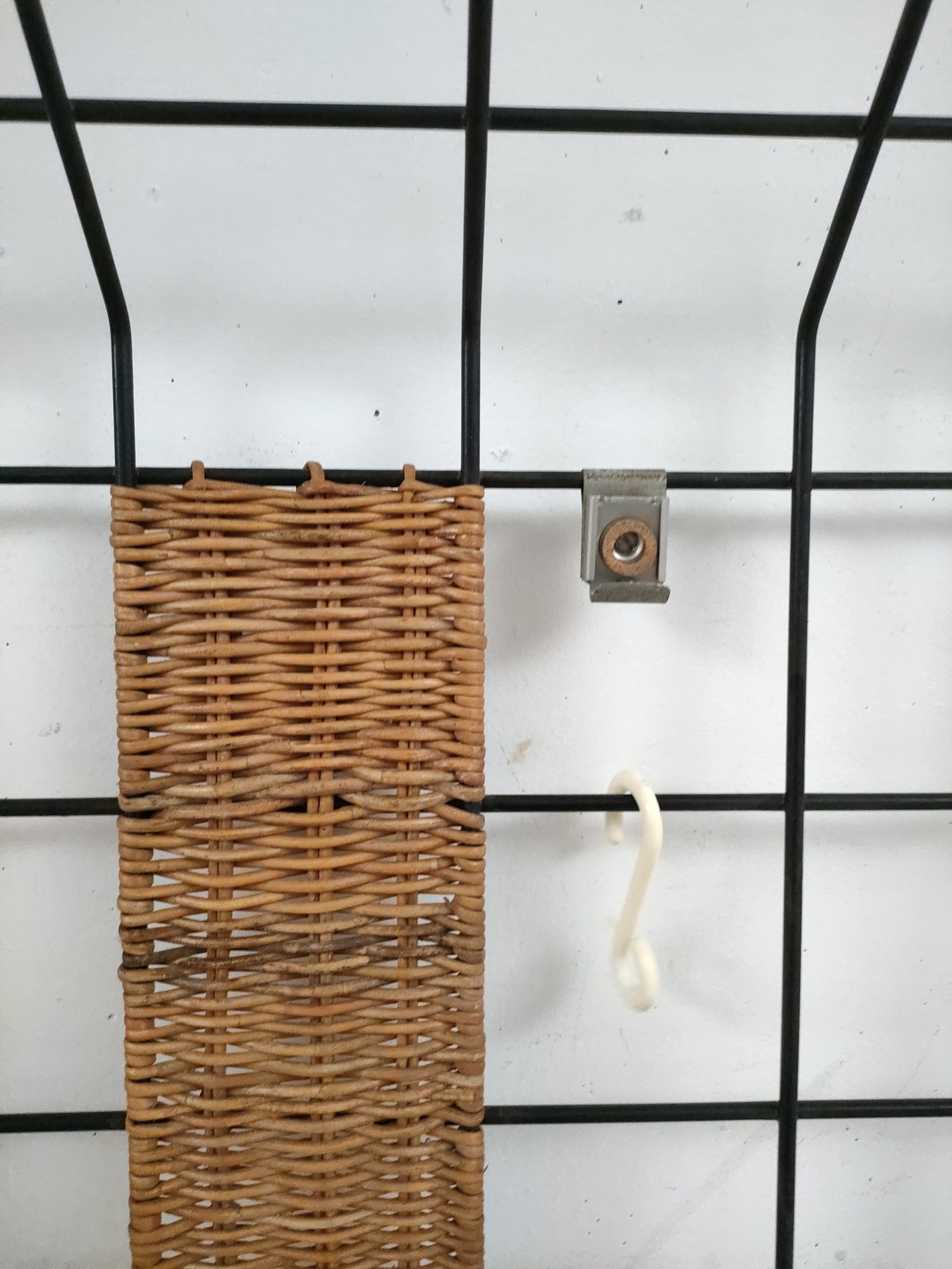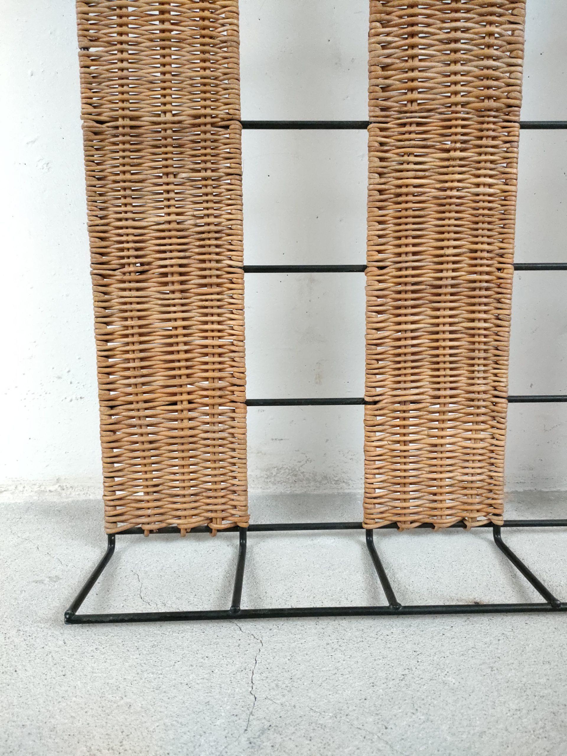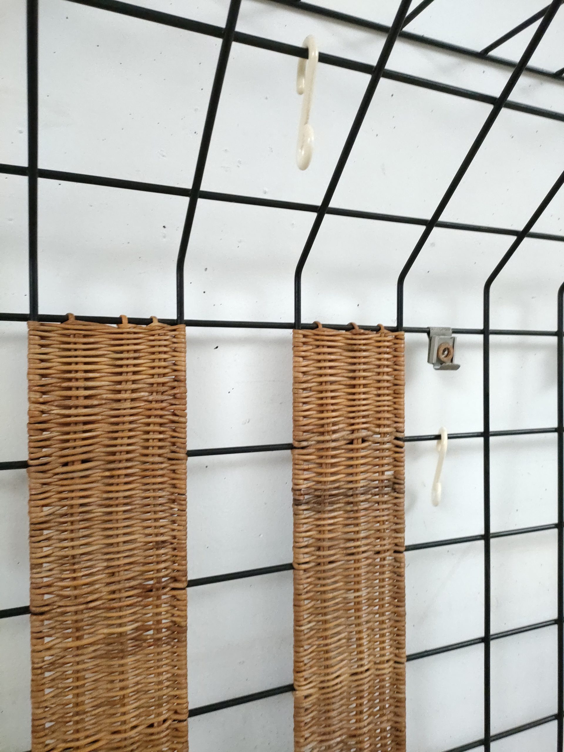 Porte-manteaux mural en métal noir et rotin tressé avec porte-chapeaux en haut et 4 crochets en plastique rouge et blanc. Conçu par le designer allemand Karl Fichtel dans les années 50. Les systèmes de fixation en métal ne sont pas fonctionnels, le porte-manteaux peut être facilment accroché au mur avec des vis ou des crochets. Stable et solide, il est parfaitement fonctionnel.