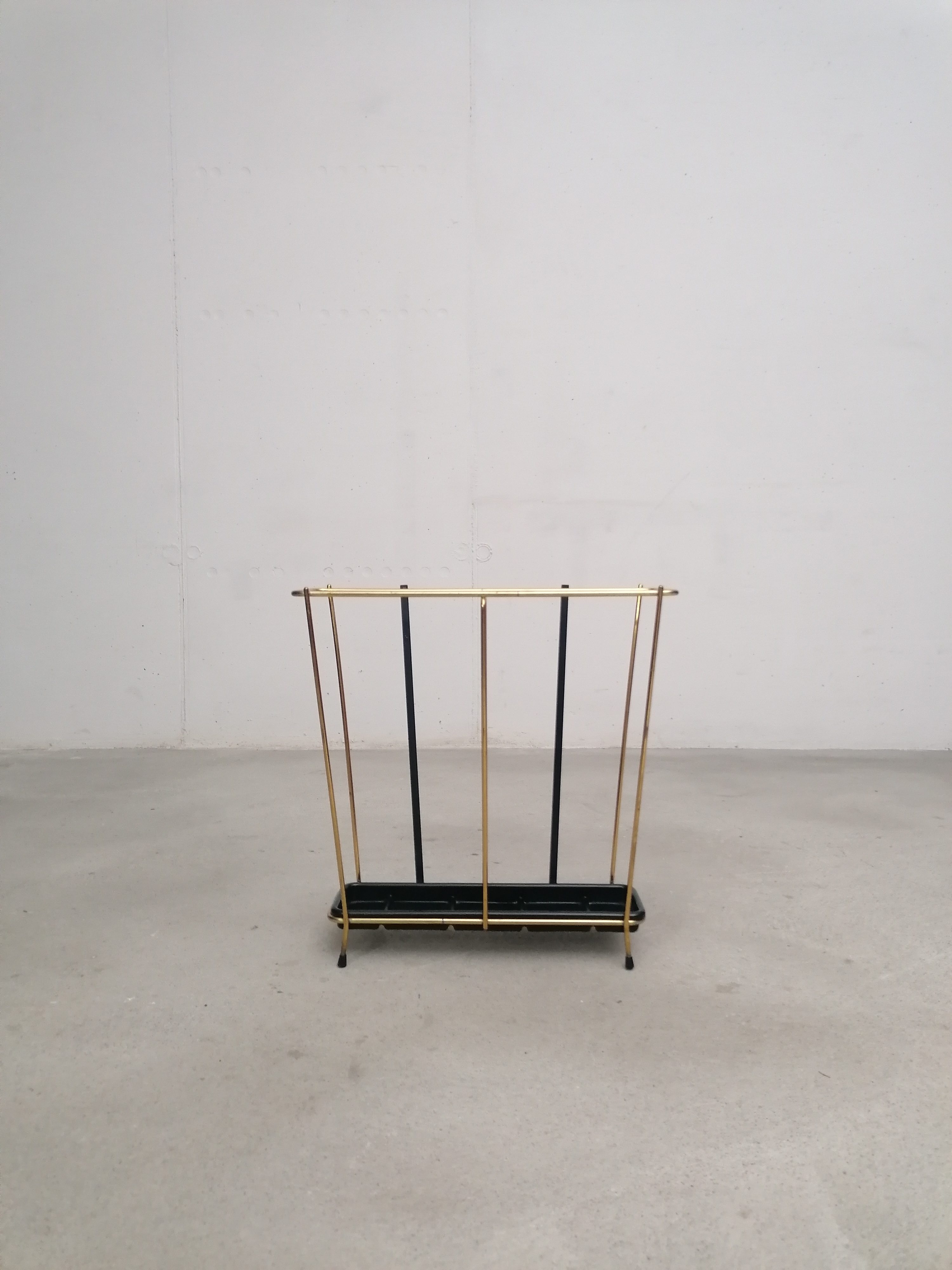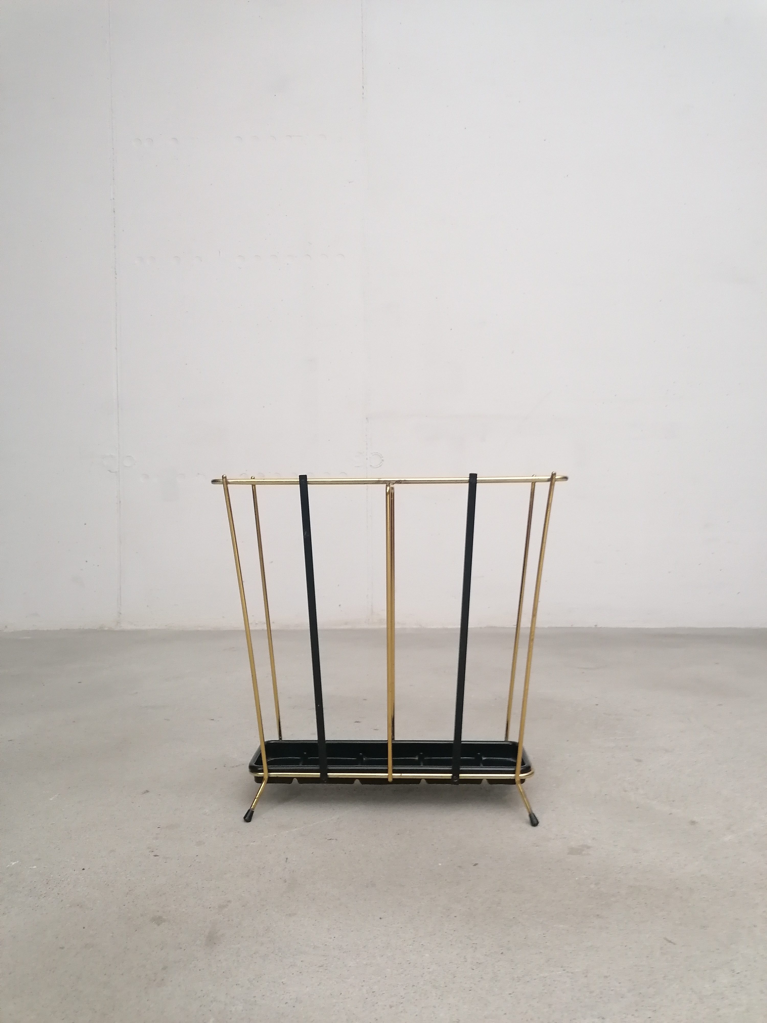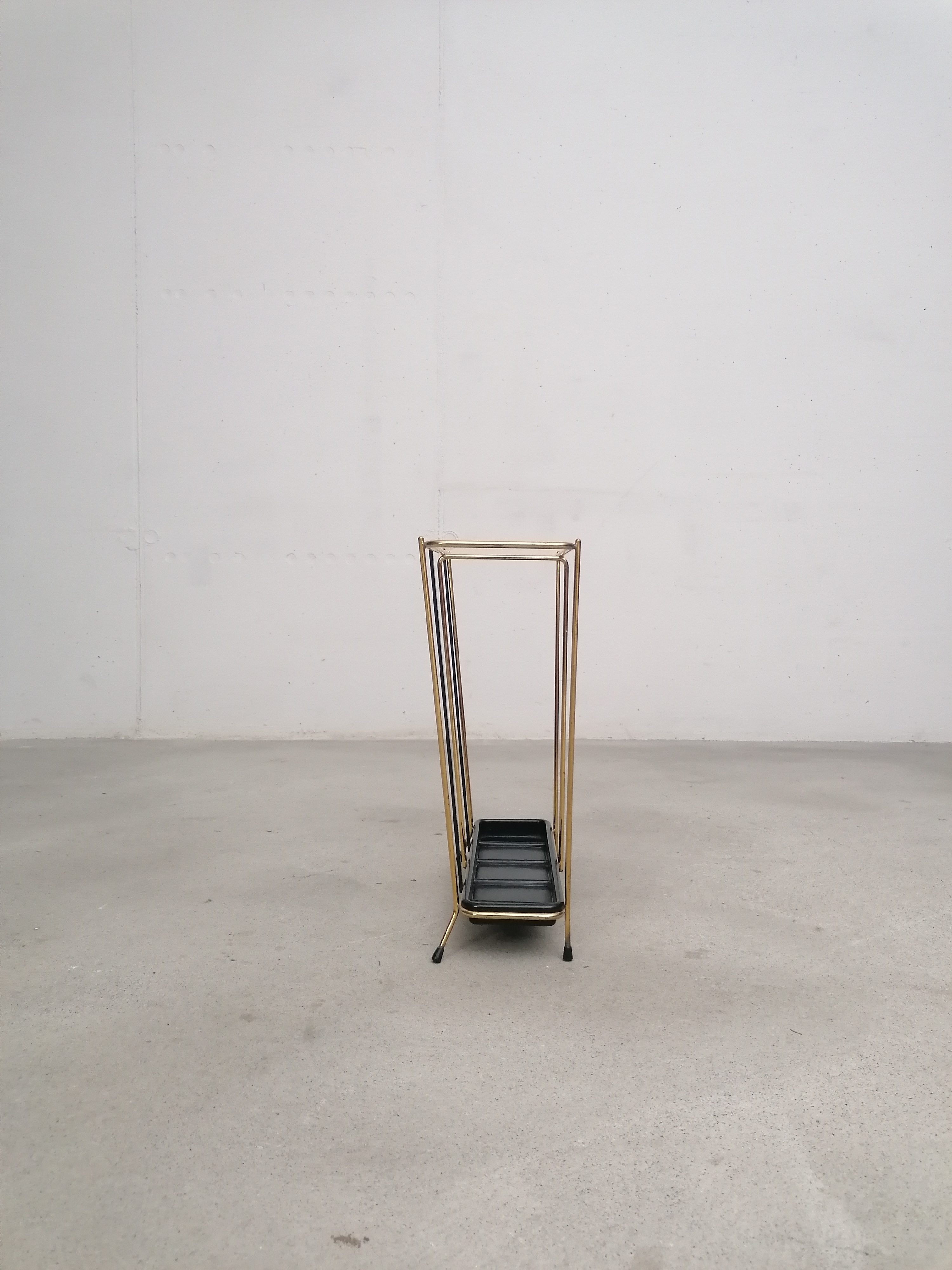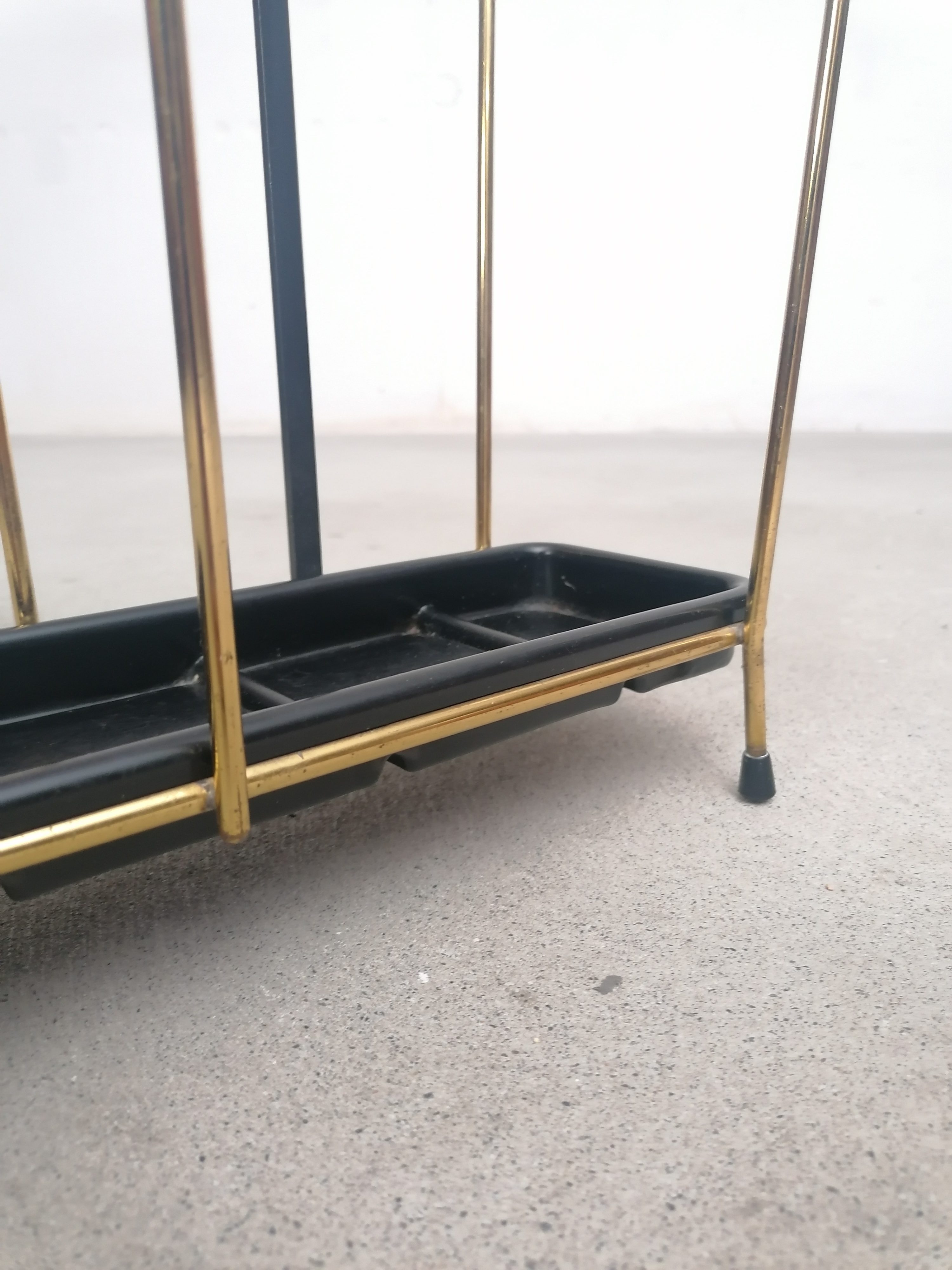 Porte-parapluies vintage avec structure en métal doré et noir et bac amovible en plastique. En bon état et très élégant.