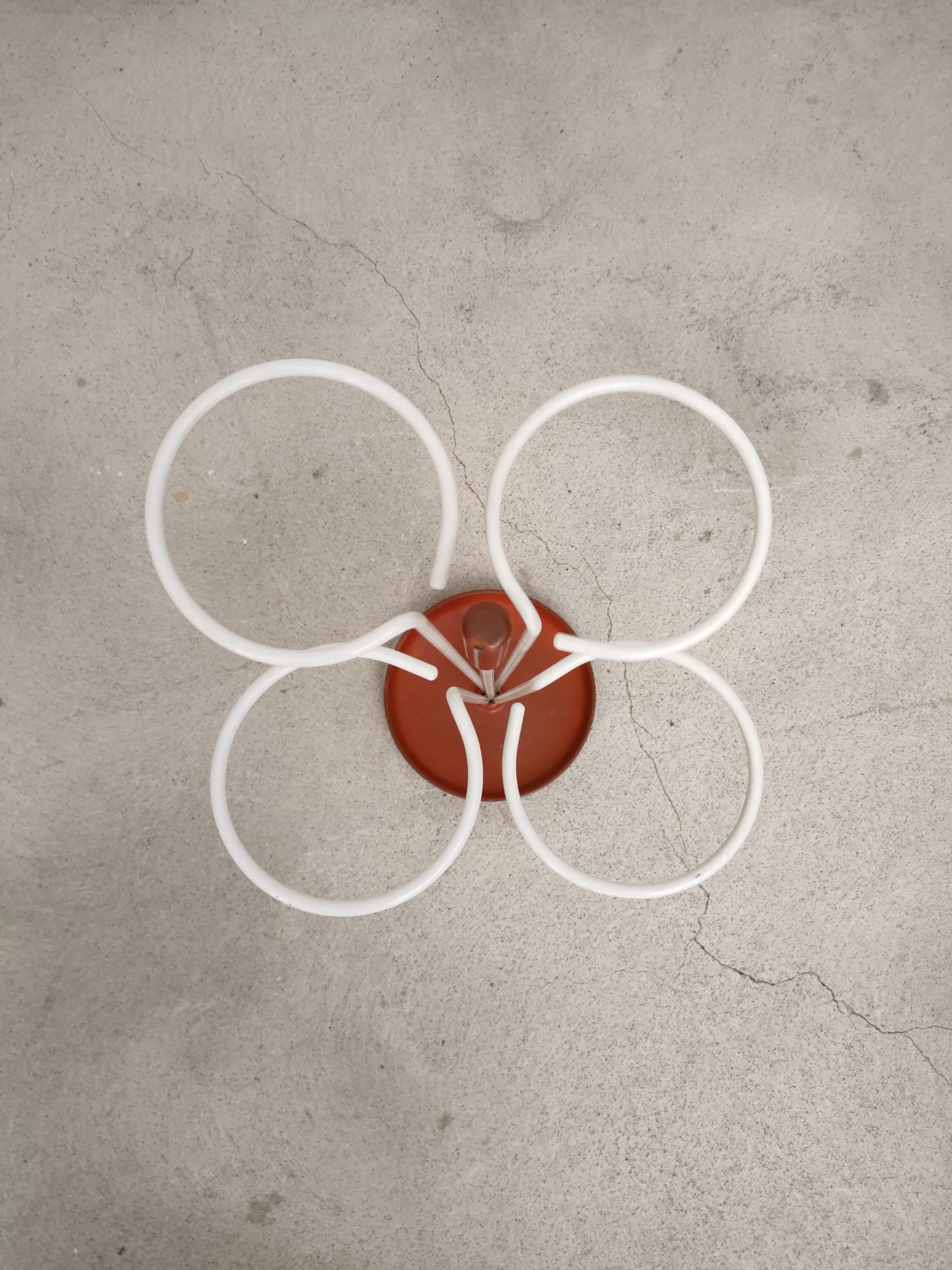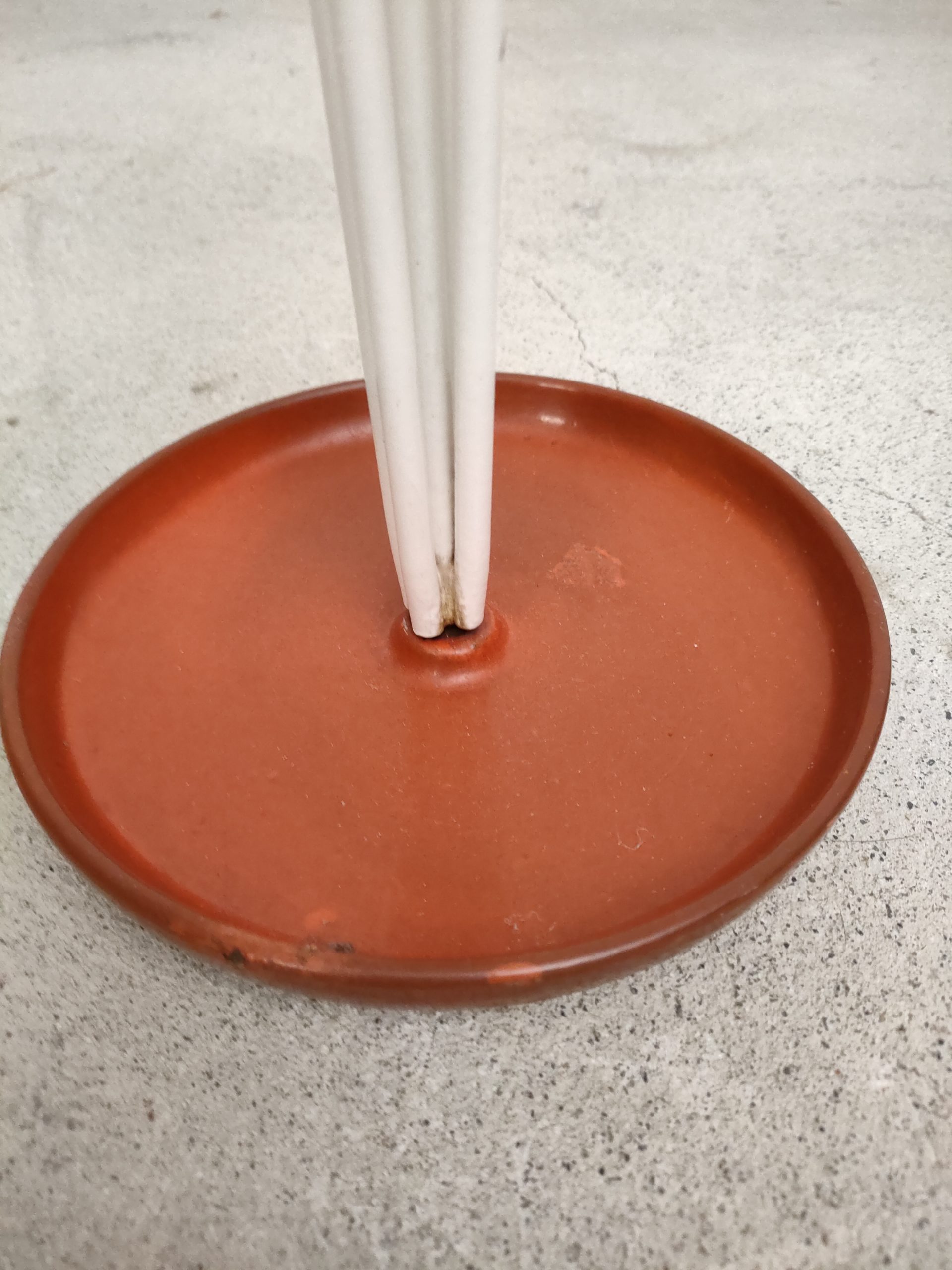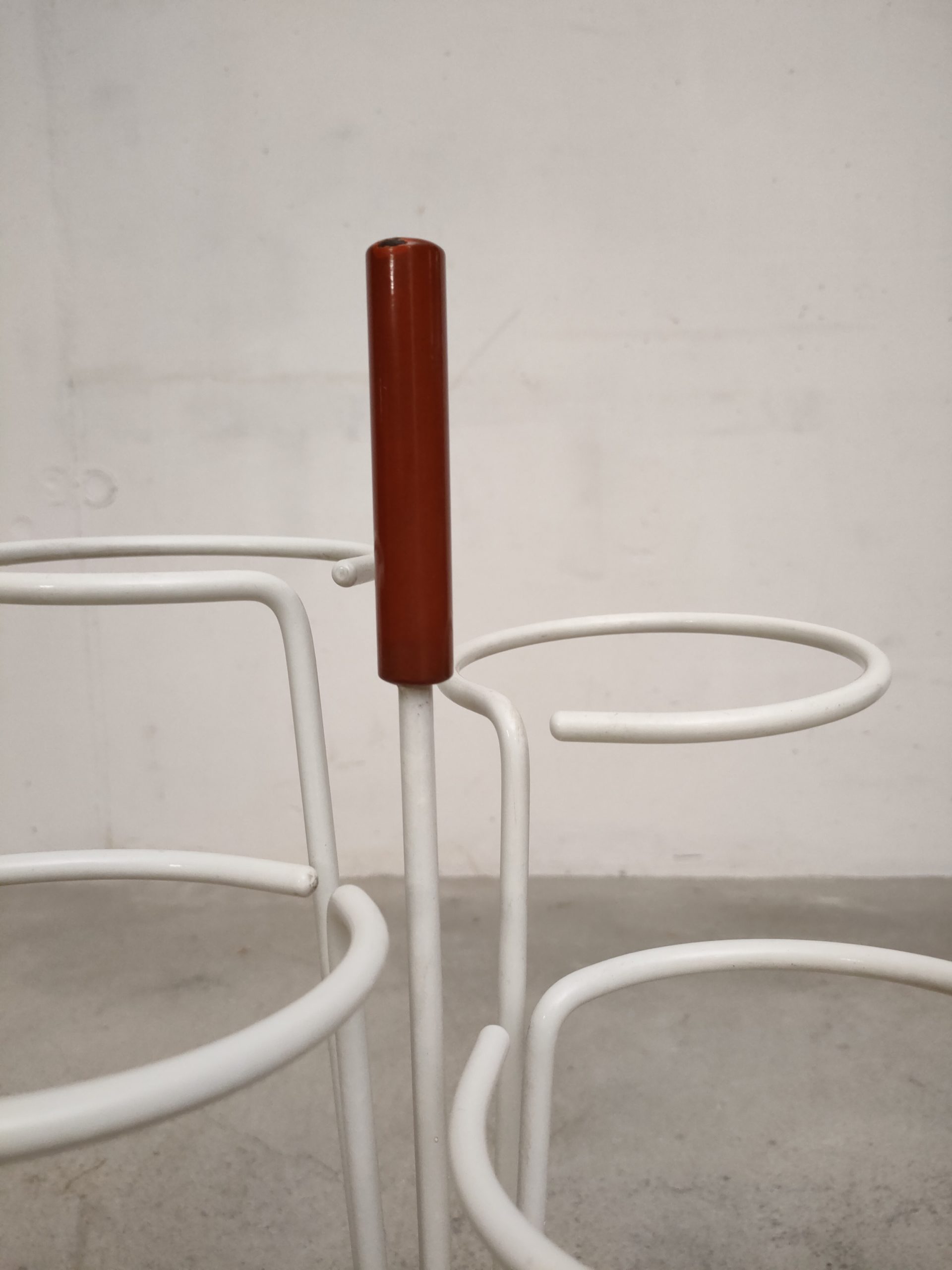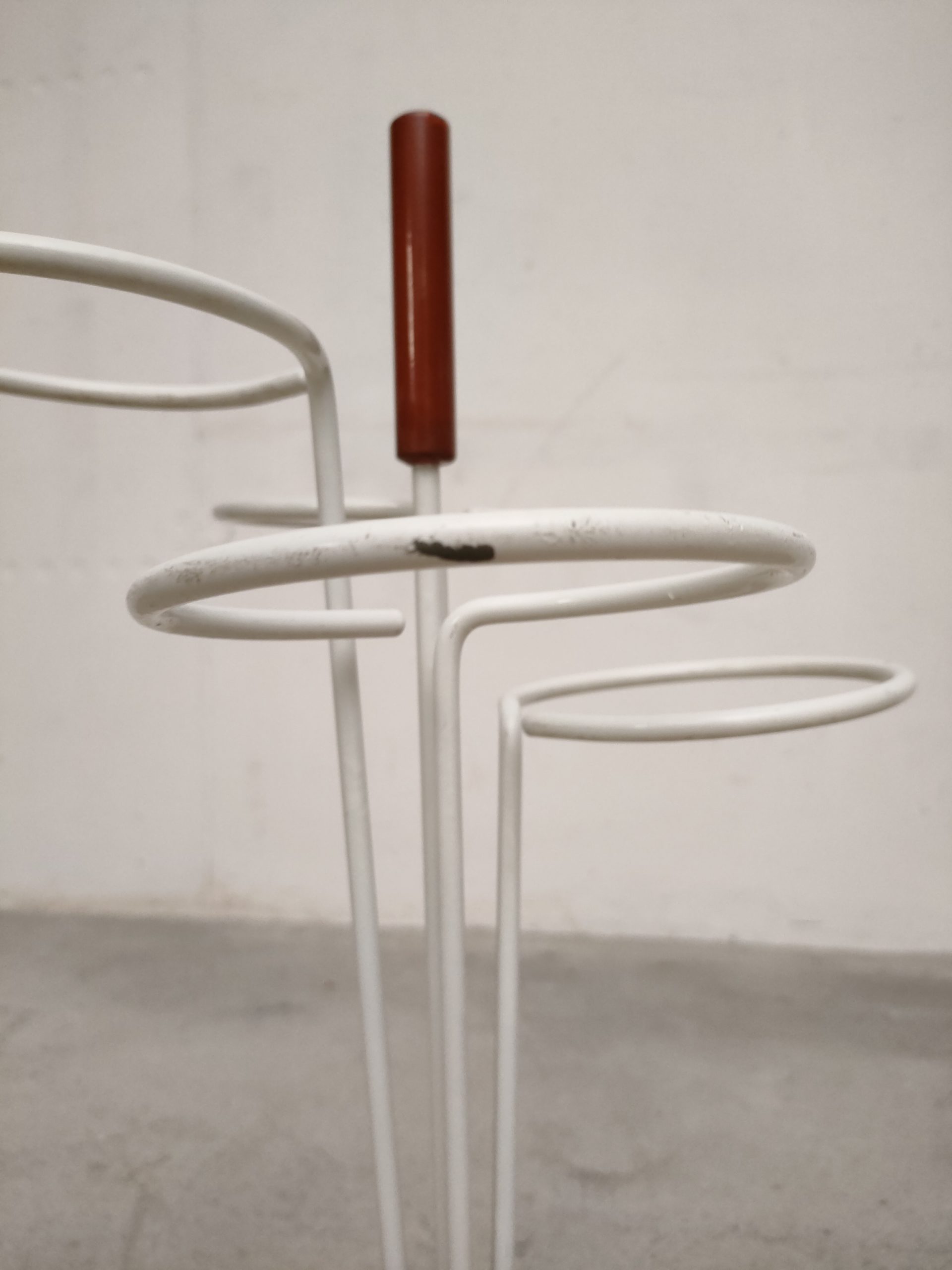 Produit venduPorte-parapluies vintage en métal avec quelques traces d’usure mais parfaitement fonctionnel. Il pourrait être détourné et servir comme porte-plantes (vois dernière photo). Diamètre interne des cercles: 12 cm.