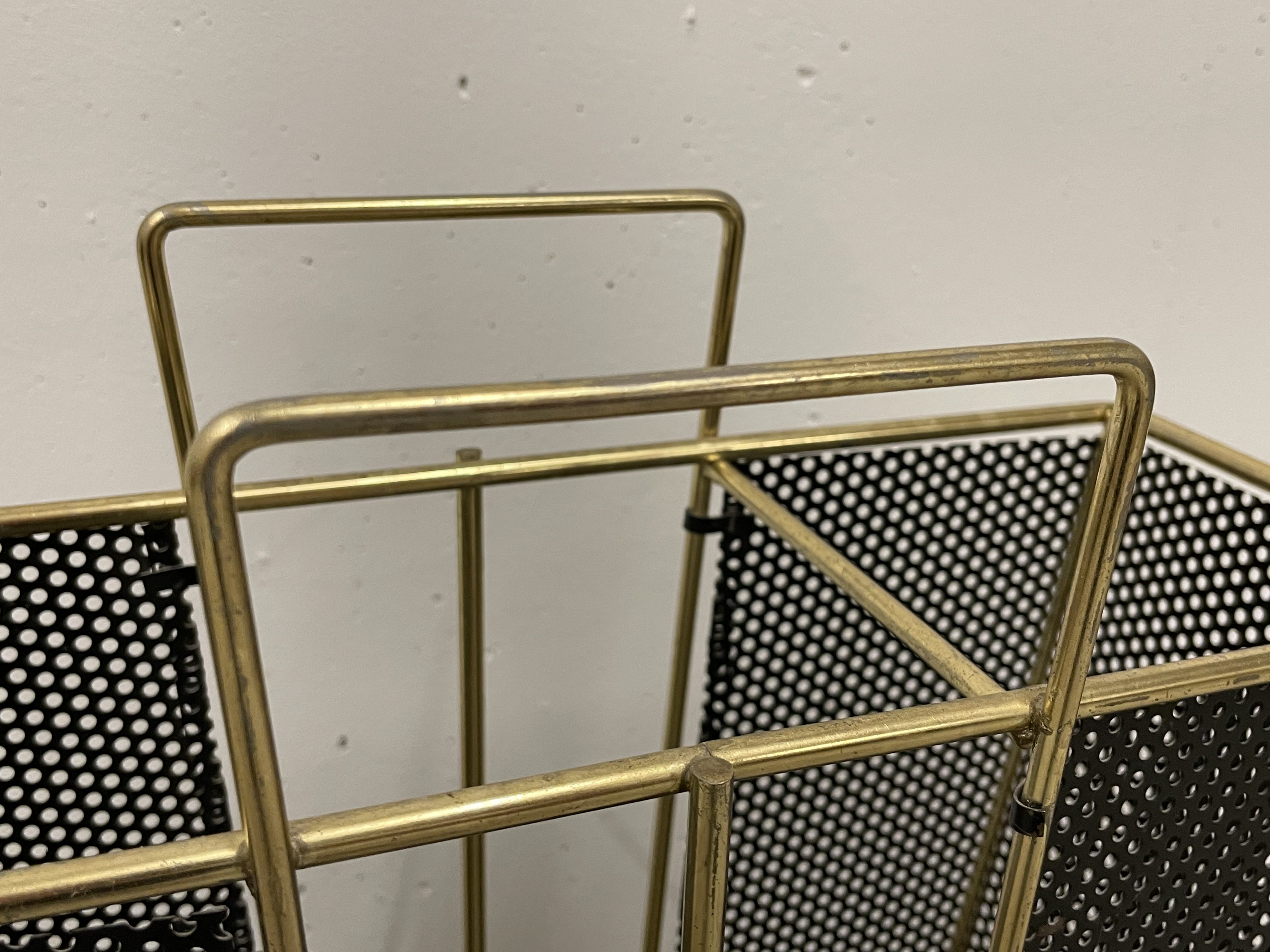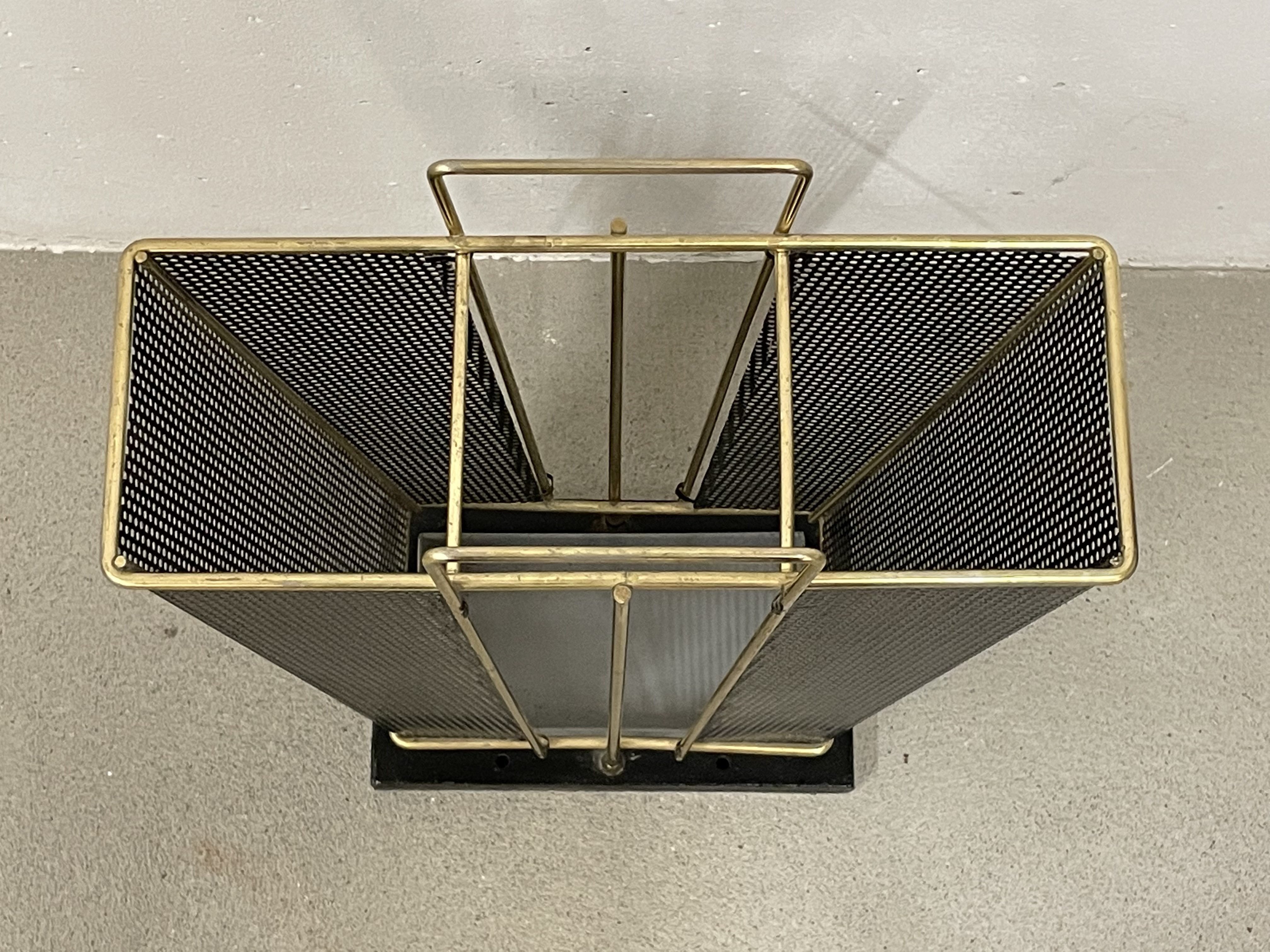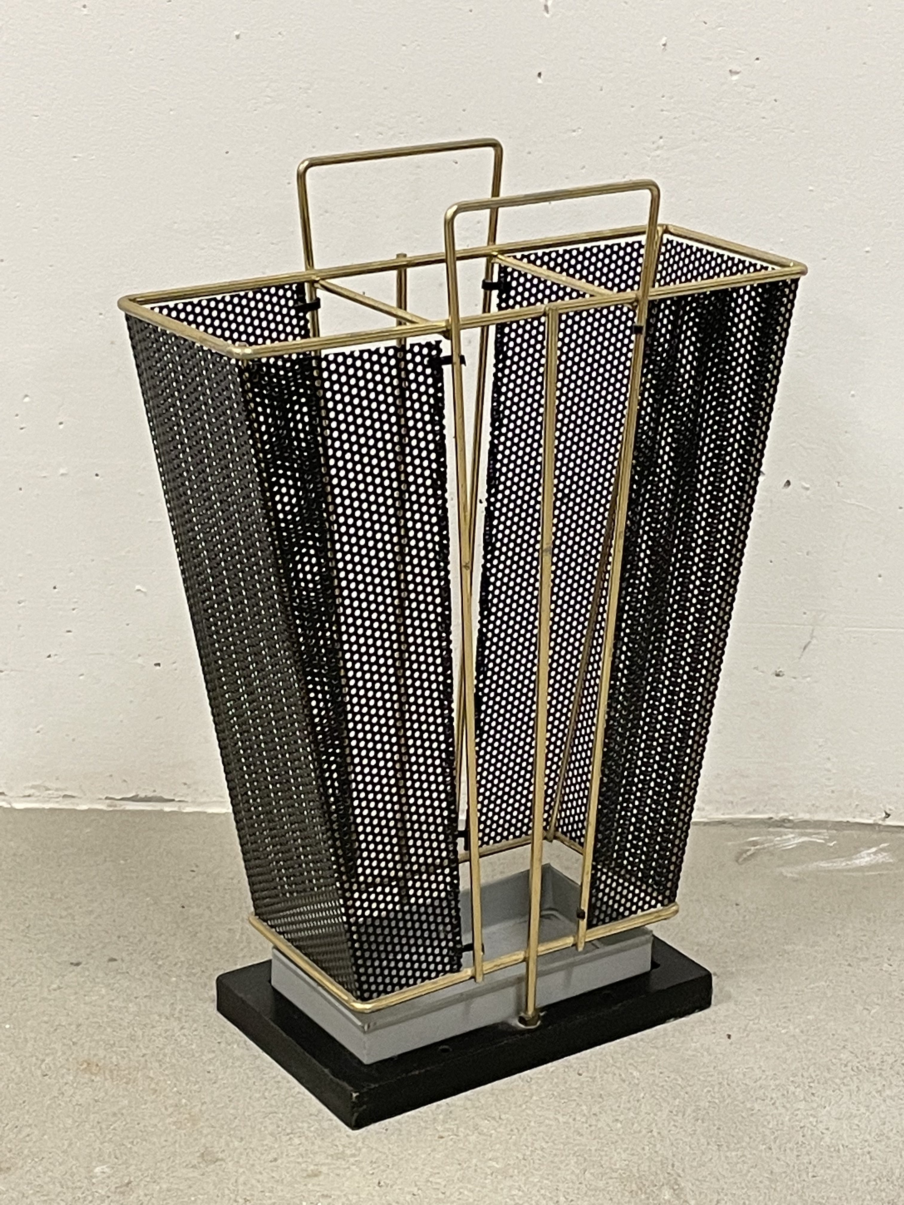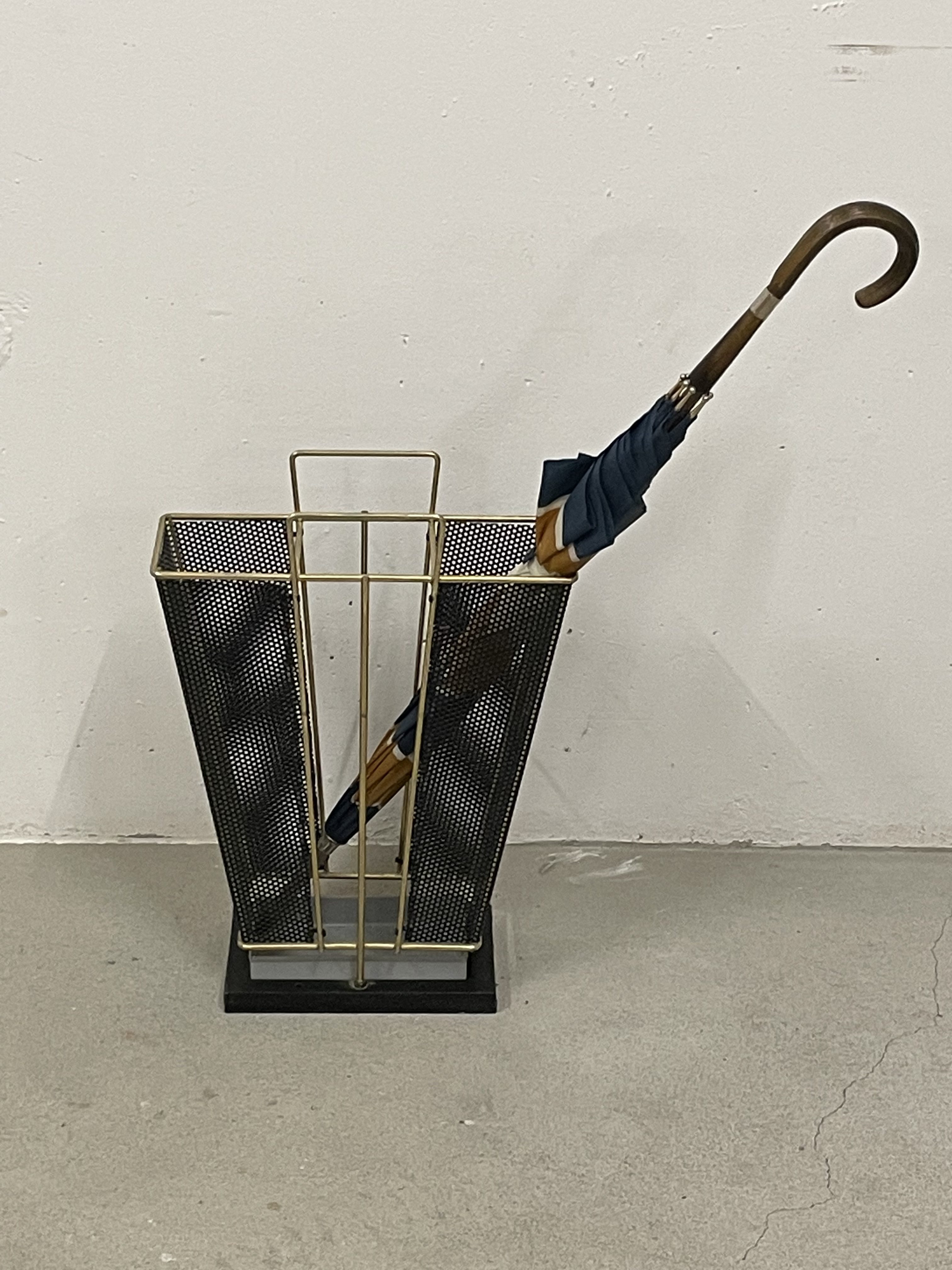 Produit venduPorte-parapluie en métal perforé avec pied en fonte contenant un petit bac amovible. L’état général est bon, le métal n’a que peu de traces d’usure.