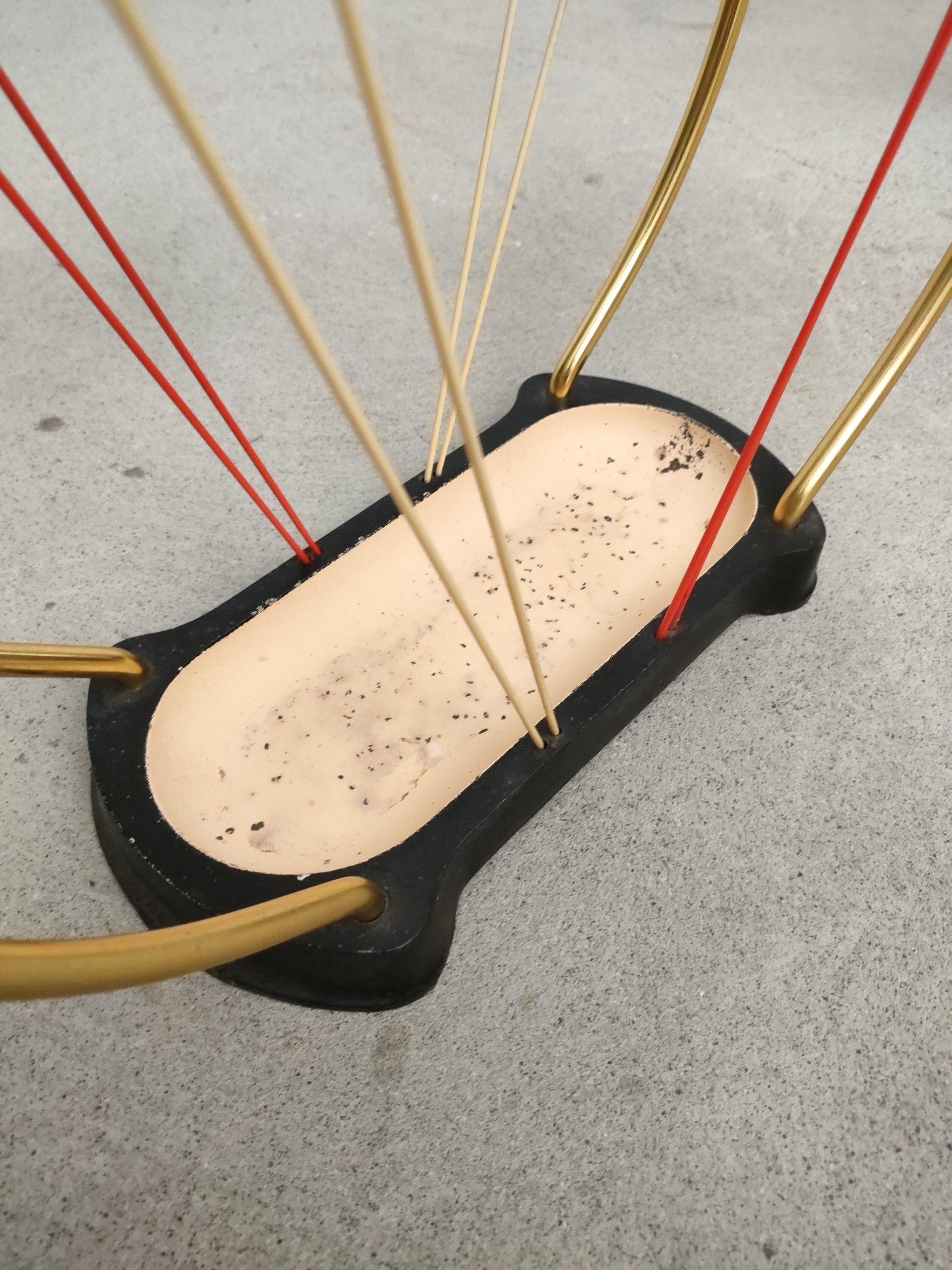 Le piètement présente de nombreuses petites traces noires liées à la pointe des parapluies. Le scoubidou est en très bon état et le métal doré a de légères traces.