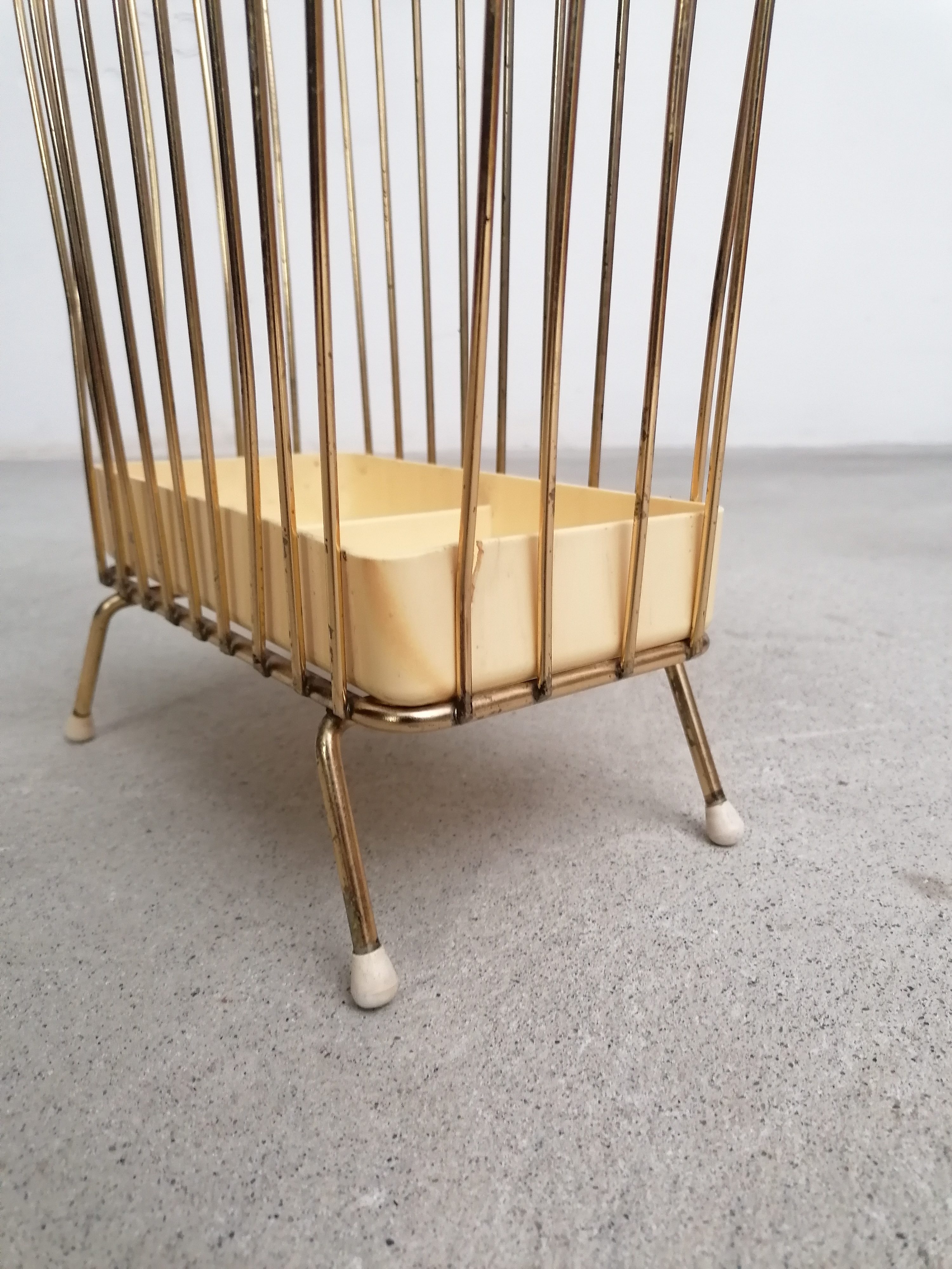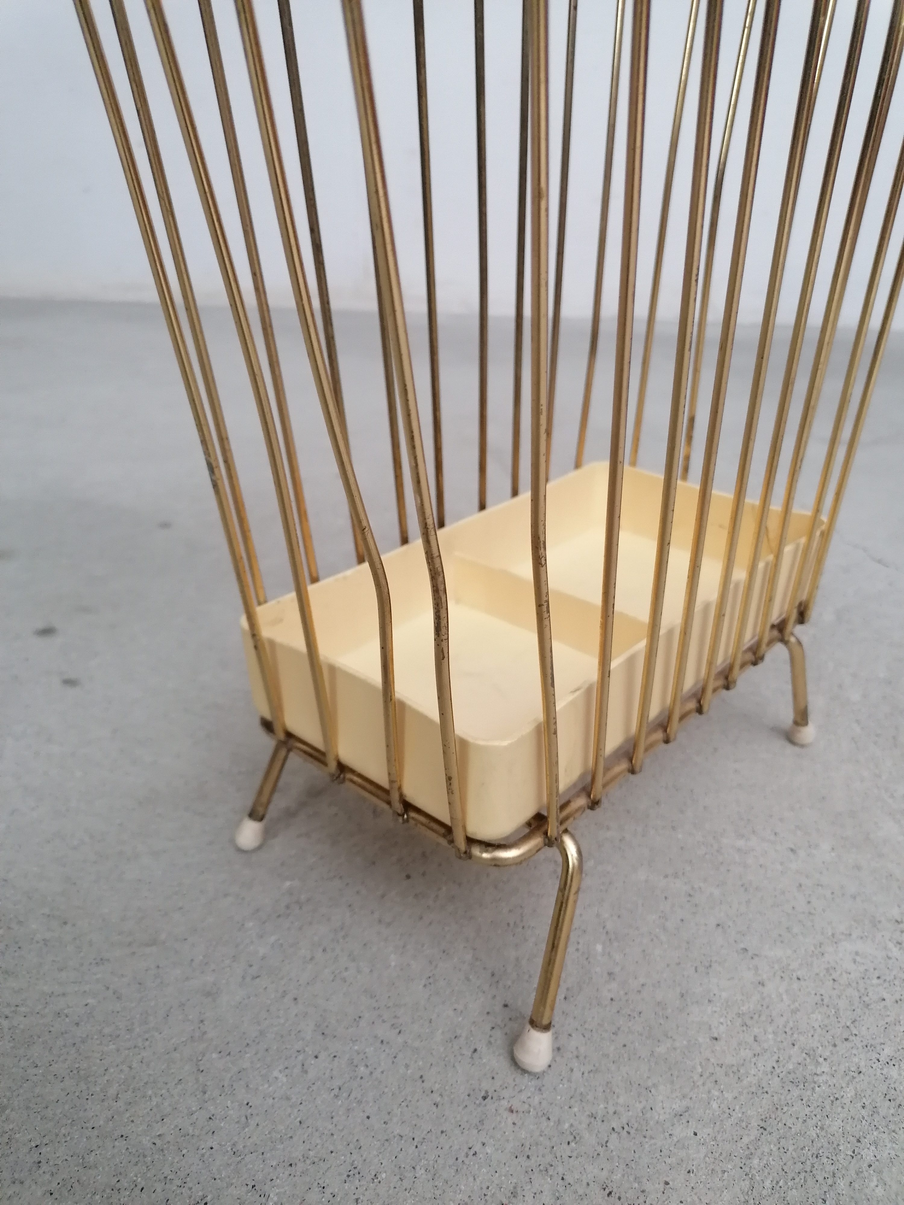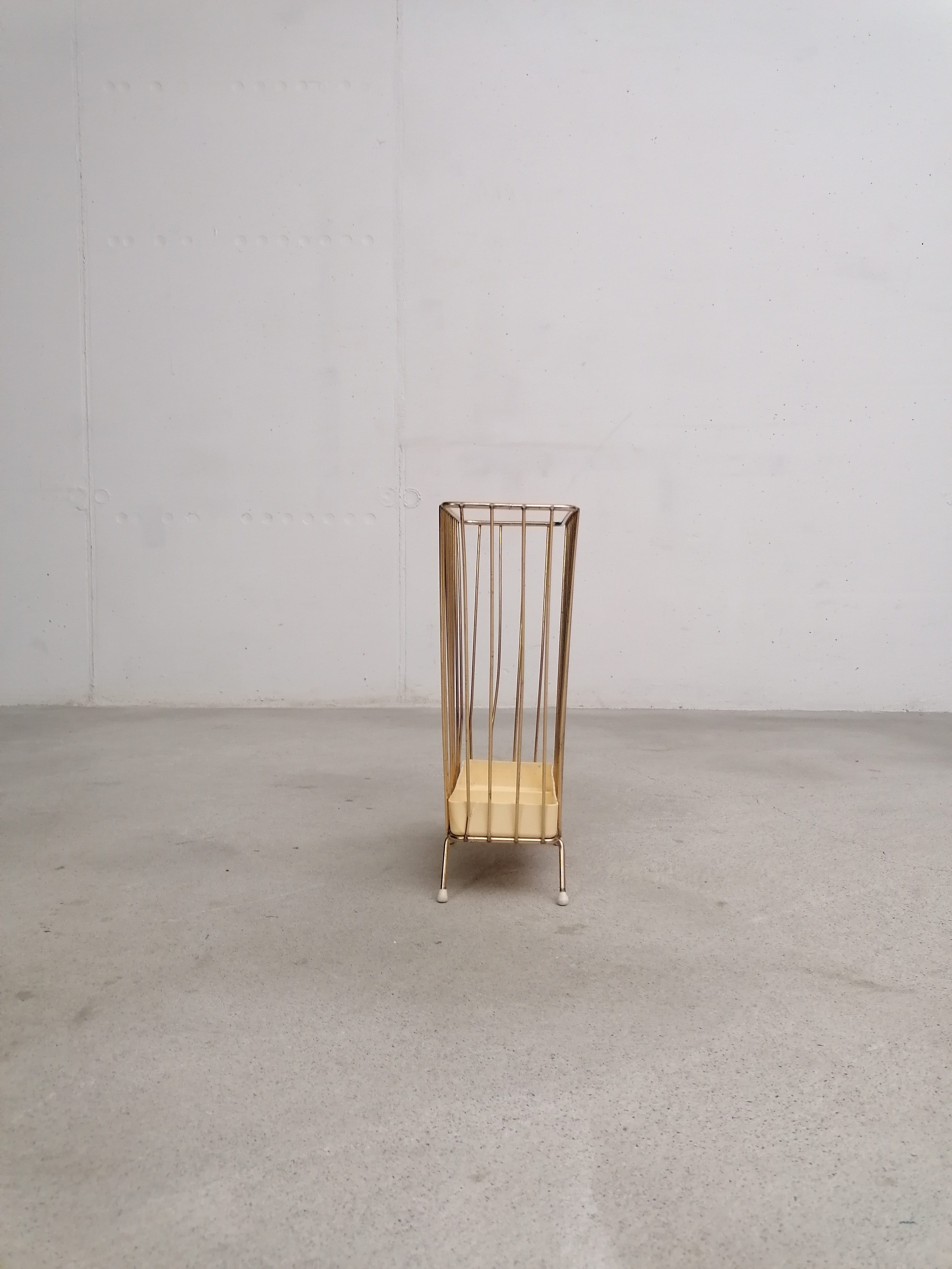 Produit venduPorte-parapluies vintage avec structure en métal laitonné et bac en plastique. Le bas est fissuré à un endroit (voir photo) mais le porte-parapluies est stable et solide et parfaitement fonctionnel.