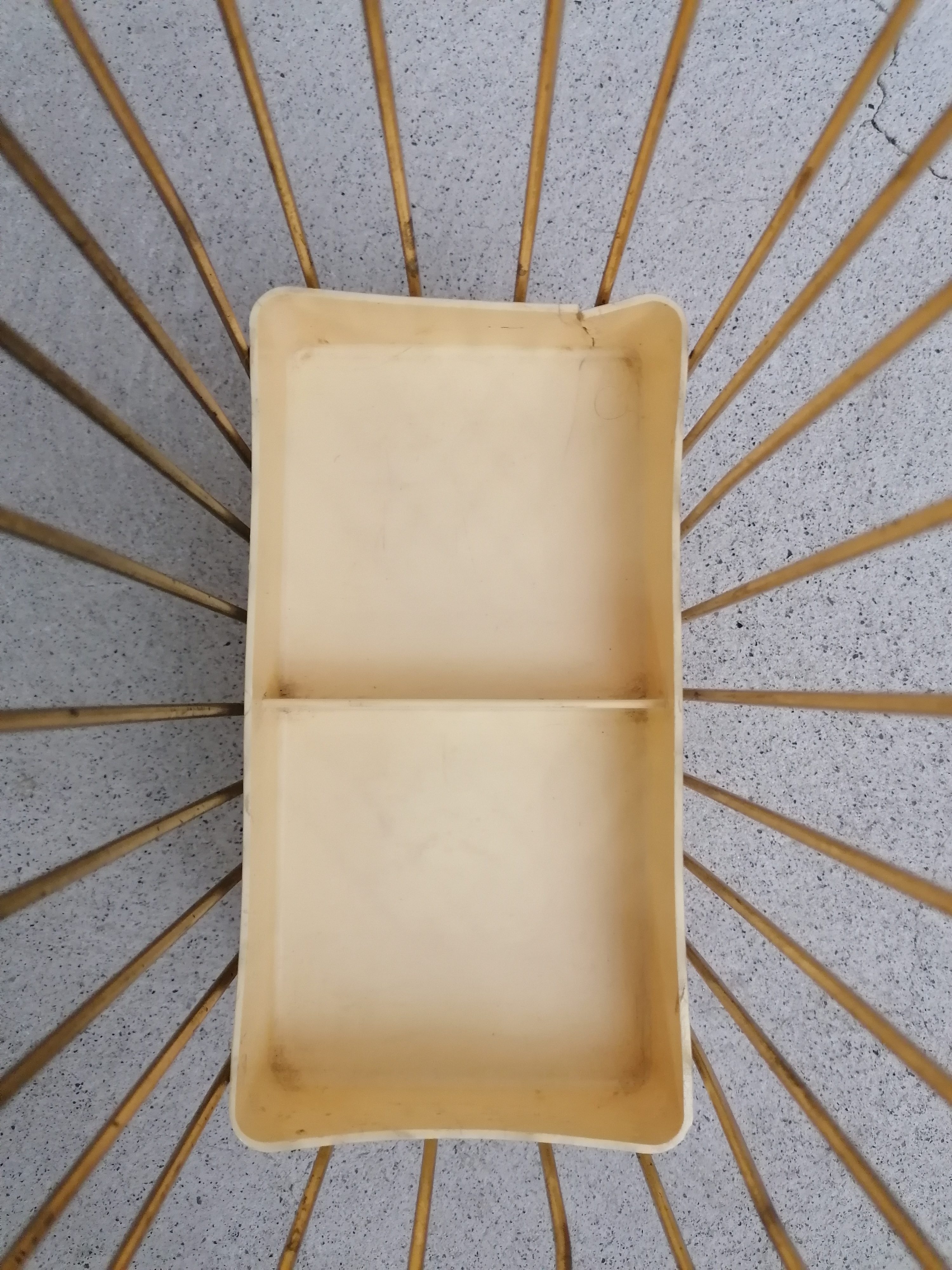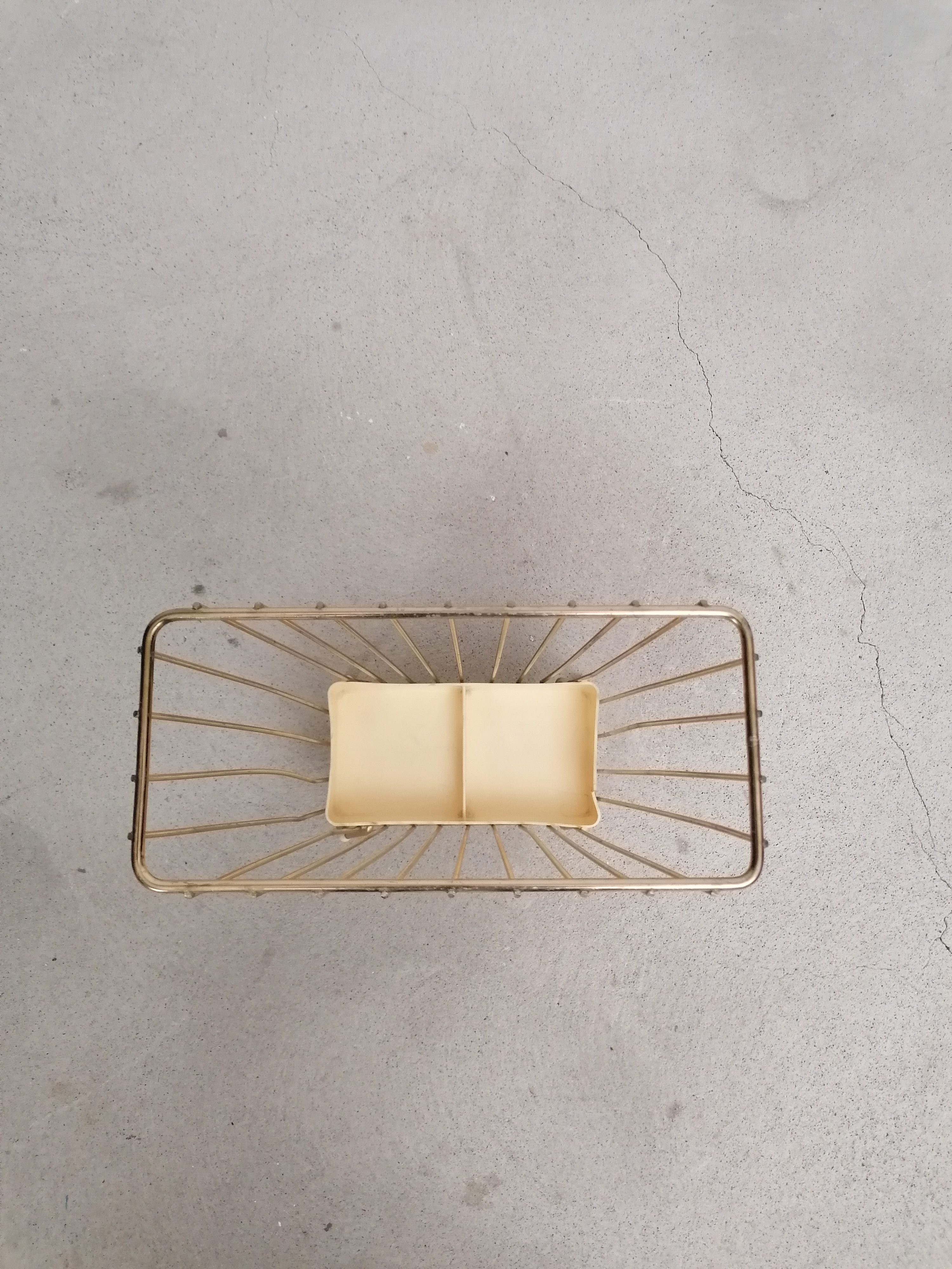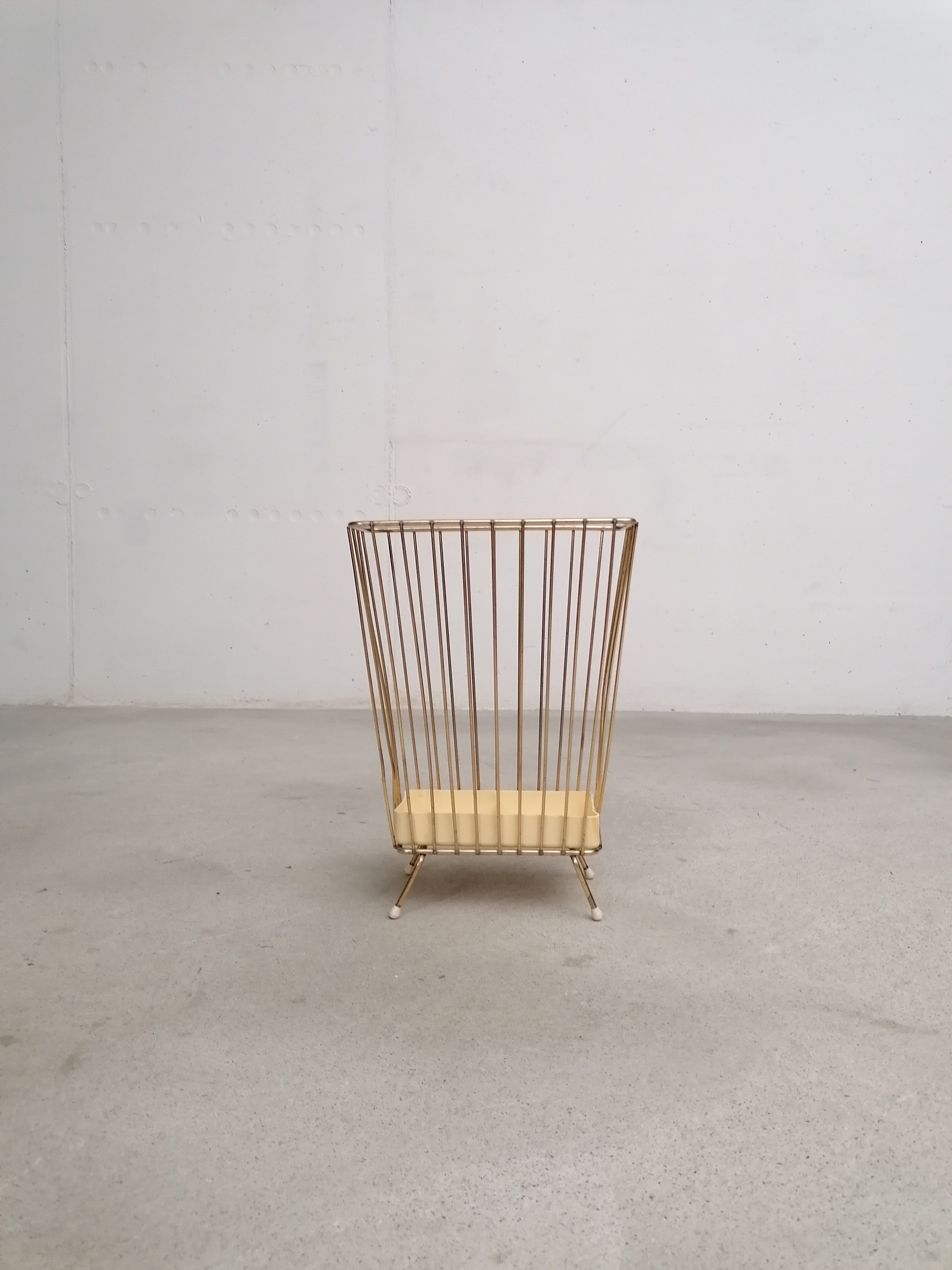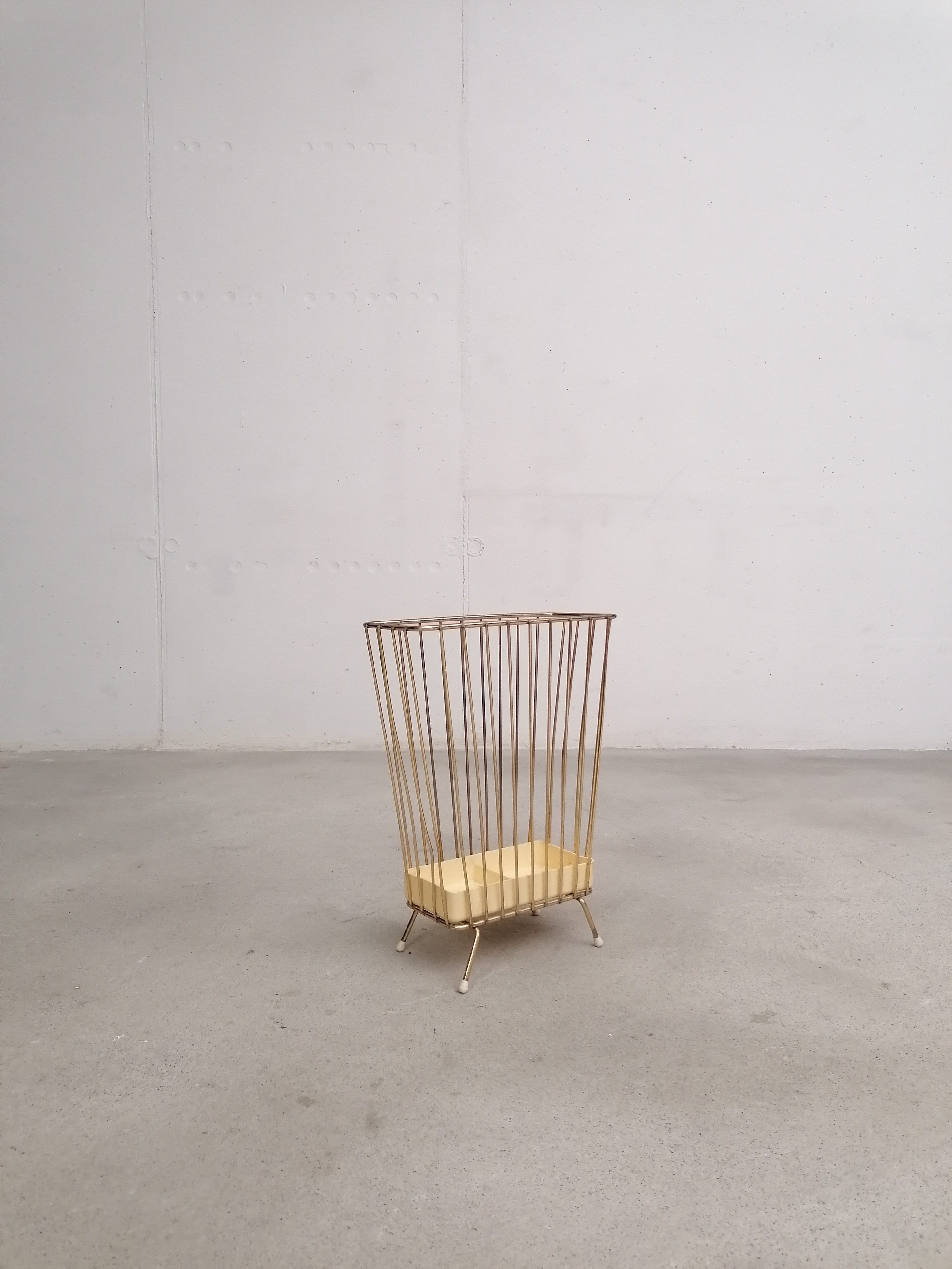 Produit venduPorte-parapluies vintage avec structure en métal laitonné et bac en plastique. Le bas est fissuré à un endroit (voir photo) mais le porte-parapluies est stable et solide et parfaitement fonctionnel.