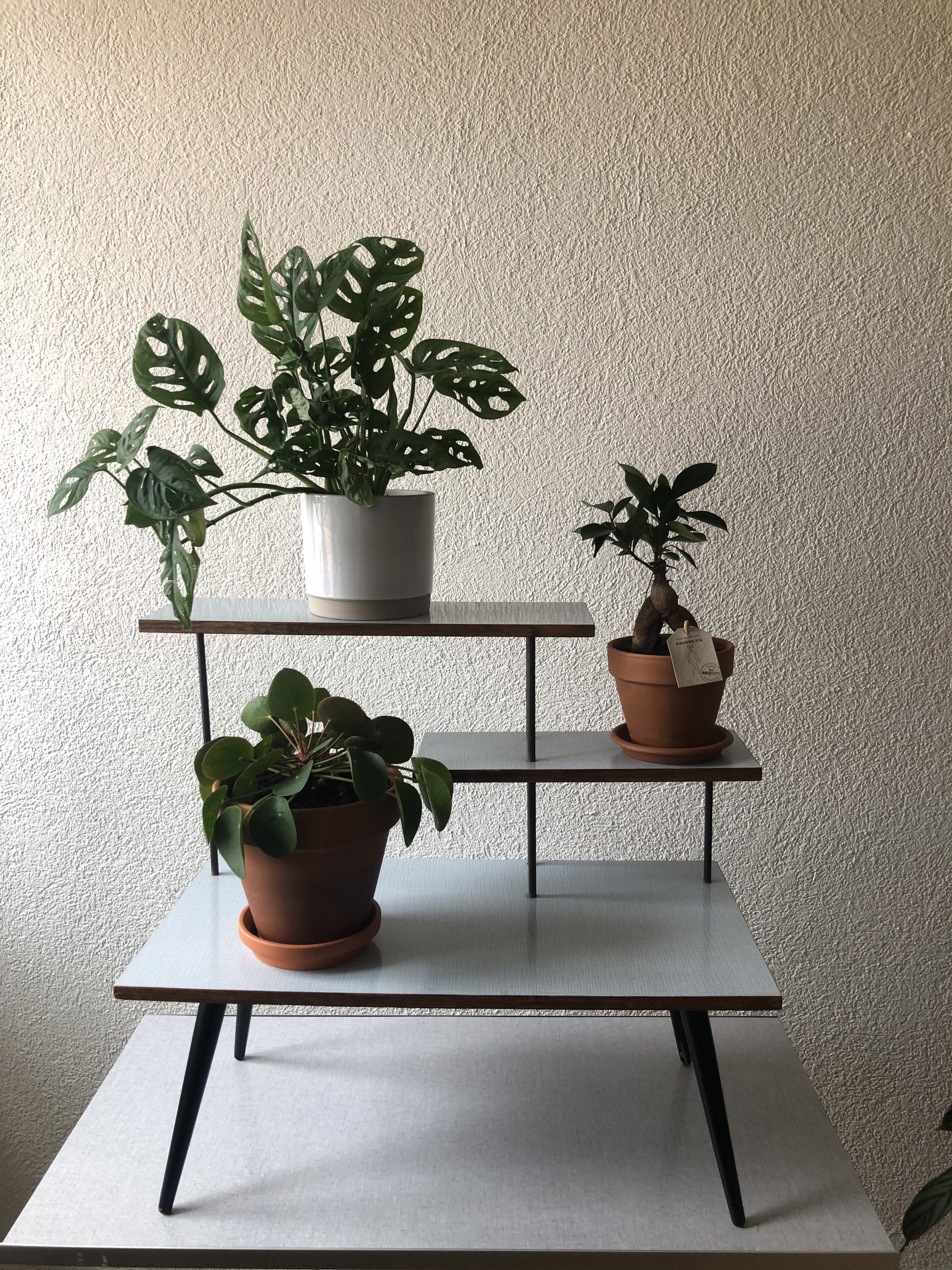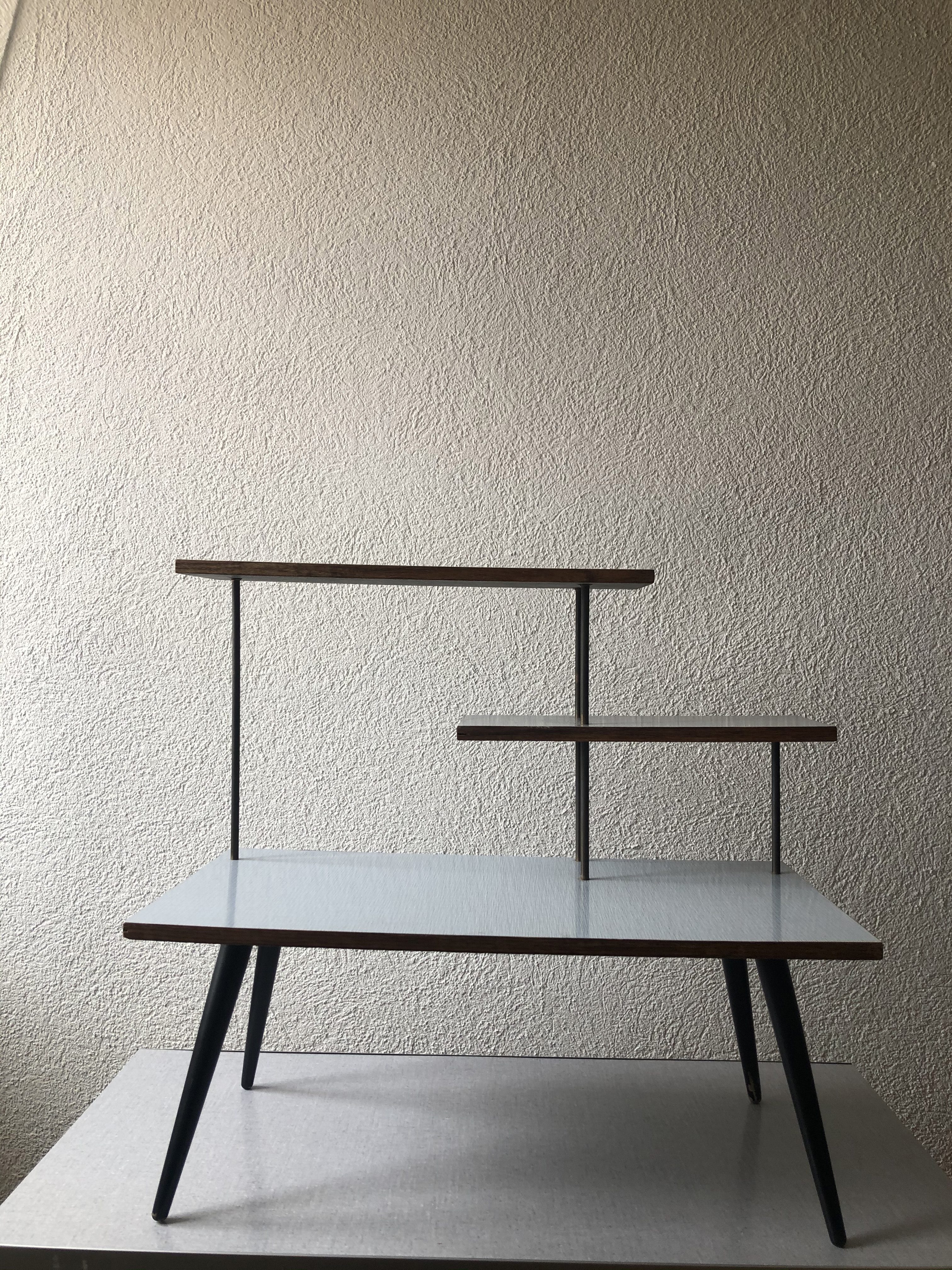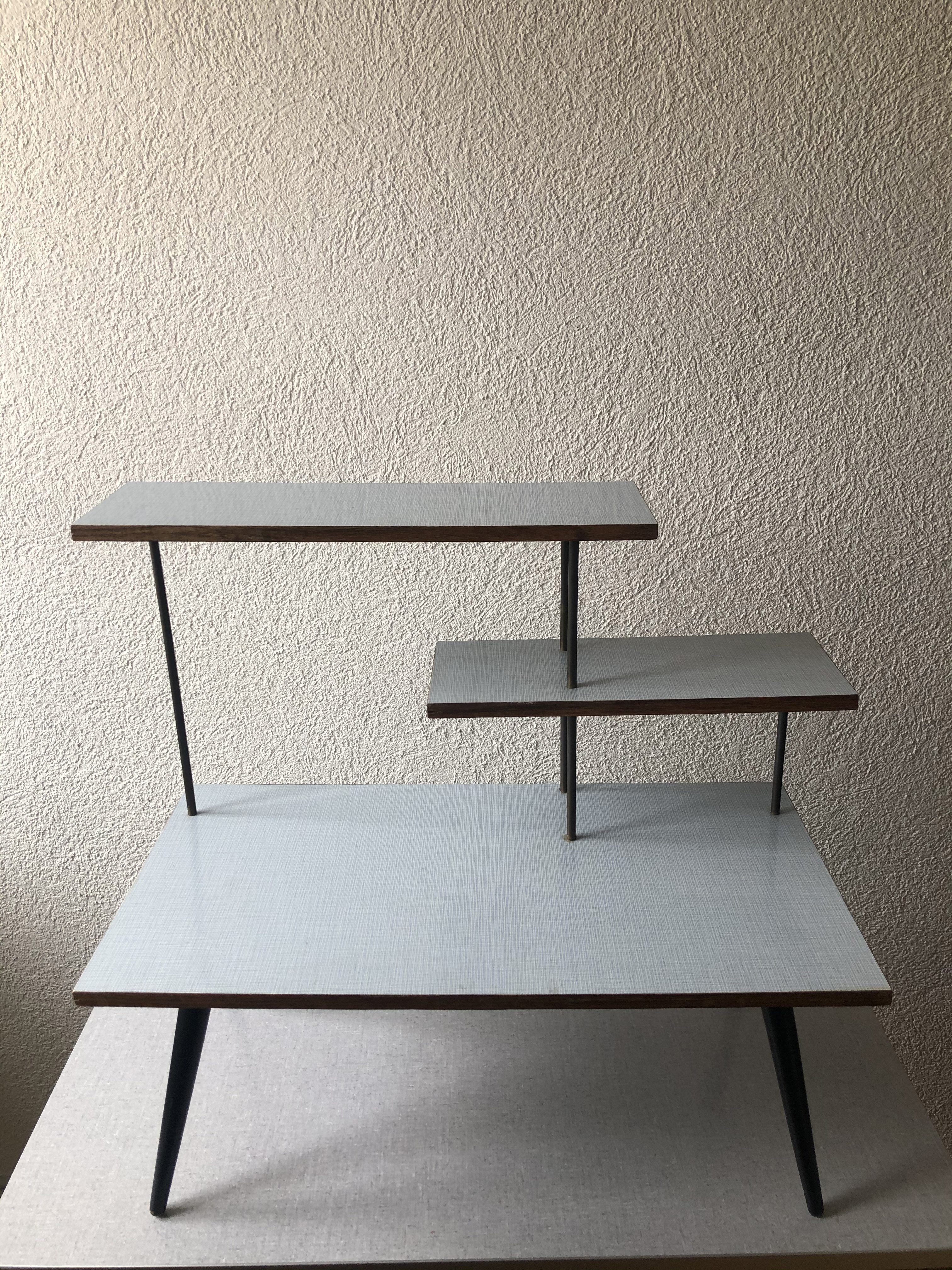 Produit venduPorte-plantes en formica bleu avec 3 plateformes et pieds compas.