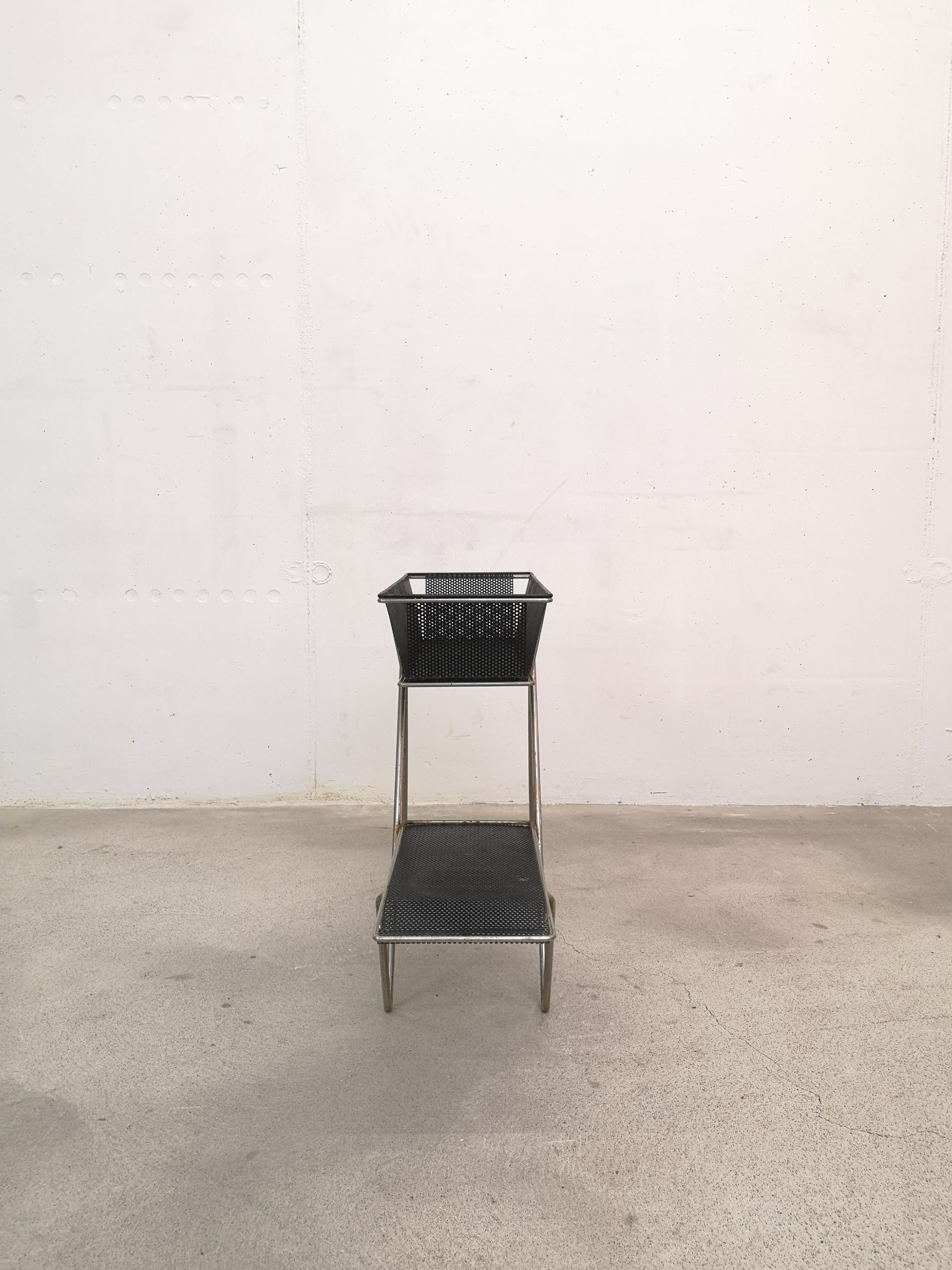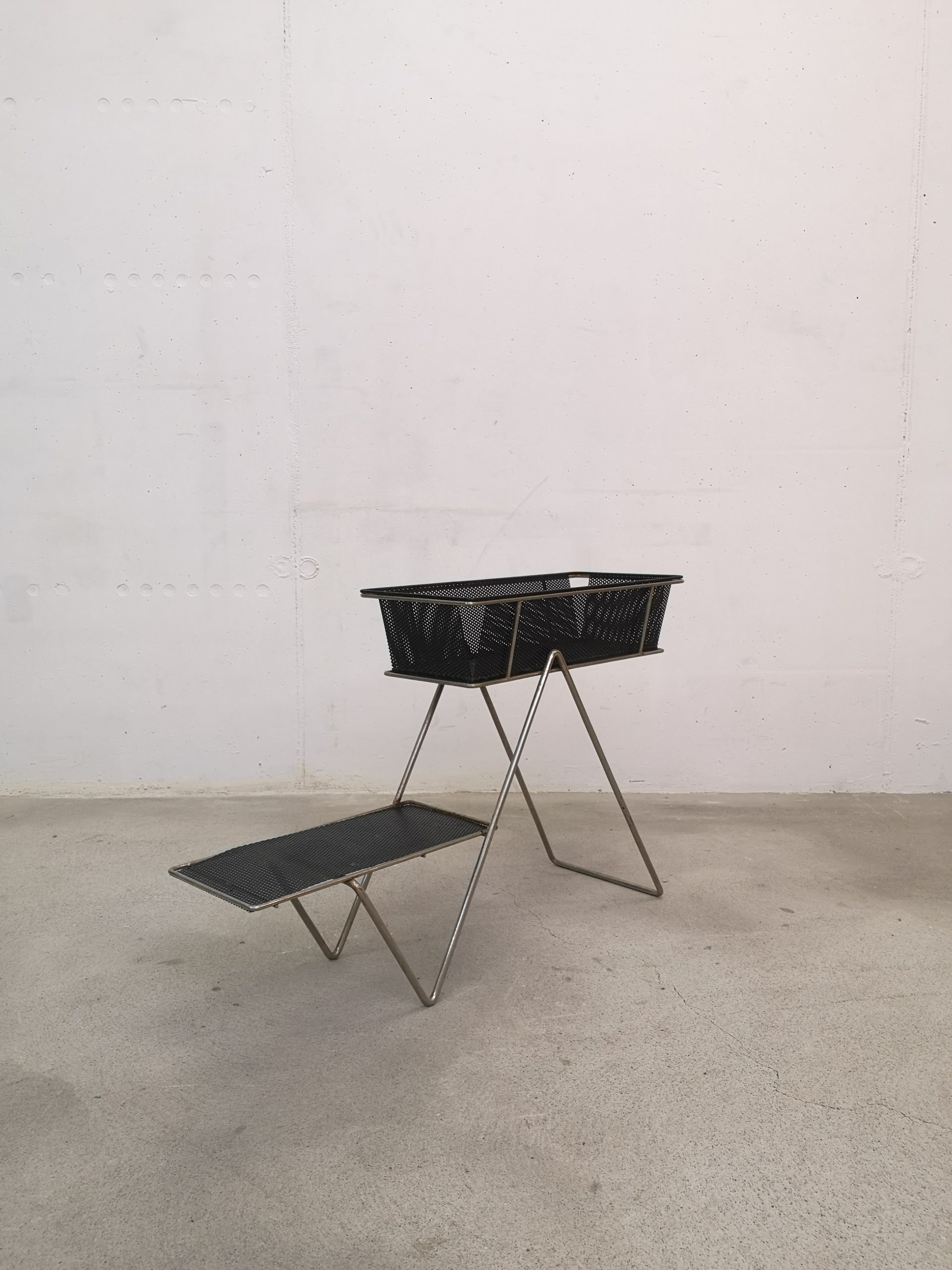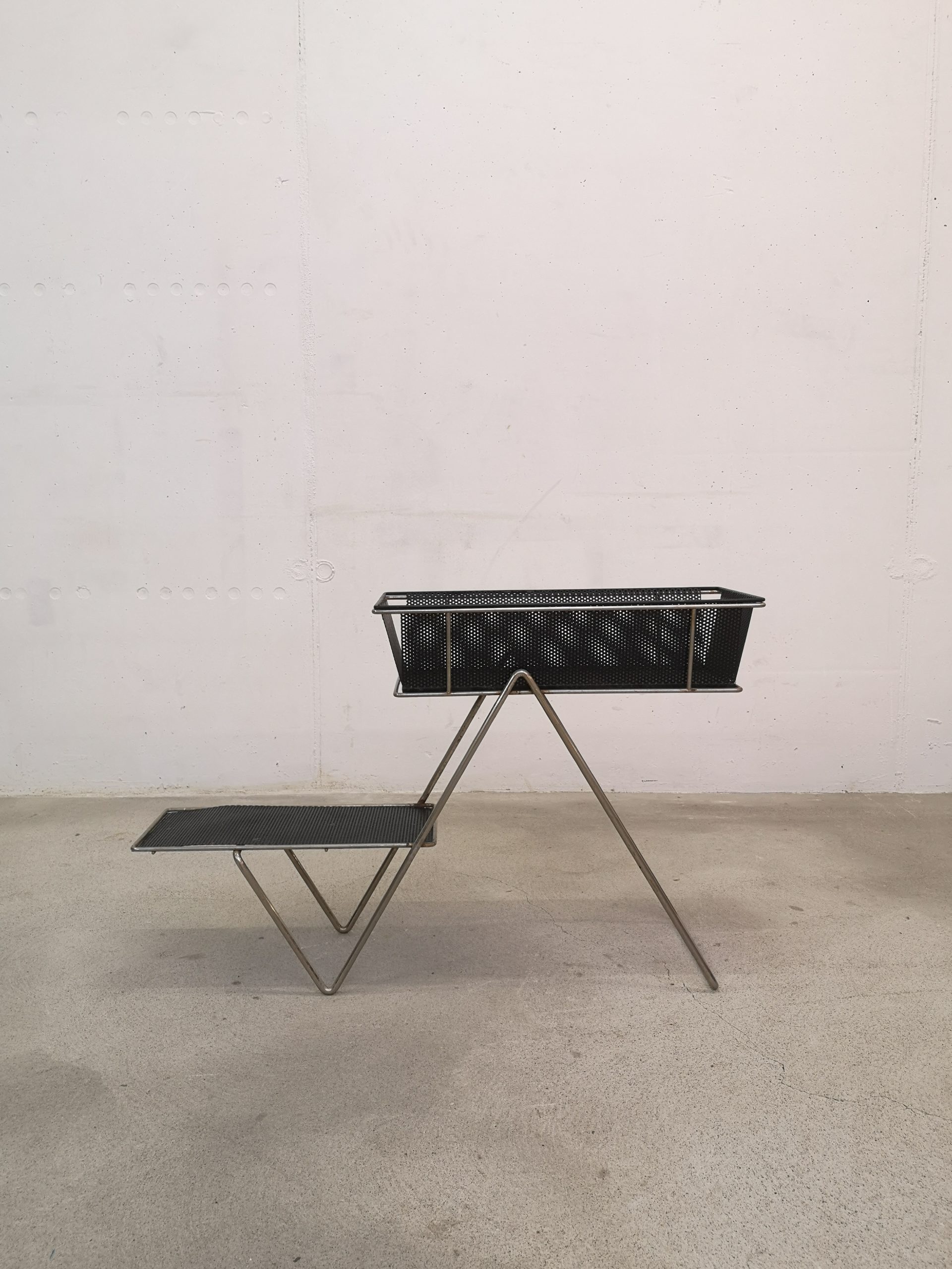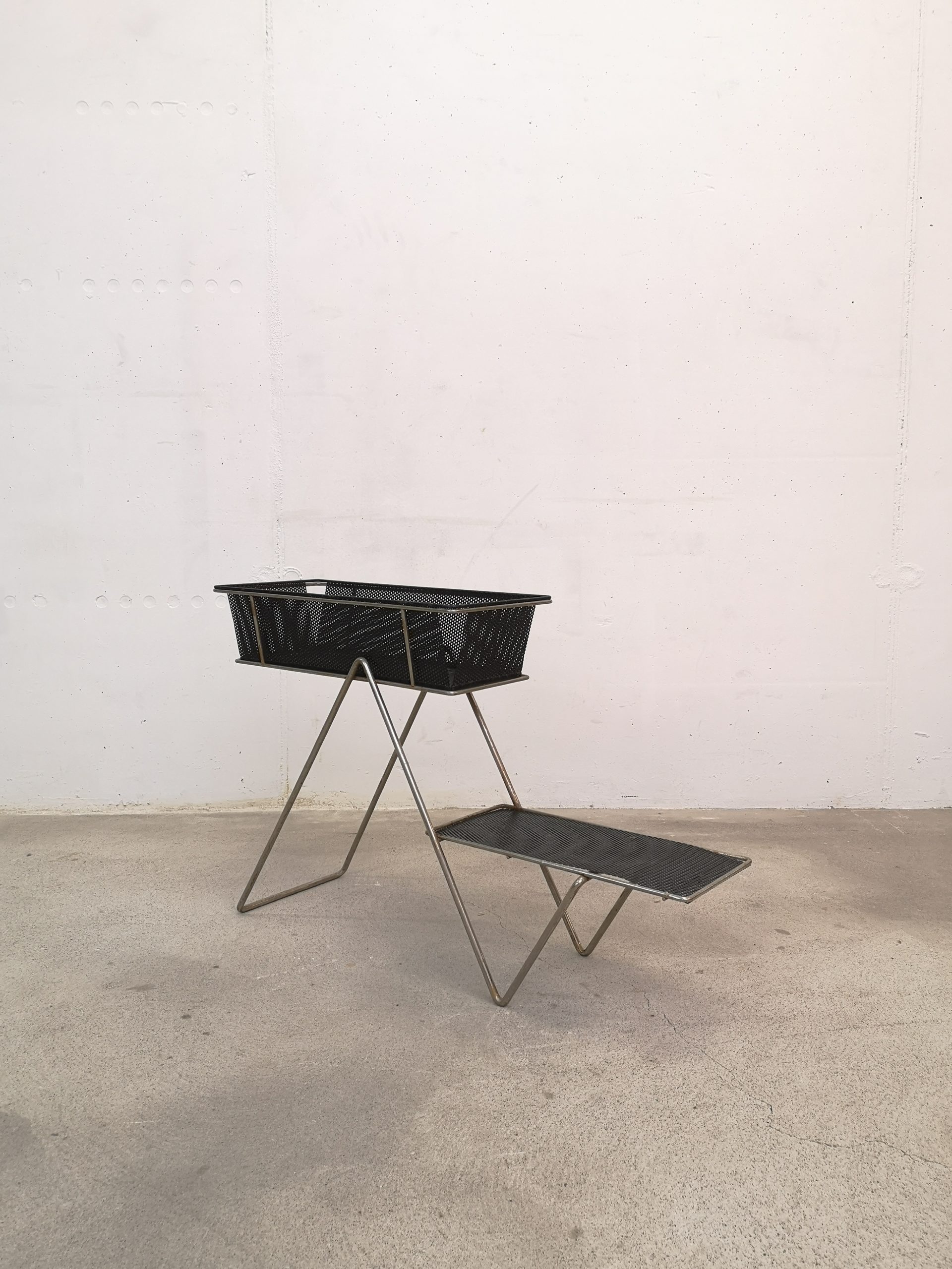 Produit venduPorte-plantes perforé avec structure en métal doté d’une jardinière et d’une étagère. Traces d’usure standard pour ce type d’objet dont des taches de couleur laitonné ici et là et l’étagère perforée est quelque peu courbée.