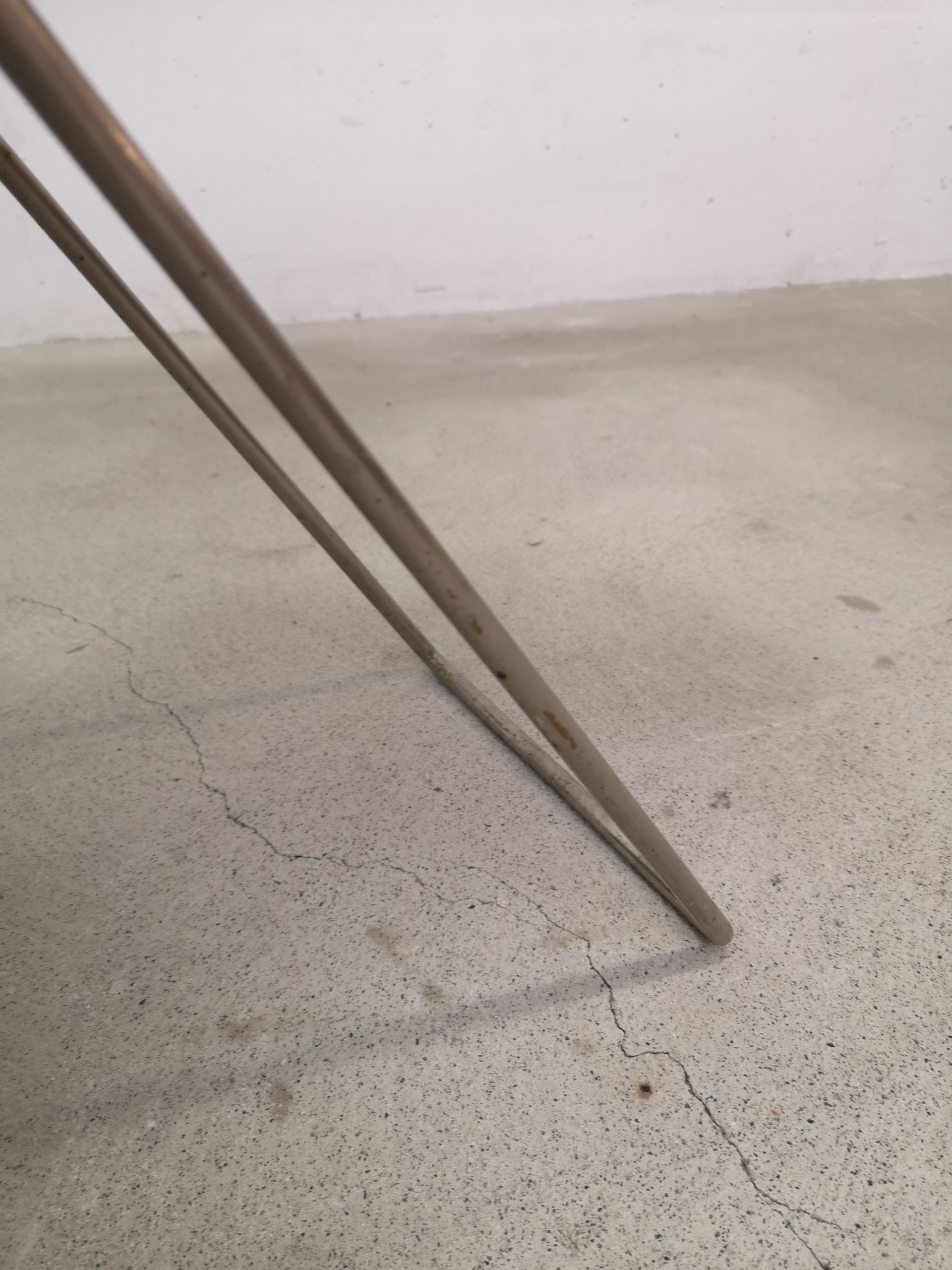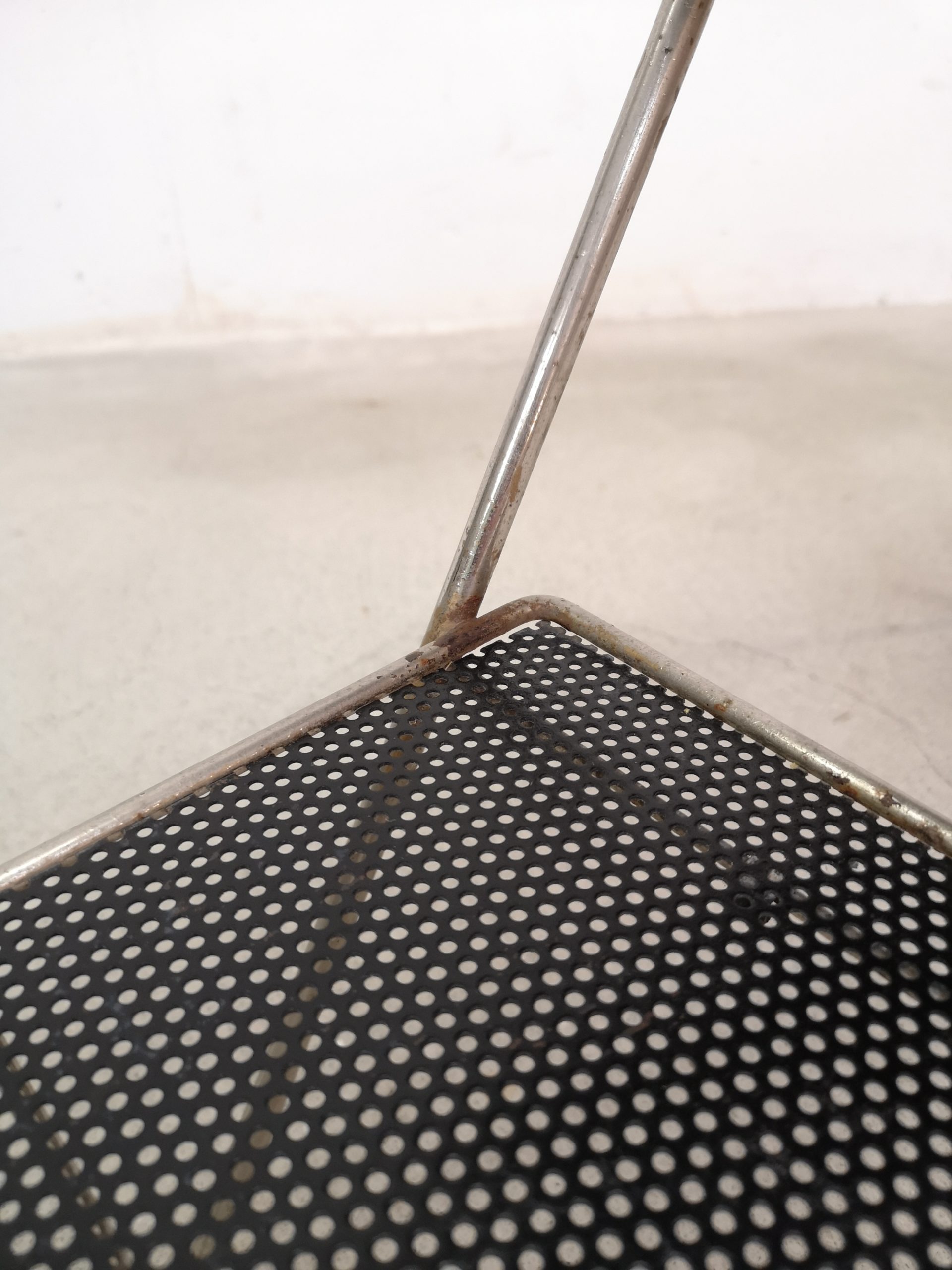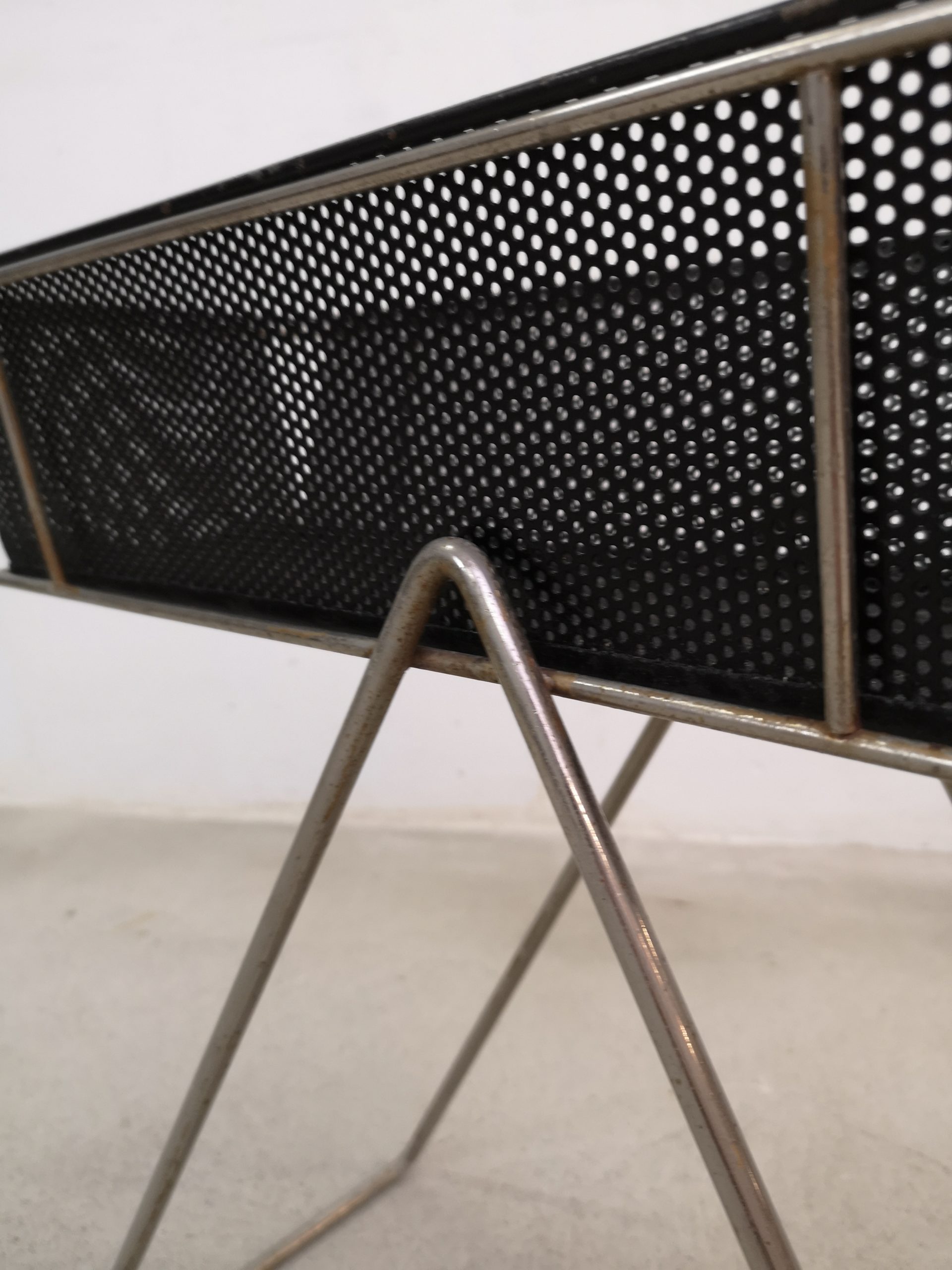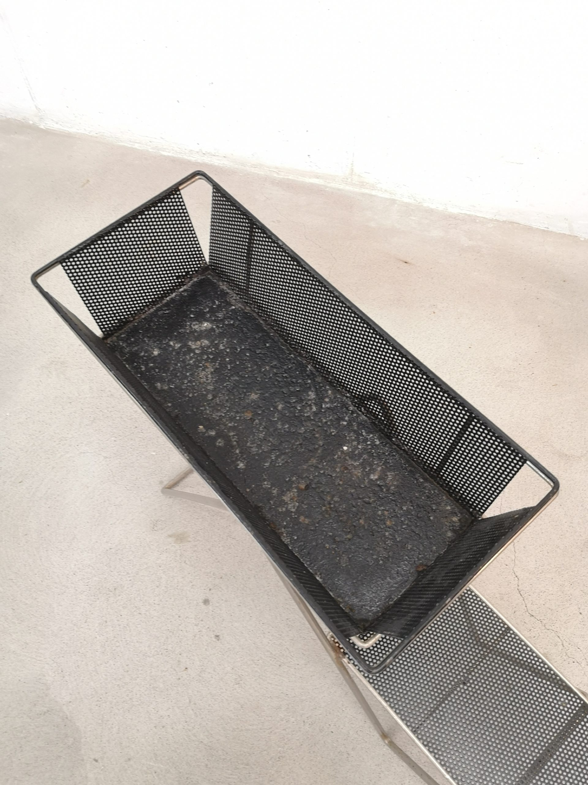 Produit venduPorte-plantes perforé avec structure en métal doté d’une jardinière et d’une étagère. Traces d’usure standard pour ce type d’objet dont des taches de couleur laitonné ici et là et l’étagère perforée est quelque peu courbée.
