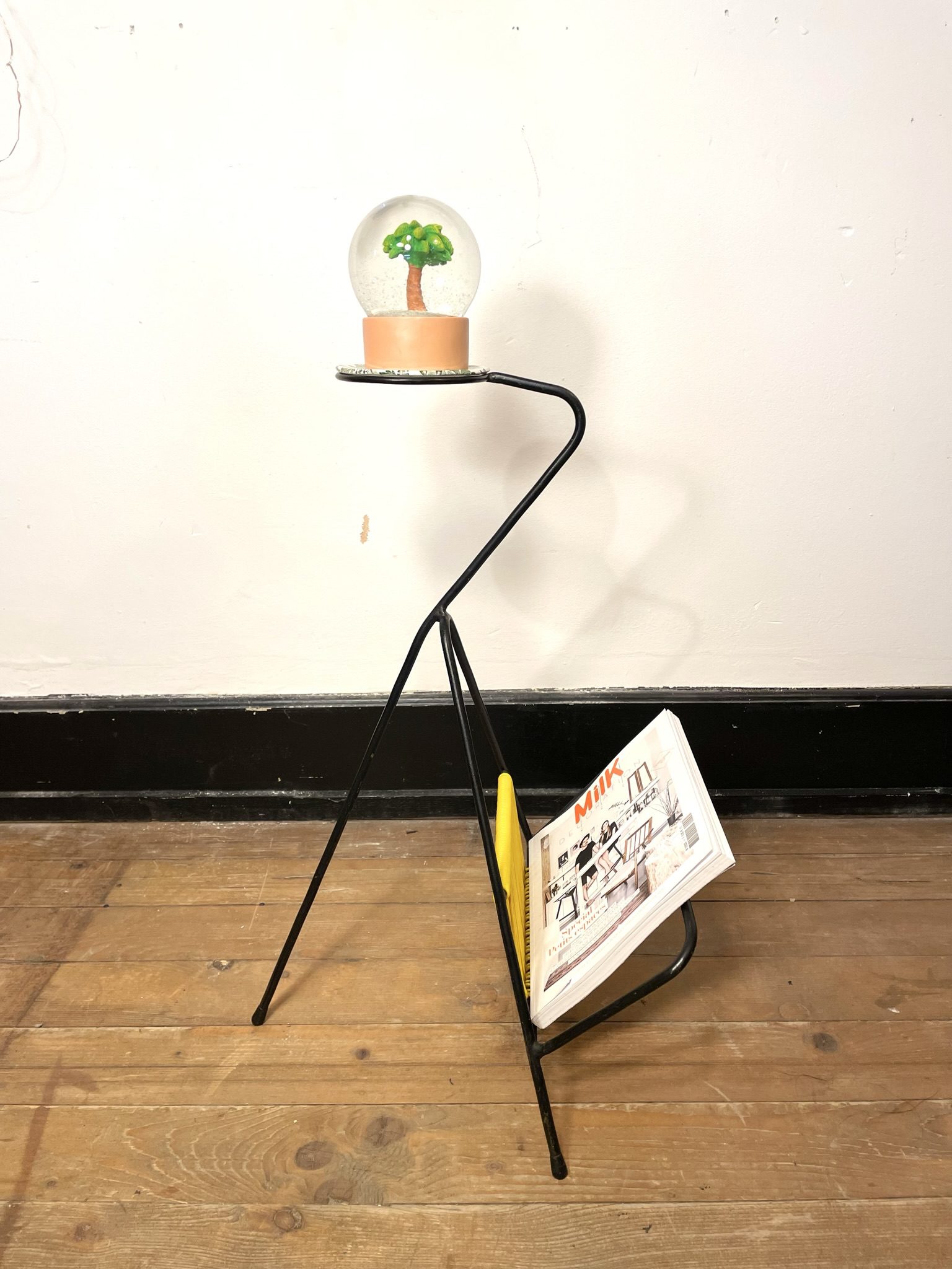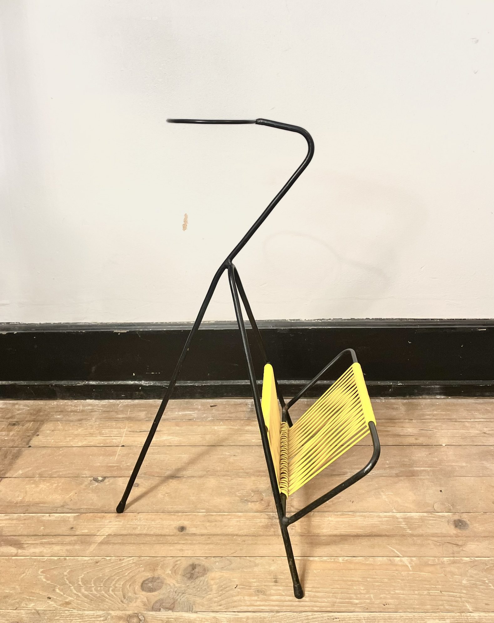 Porte revue/plante vintage avec scoubidou jaune et pieds métalliques. L’ouverture pour la plante est de 10,5 cm.