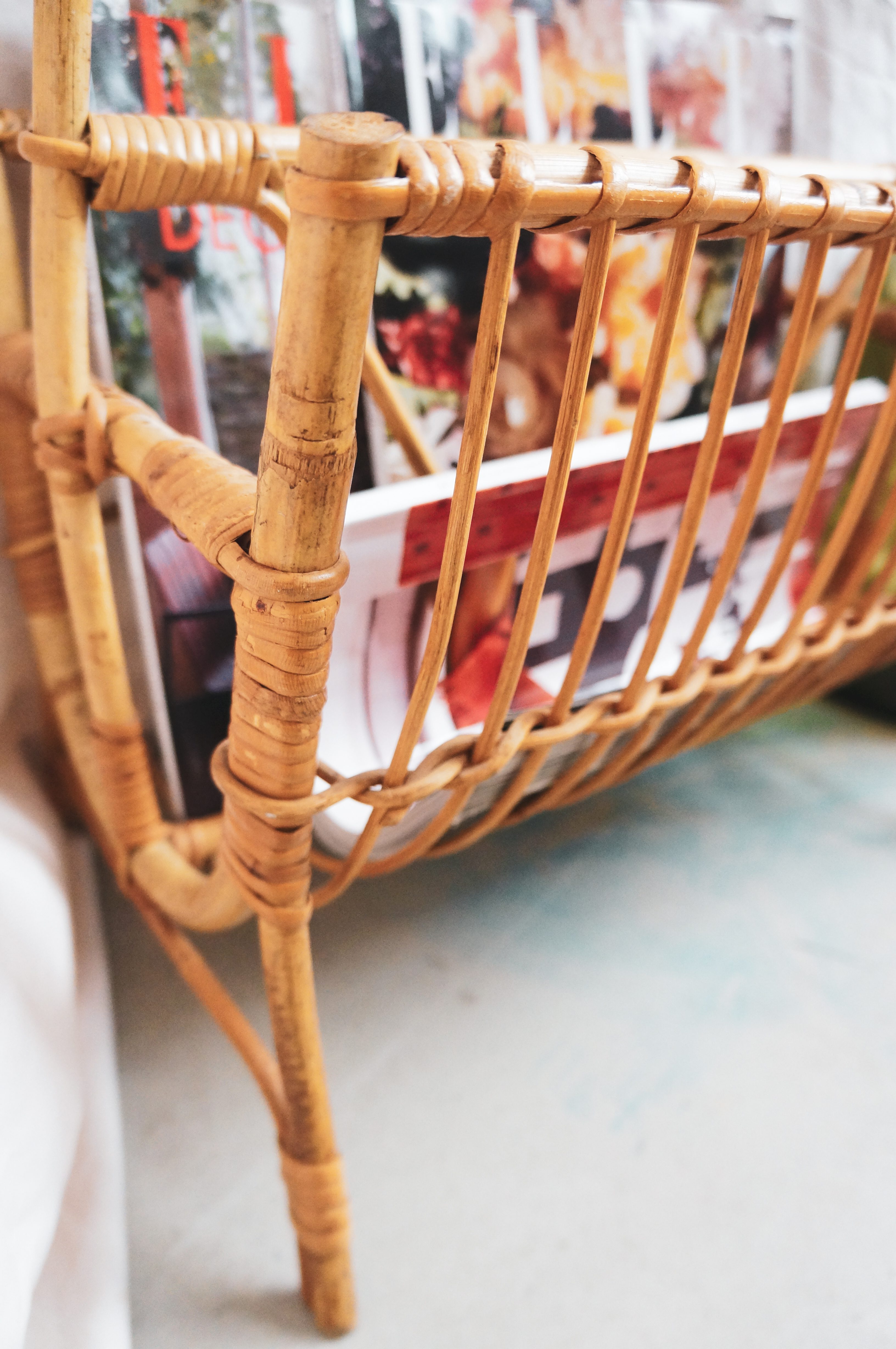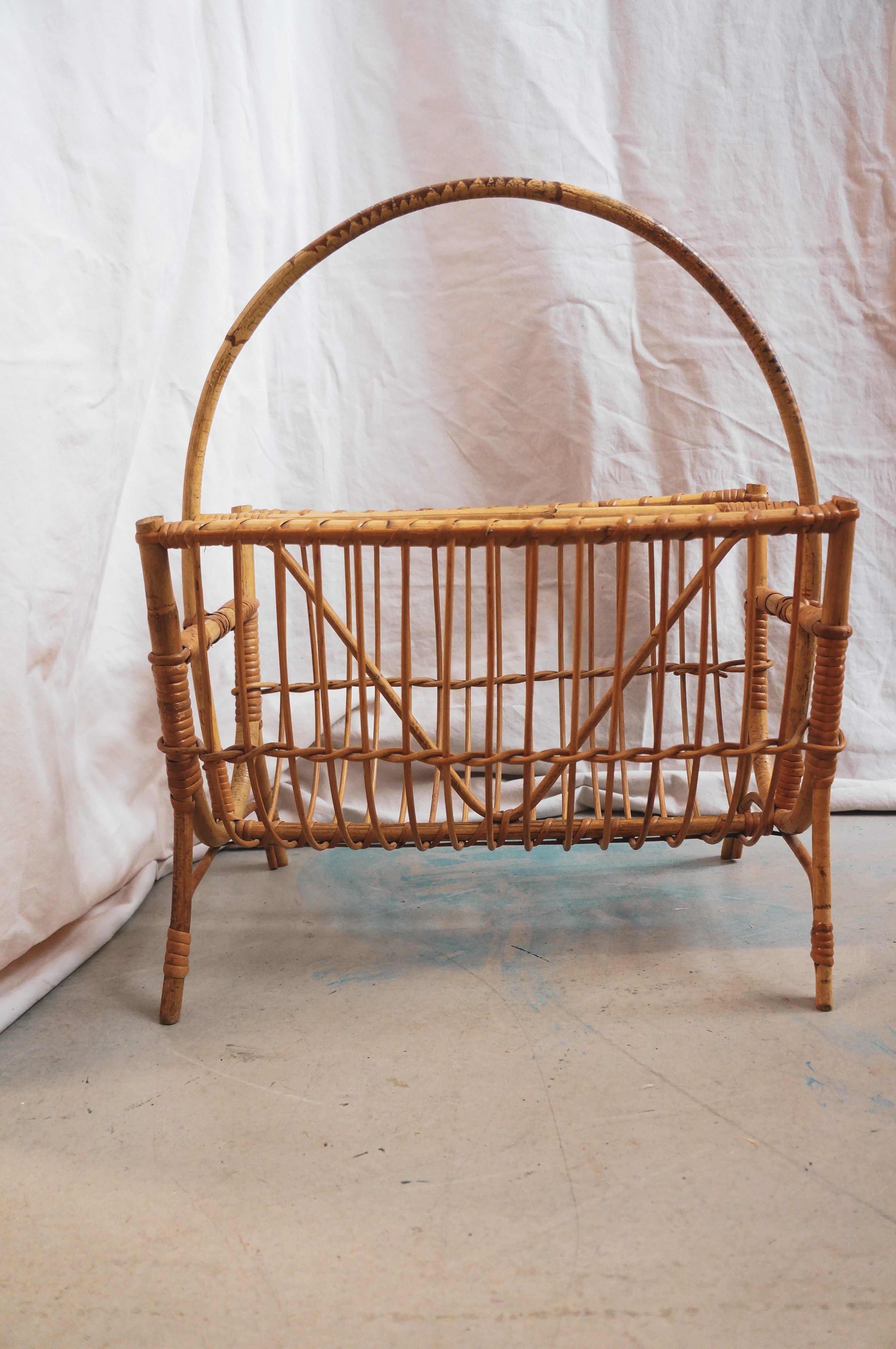 Produit venduPorte-revues vintage en rotin. Convient également pour les disques.
