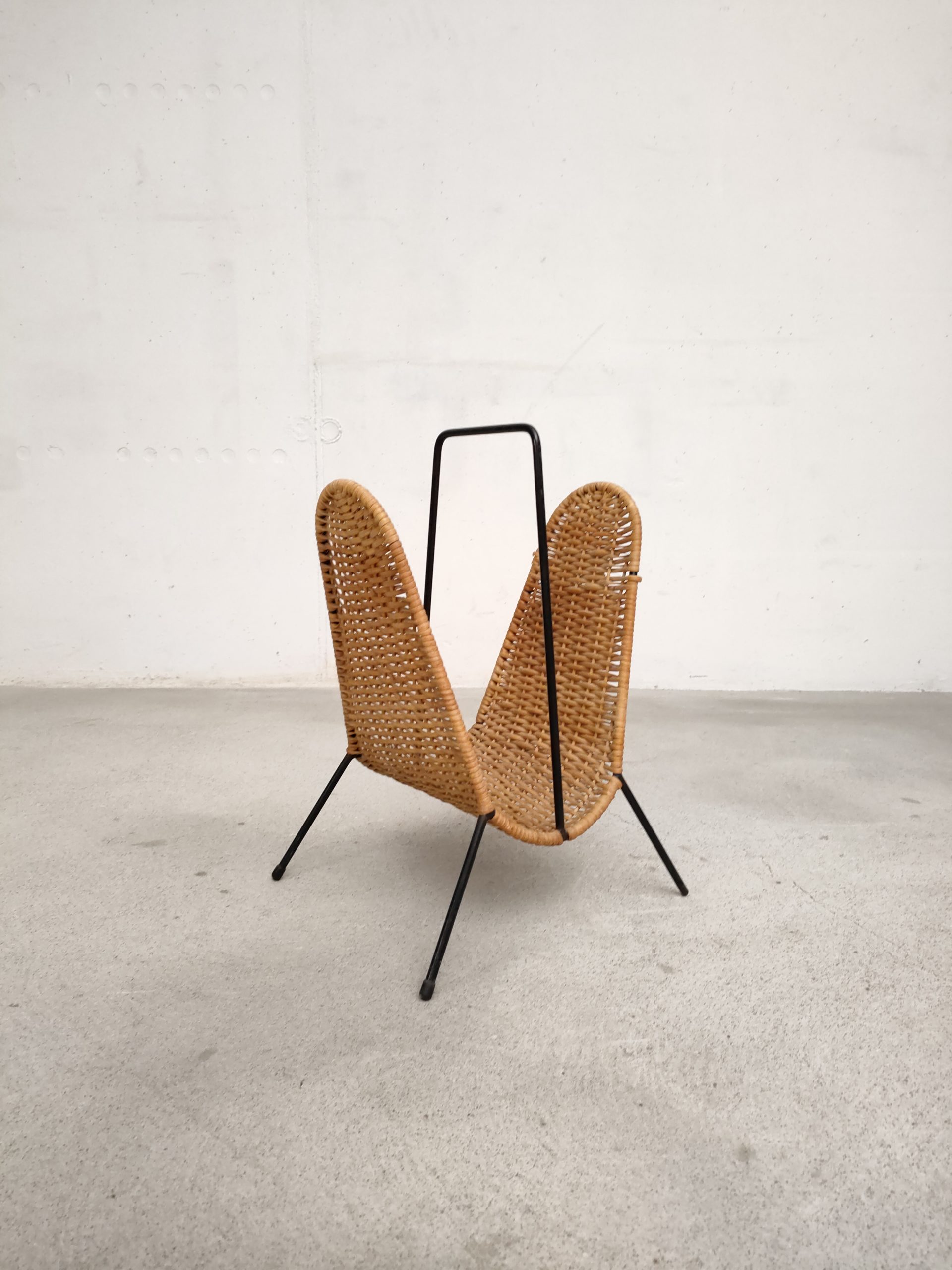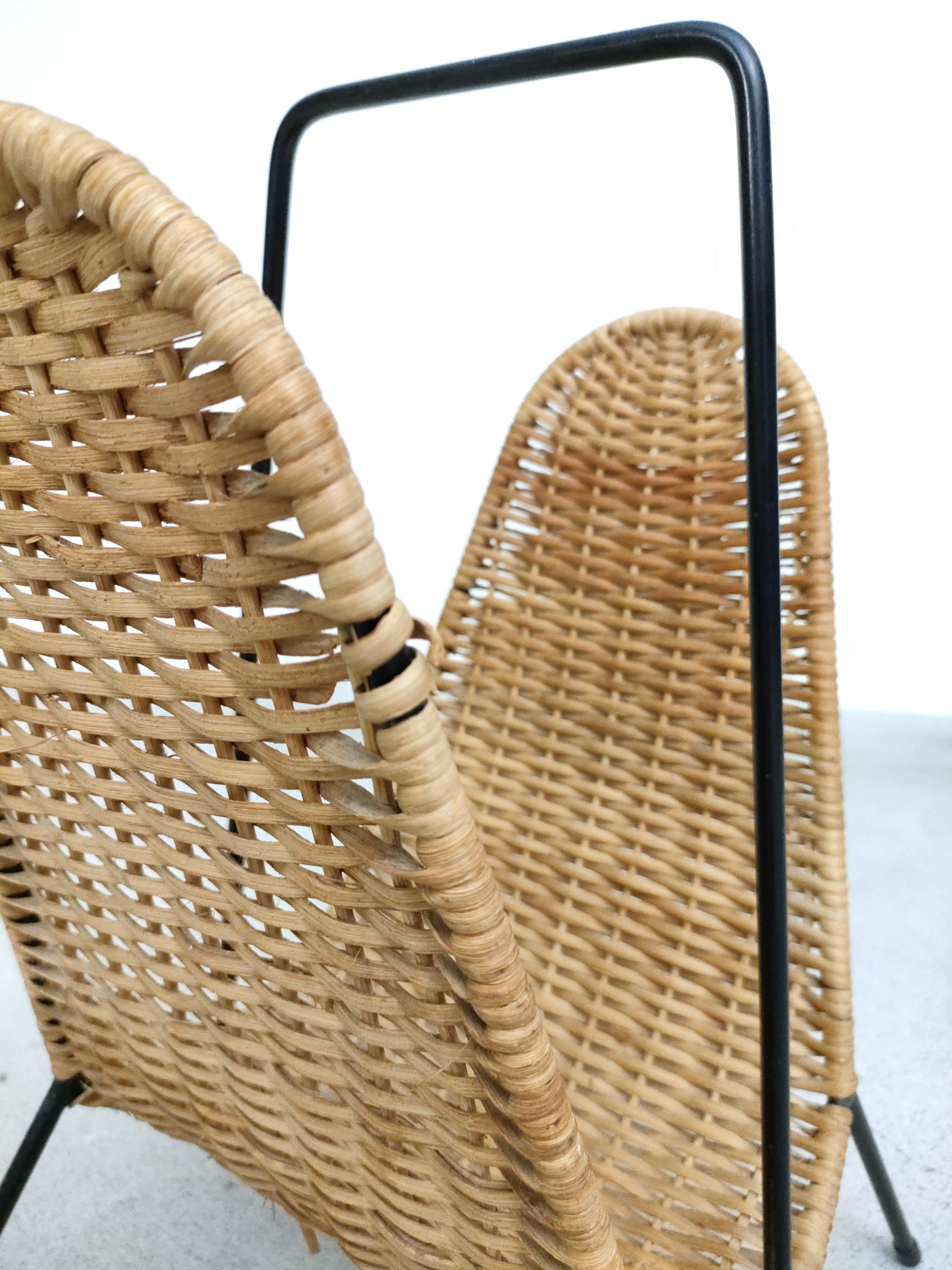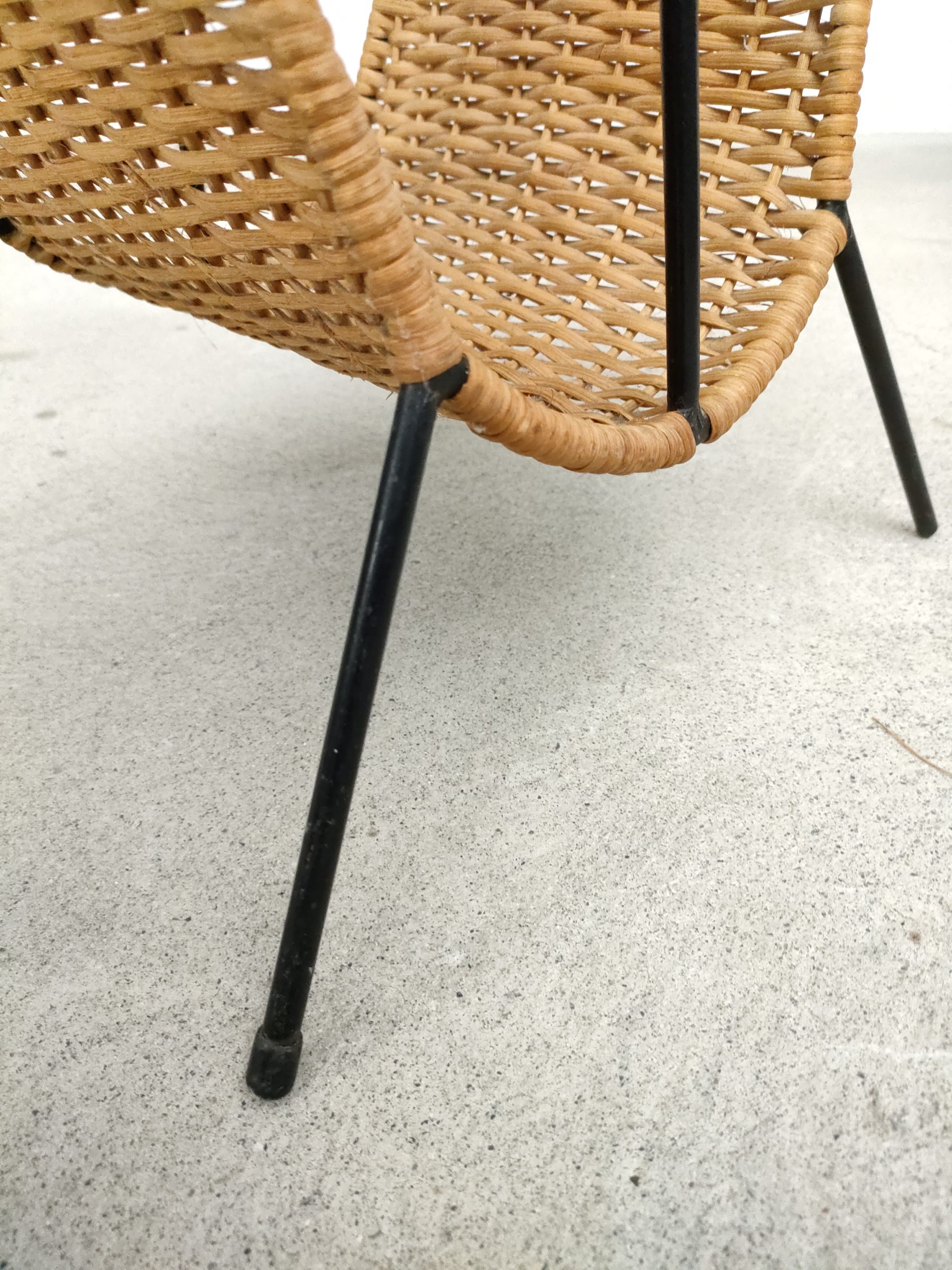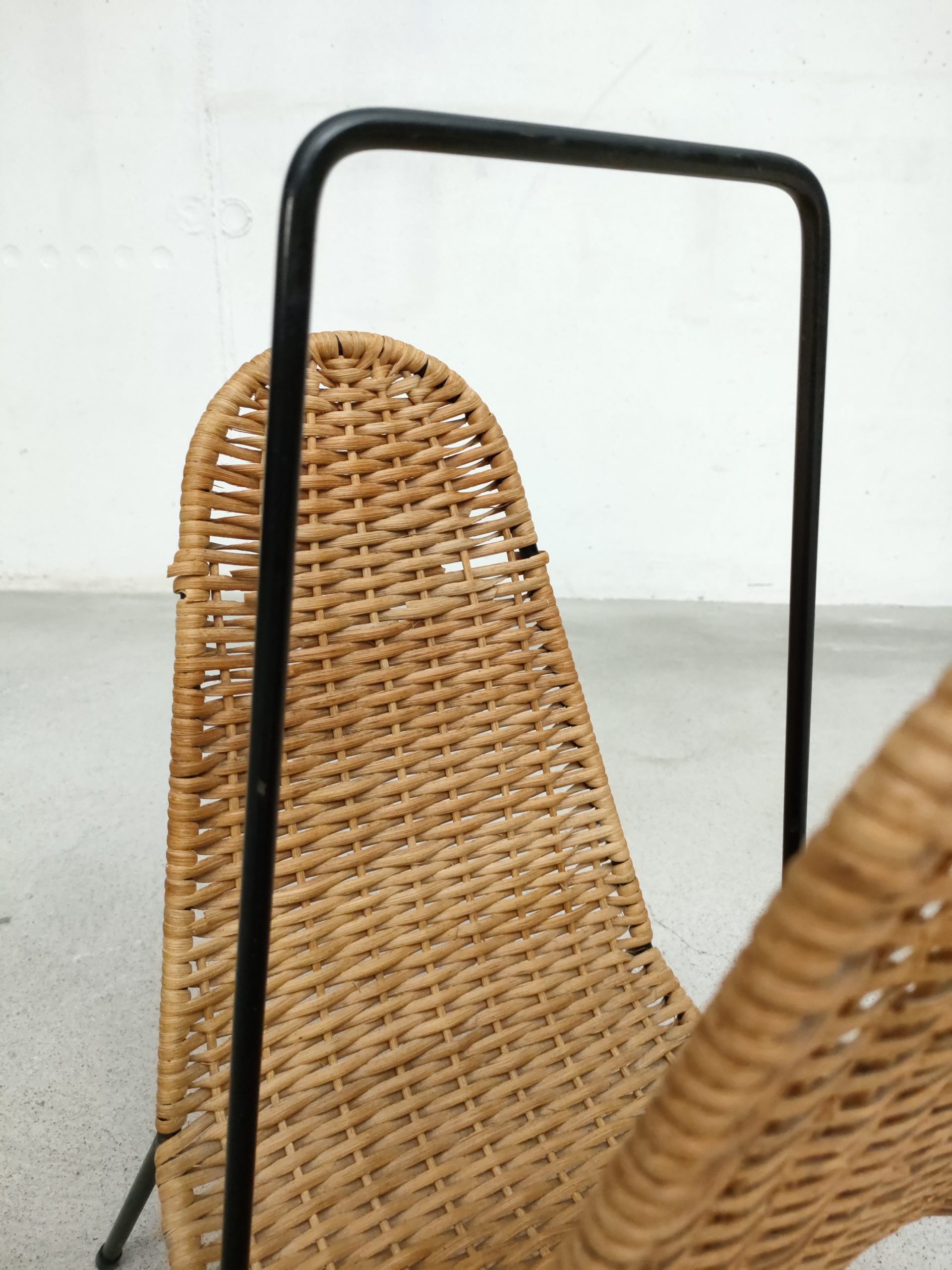 Produit venduPorte-revues en osier tressé et structure en métal noir. Le tressage présente une usure plus importante sur un côté (voir photos) et il manque un petit pied en caoutchouc.