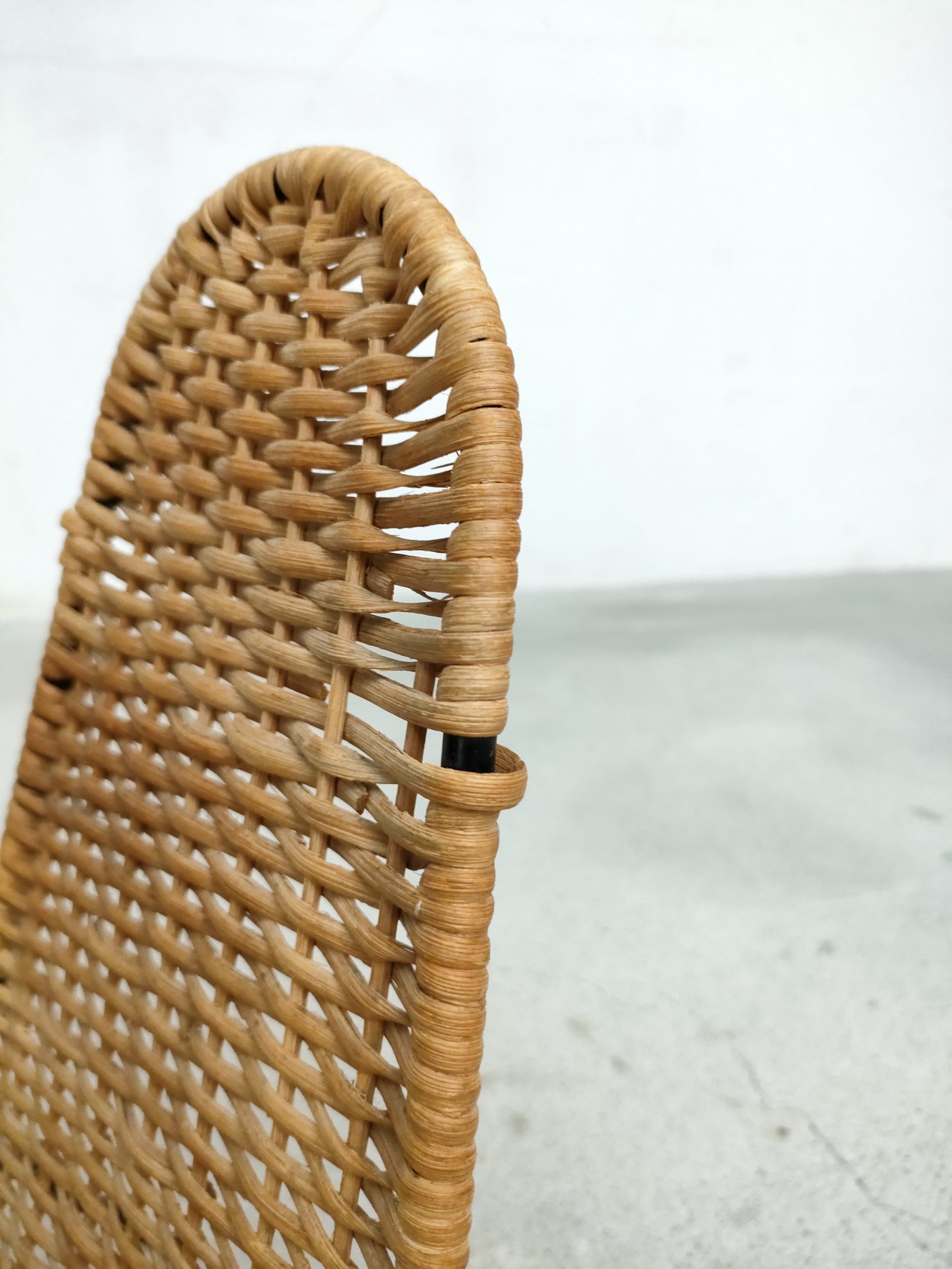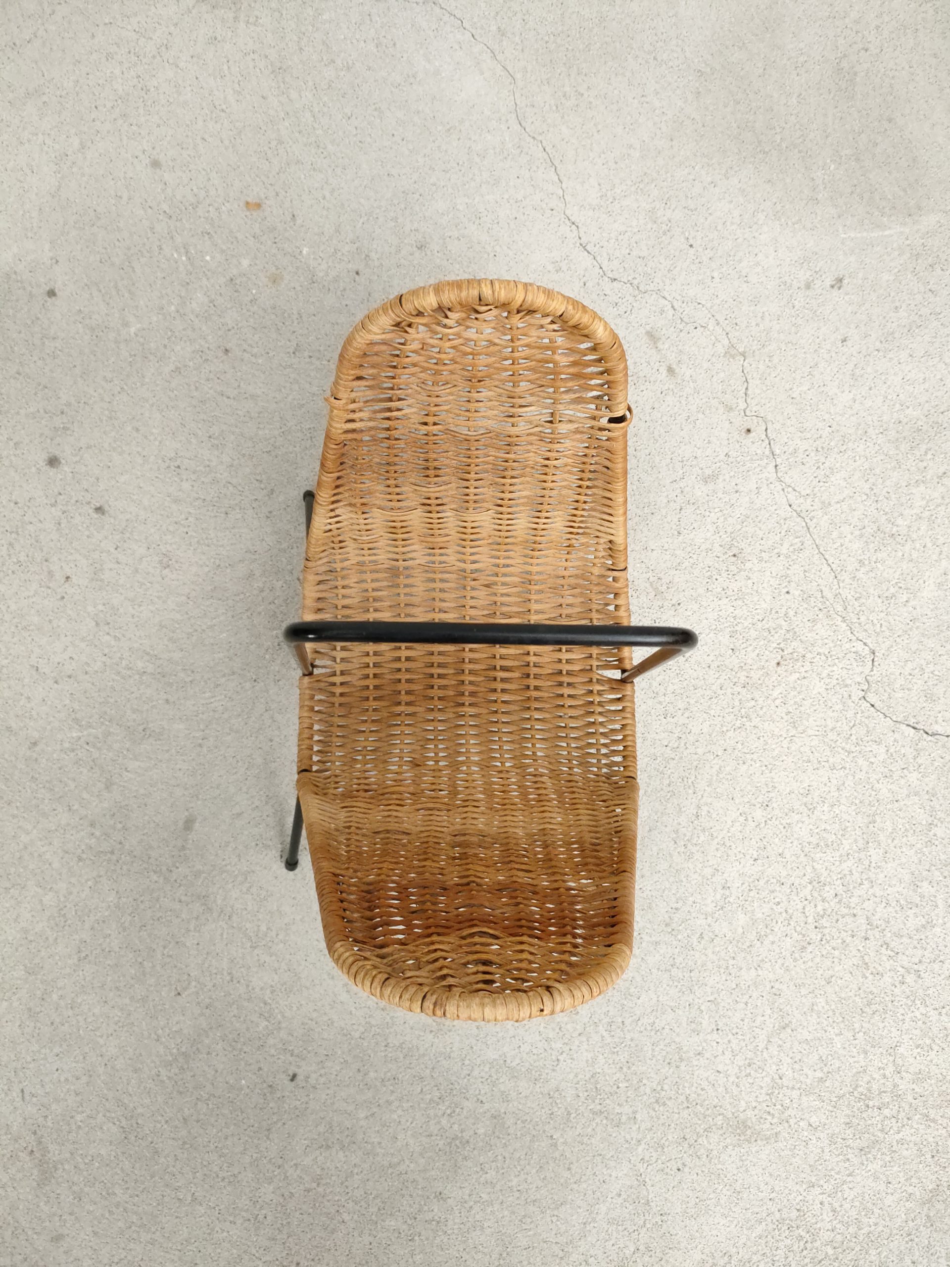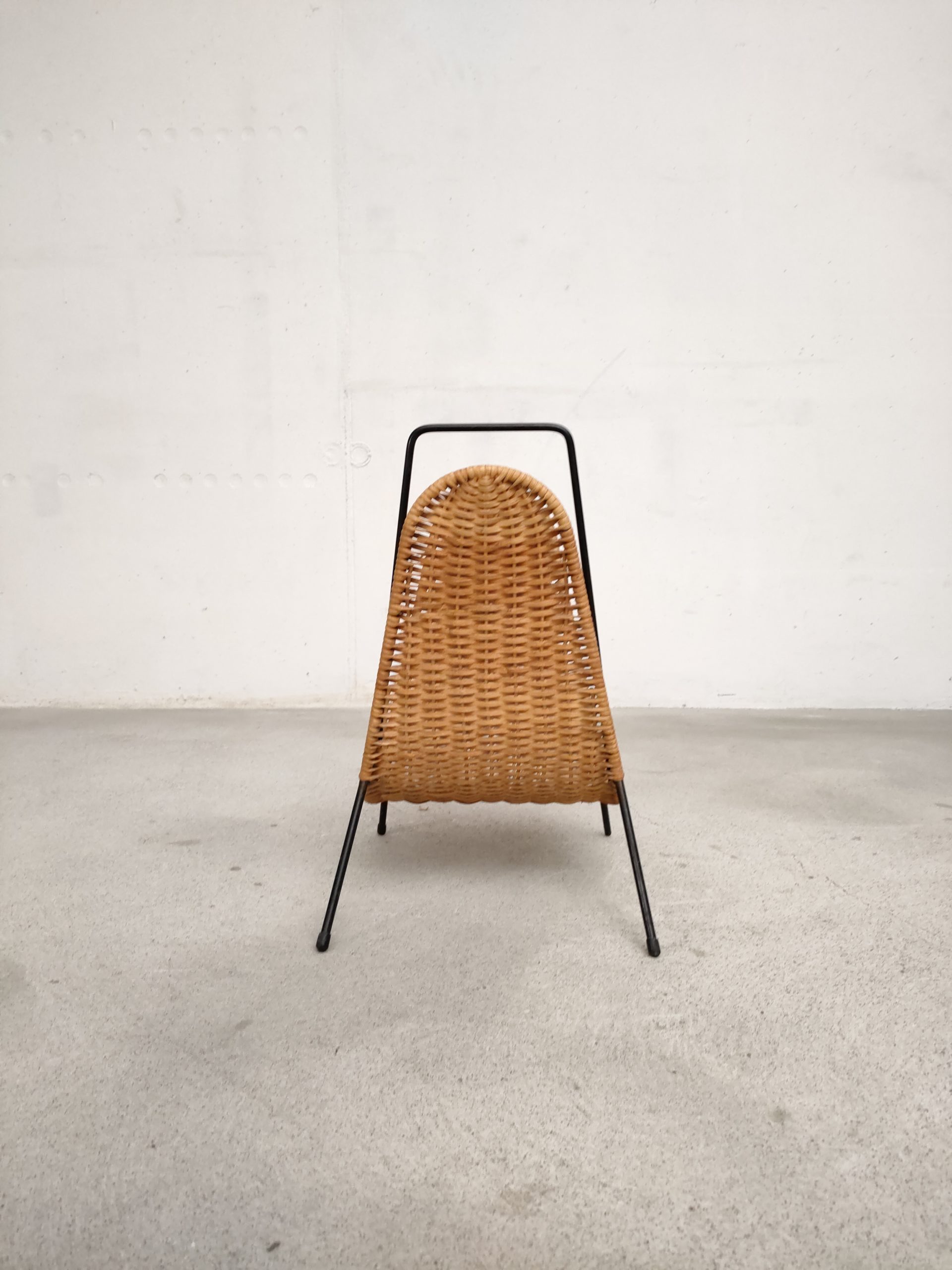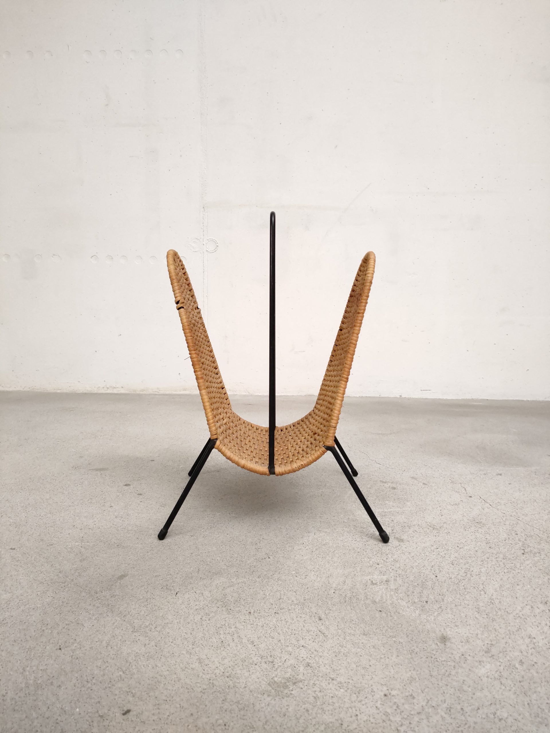 Produit venduPorte-revues en osier tressé et structure en métal noir. Le tressage présente une usure plus importante sur un côté (voir photos) et il manque un petit pied en caoutchouc.