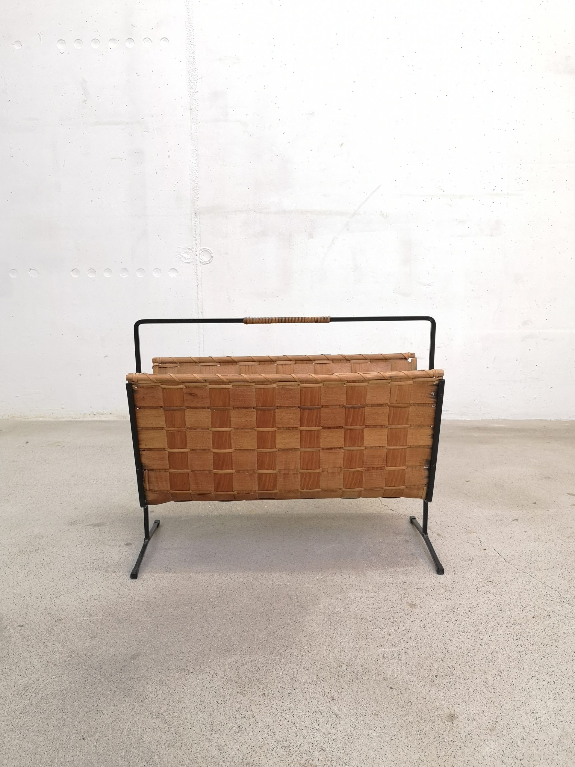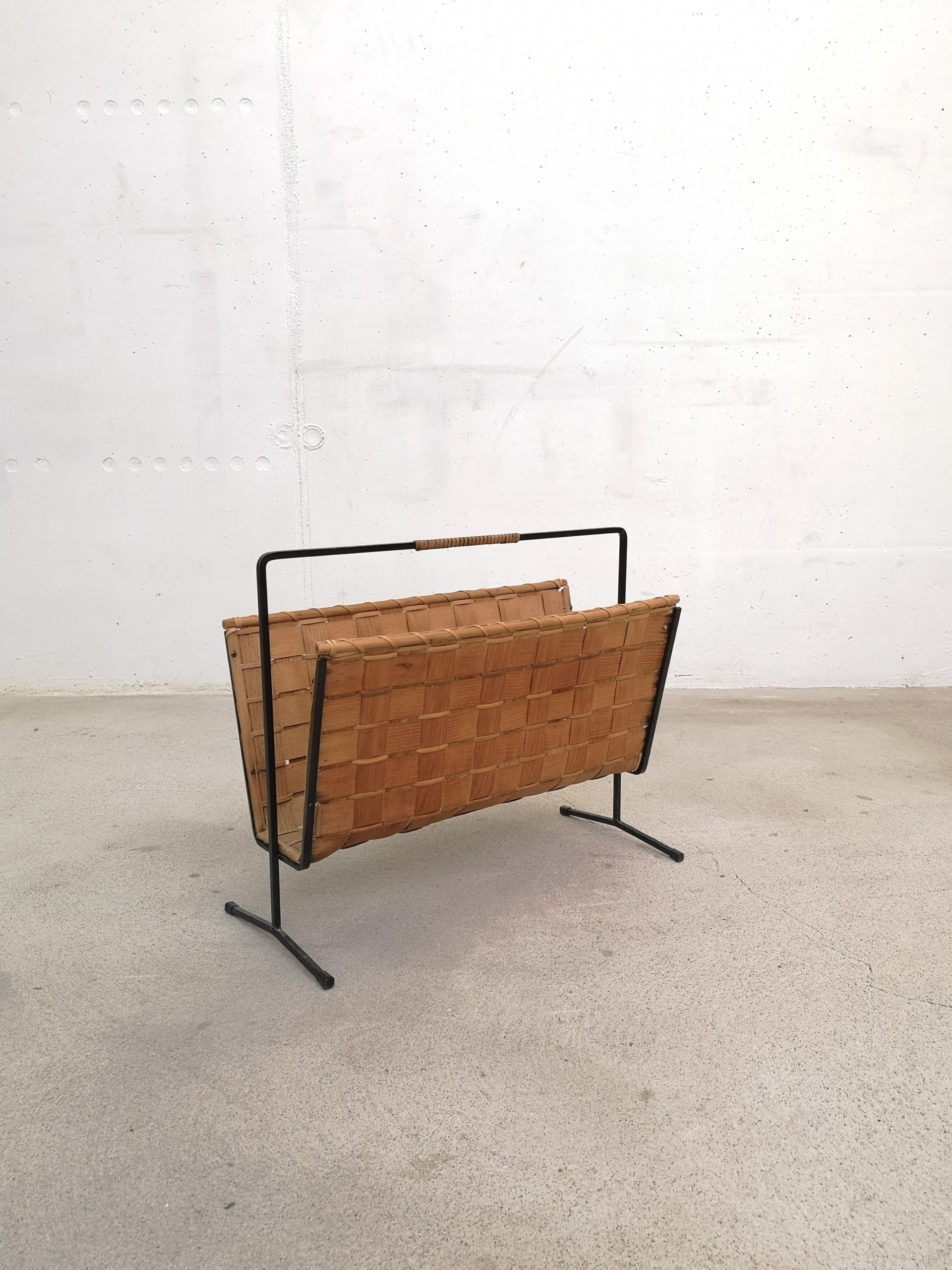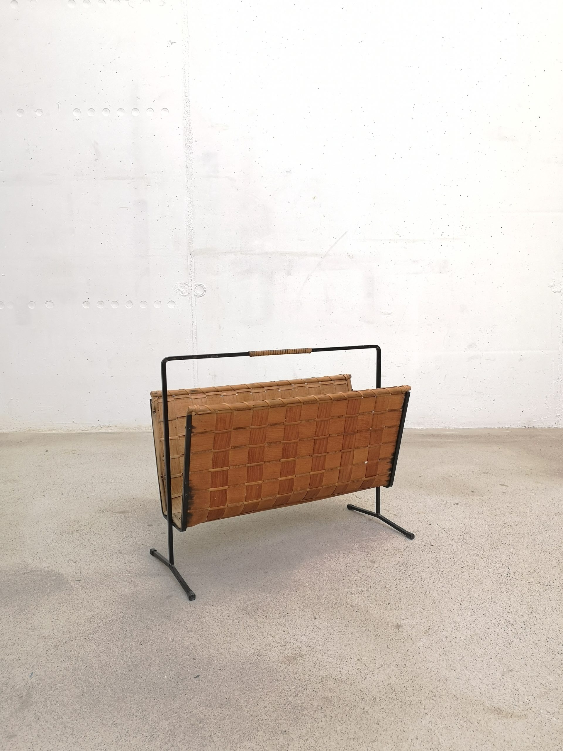 Produit venduPorte-revues en rotin tressé sur structure métallique noir. Le porte-revues présente des traces d’usure et d’utilisation standard au niveau notamment du panier (ex. noirceur sur un des côtés, trous dans l’osier à l’intérieur, etc.). Il reste stable et fonctionnel.