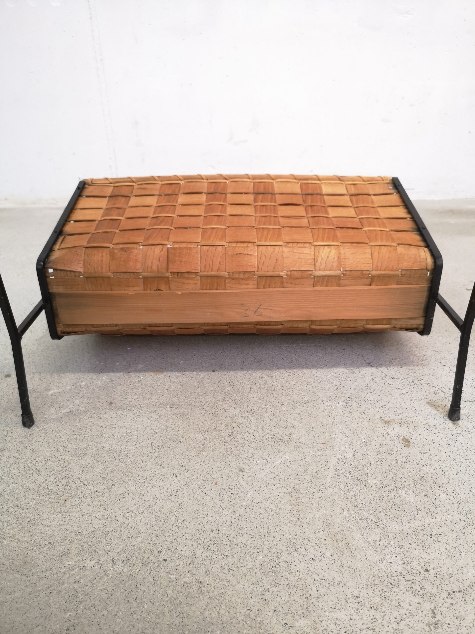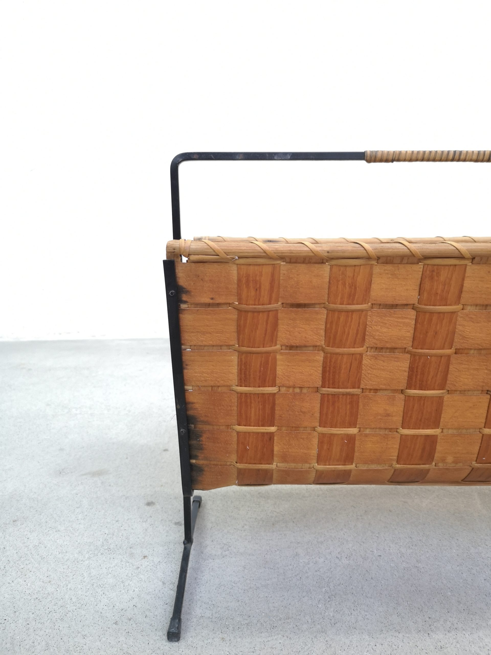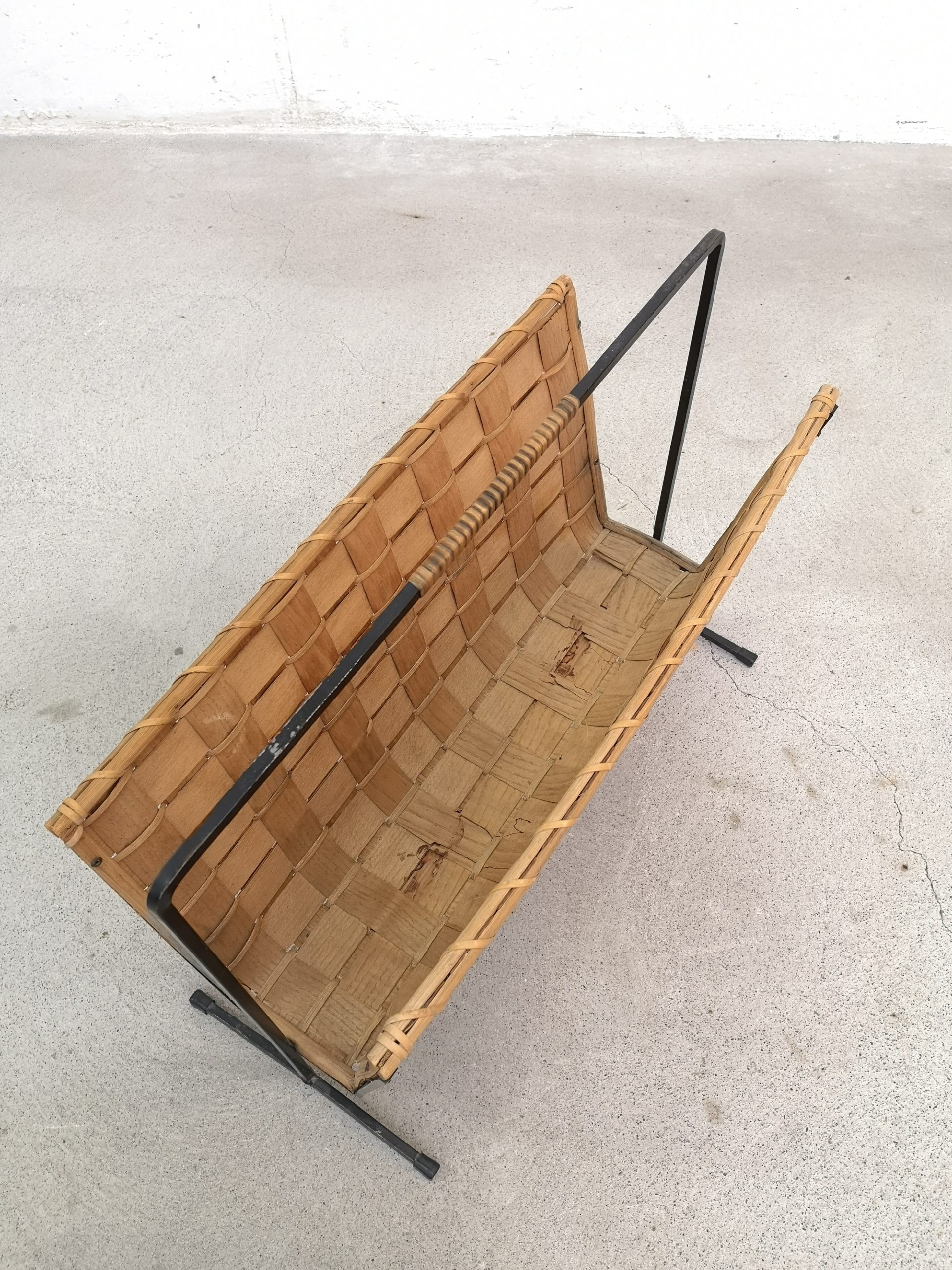 Produit venduPorte-revues en rotin tressé sur structure métallique noir. Le porte-revues présente des traces d’usure et d’utilisation standard au niveau notamment du panier (ex. noirceur sur un des côtés, trous dans l’osier à l’intérieur, etc.). Il reste stable et fonctionnel.
