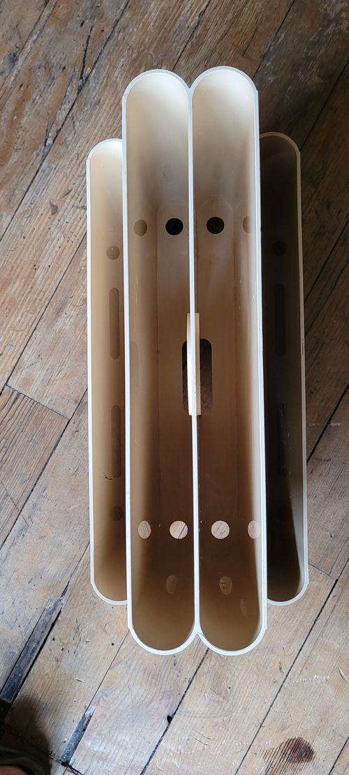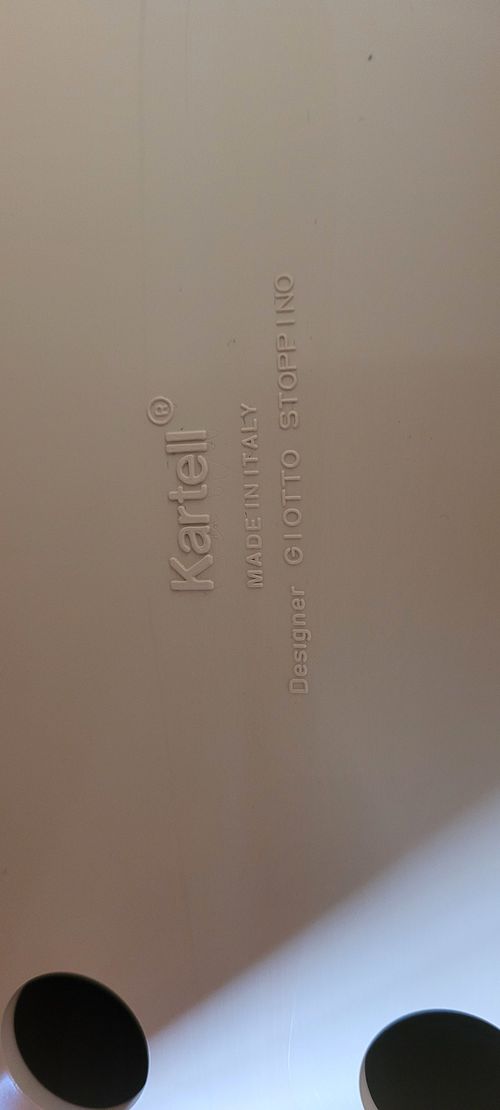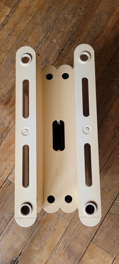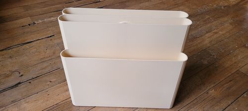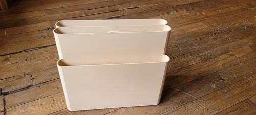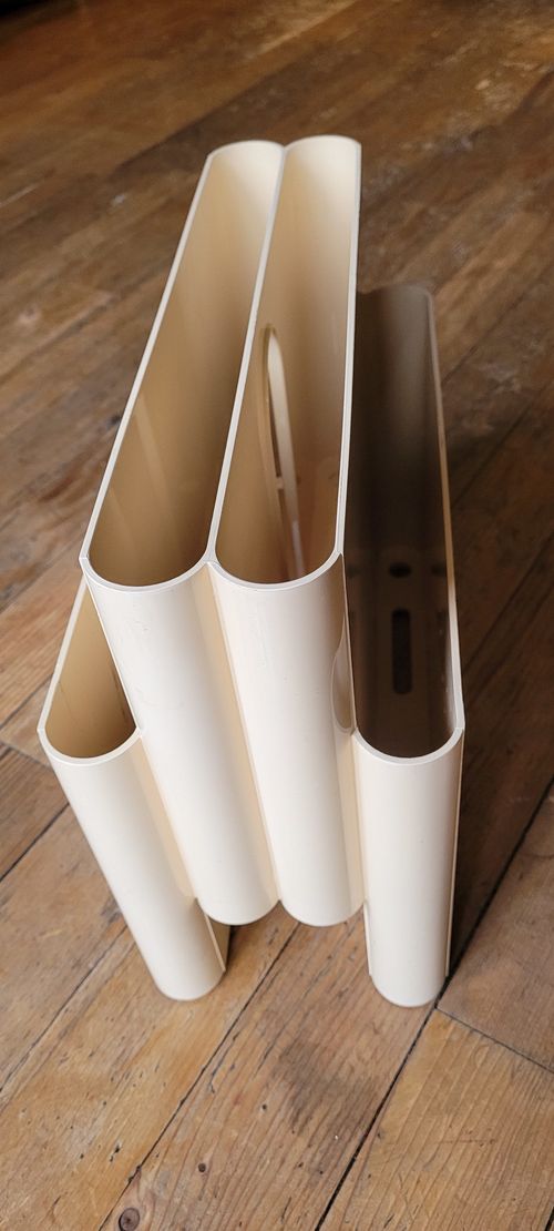 Produit venduPorte-revues Kartell par Giotto Stoppino, Italy, années 70, 4 compartiments, blanc, jauni par les années, griffures visibles de près