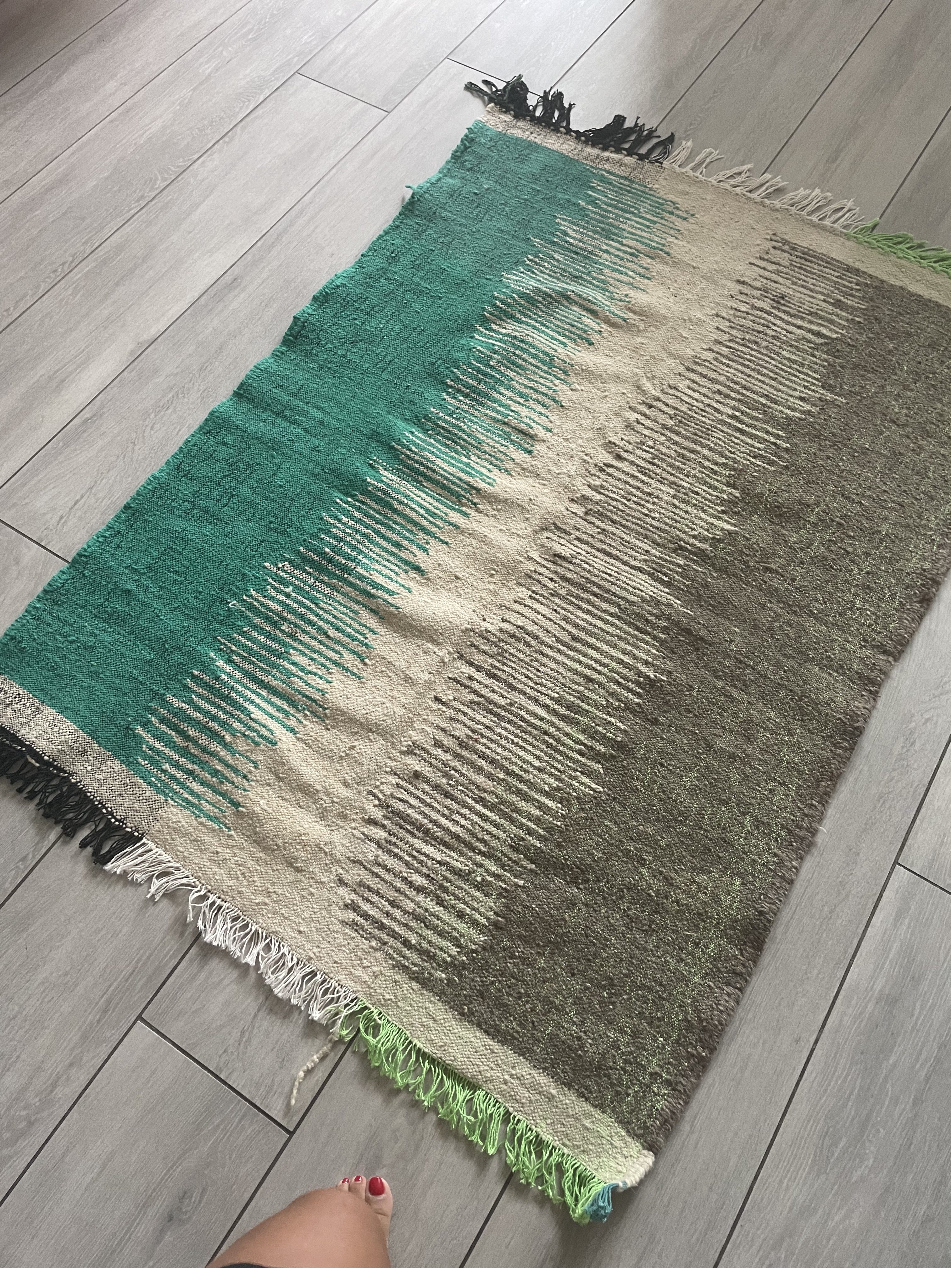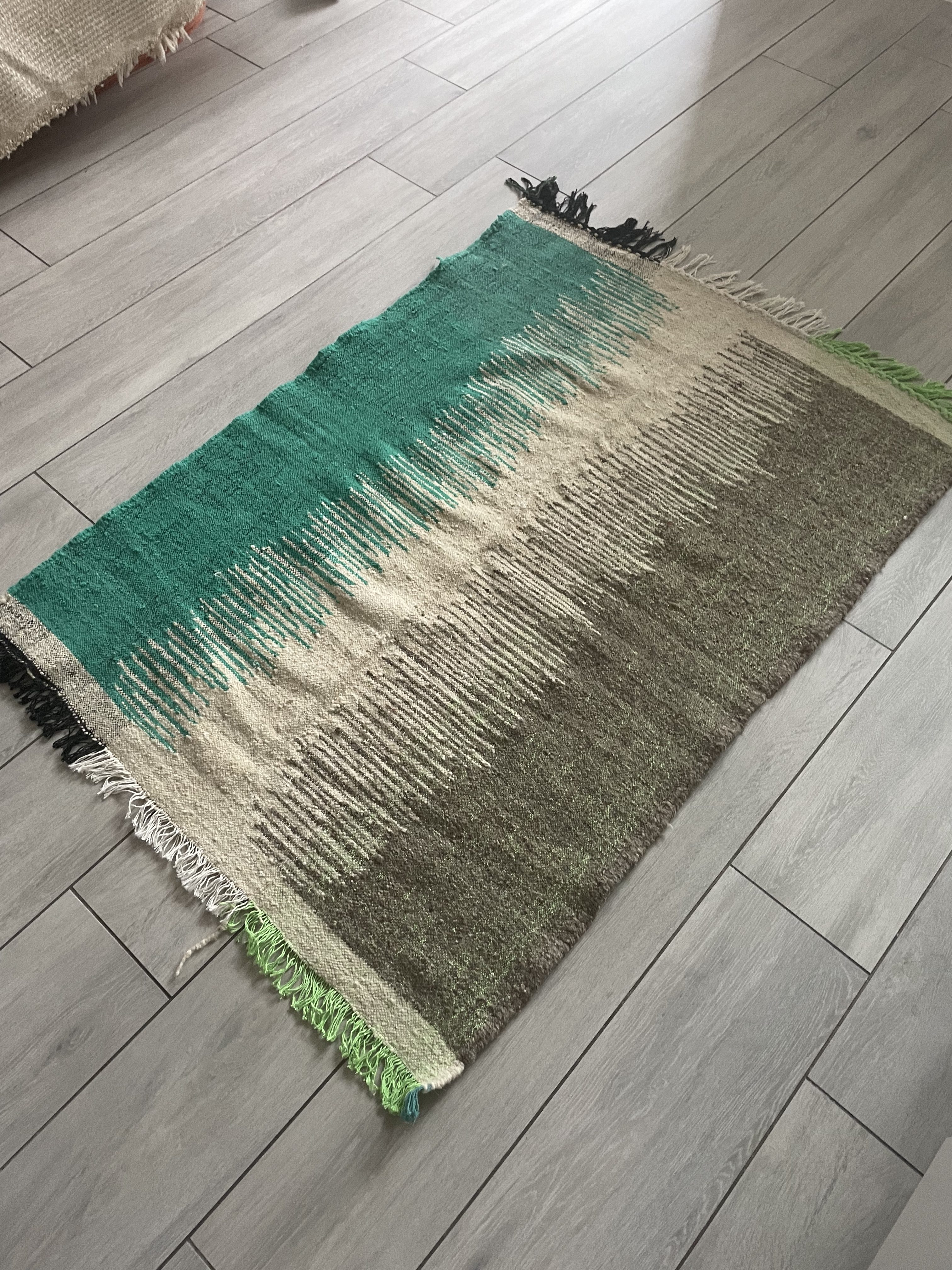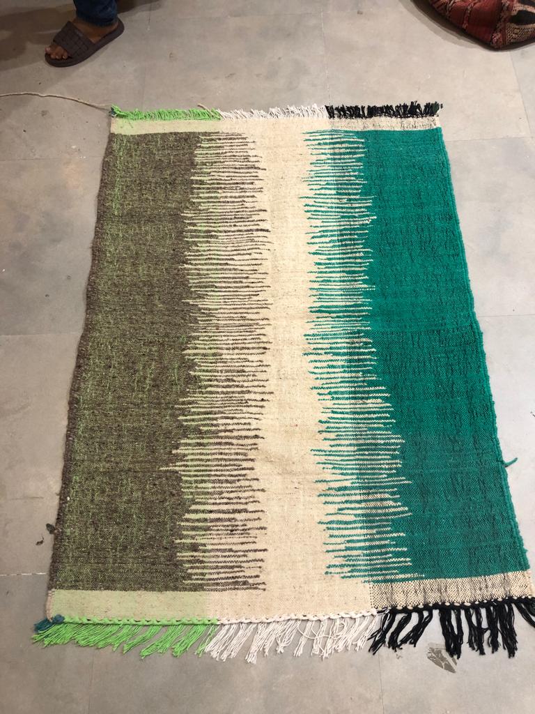 Produit venduQue diriez vous d’avoir cette création de tapis chez vous ? Tissé en laine et à la main dans un village du moyen atlas marocain.