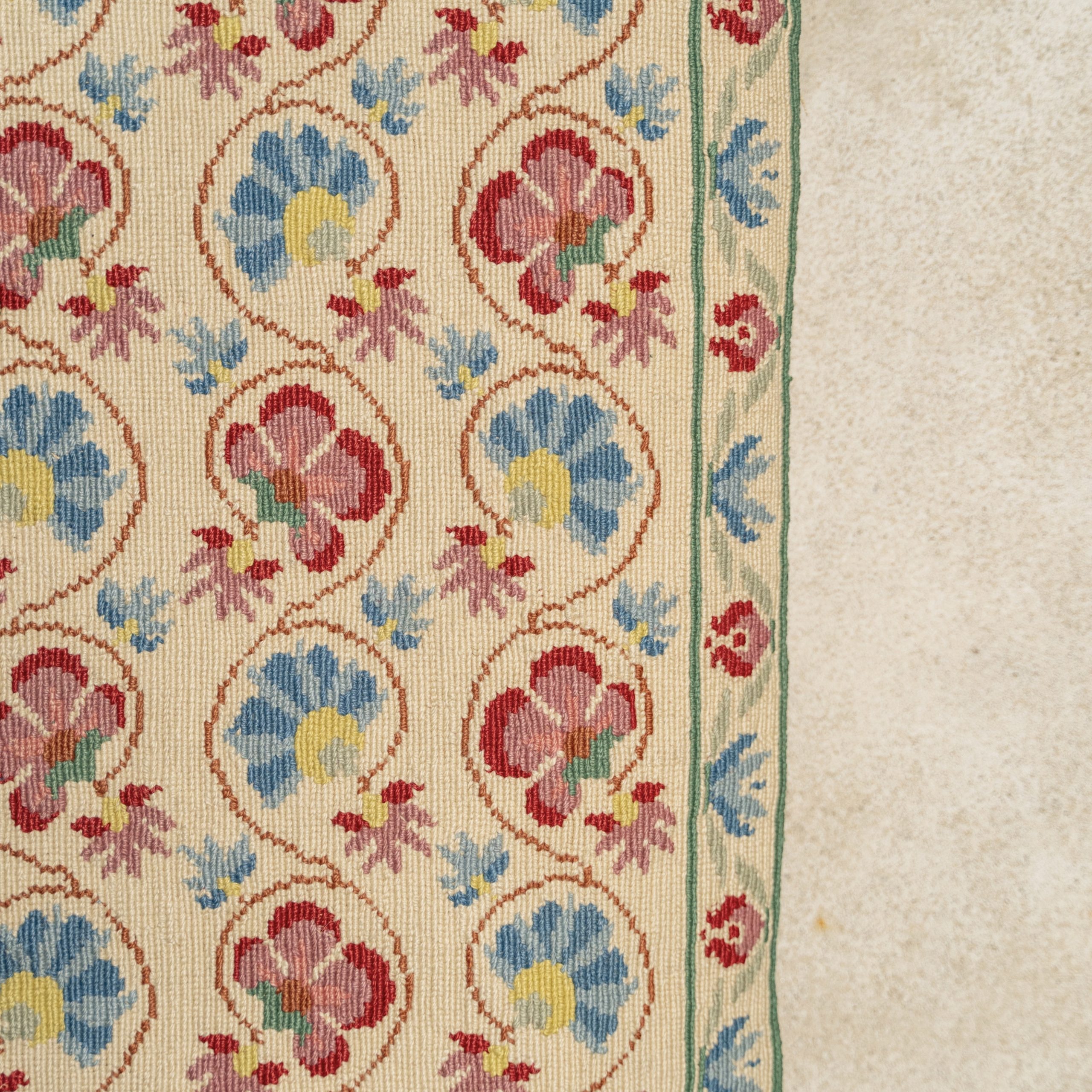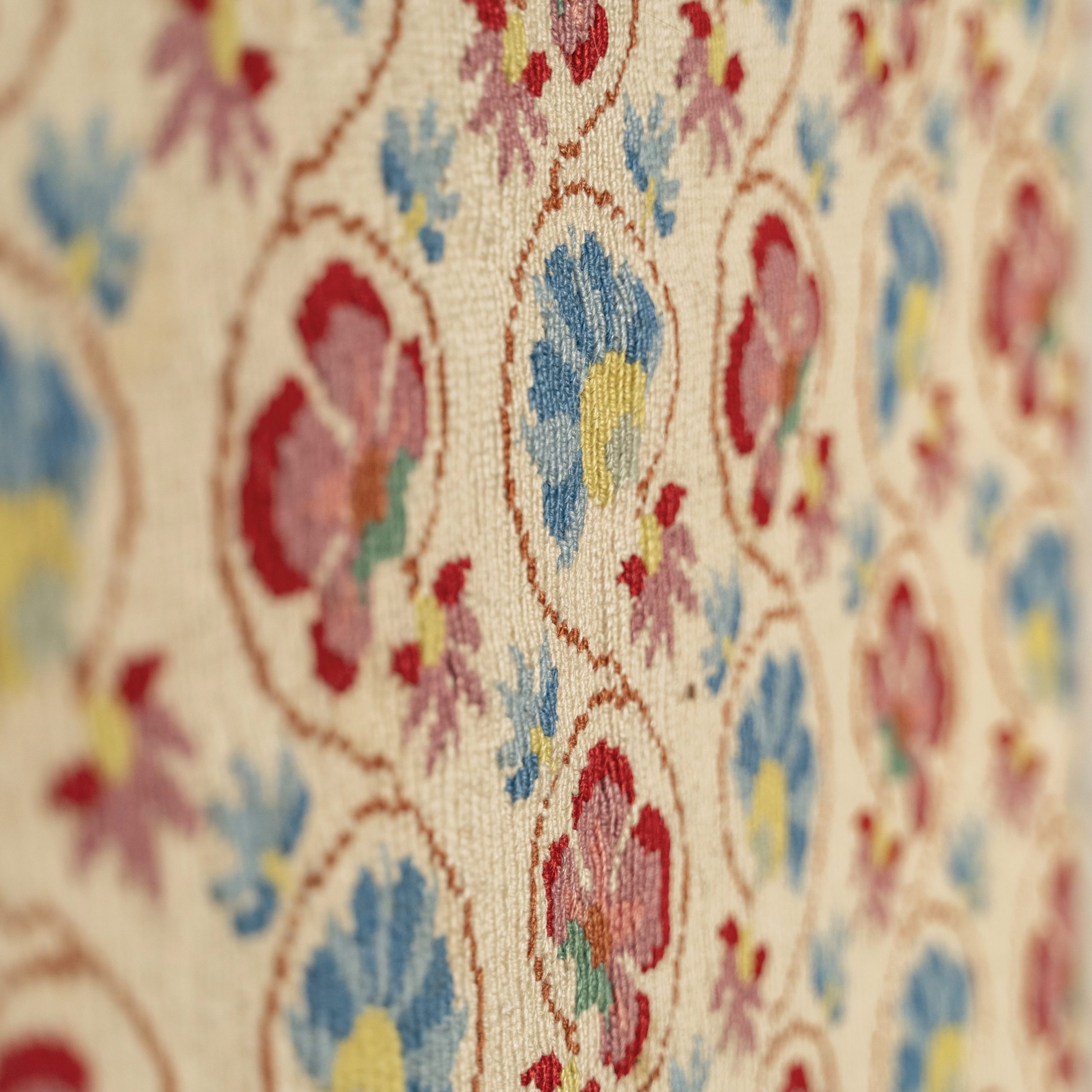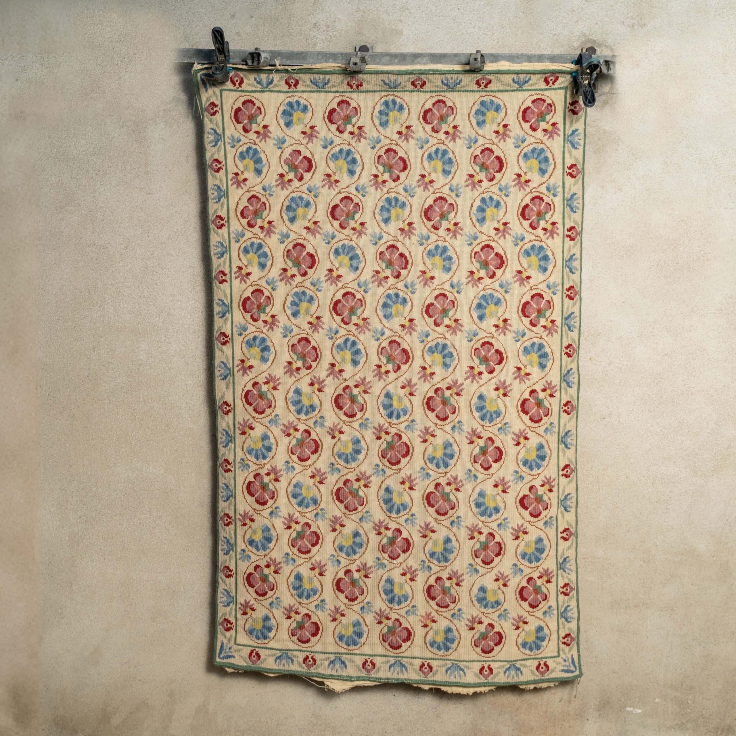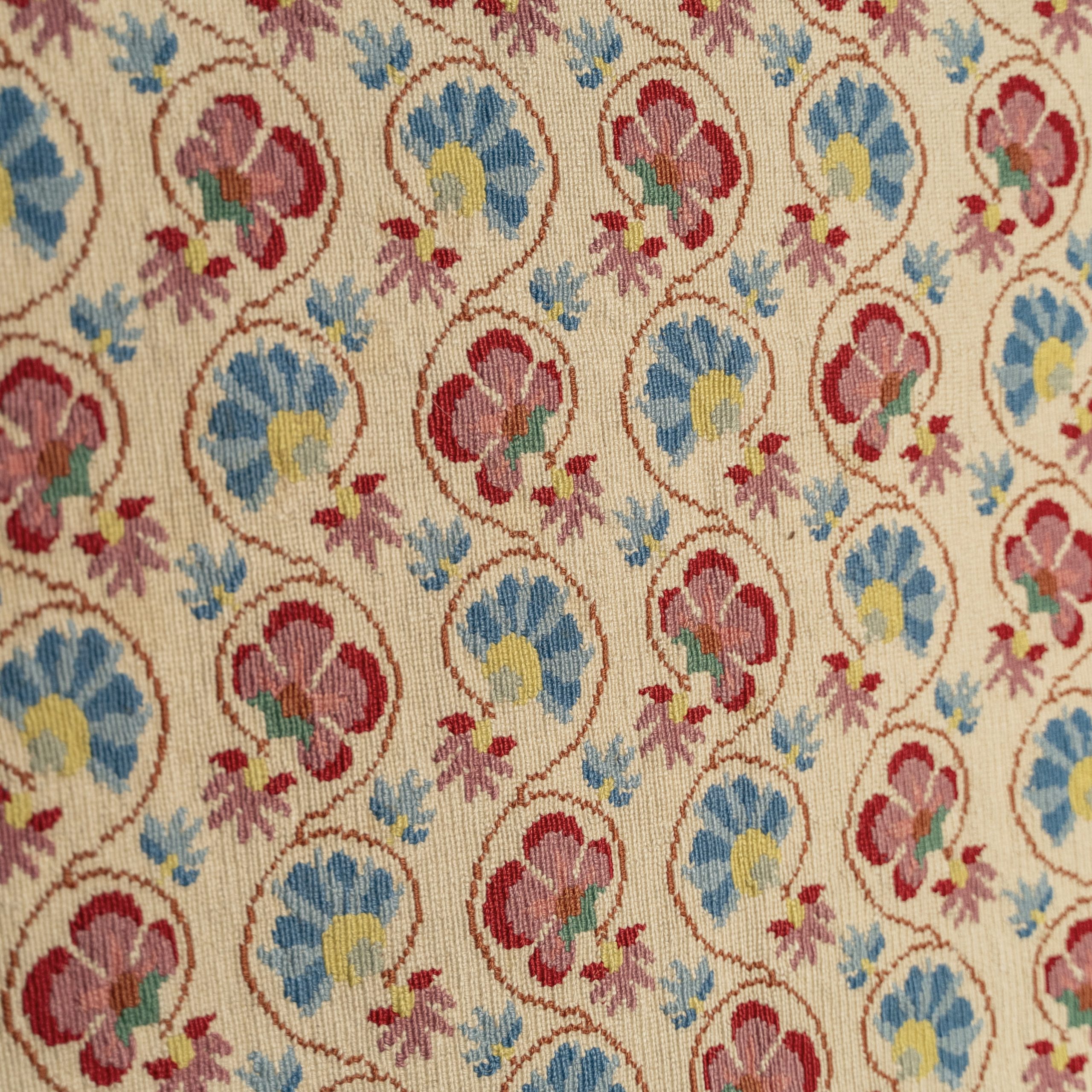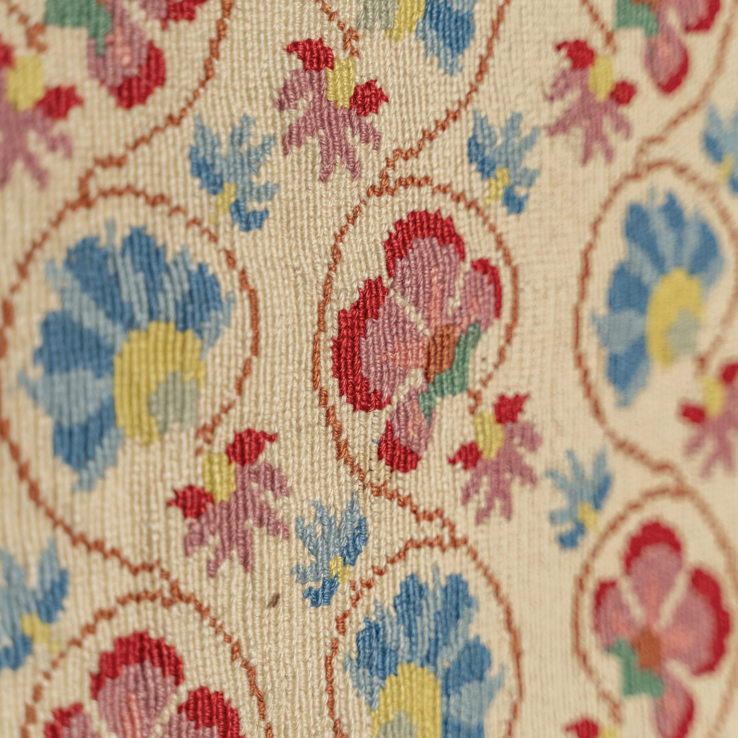 Cette tenture est brodée en semi-point de croix de laine sur toile de lin. Le motif néo-classique aux motifs floraux rappelle les mosaïques des maisons méditerranéennes.