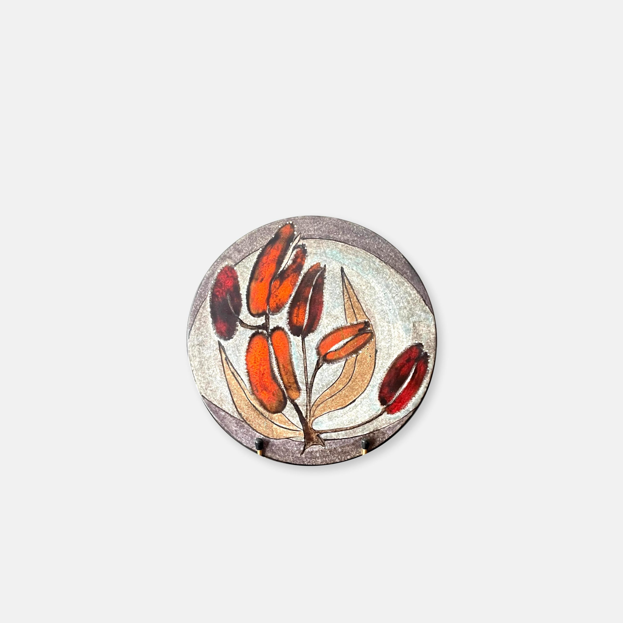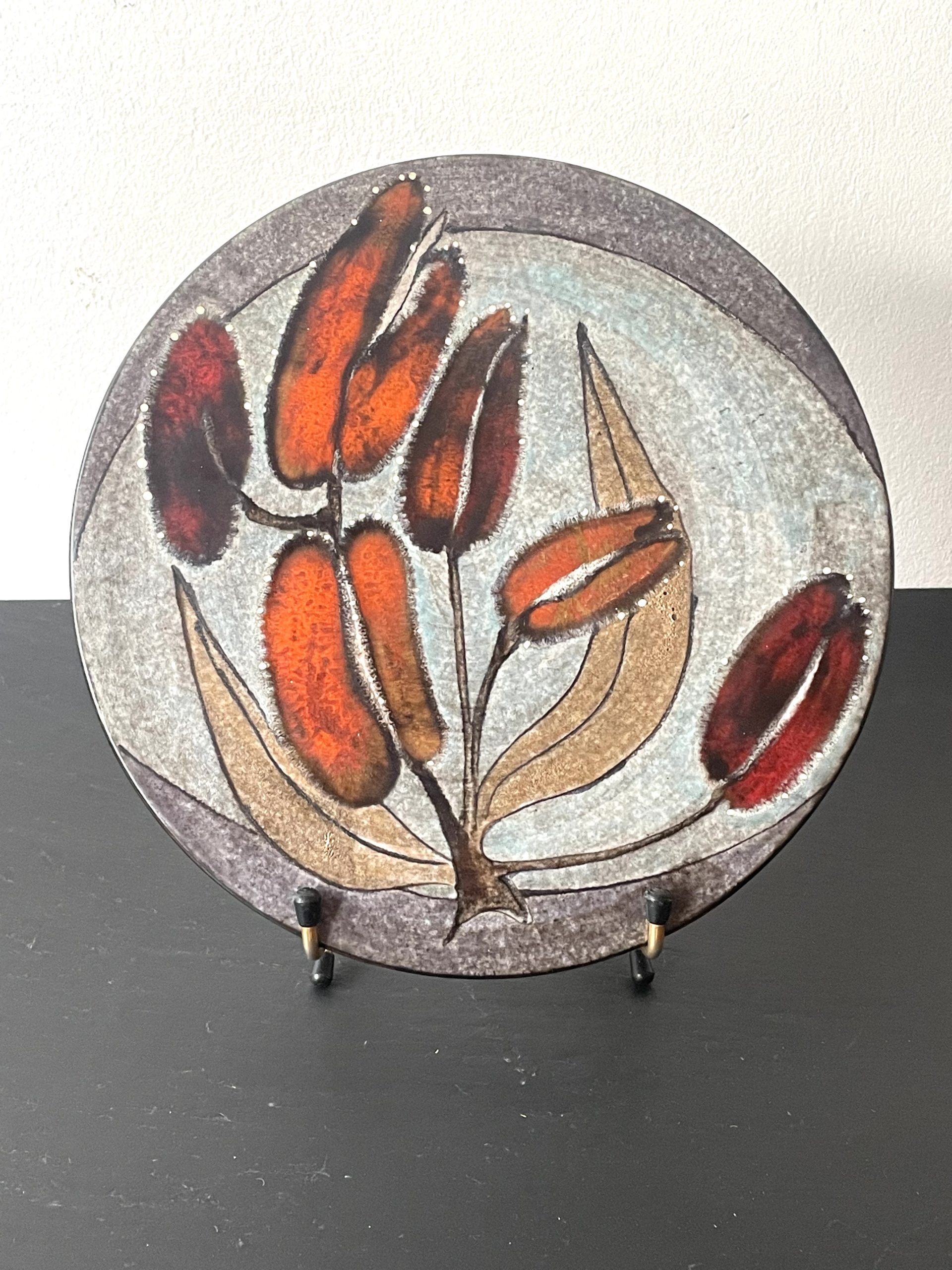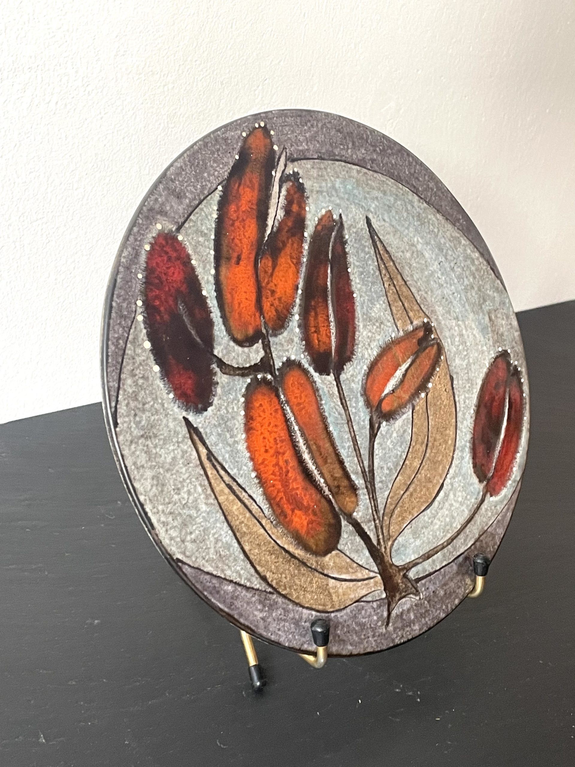 En céramique de couleur grise au décor de fleurs dans les tons orange vifs. Très bel état !