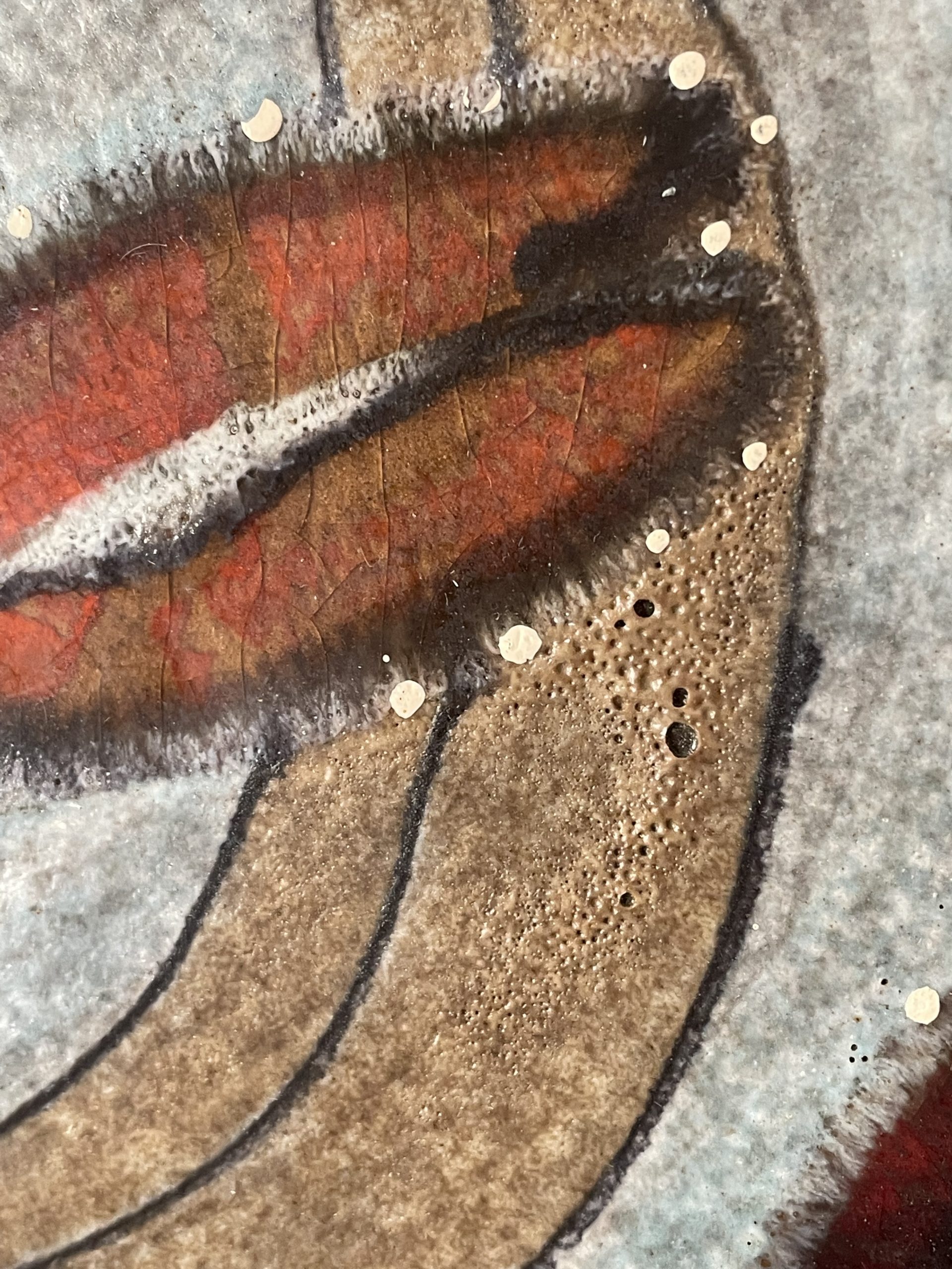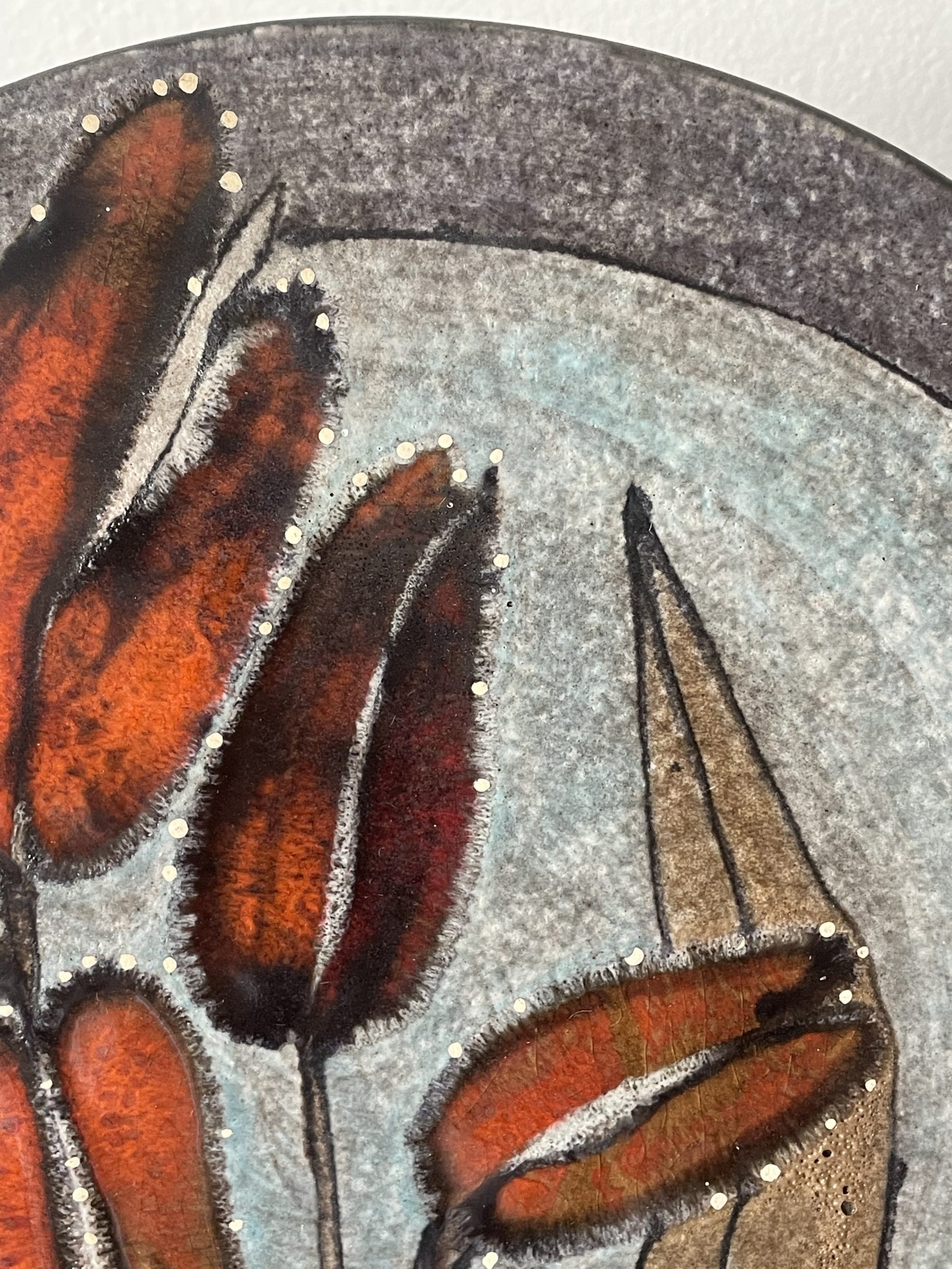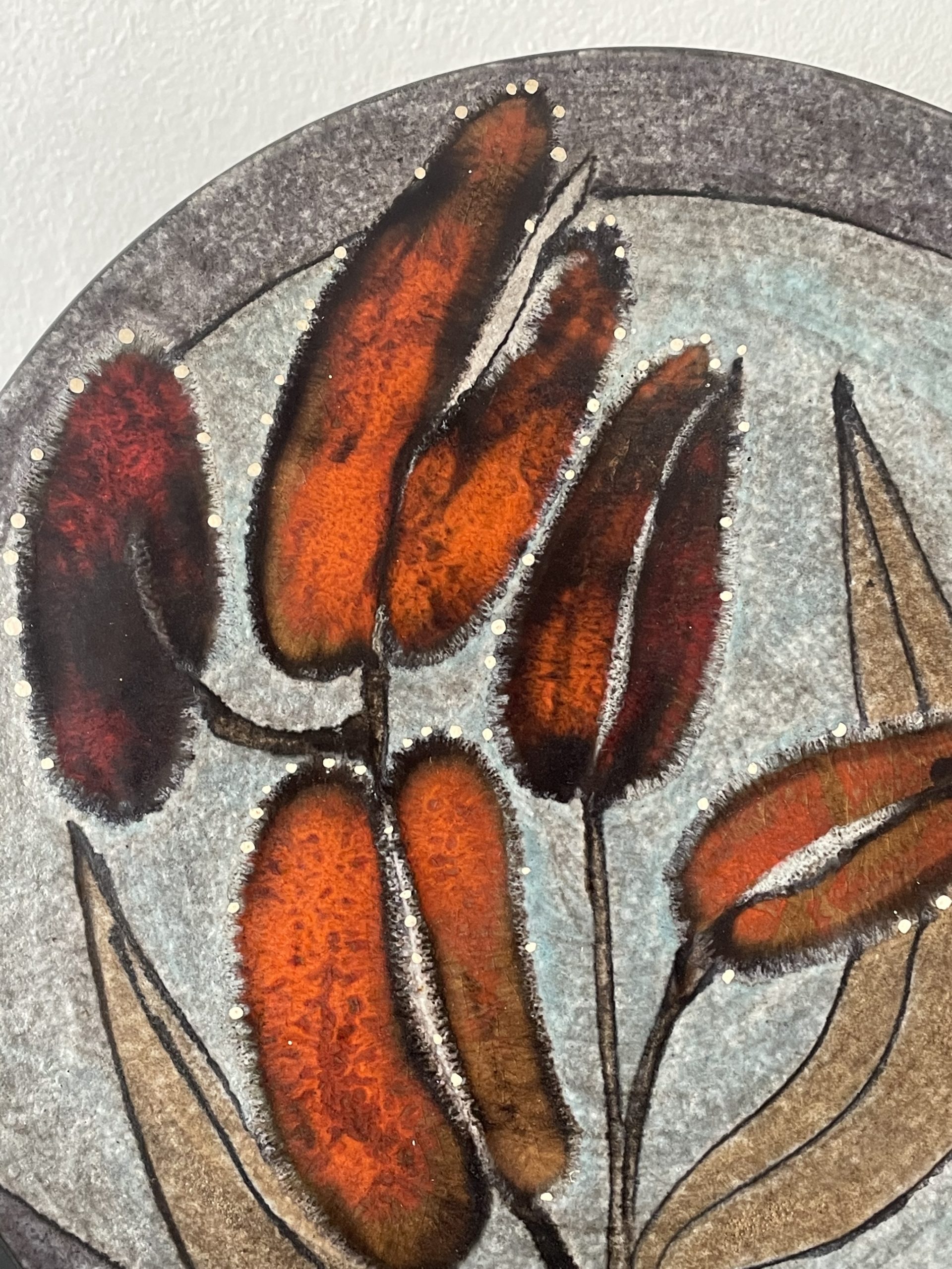En céramique de couleur grise au décor de fleurs dans les tons orange vifs. Très bel état !