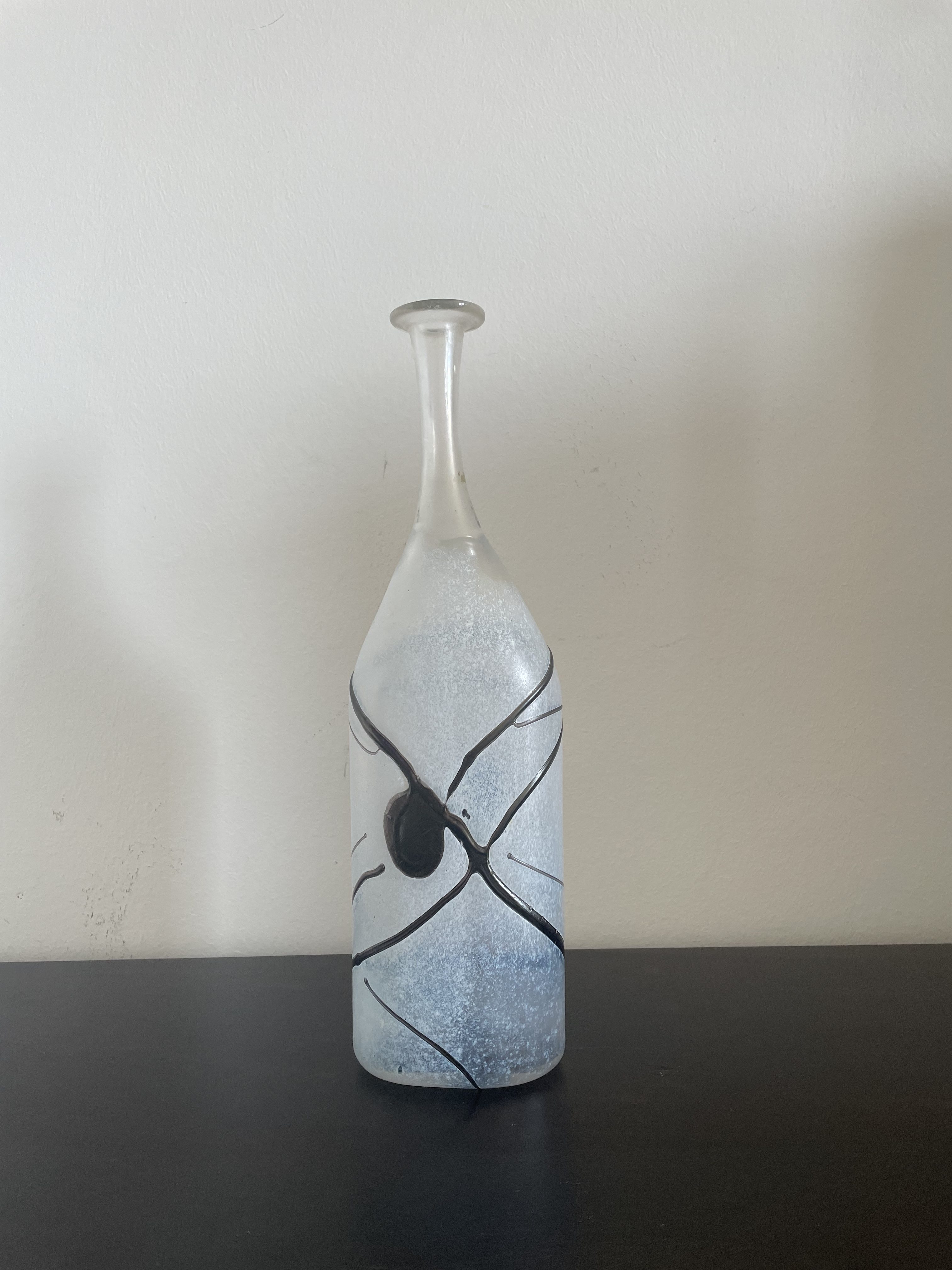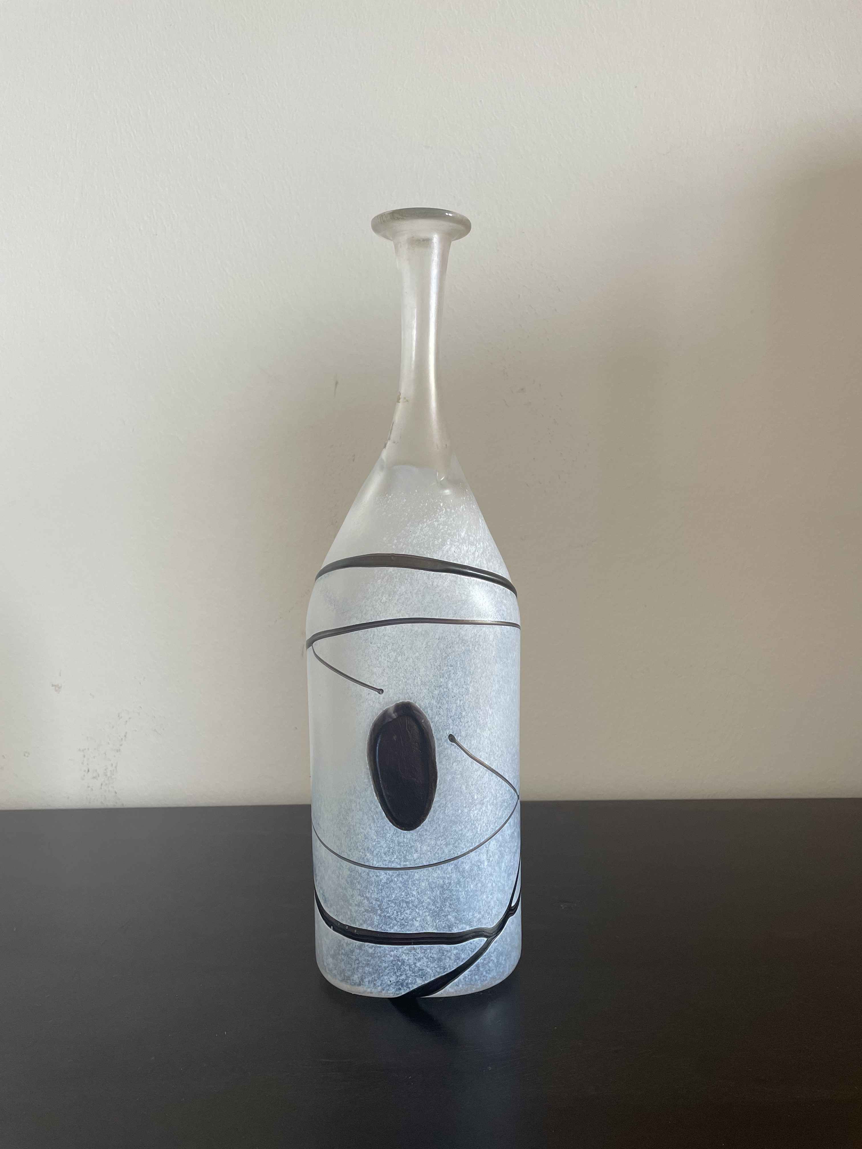 Produit venduGrand vase soliflore en verre soufflé à la main de la manufacture suédoise Kosta Boda, décor abstrait en noir et blanc par le designer Bertil Vallien.