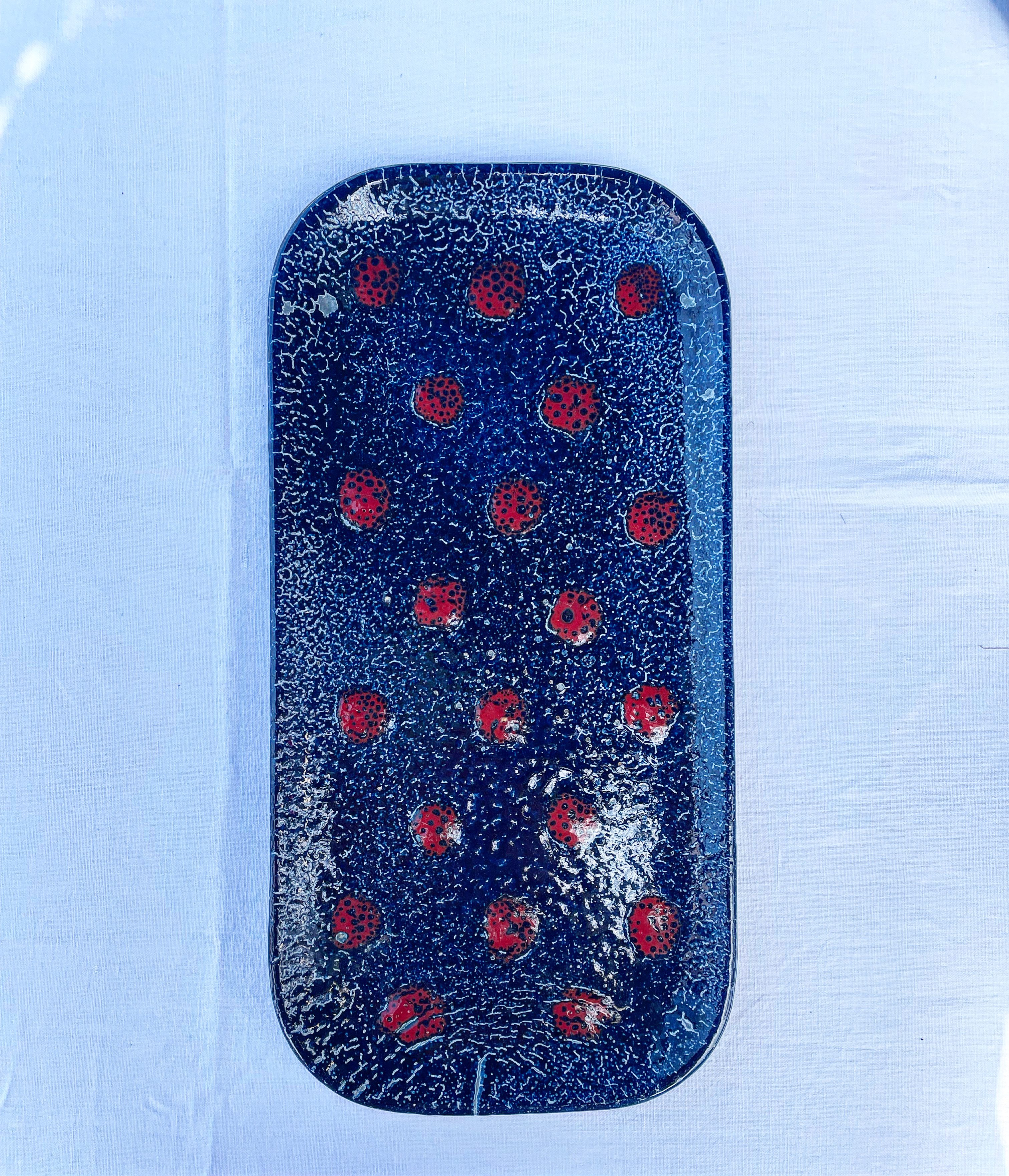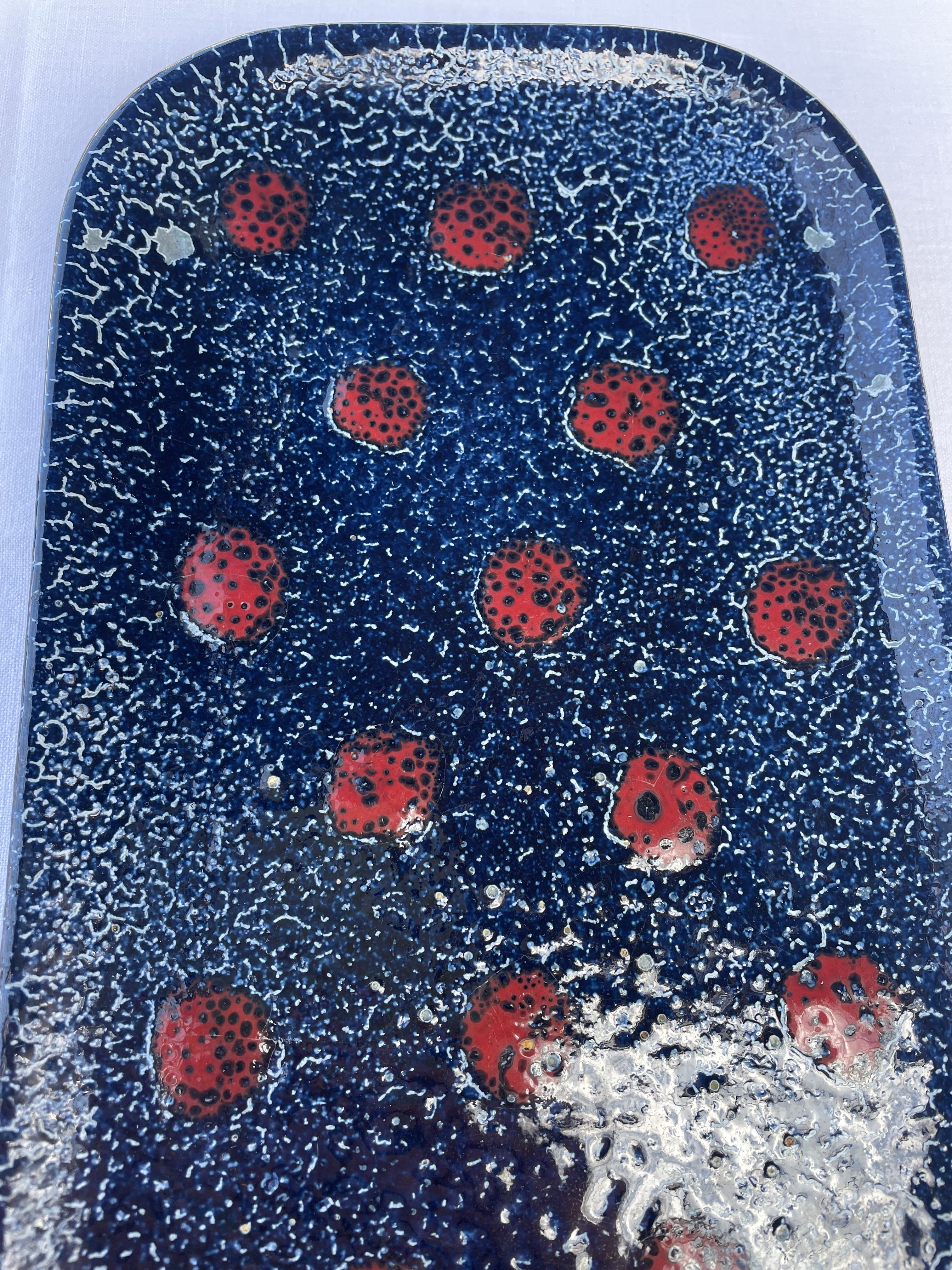Produit venduPlat en céramique de forme rectangulaire dans un esprit fat lava de couleur bleue avec décor en points de couleur rouge vif.