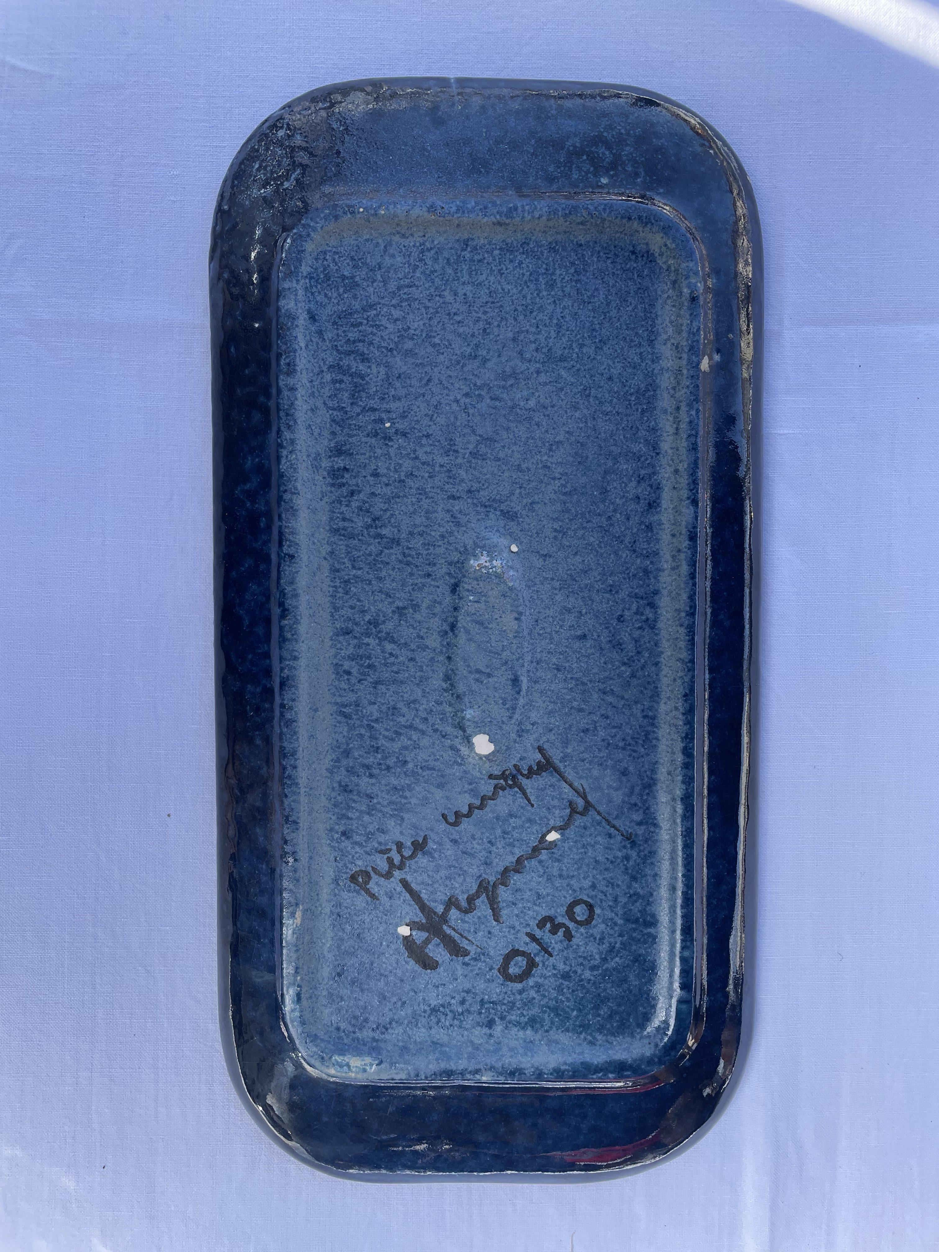 Le plat présenté quelques défauts de cuisson (bulles sur la céramique) et petits éclats au dessous.