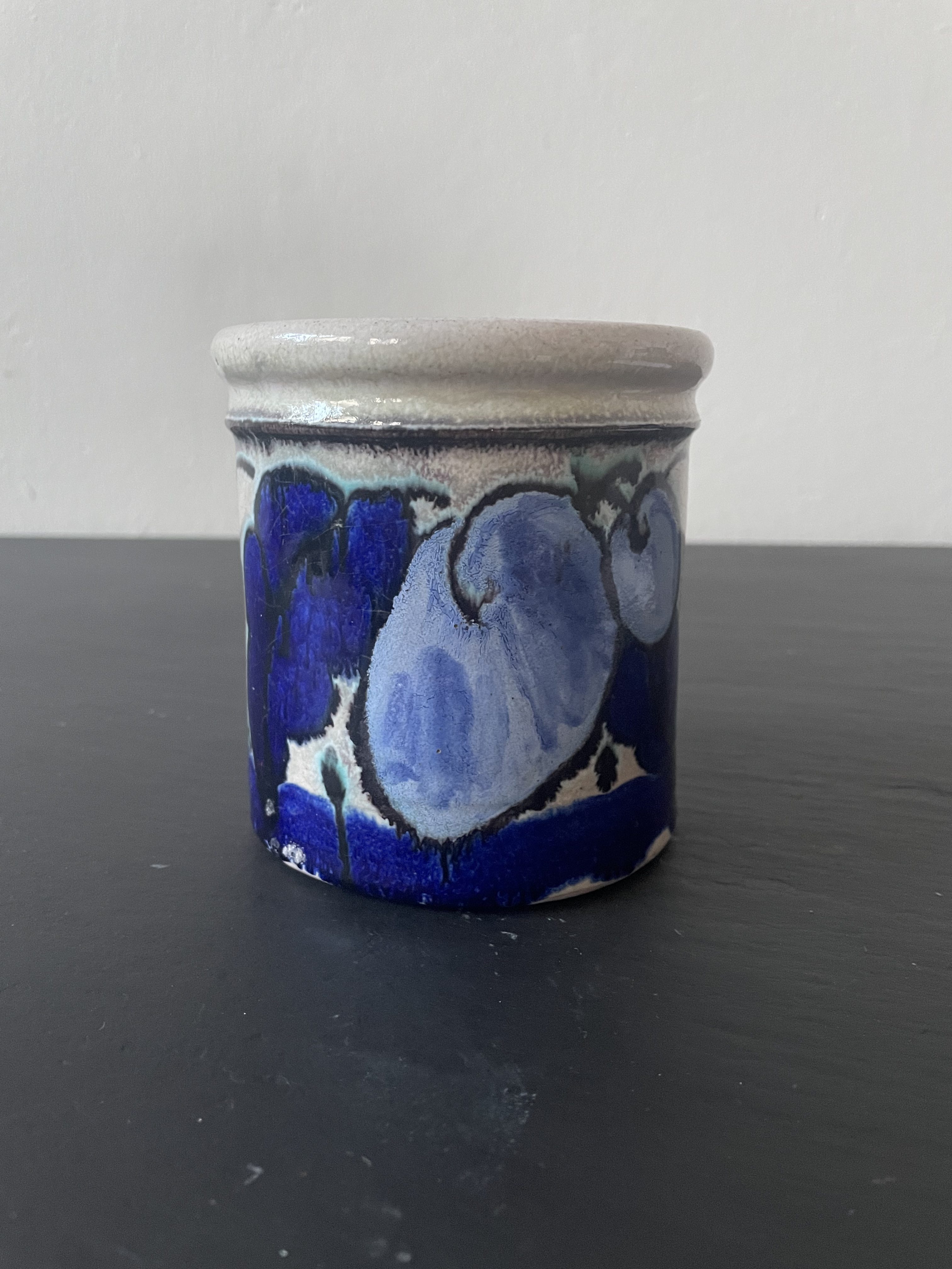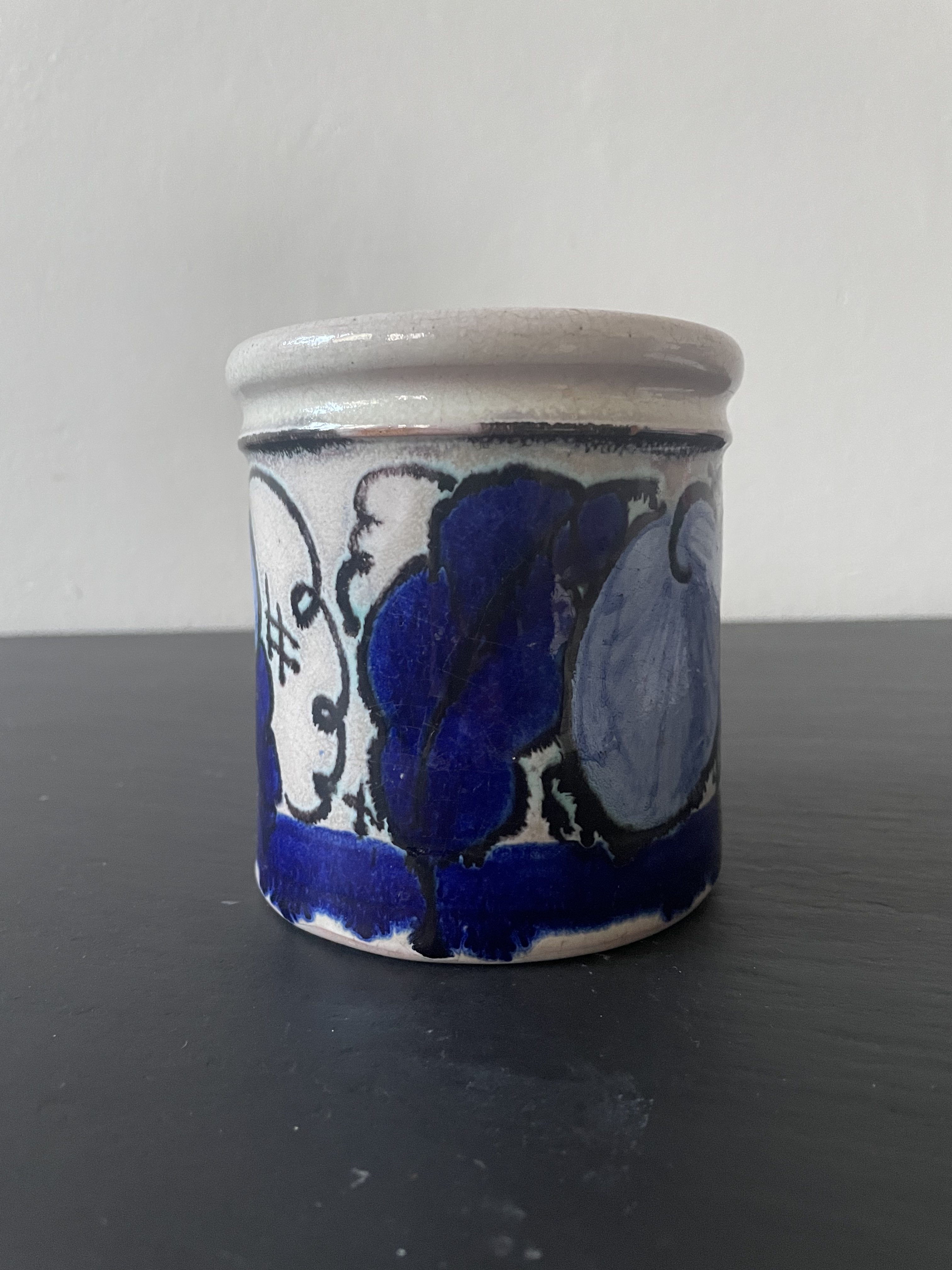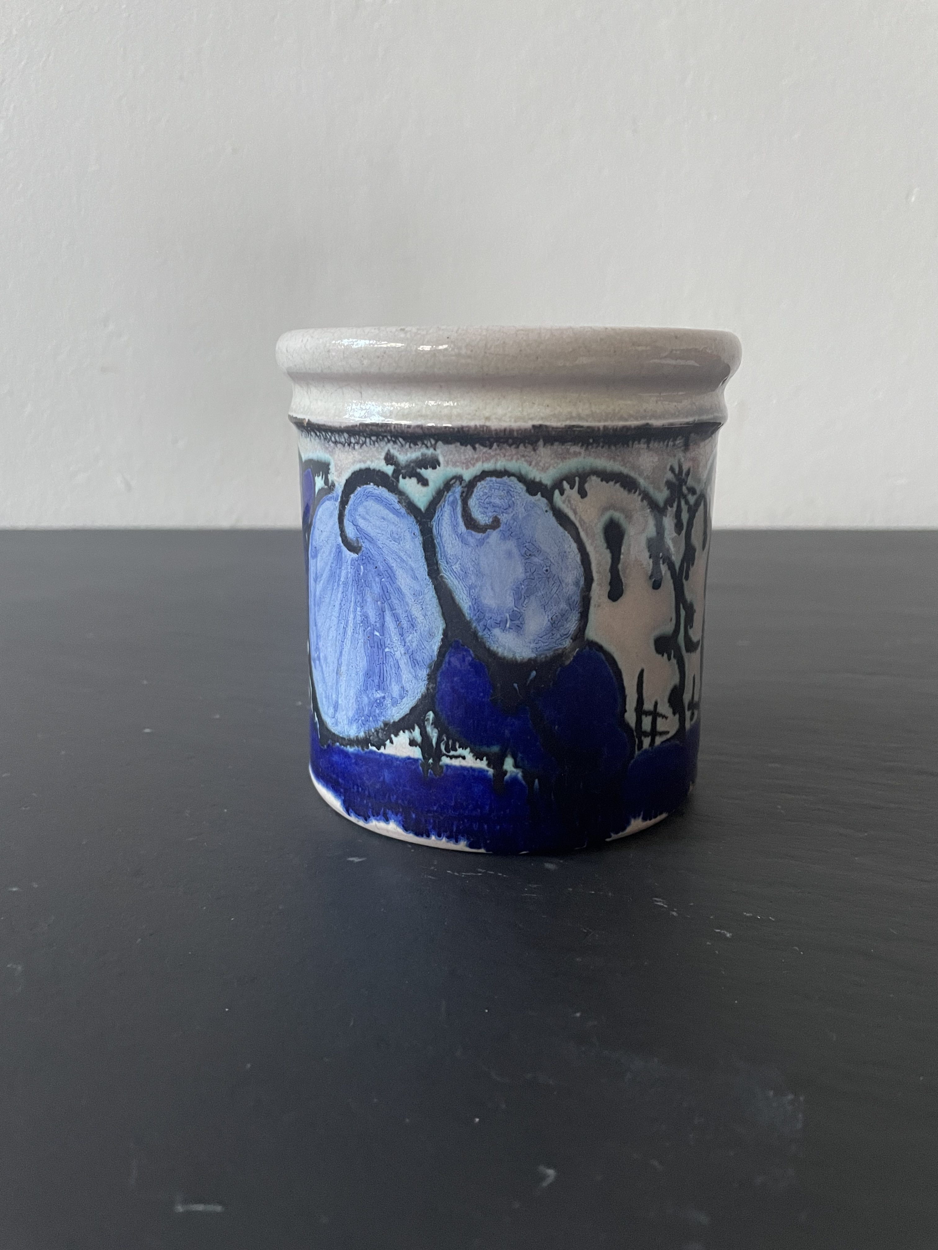Produit venduPot en céramique au décor abstrait dans des tons noirs et bleus profonds.