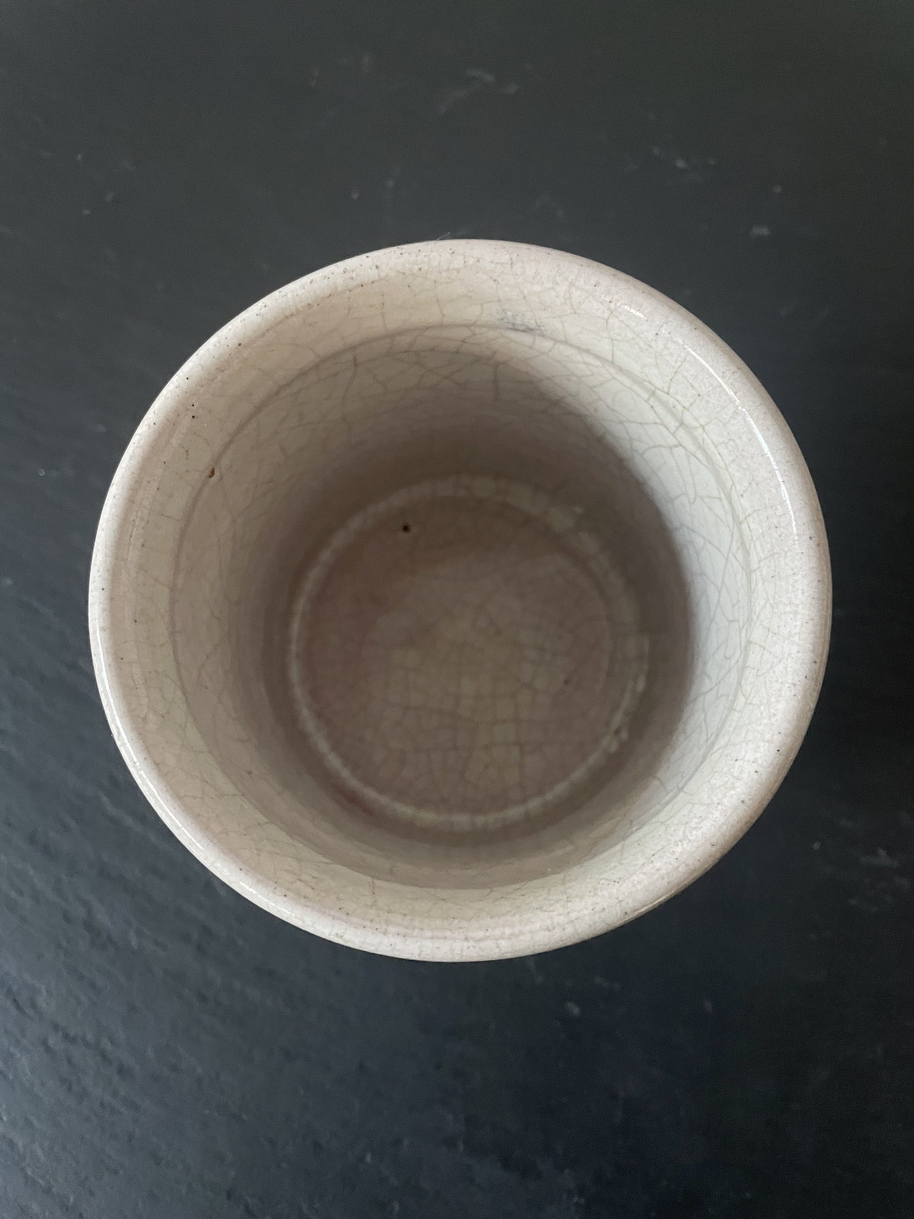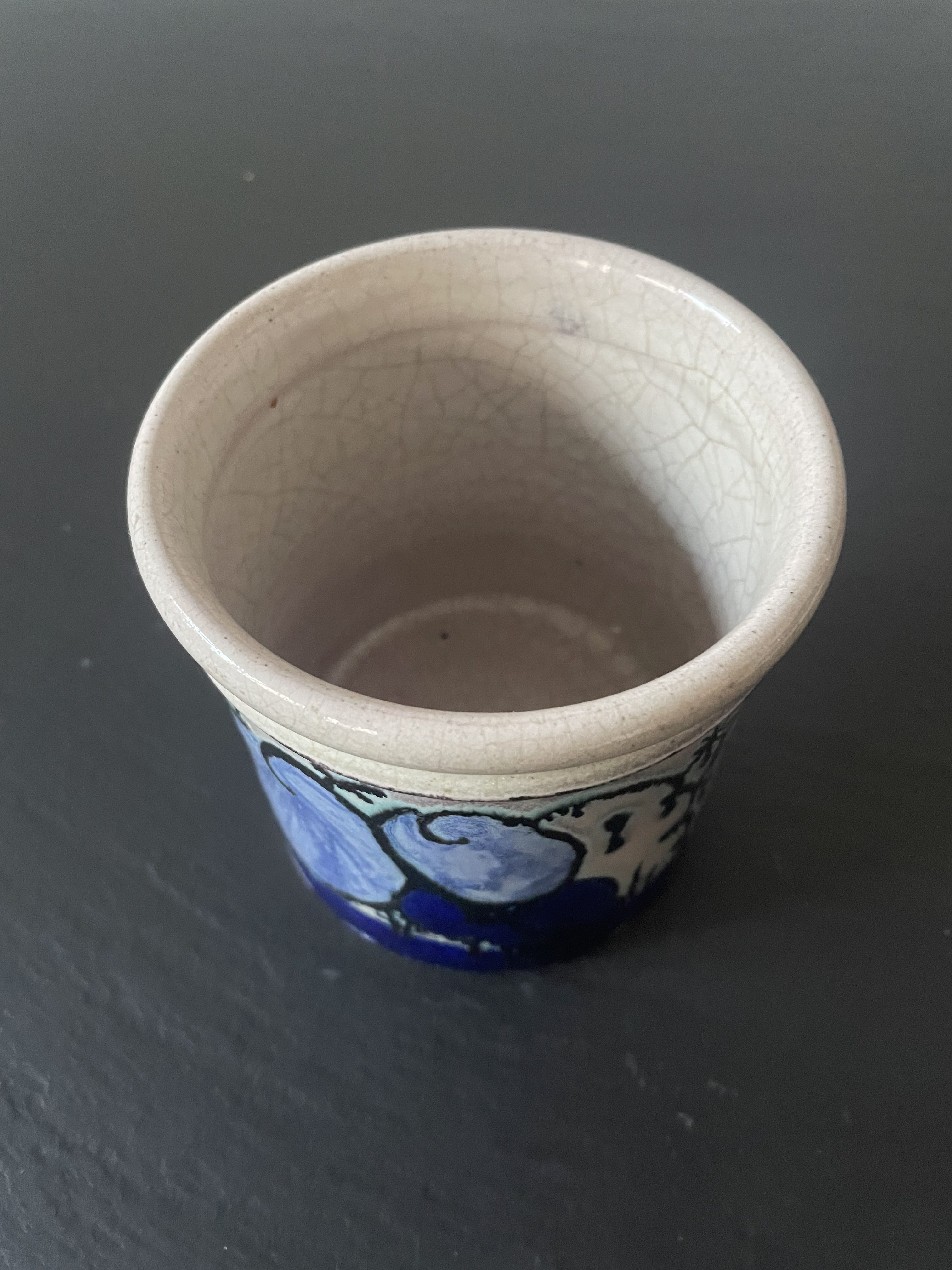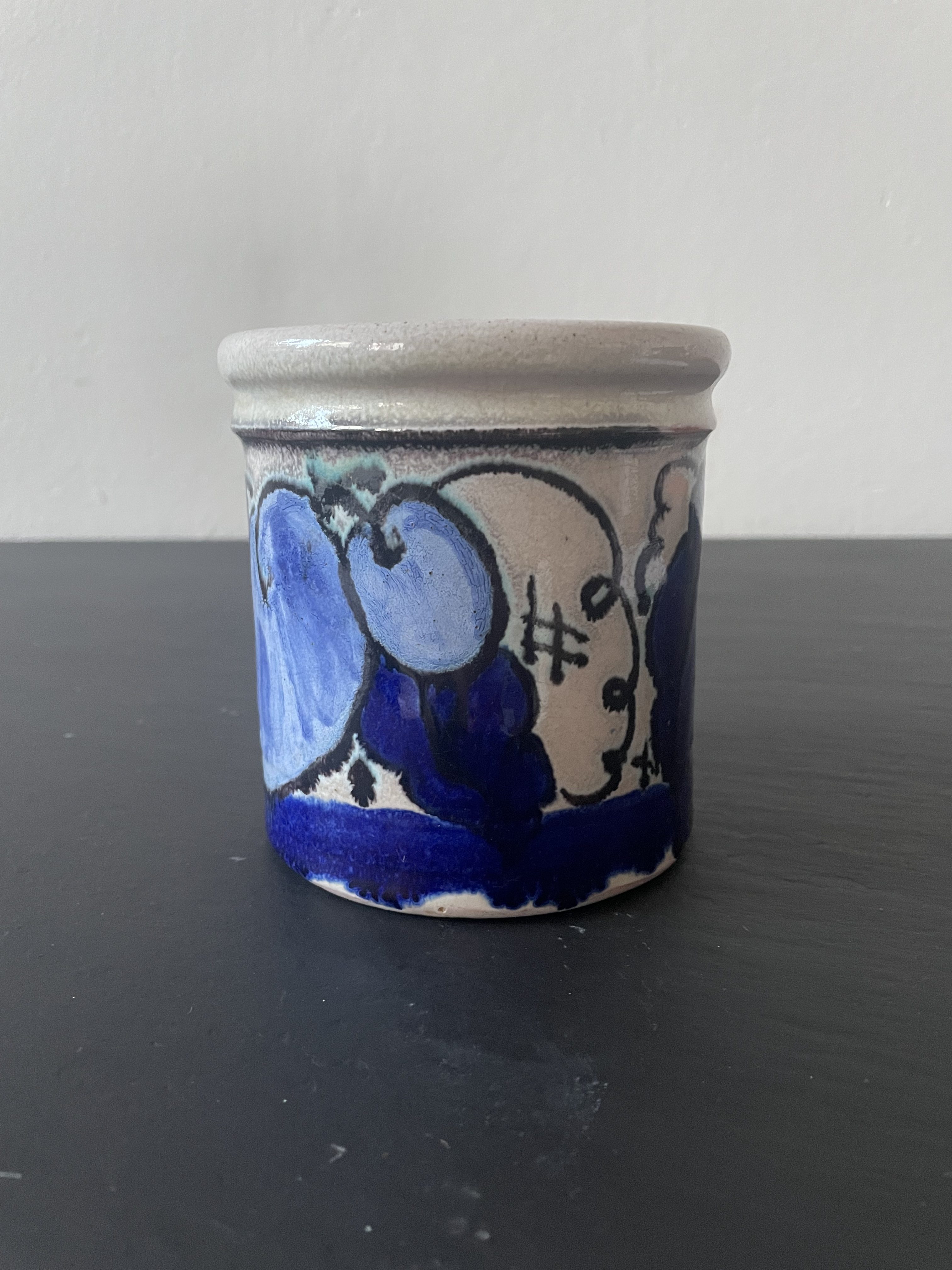 Produit venduPot en céramique au décor abstrait dans des tons noirs et bleus profonds.