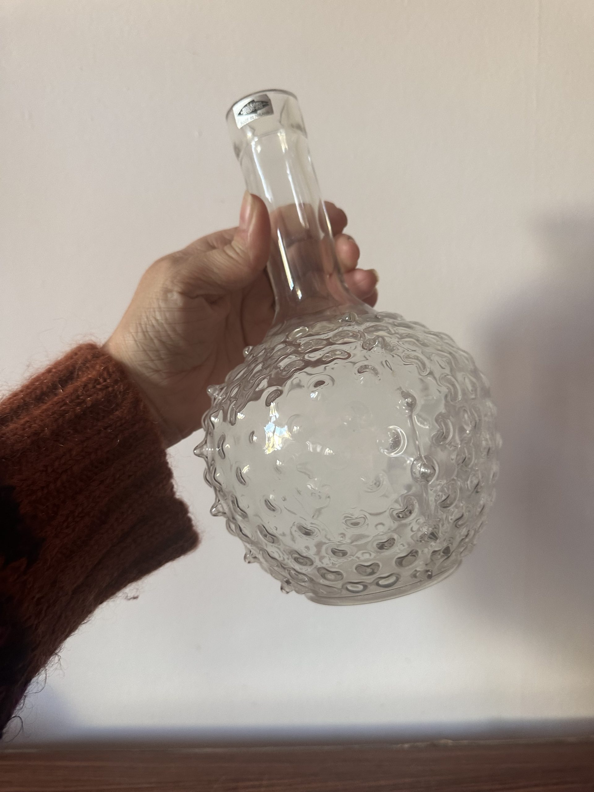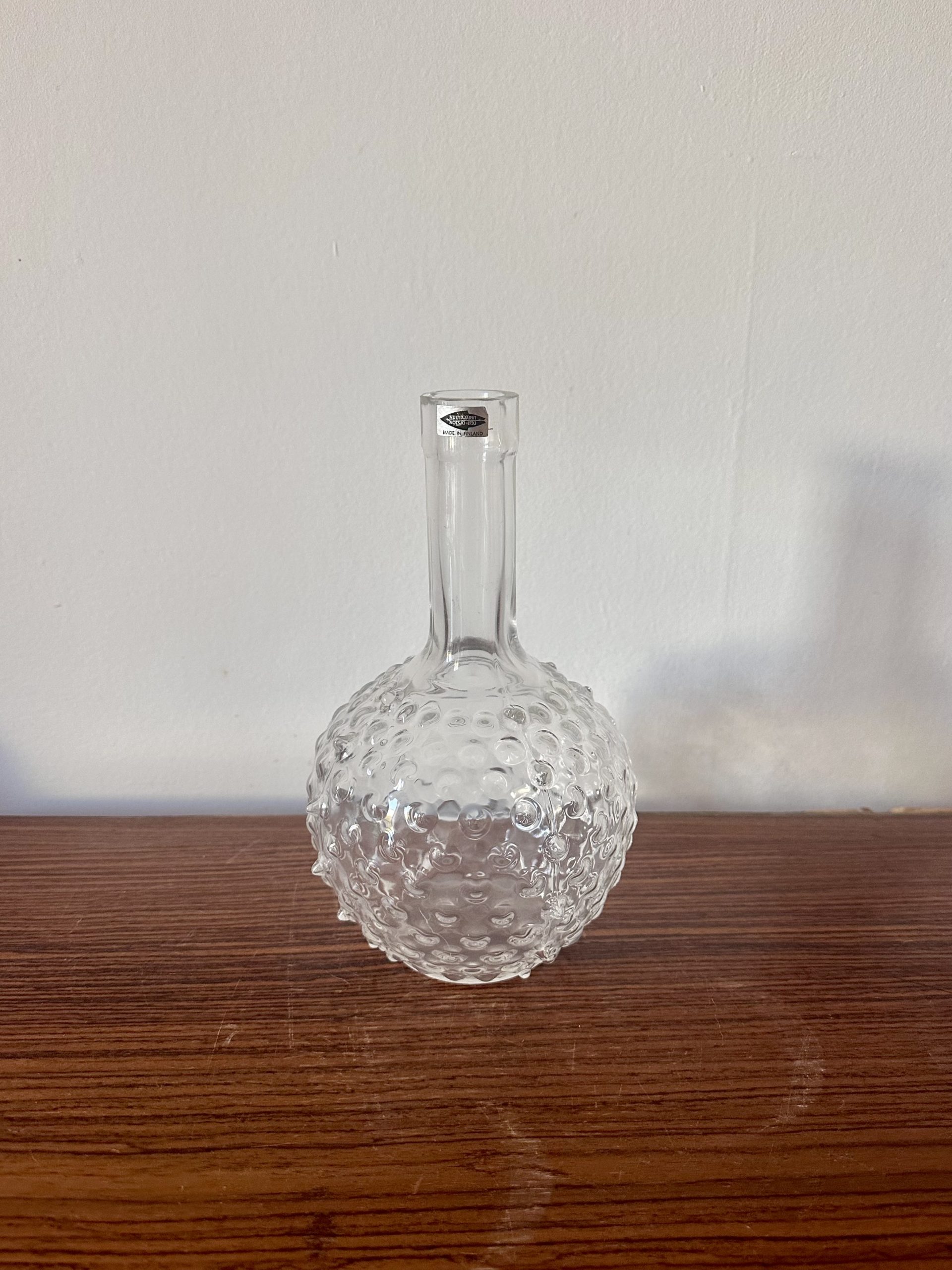 Il s’agit d’un vase ou d’une bouteille décorative vintage en verre clair de la marque finlandaise Nuutajärvi Lasi et imaginée par la designeuse Saara Hopea. Elle est bonne état avec l’autocollant de production encore visible.