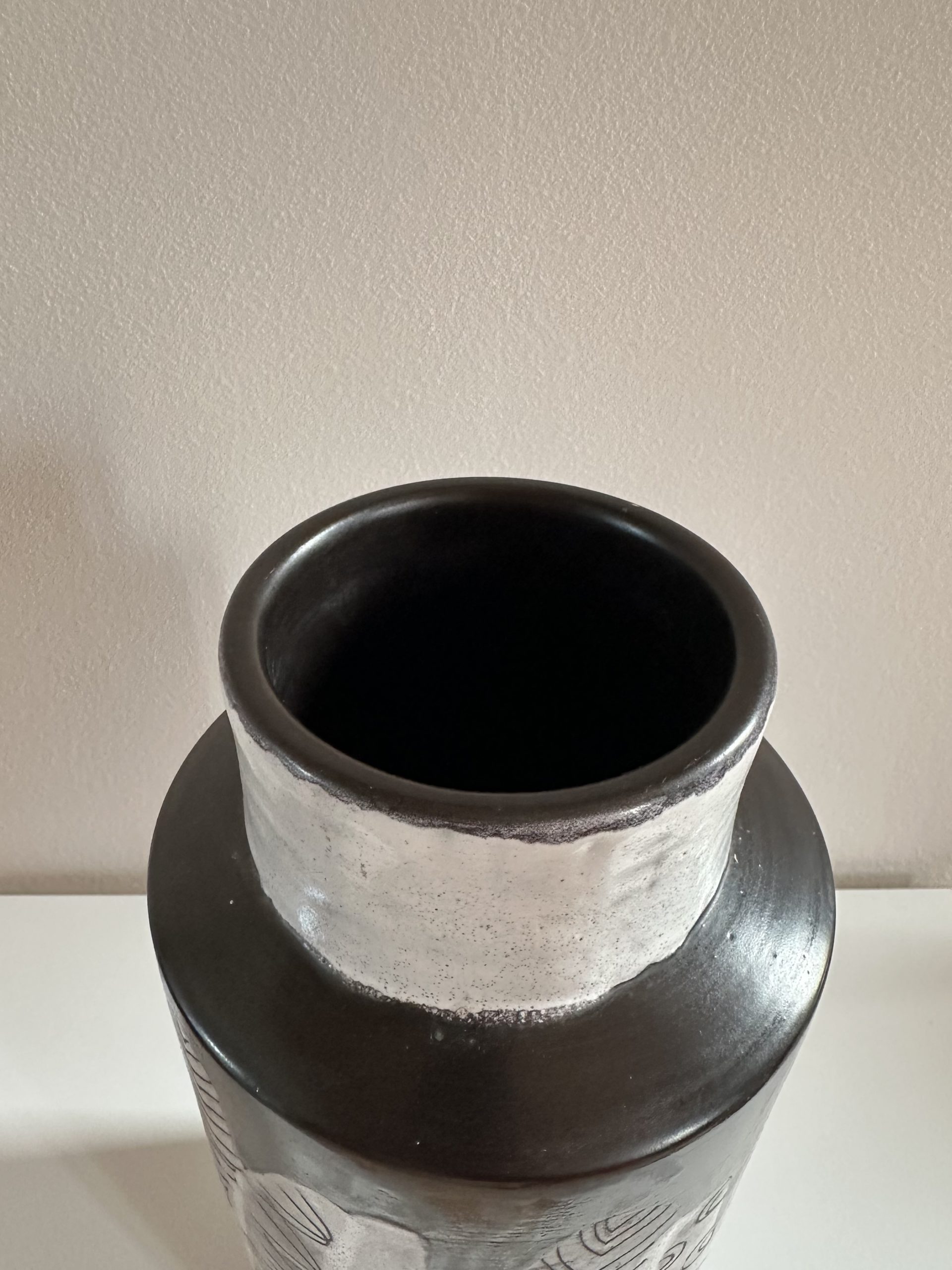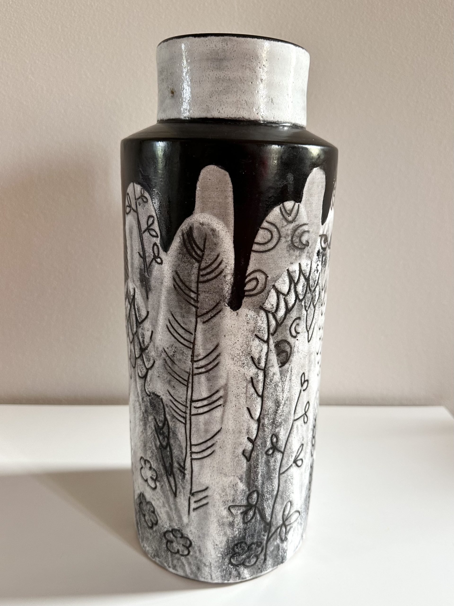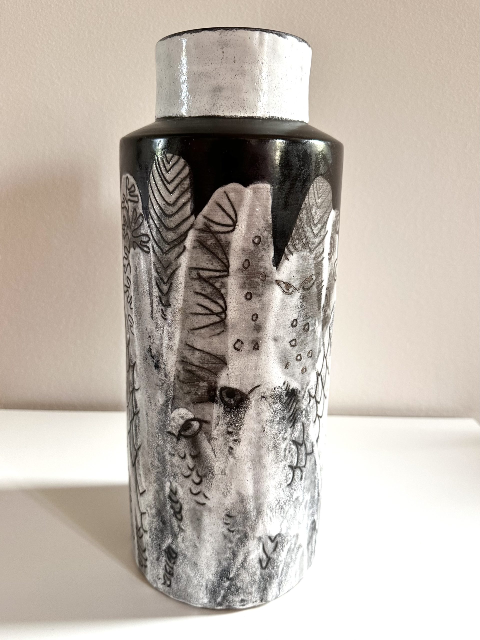 Ce vase sublime « aux chouettes » est un original signé de l’artiste Gustav Spoerri qui date probablement de 1976. Un vase, aux motifs similaires, se trouve au musée Ariana. (Zell am Harmersbach 1902 – Neuhausen am Rheinfall 1976). Il est dans un état parfait.