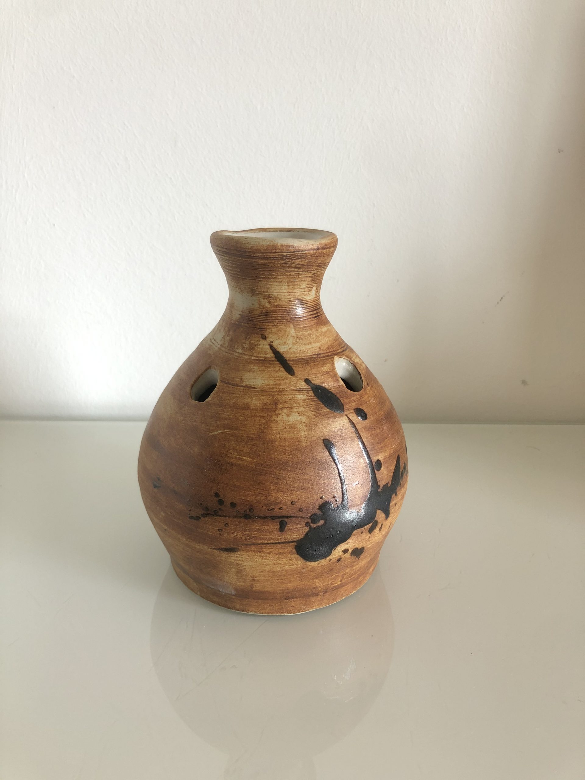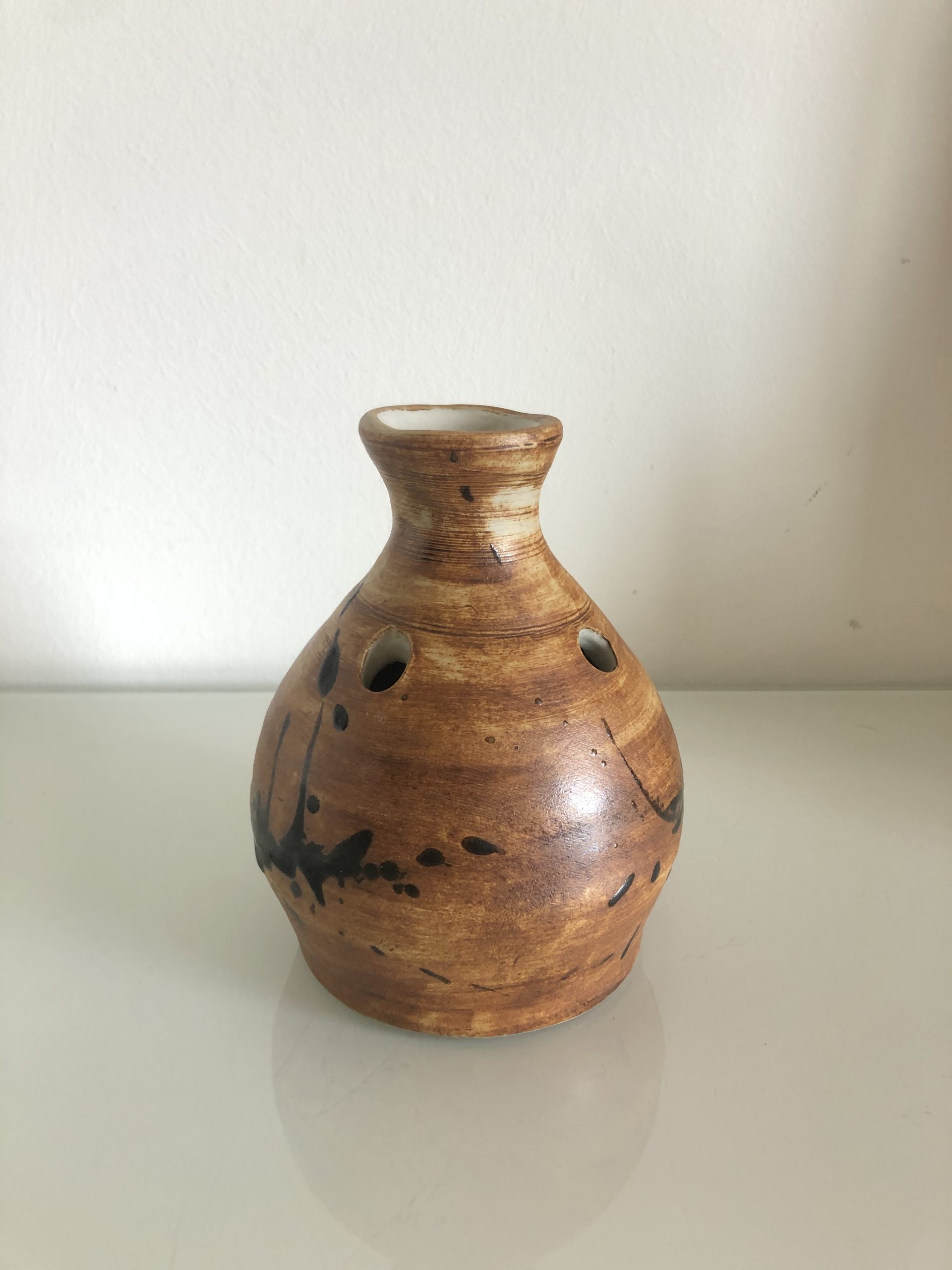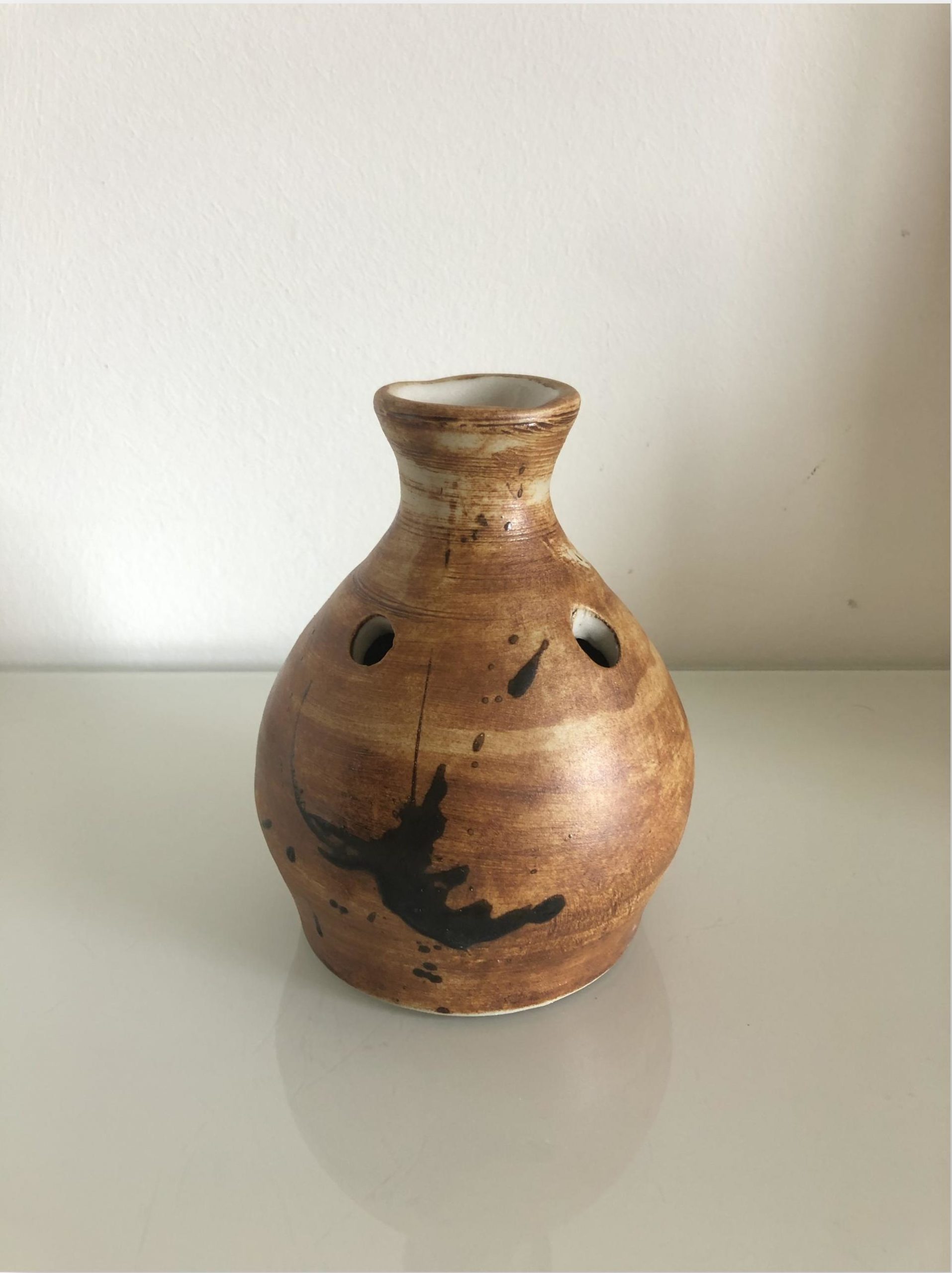 Produit venduJoli vase pique fleurs en grès de la poterie de la colombe (atelier établi dans les Pyrénées atlantiques en France dans les années 60), très caractéristique de part l’effet tachiste sur l’émail.