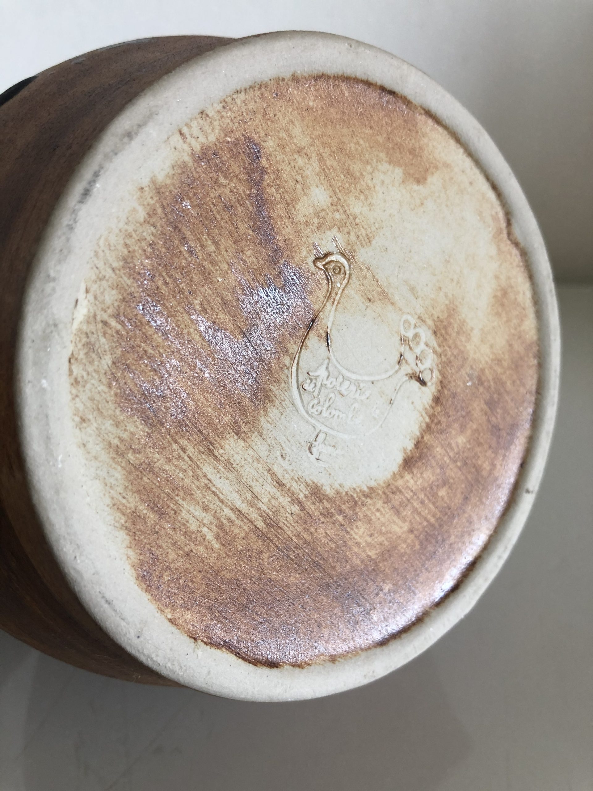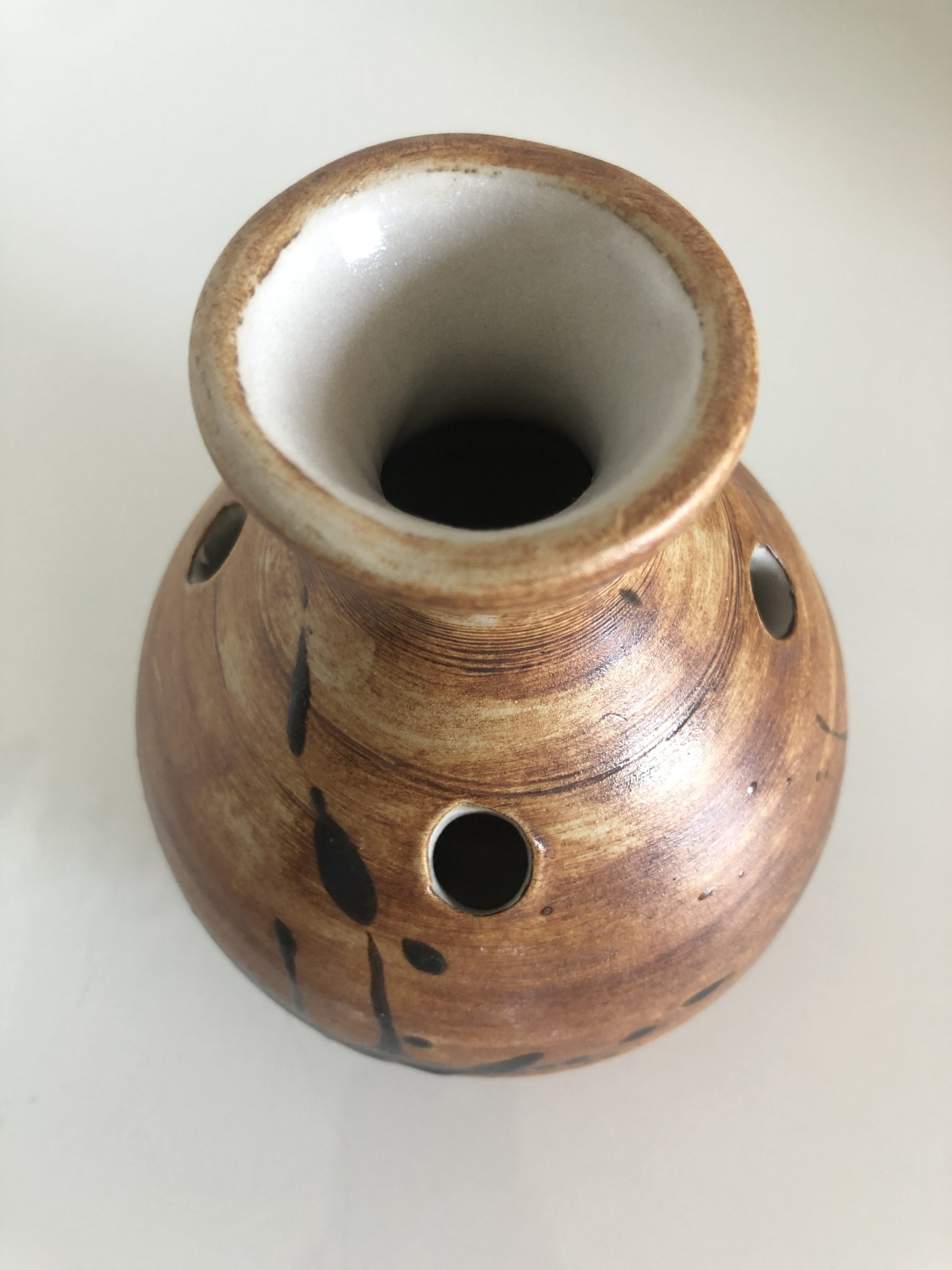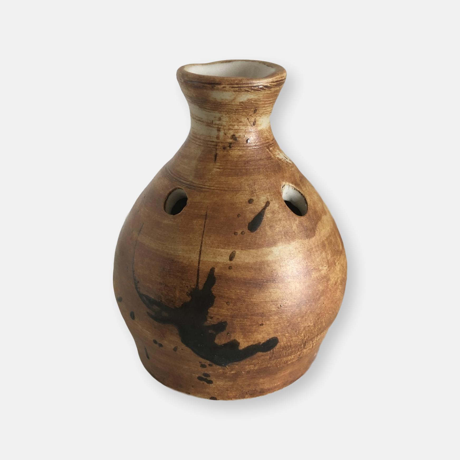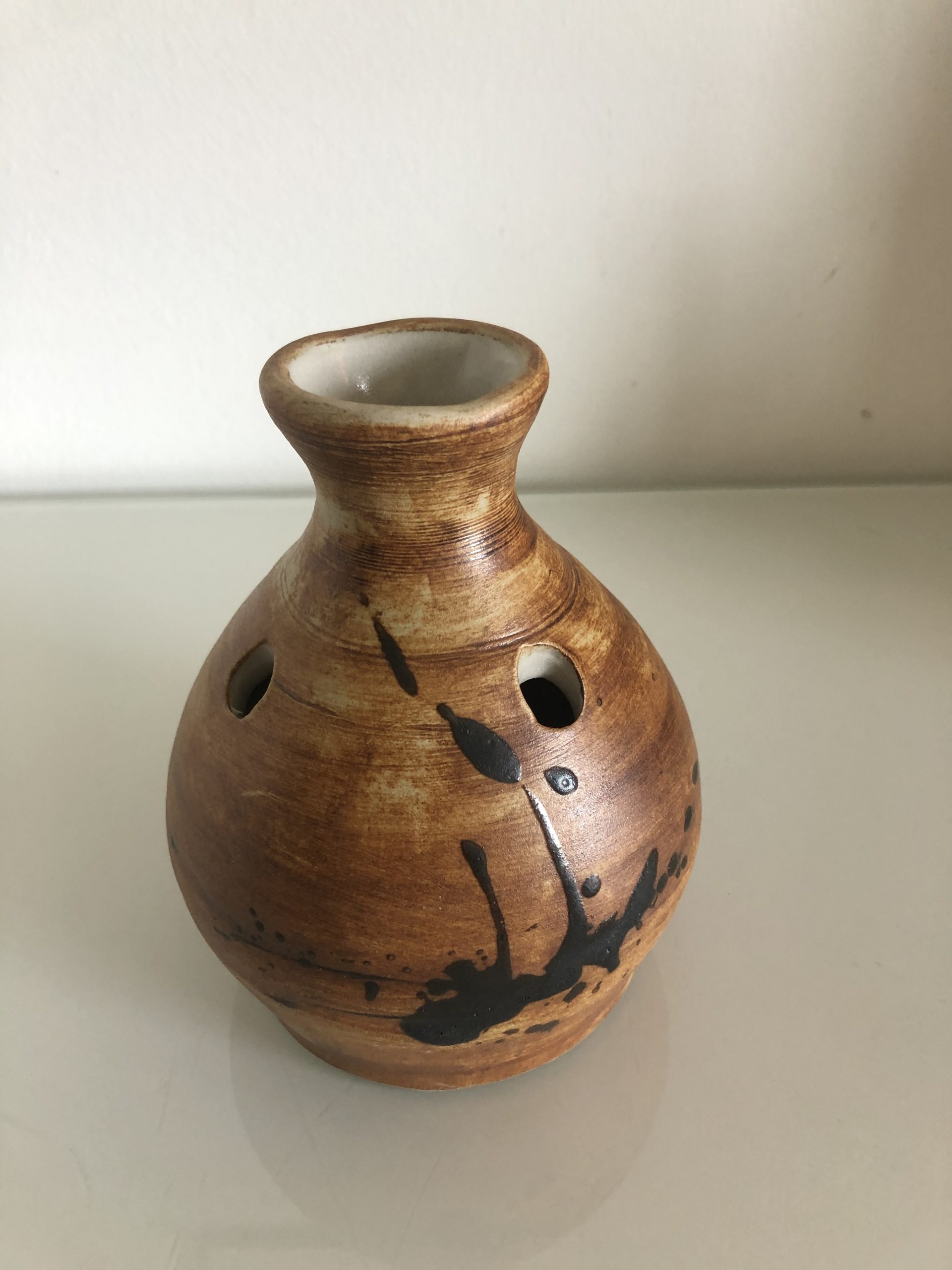 Produit venduJoli vase pique fleurs en grès de la poterie de la colombe (atelier établi dans les Pyrénées atlantiques en France dans les années 60), très caractéristique de part l’effet tachiste sur l’émail.