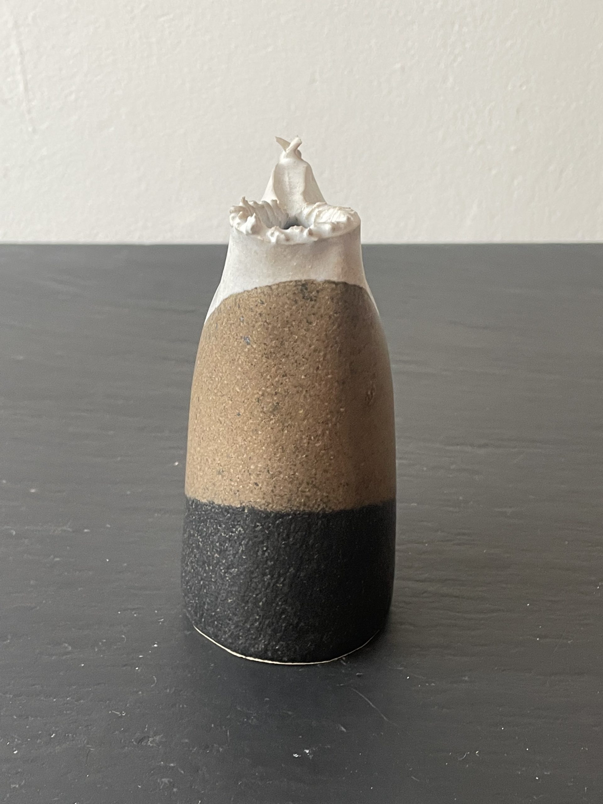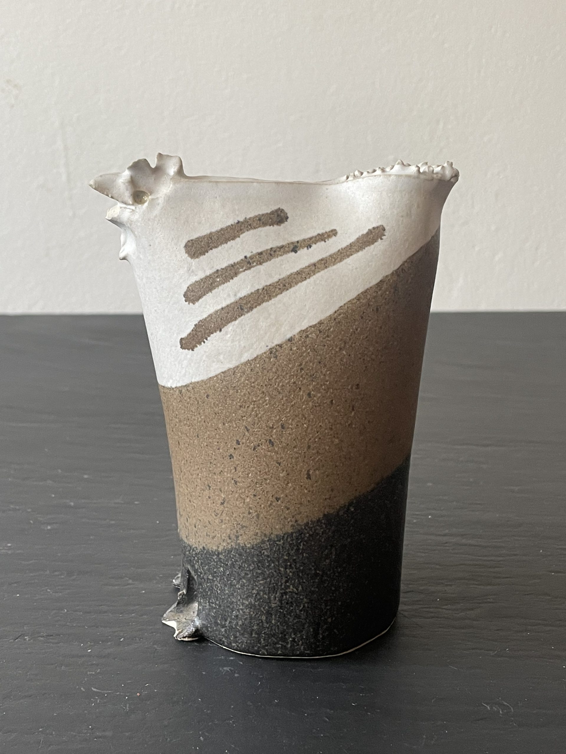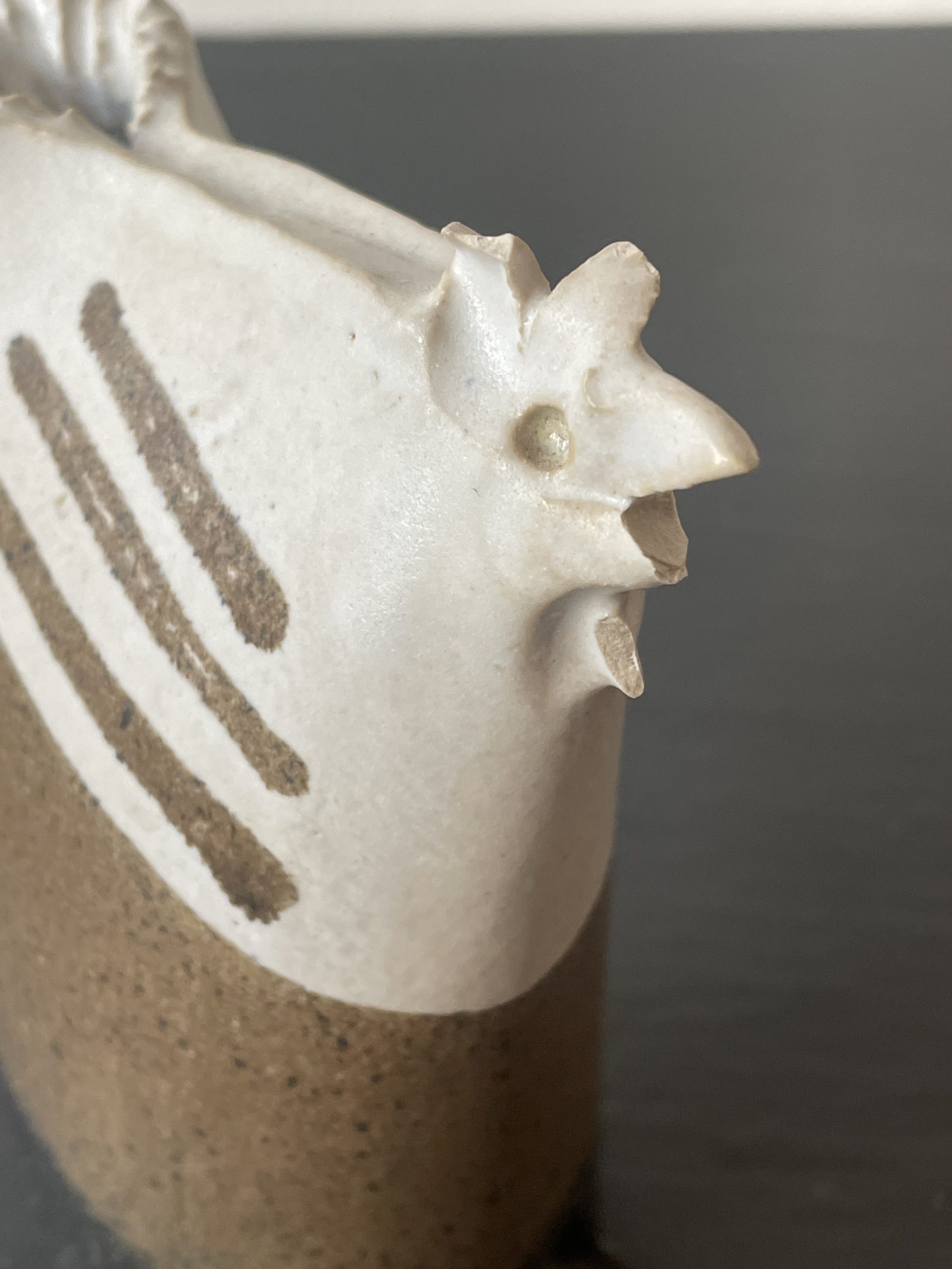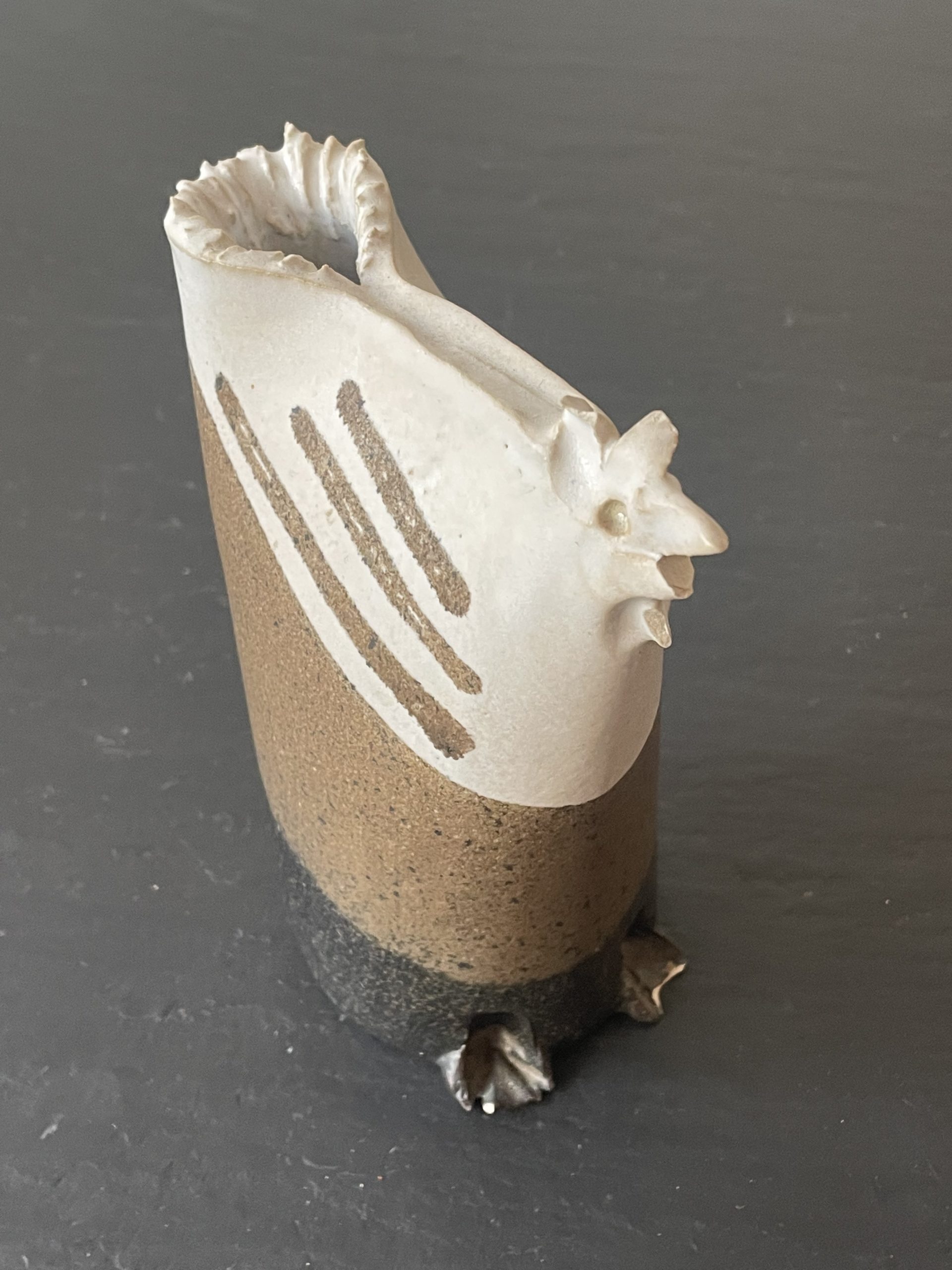 Produit venduPetit vase en grès en forme de poule de la céramiste Bridget Doudot Green, dans les tons beiges et marrons.