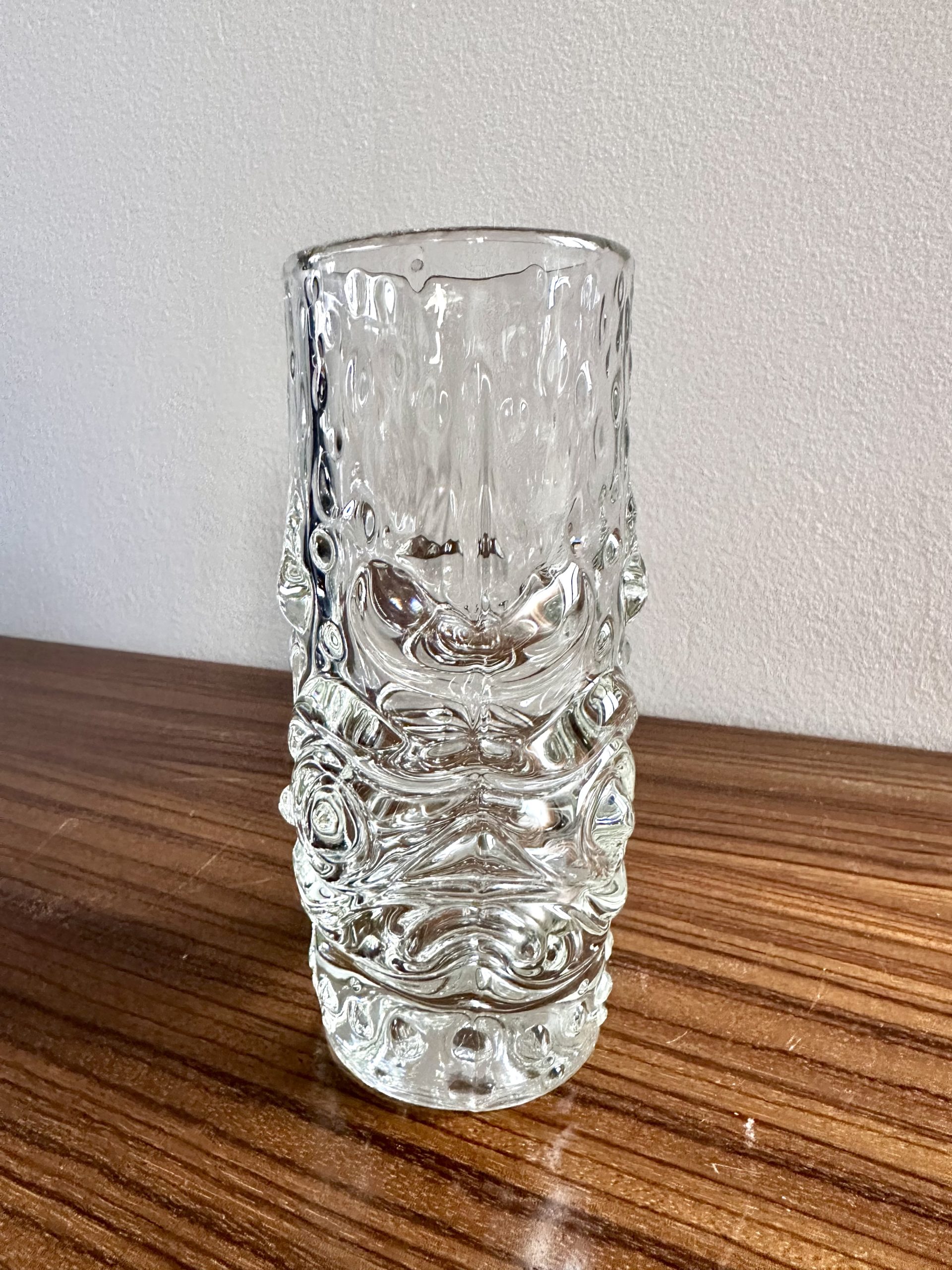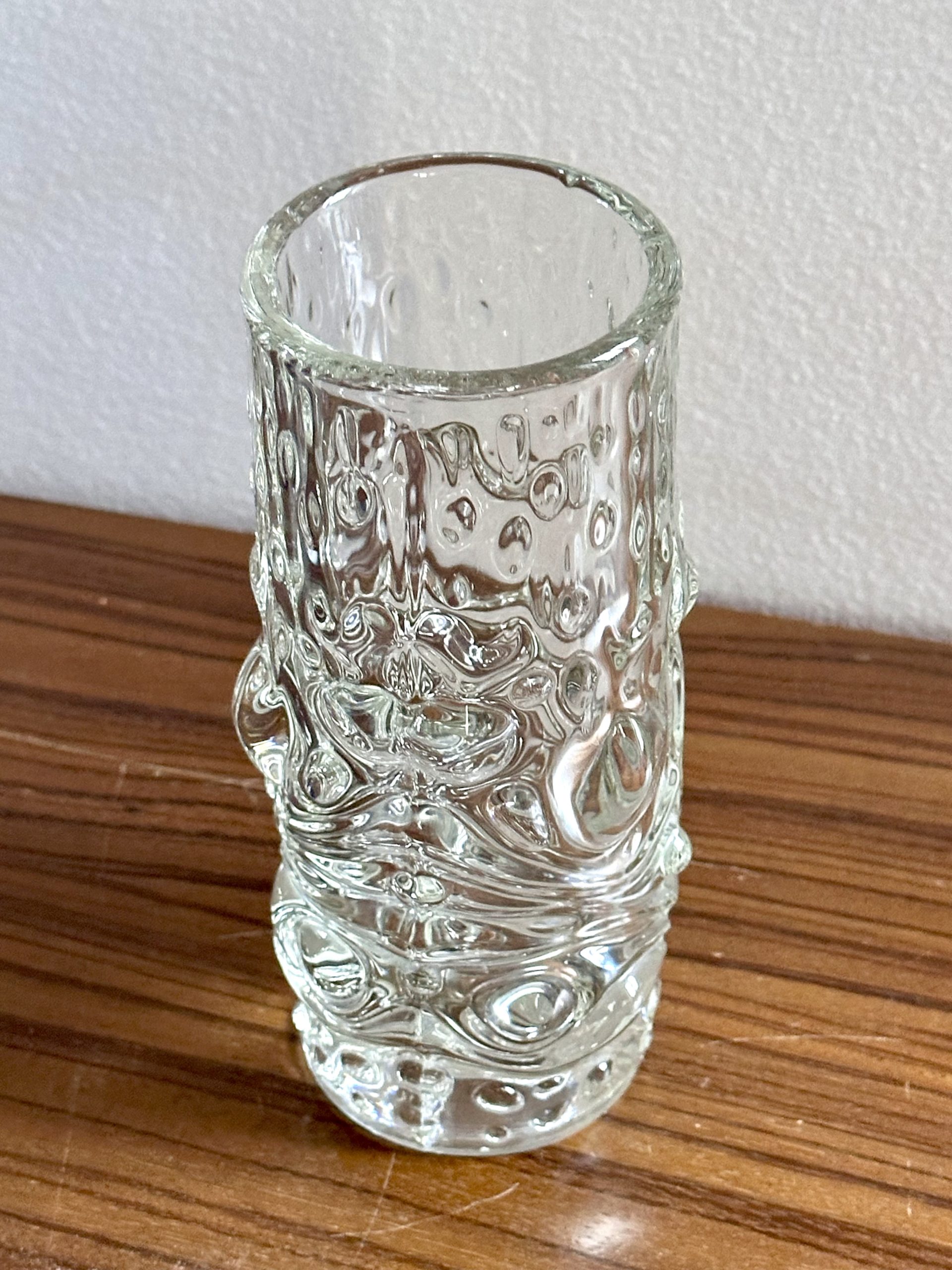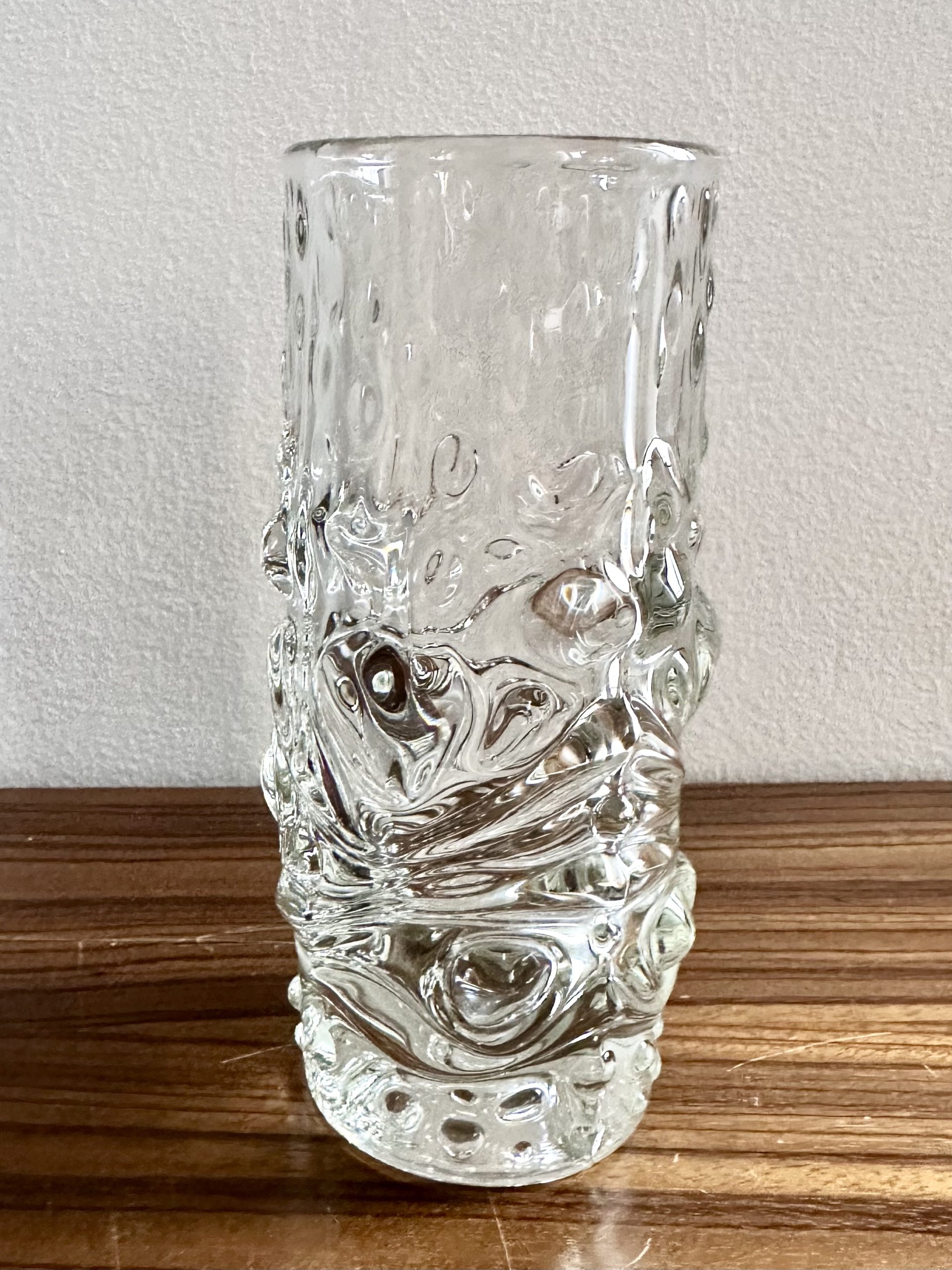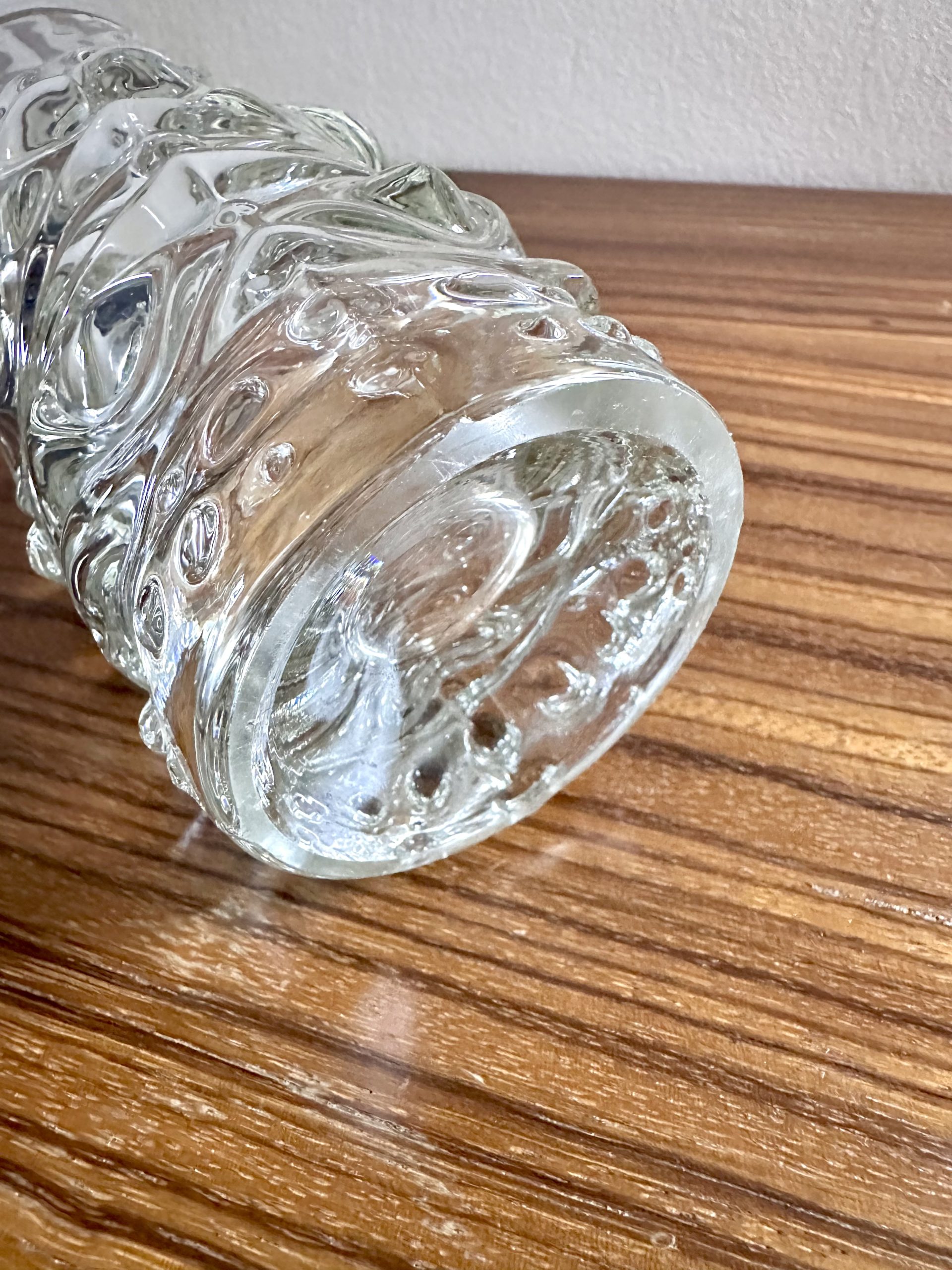 Vase Sklo Union en verre moulé pressé transparent, modèle « Dragon’s Head », dessiné par František Pečený pour Heřmanova huť en 1972. Ce modèle 20235 est devenu un classique du verre tchécoslovaque des années 1970, recherché pour son relief sculptural très expressif, presque zoomorphe, qui lui donne une présence immédiate. Le décor se révèle différemment selon l’angle et accroche magnifiquement la lumière, entre ondulations, bosses et lignes plus sobres sur la partie haute. Une pièce forte, à la fois décorative et très représentative du vocabulaire formel de Sklo Union, qui fonctionne aussi bien seule qu’avec quelques tiges.