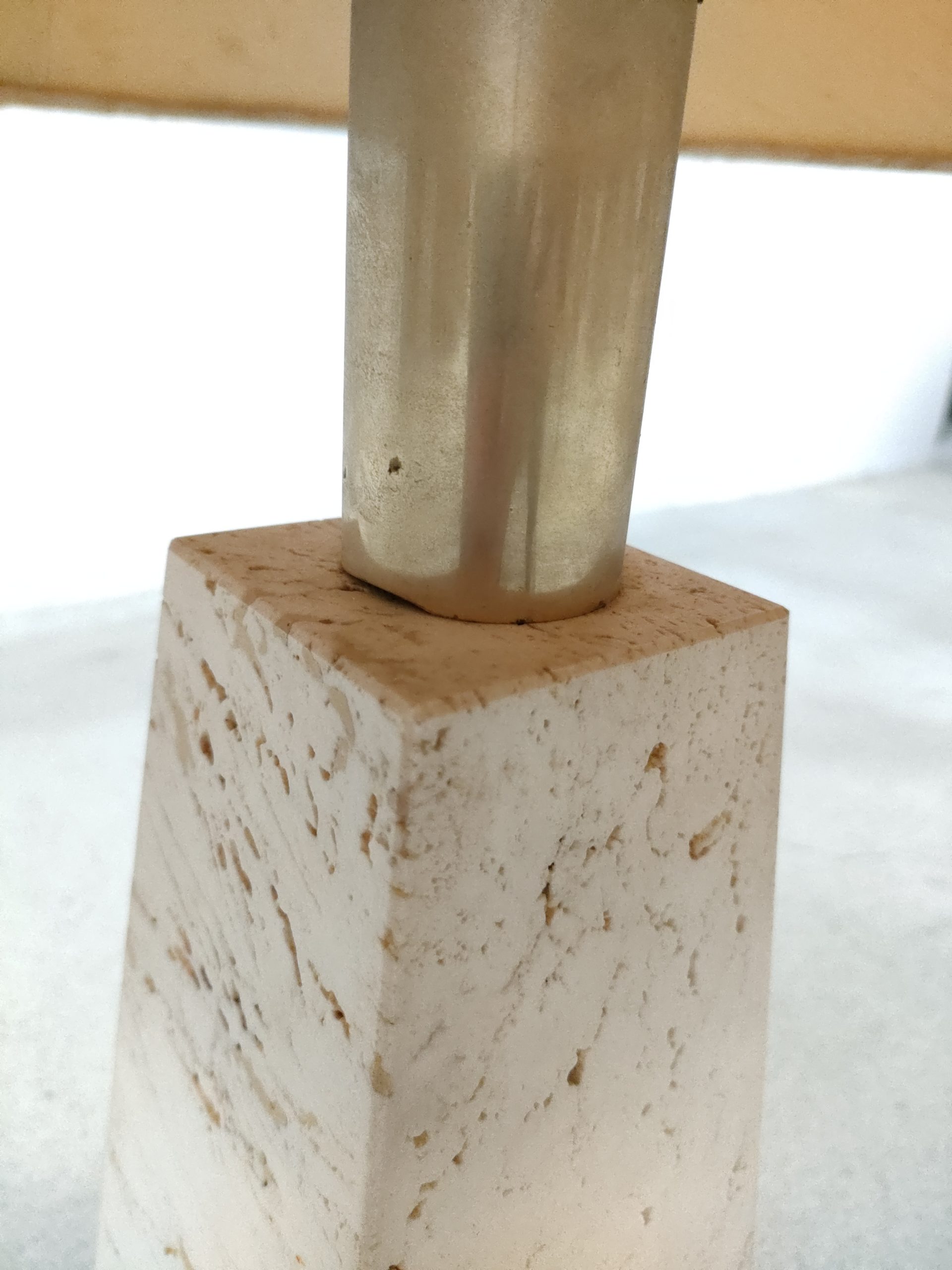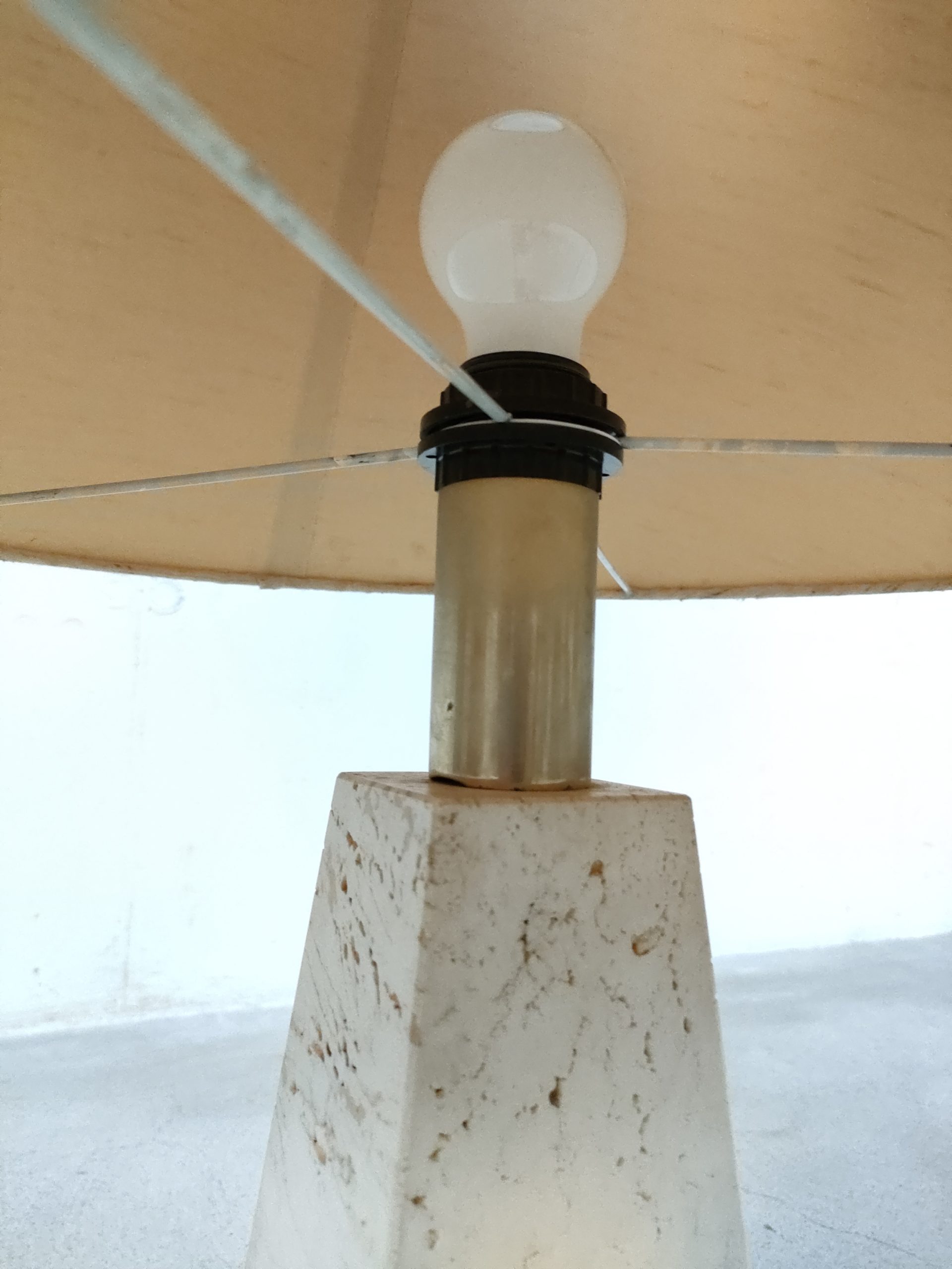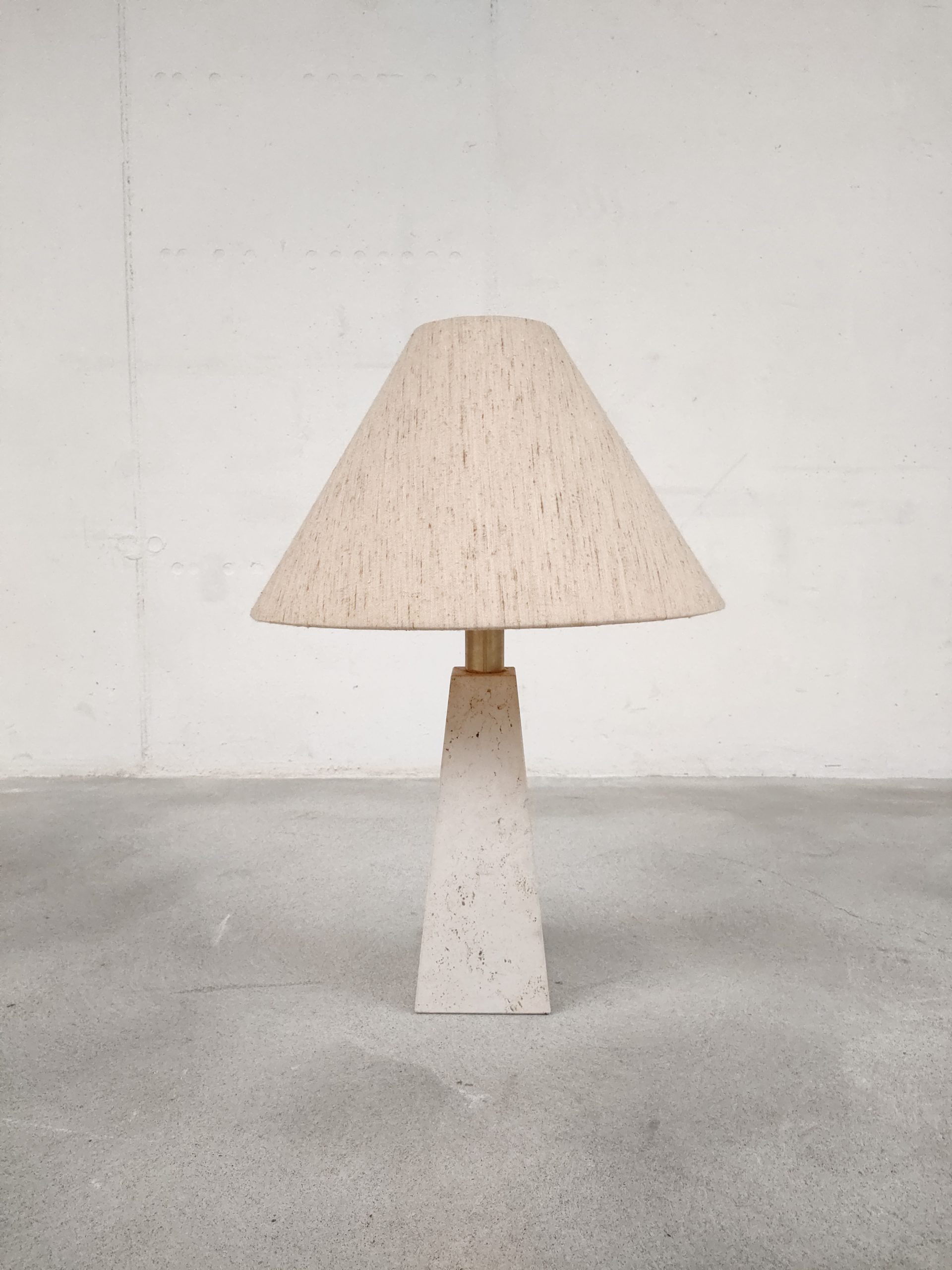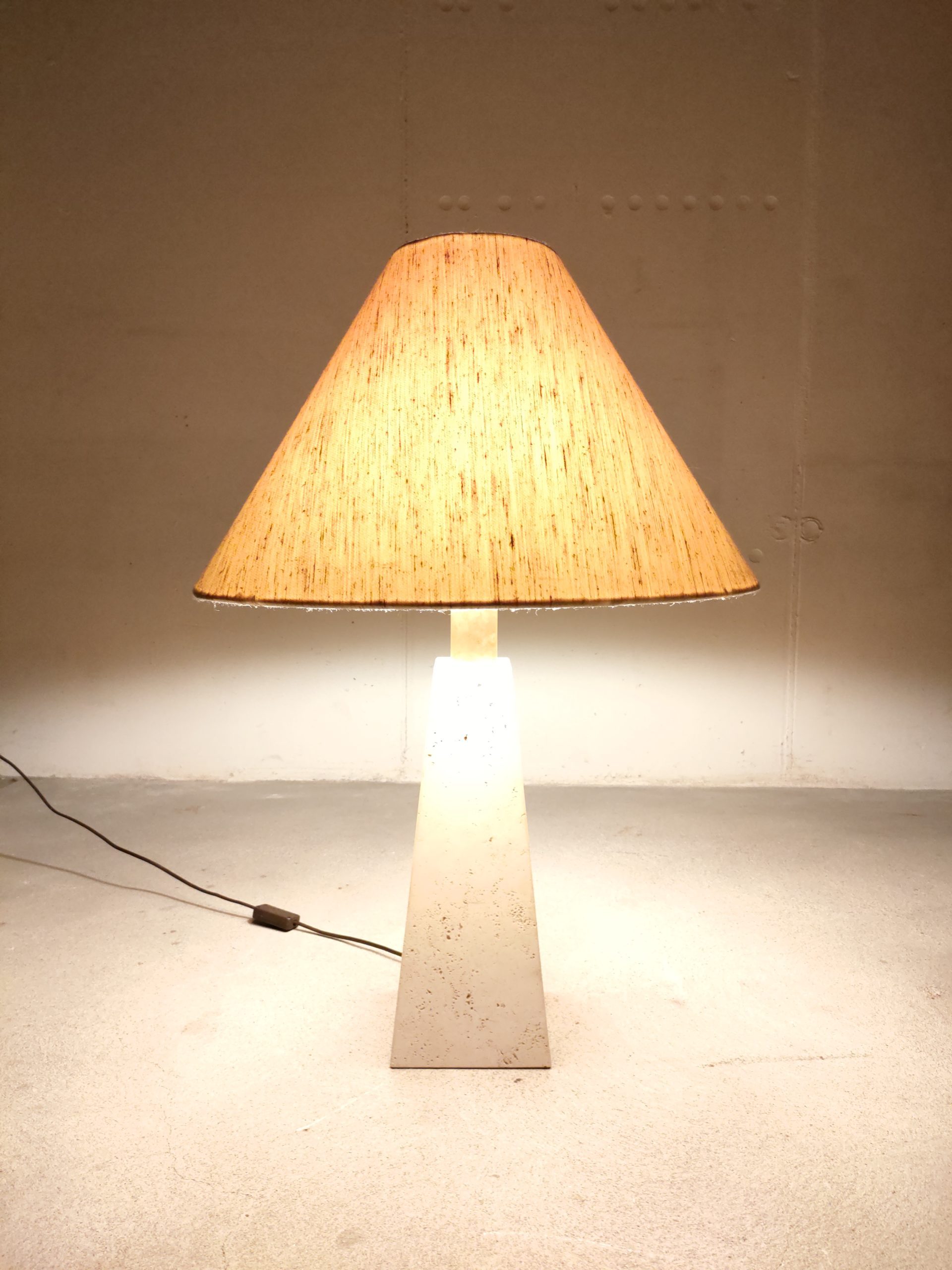 Produit venduGrande lampe avec base en travertin et abat-jour en tissu. La lampe est parfaitement fonctionnelle et permet de créer une belle lumière tamisée. Elle fonctionne avec une ampoule standard E27.