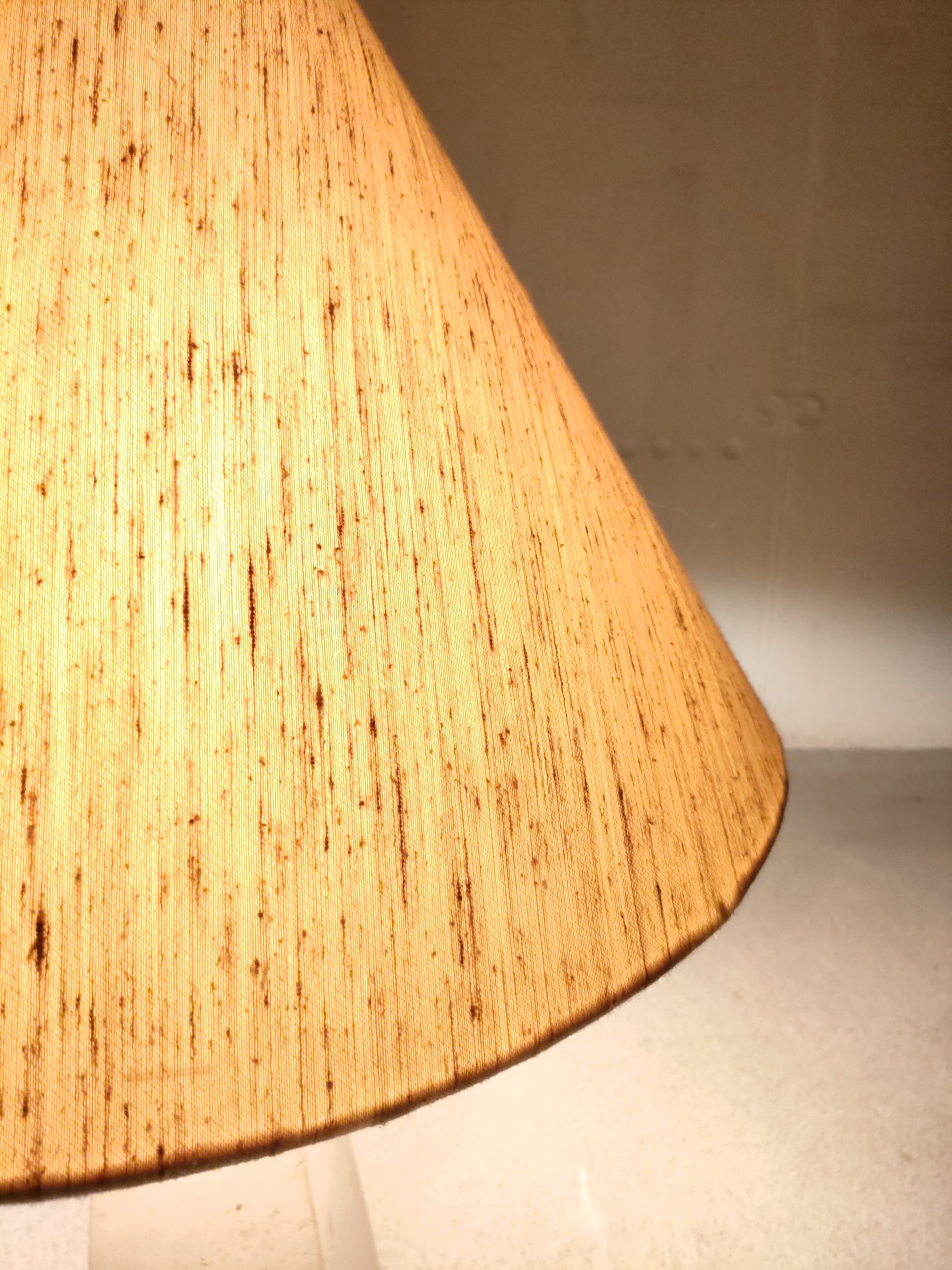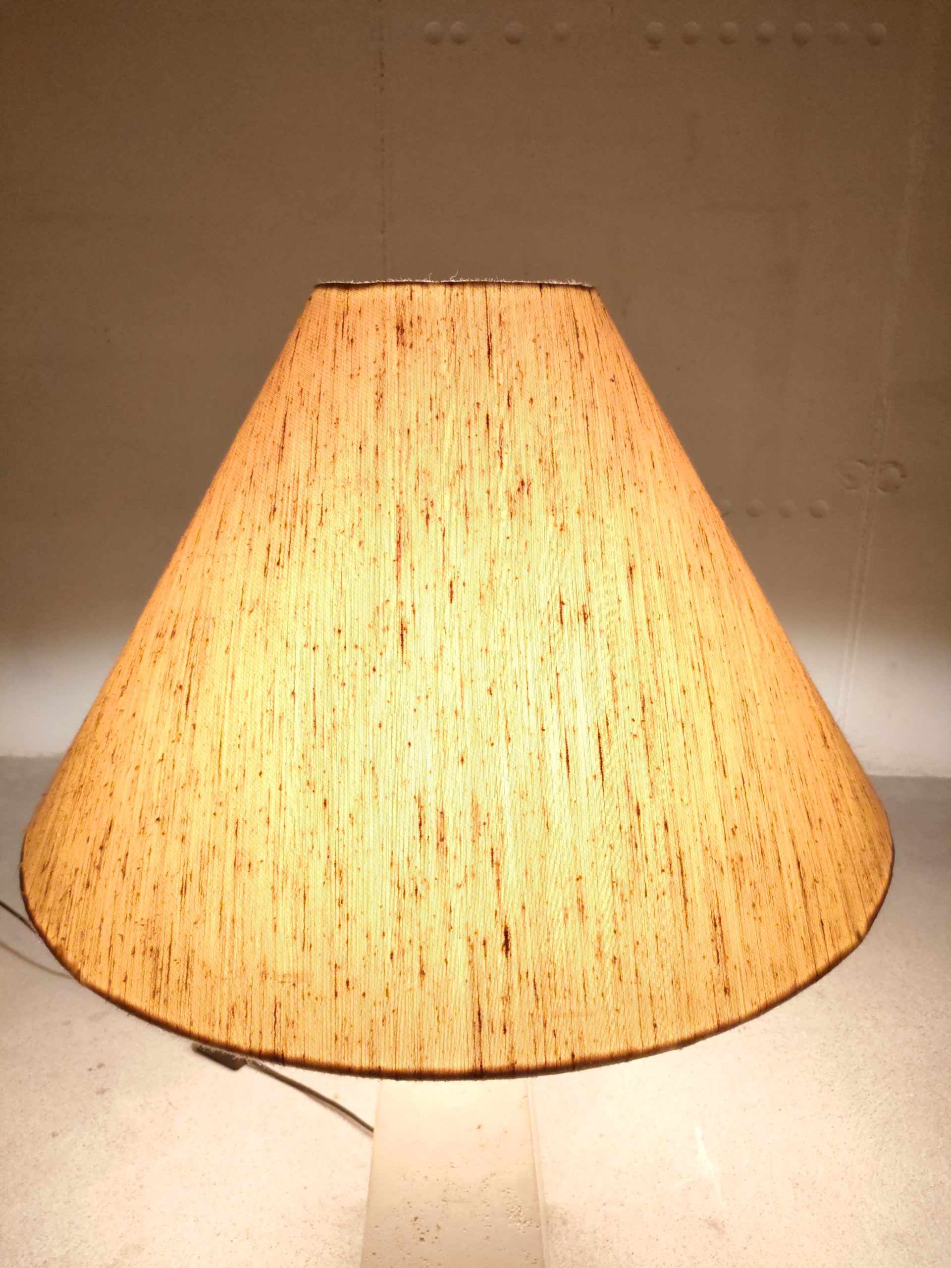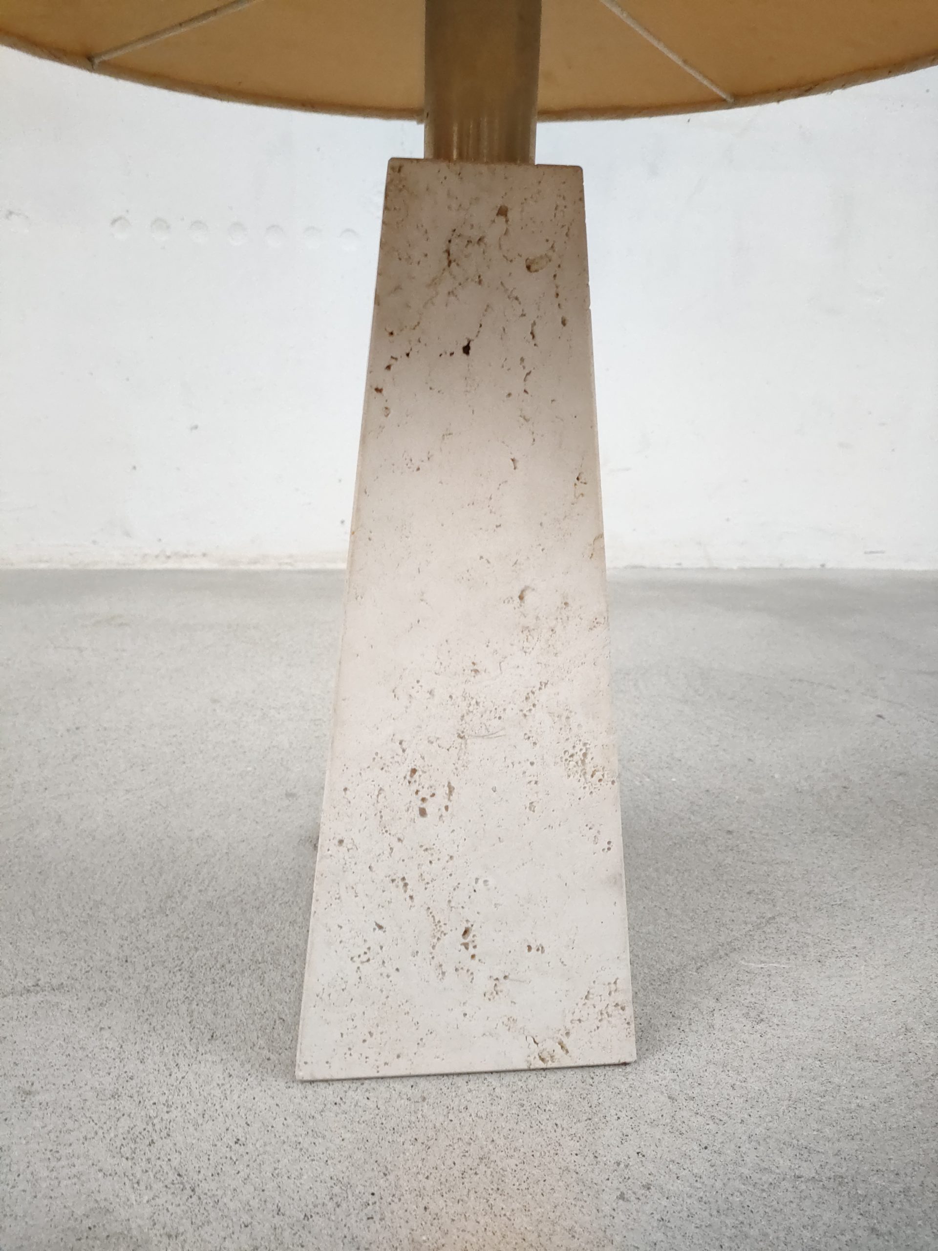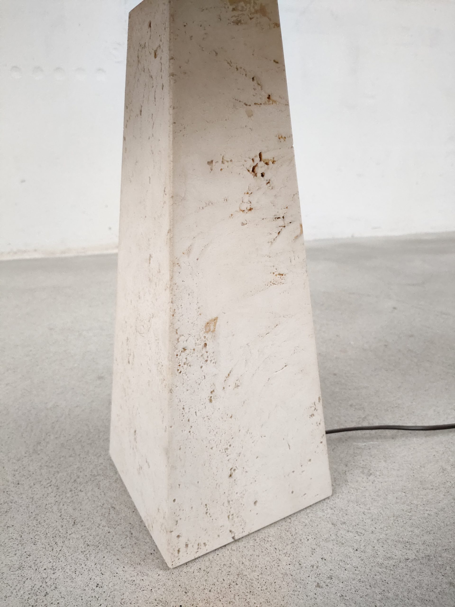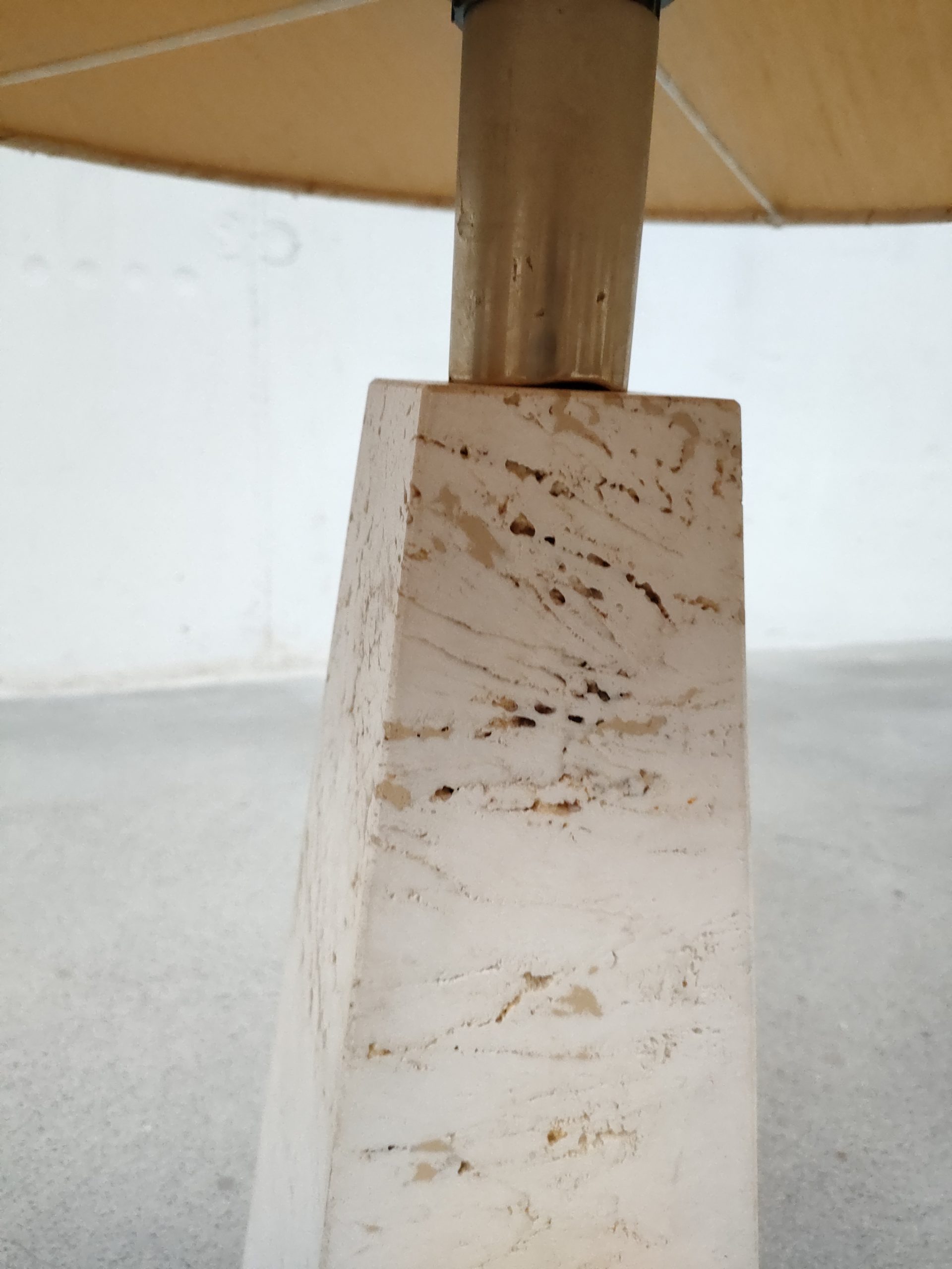 Produit venduGrande lampe avec base en travertin et abat-jour en tissu. La lampe est parfaitement fonctionnelle et permet de créer une belle lumière tamisée. Elle fonctionne avec une ampoule standard E27.