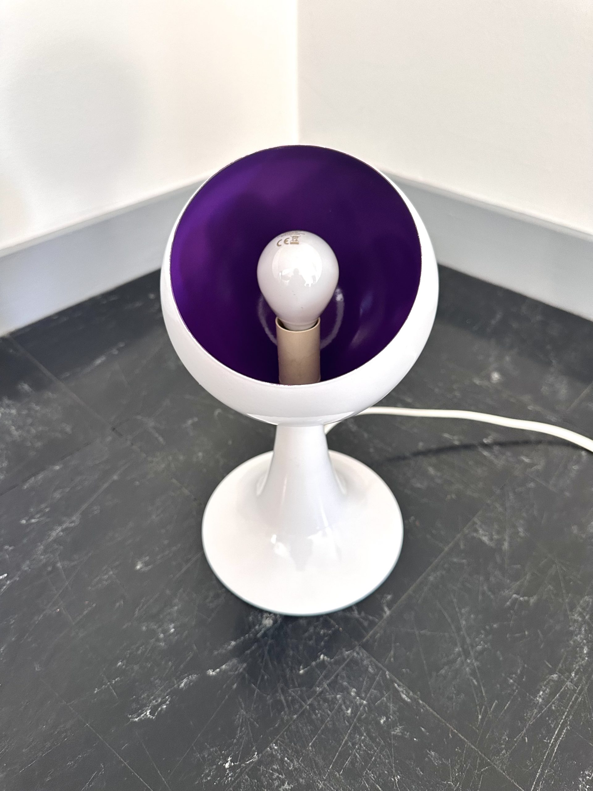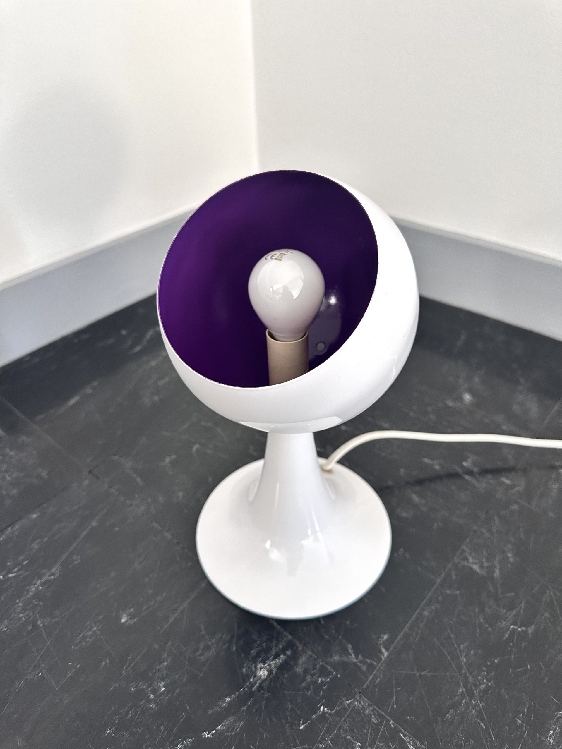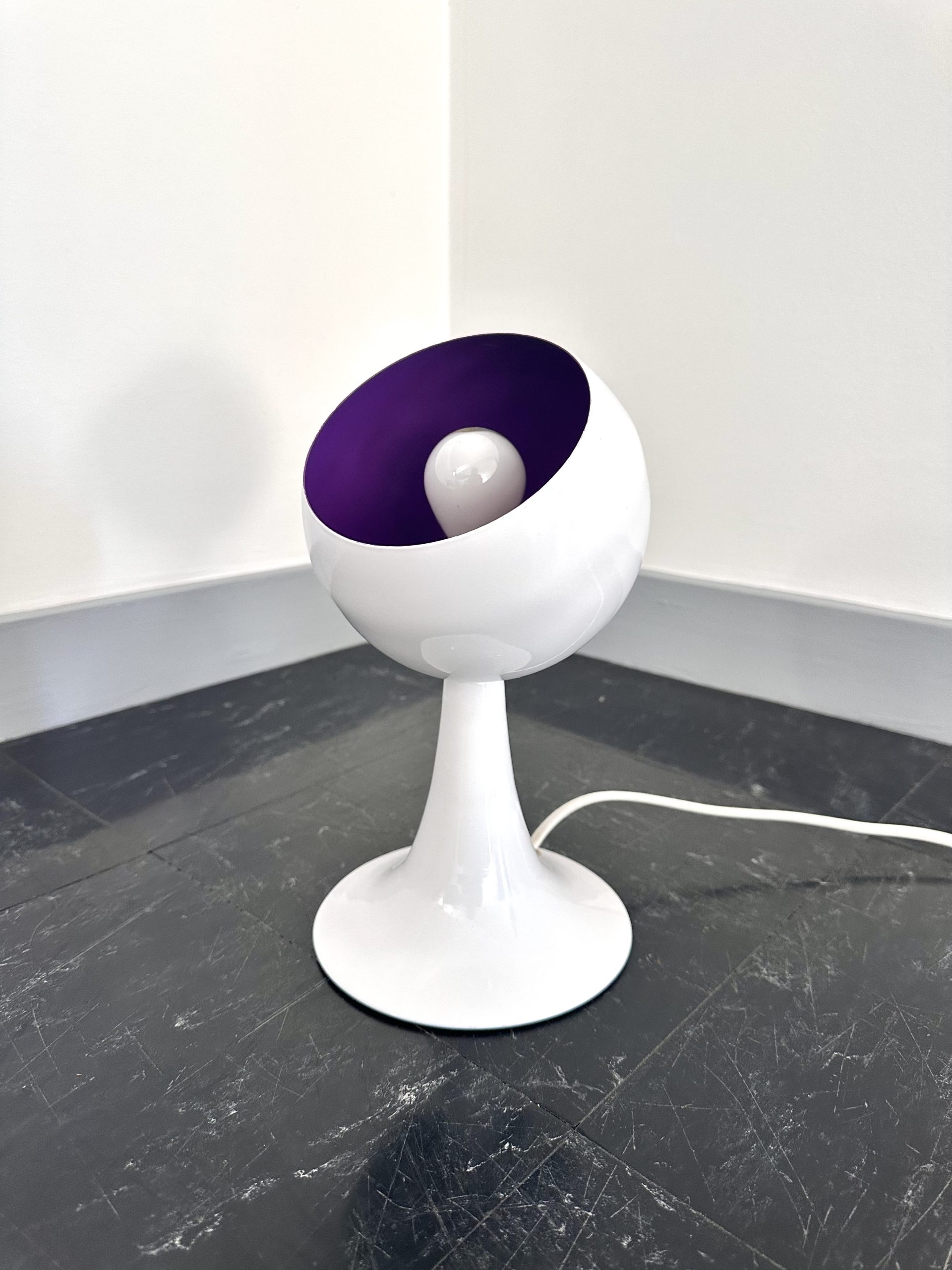 Produit venduTrès mignonne lampe à poser, pied tulipe, de type eyeball blanche, intérieur violet datant de 1980. Elle est en métal et elle fonctionne avec des ampoule E14. Lorsqu’elle est allumée intérieur est plus rose et l’interrupteur est sur le fil. On peut noter de faibles traces d’usure.