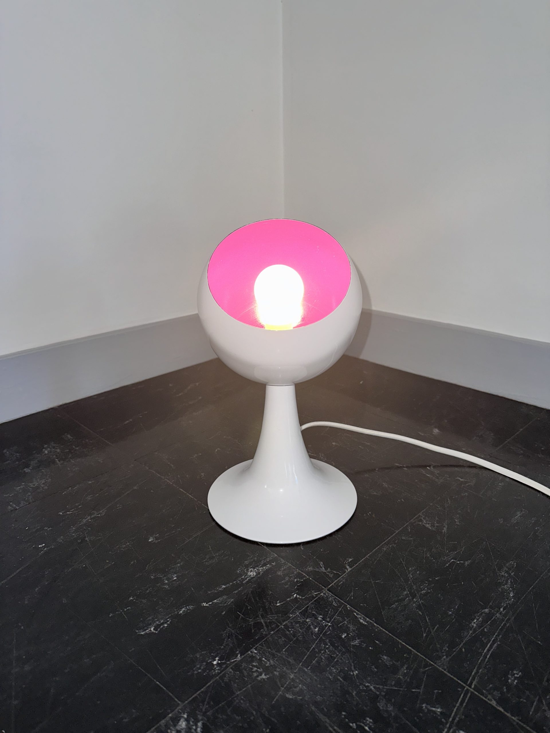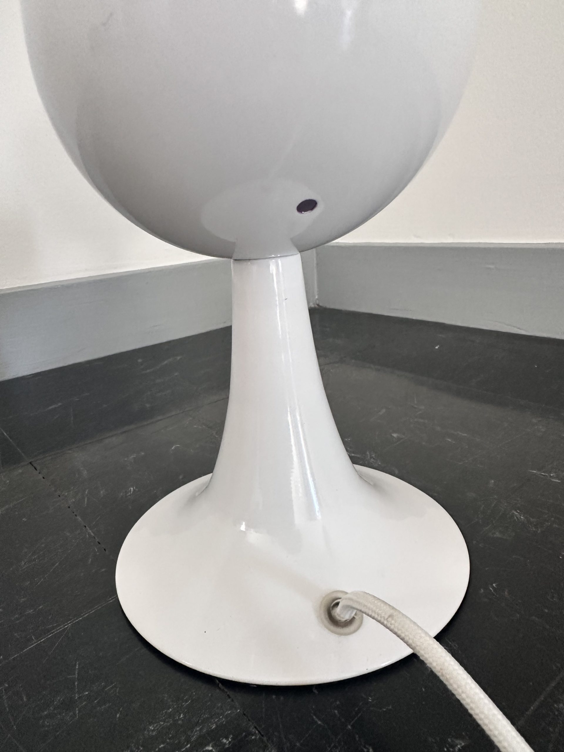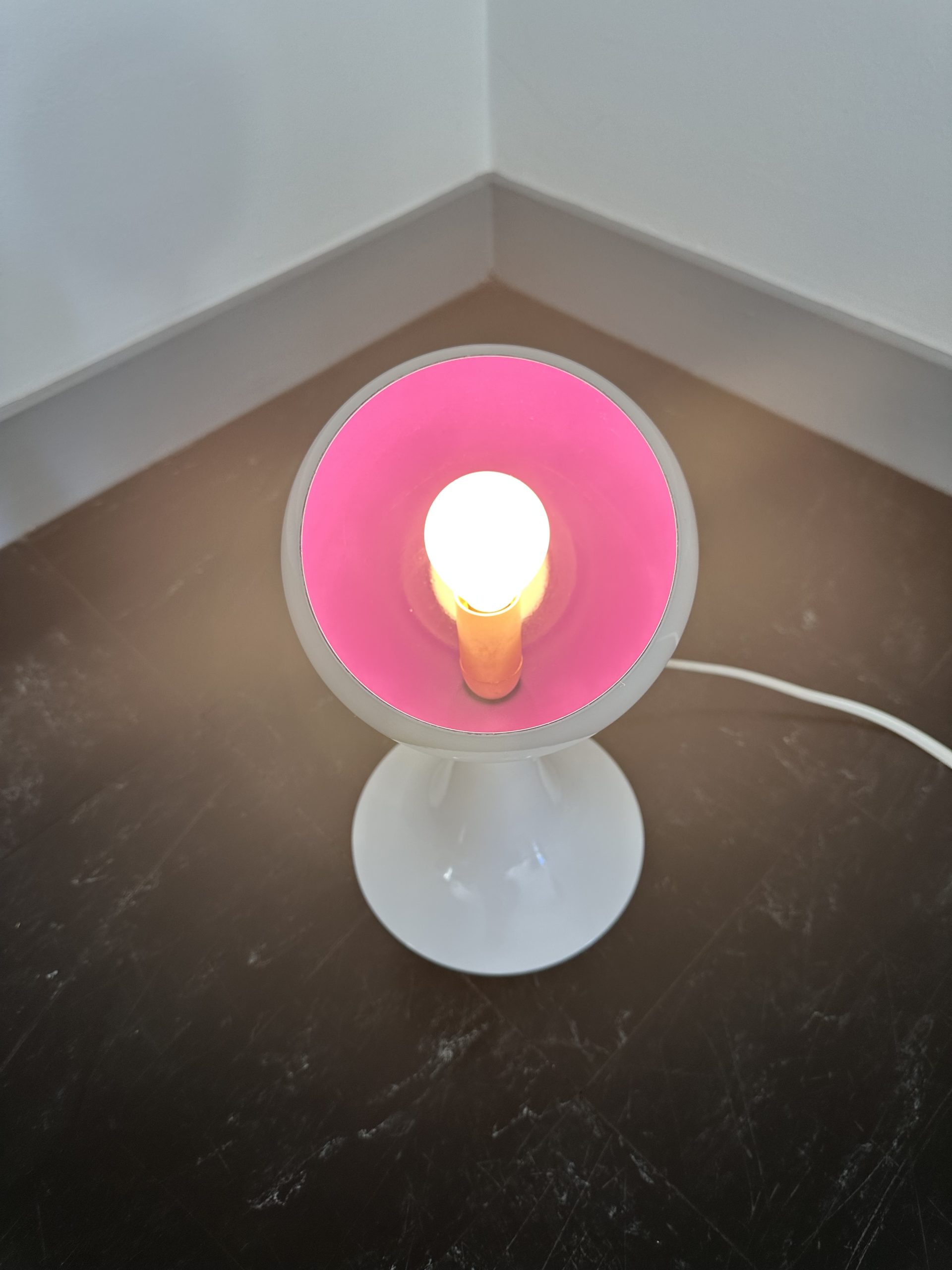 Produit venduTrès mignonne lampe à poser, pied tulipe, de type eyeball blanche, intérieur violet datant de 1980. Elle est en métal et elle fonctionne avec des ampoule E14. Lorsqu’elle est allumée intérieur est plus rose et l’interrupteur est sur le fil. On peut noter de faibles traces d’usure.