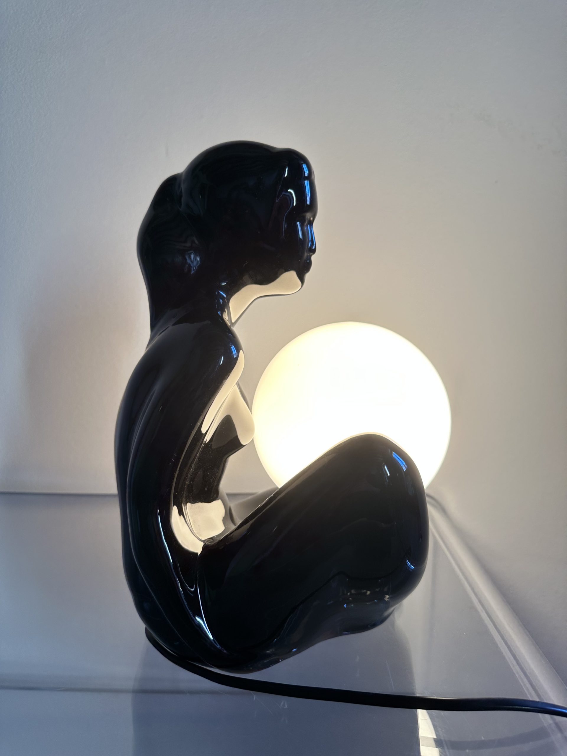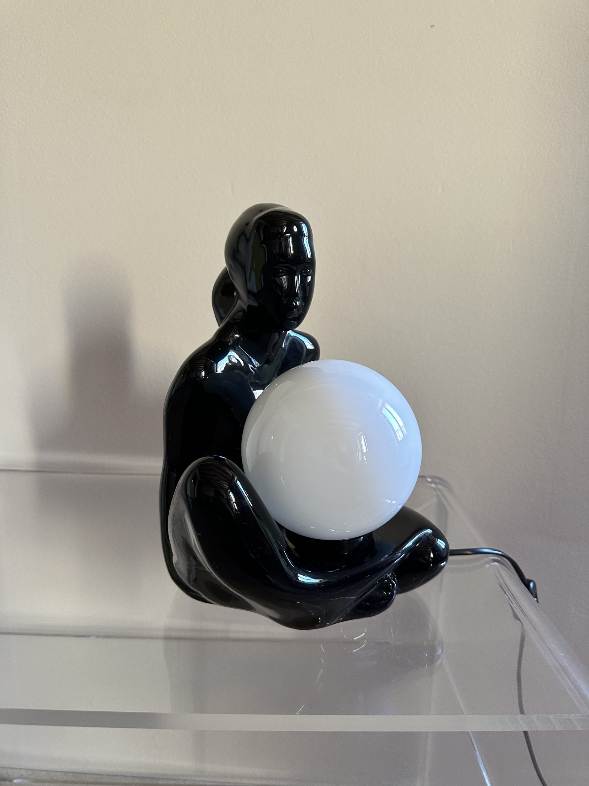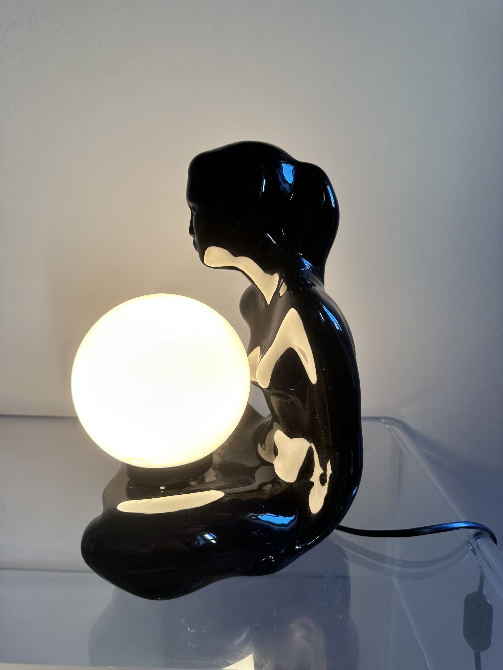 Cette lampe en céramique pour le personnage et boule en verre pour la source lumineuse date probablement des années 70-80.