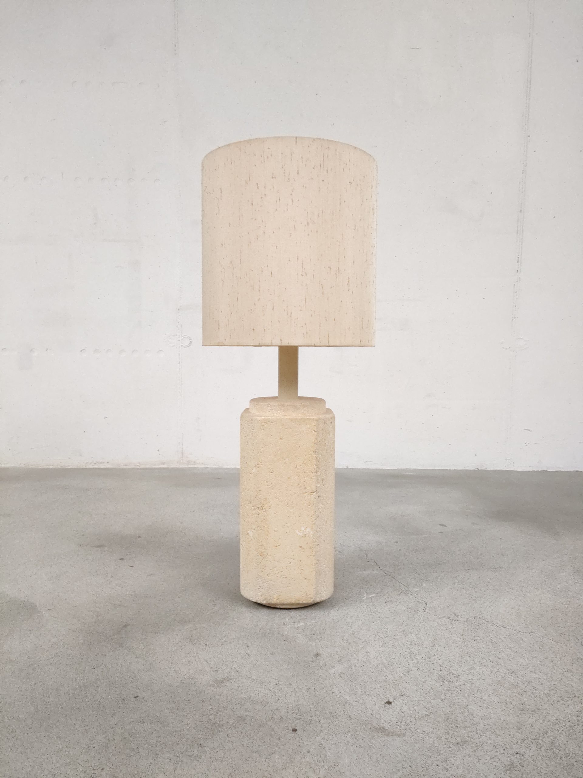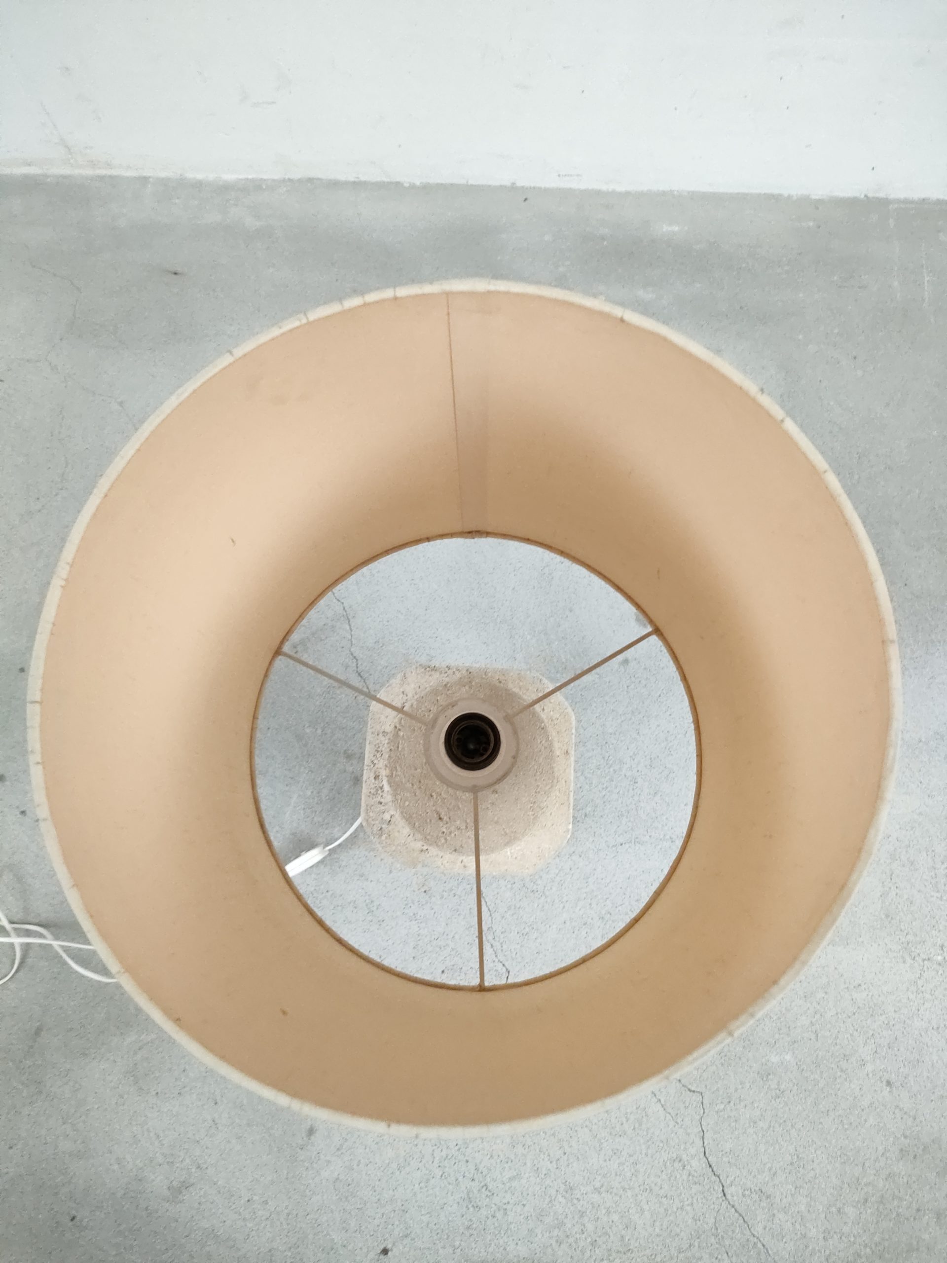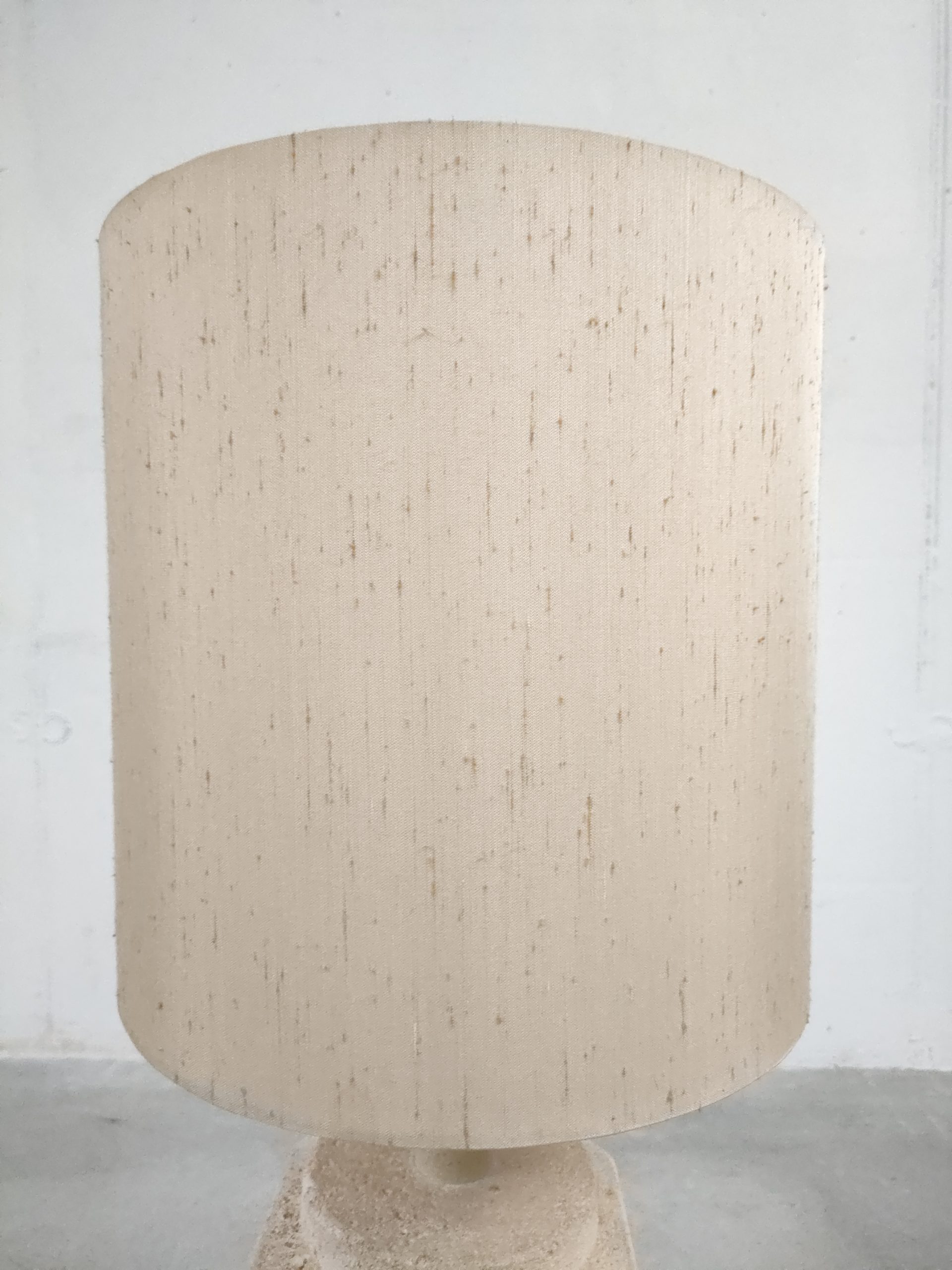 Produit venduGrande lampe de table (elle peut également être posée au sol) avec base en pierre et abat-jour en tissu. Le col de la base est en plastique imitation pierre. Une tache est présente sur l’abat-jour (voir photo). La base est très lourde, environ une vingtaine de kilo. Elle fonctionne avec des ampoules standard E27.