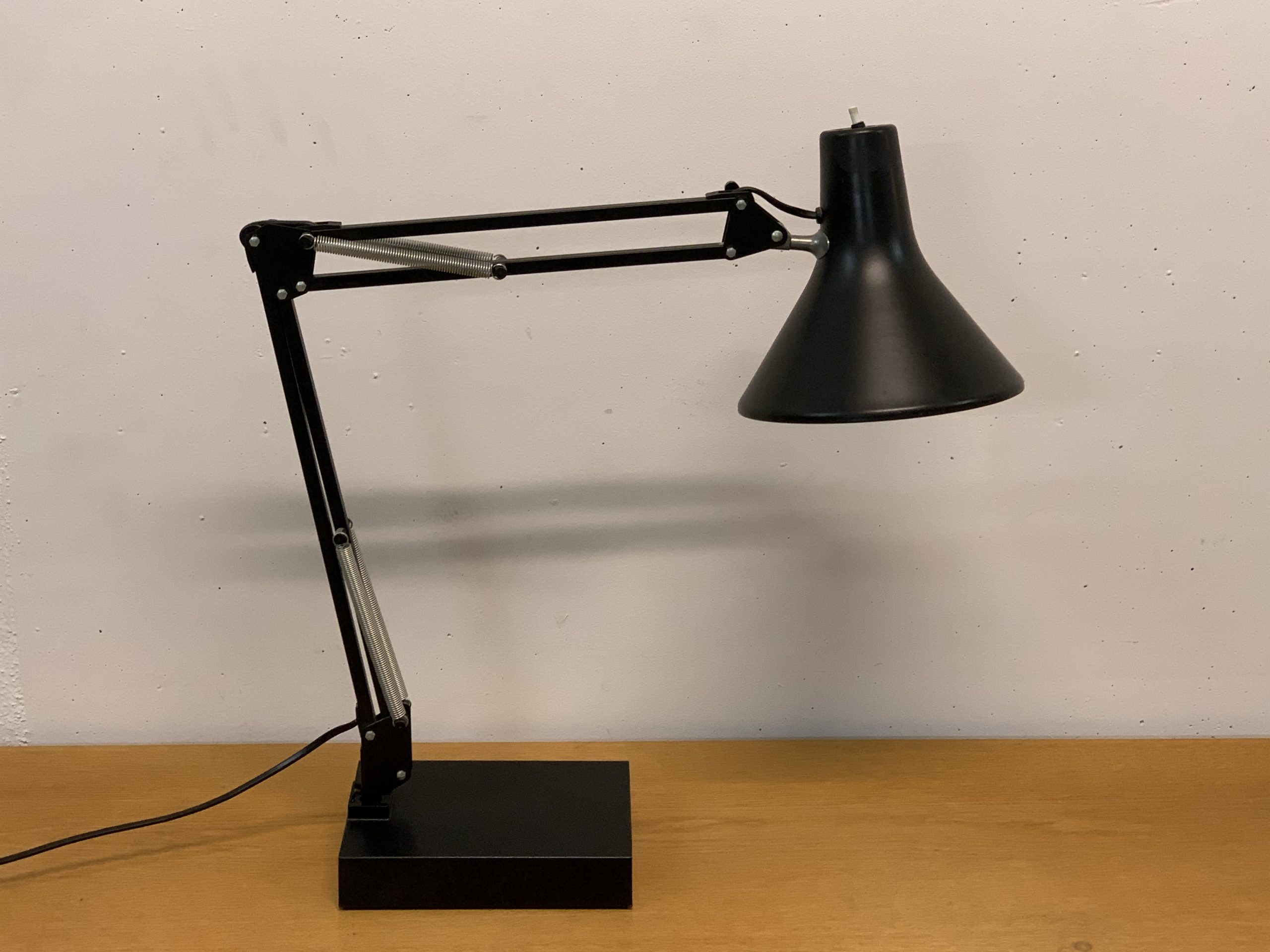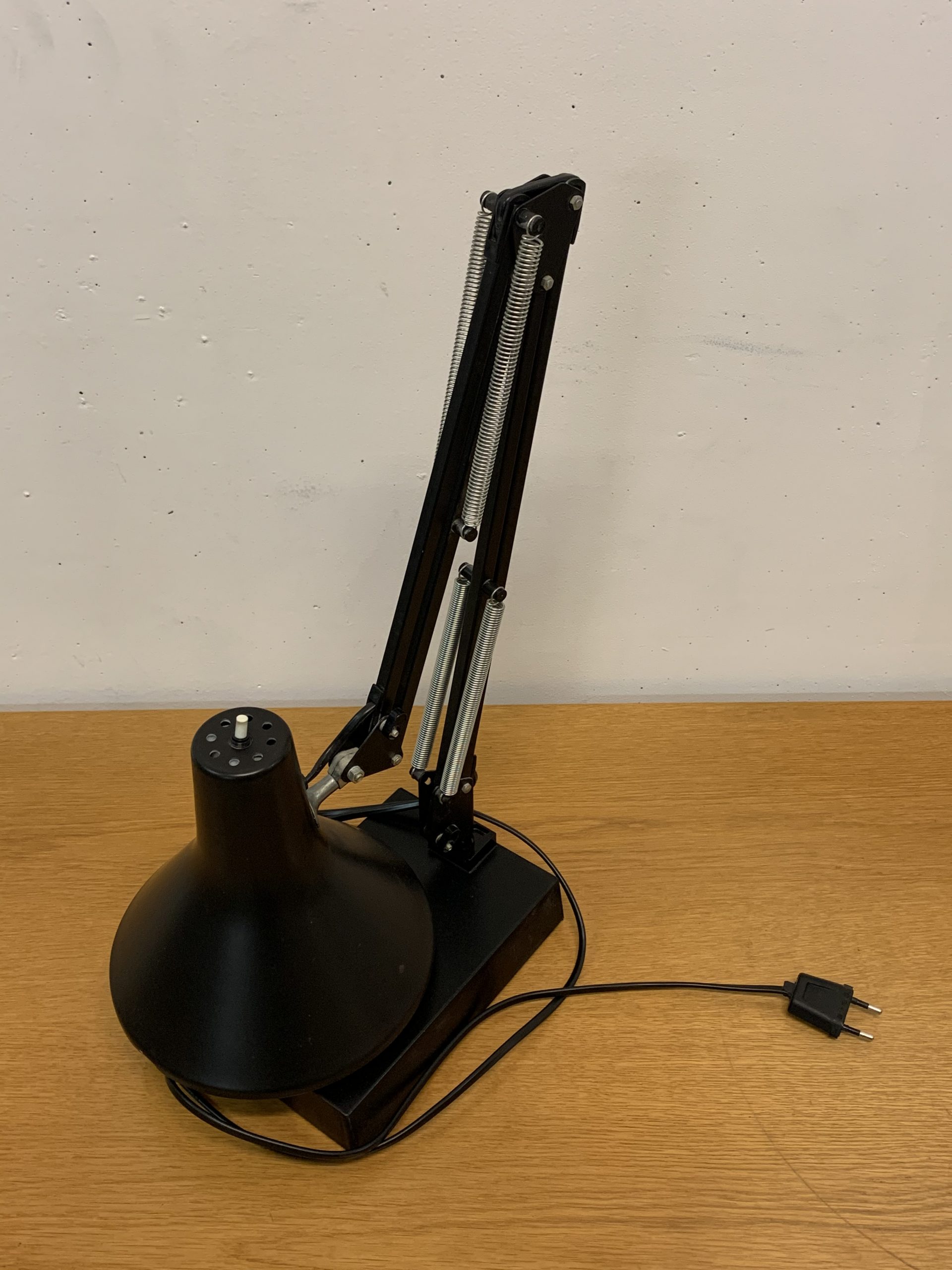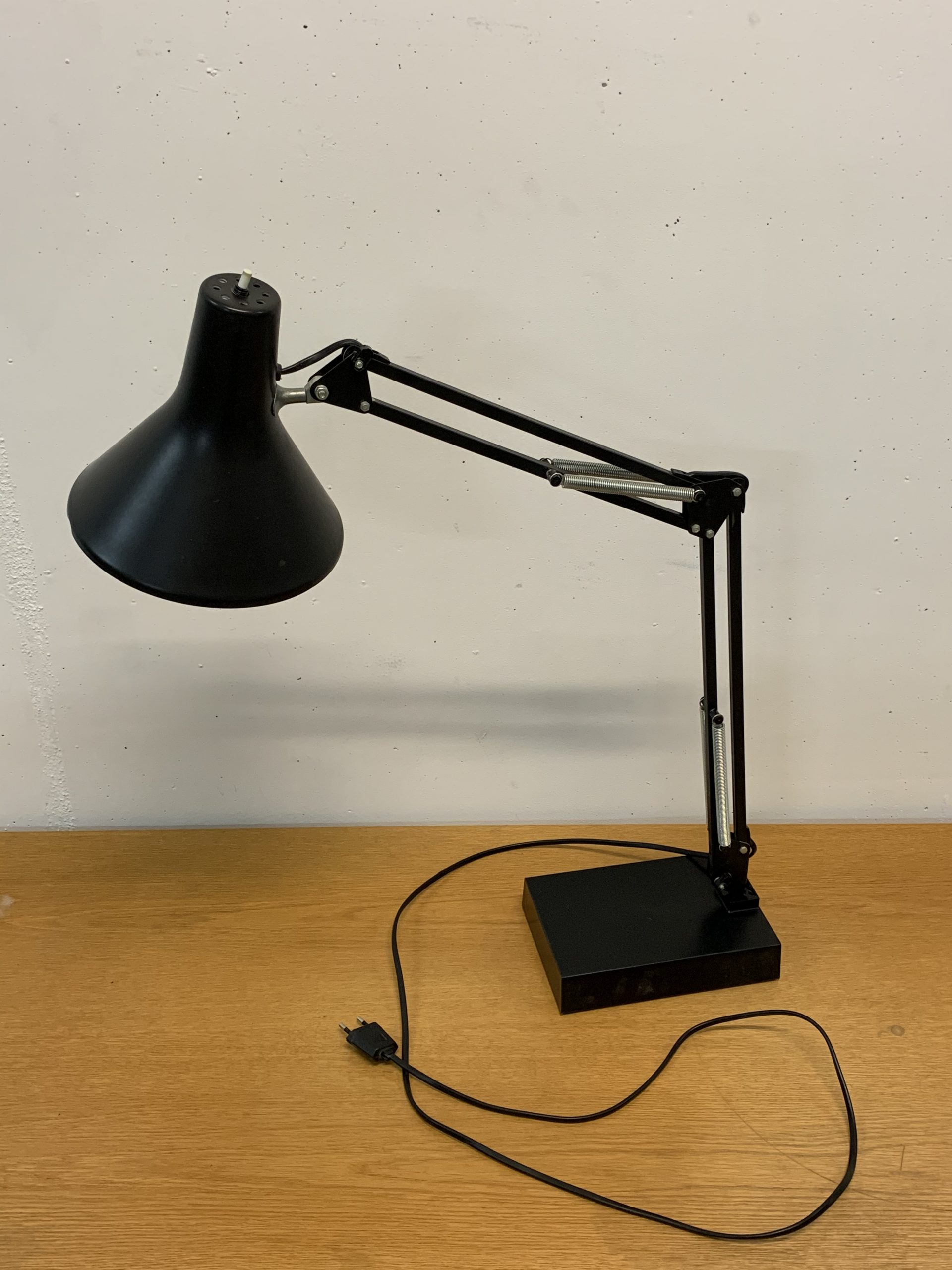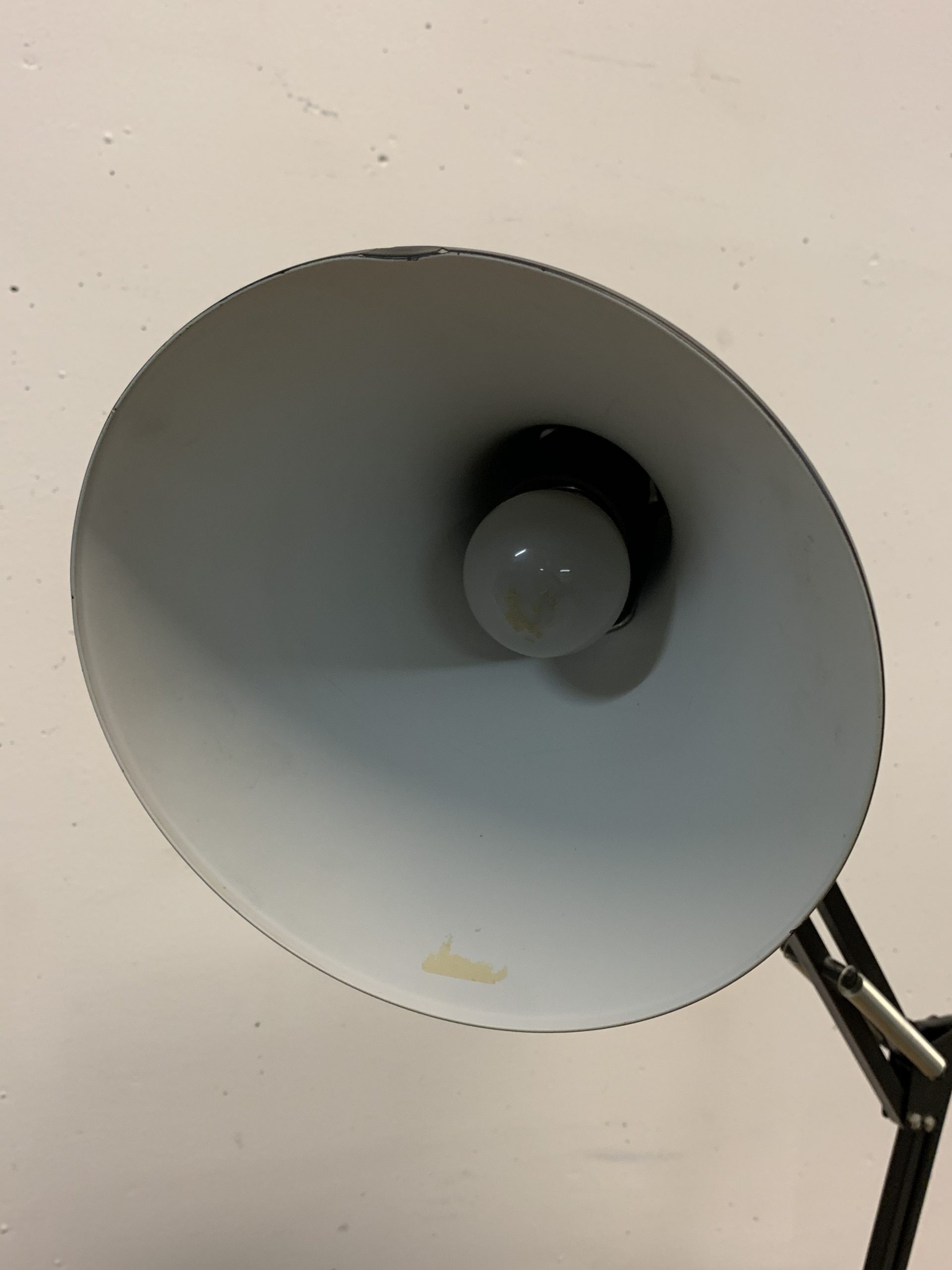 Produit venduLampe d’architecte vintage montée sur son pied. Le mécanisme d’inclinaison de la lampe fonctionne très bien. L’état général est bon: les seuls défauts visibles sont une petite bosse sur le chapeau de la lampe ainsi qu’une cassure minuscule sur le pied en plastique. Le bouton pour allumer la lampe est un petit peu tordu. Convient pour des ampoules standards E27 (non fournie).