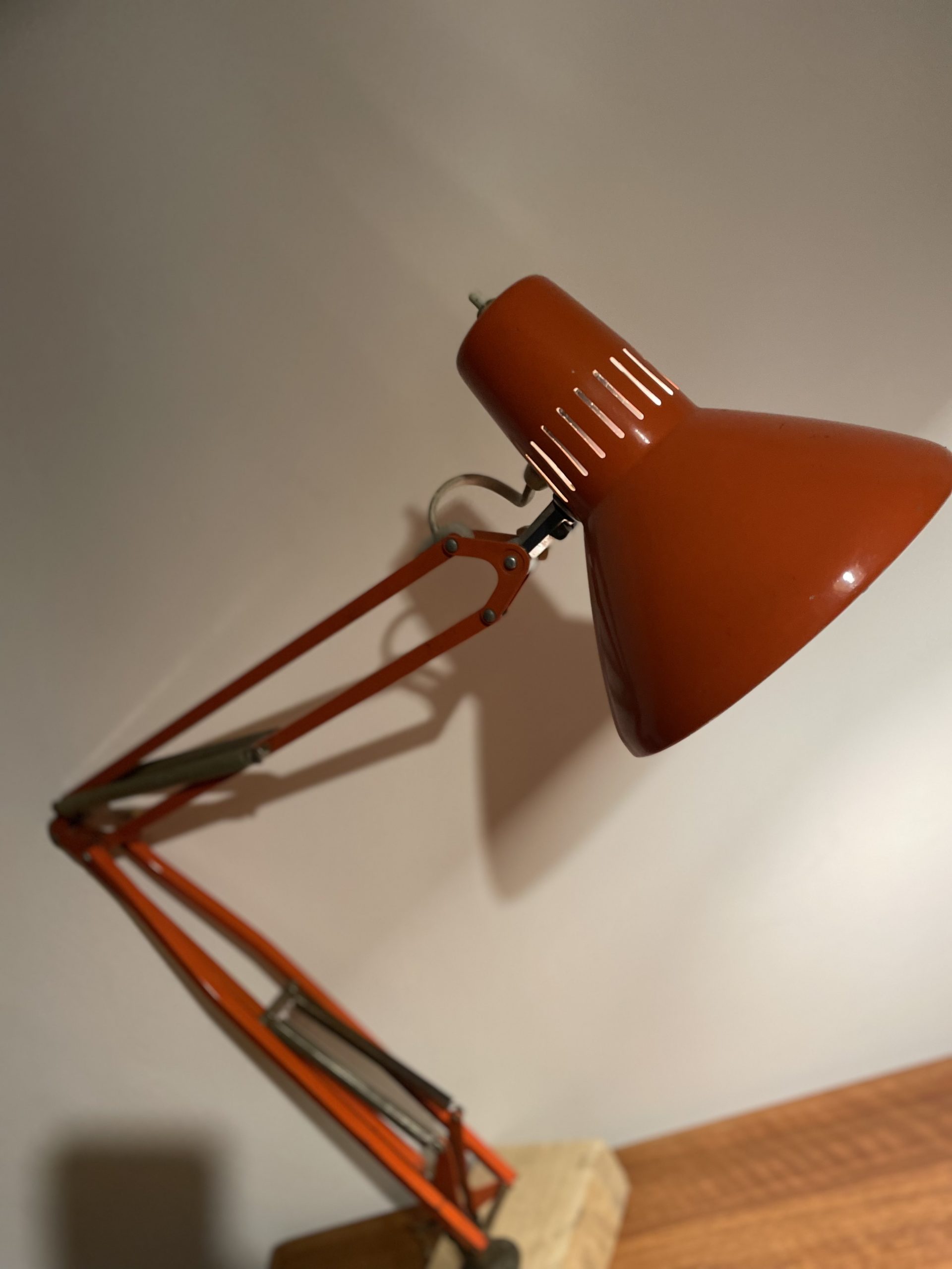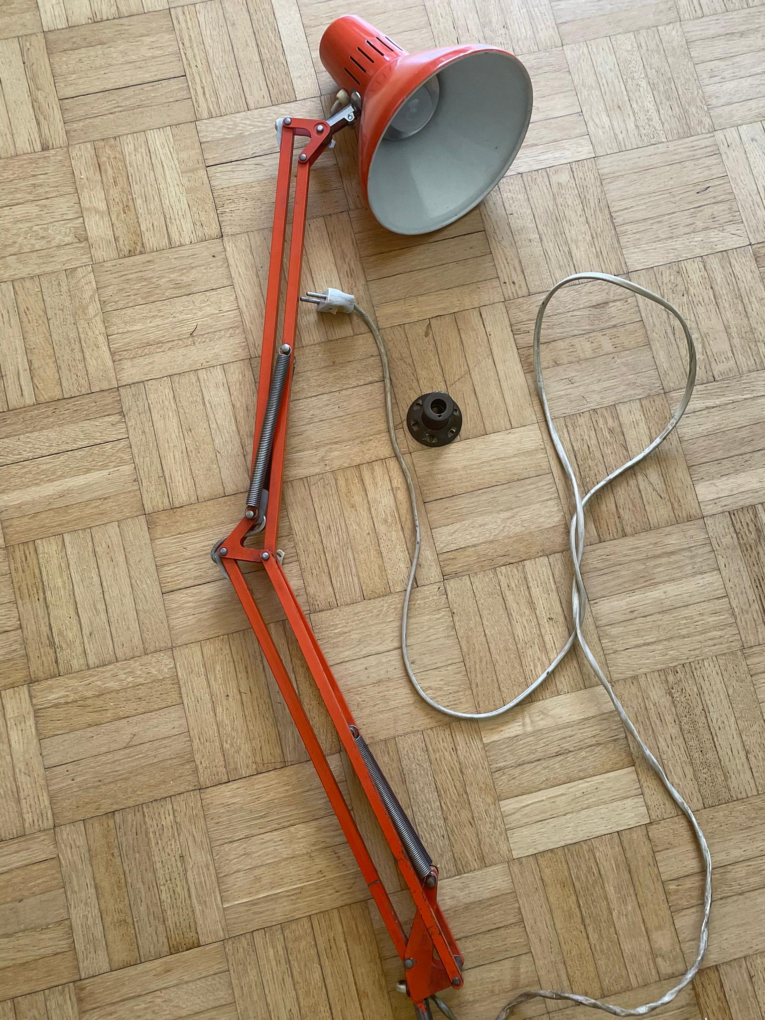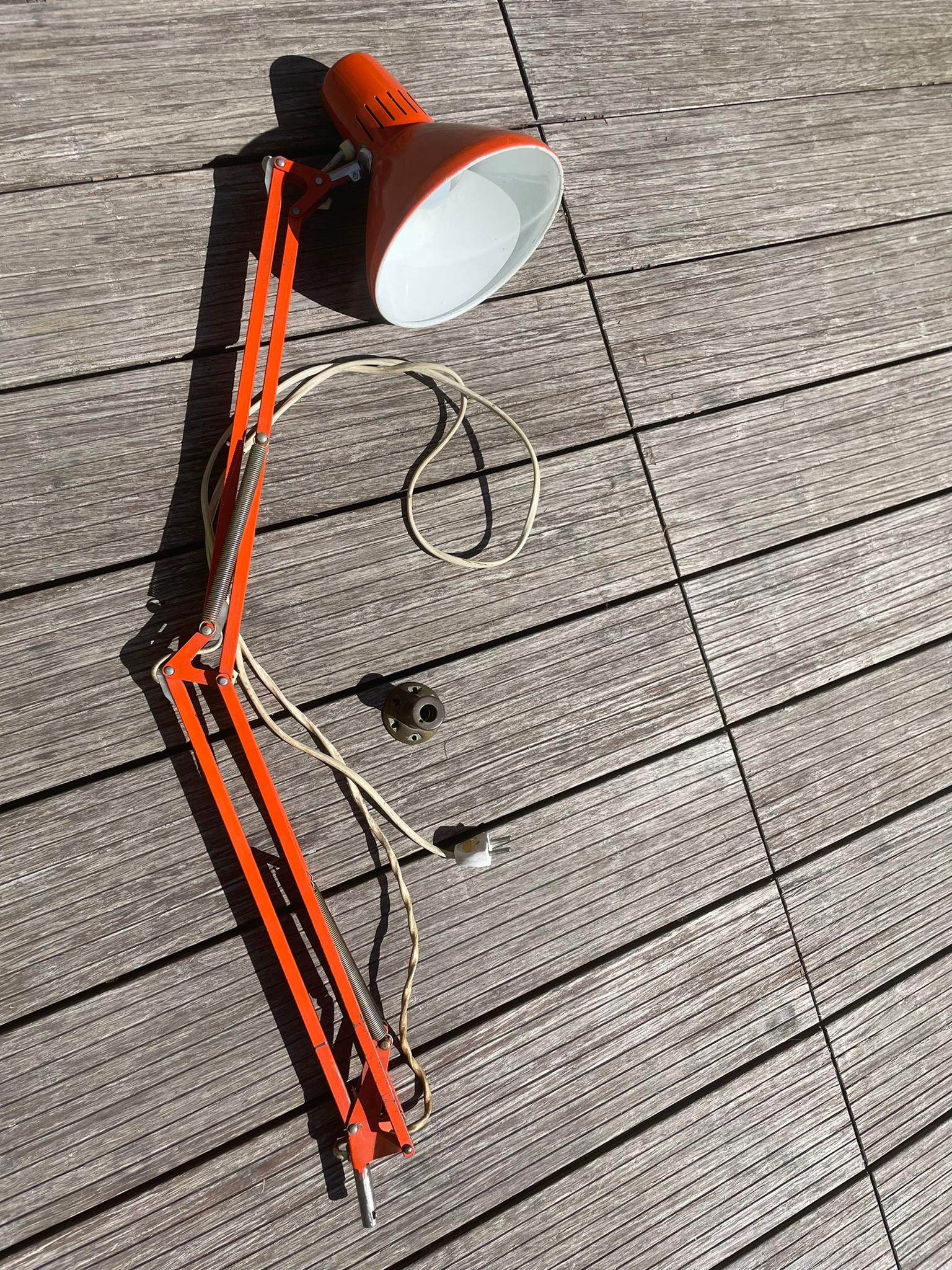 Produit venduLampe d’architecte vintage de couleur orange. Marque Ledu. Made in Sweden. Elle se fixe avec des vis sur un bureau ou meuble (sur la photo elle est juste fixée sur un bout de bois pour la maintenir debout.)
