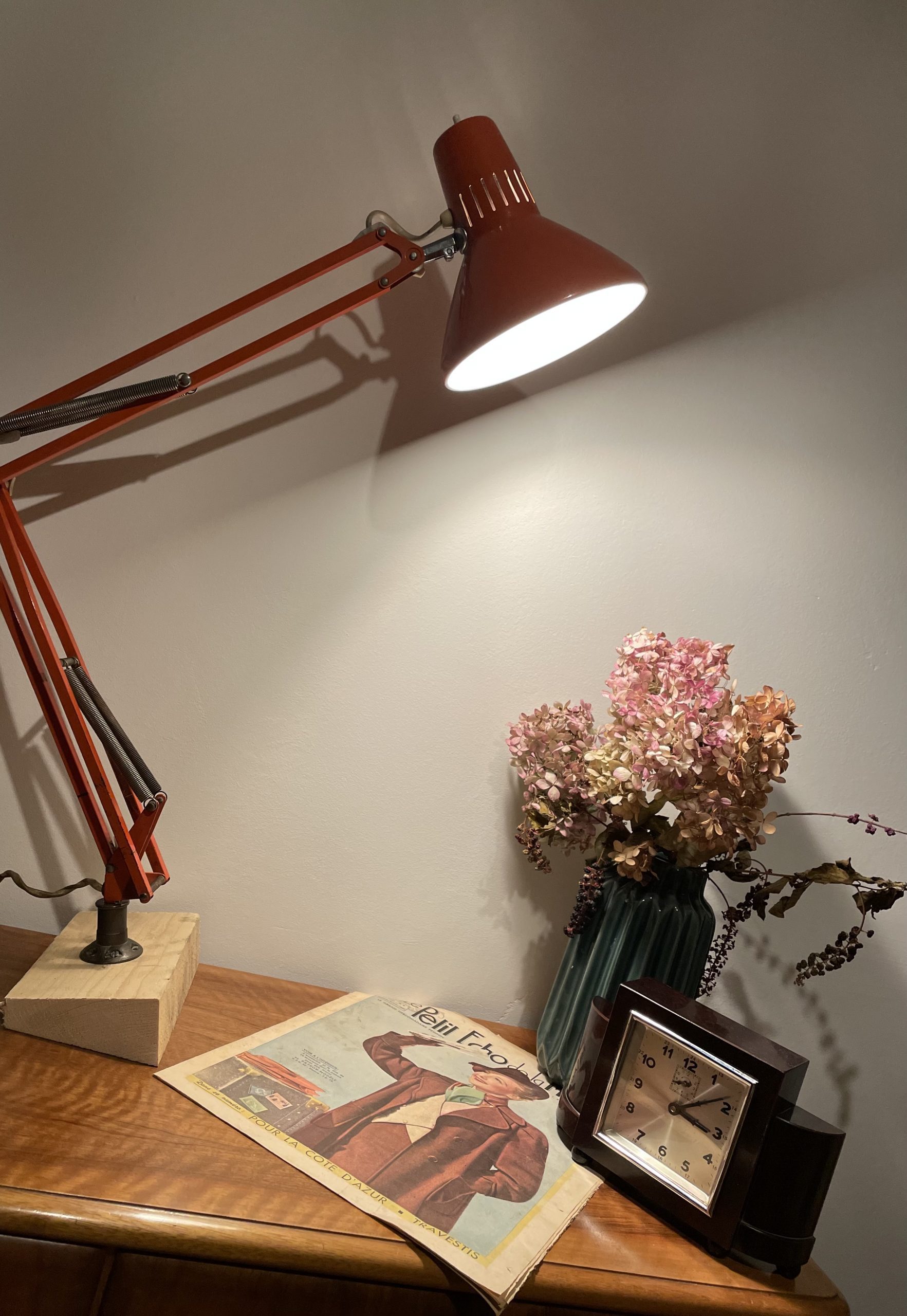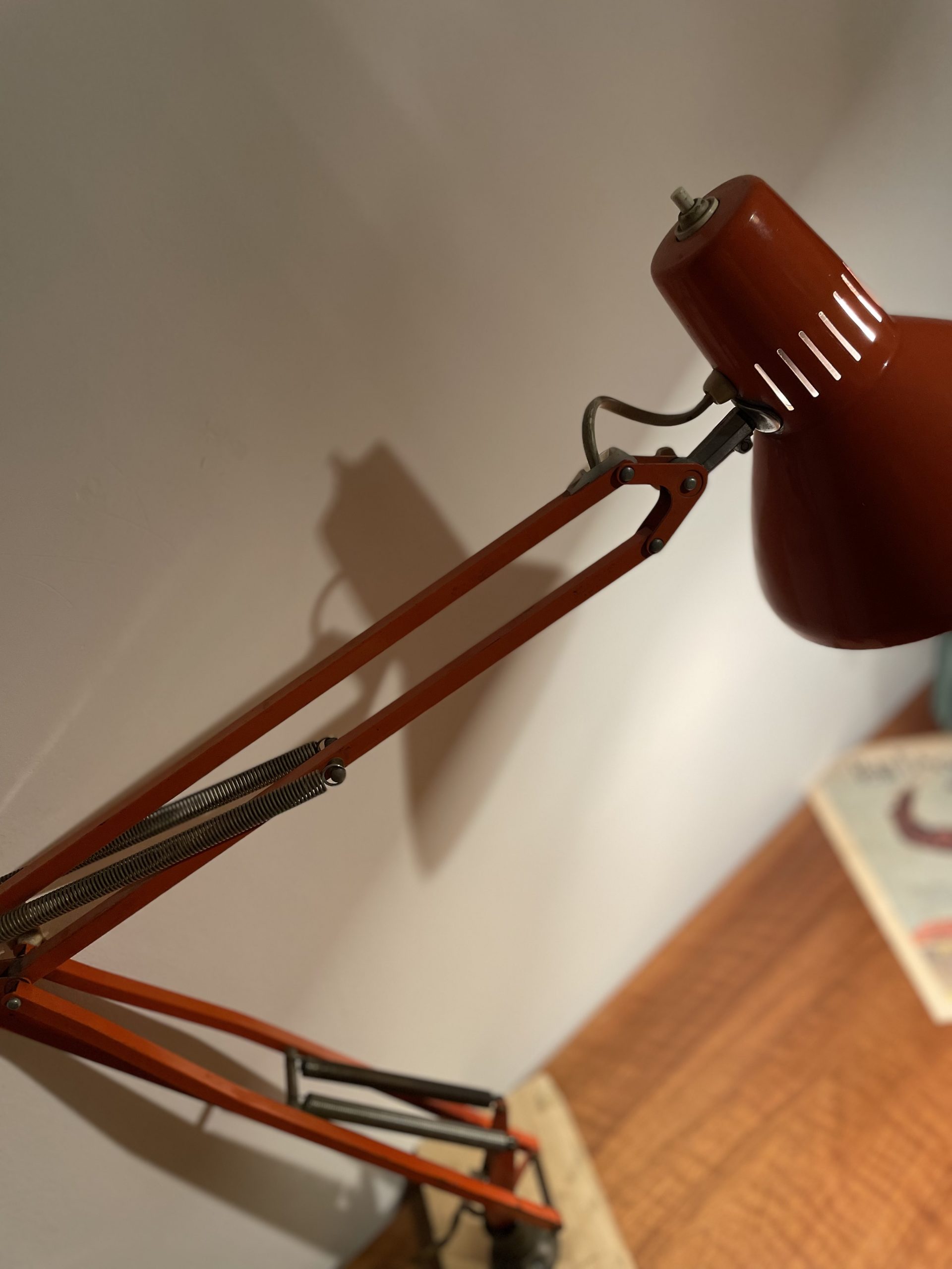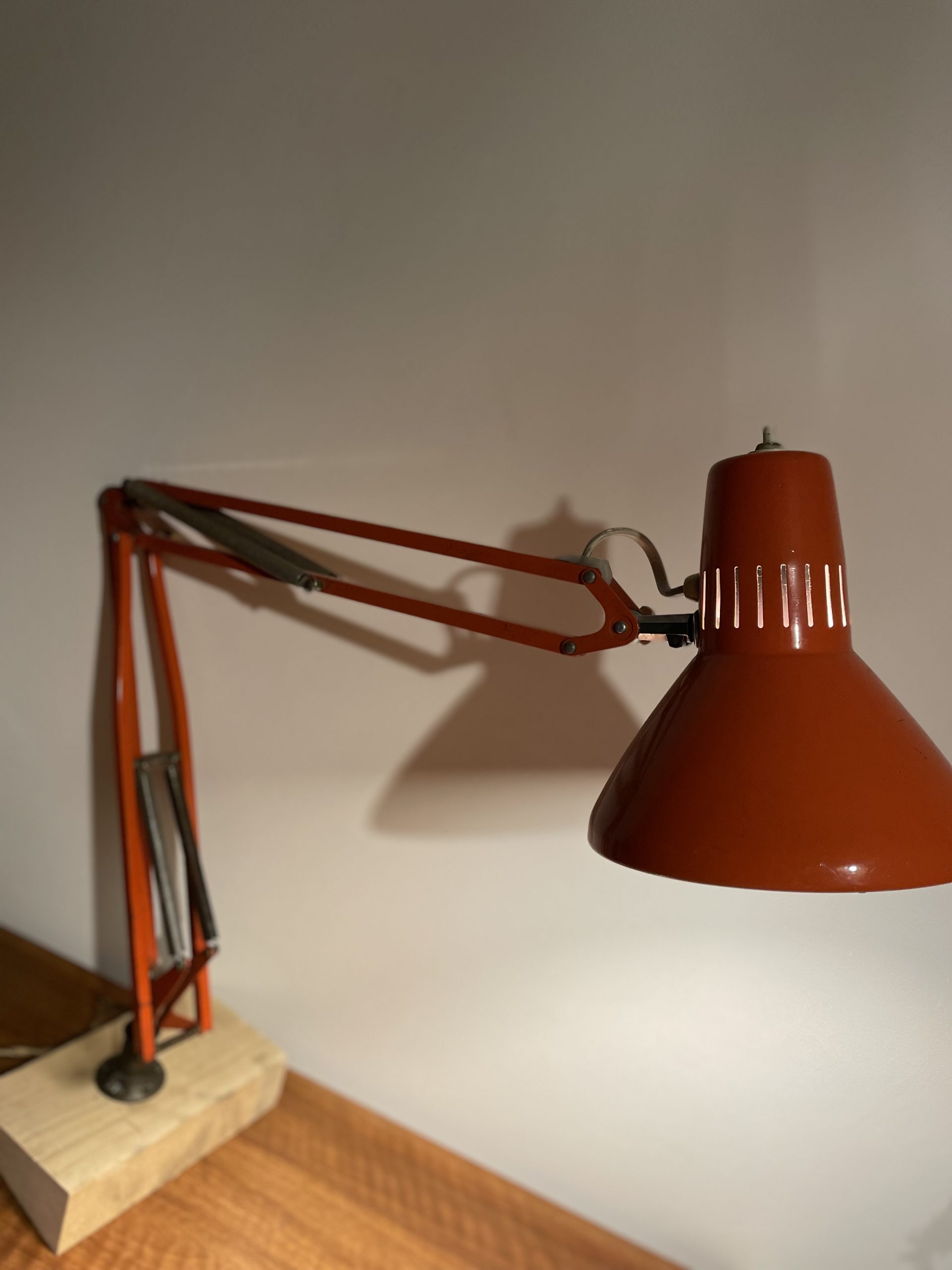 Produit venduLampe d’architecte vintage de couleur orange. Marque Ledu. Made in Sweden. Elle se fixe avec des vis sur un bureau ou meuble (sur la photo elle est juste fixée sur un bout de bois pour la maintenir debout.)