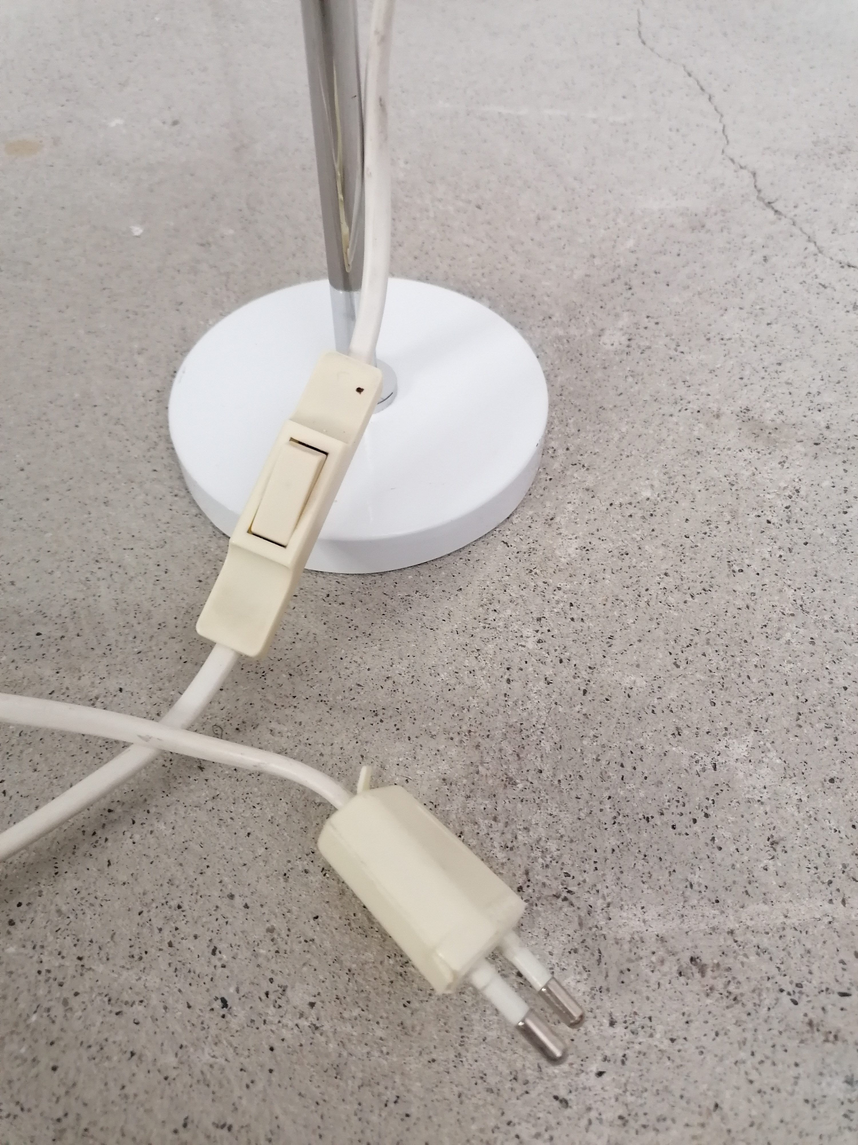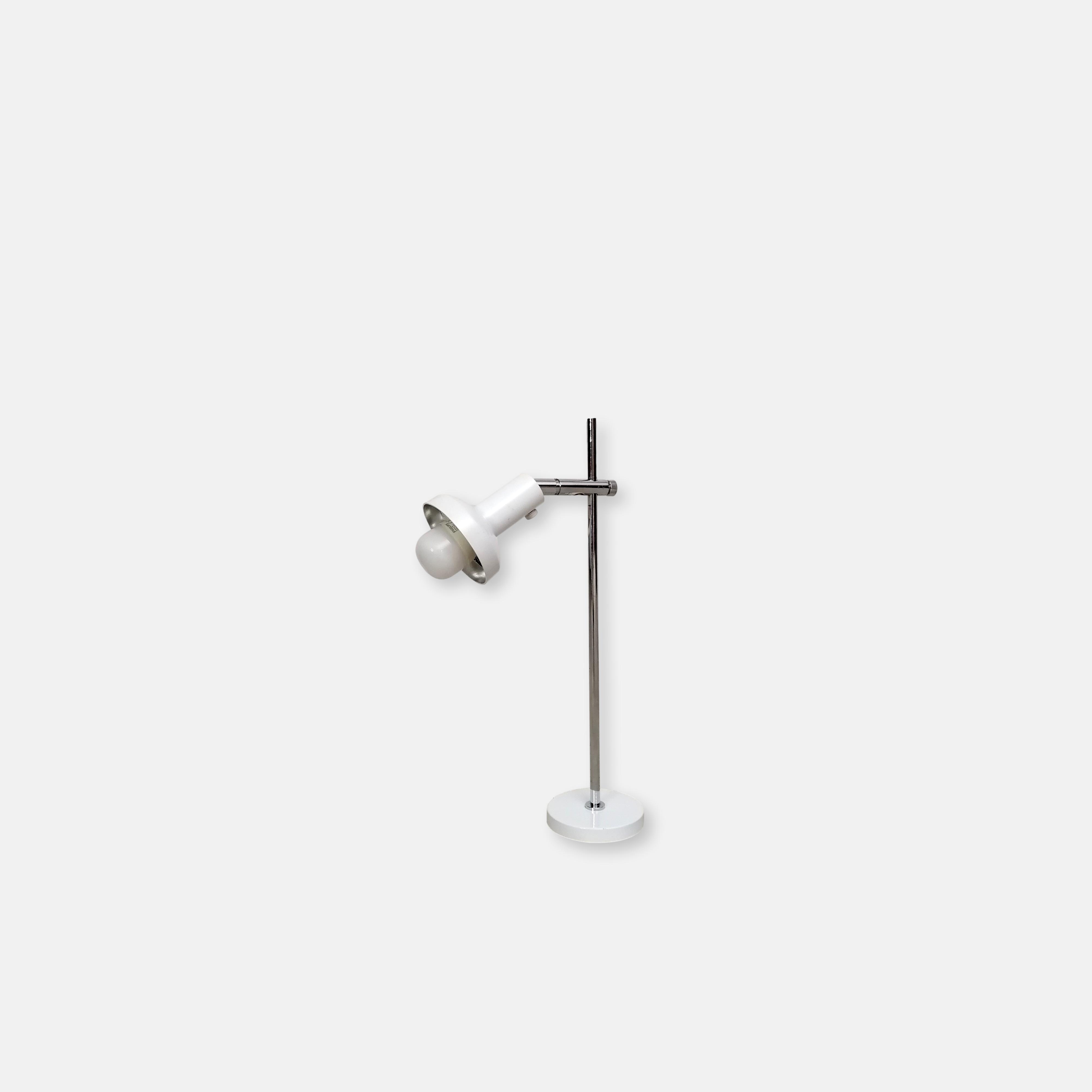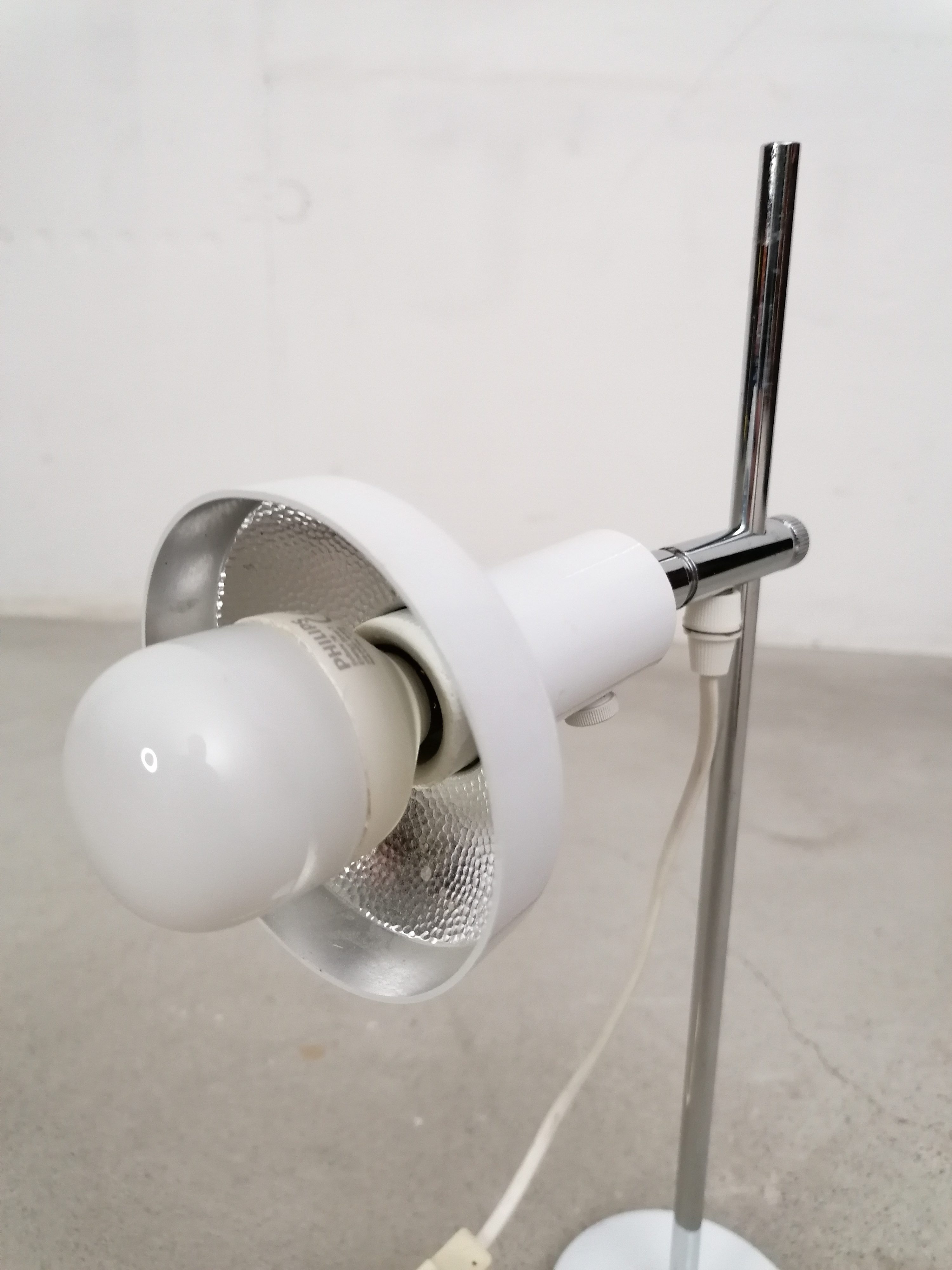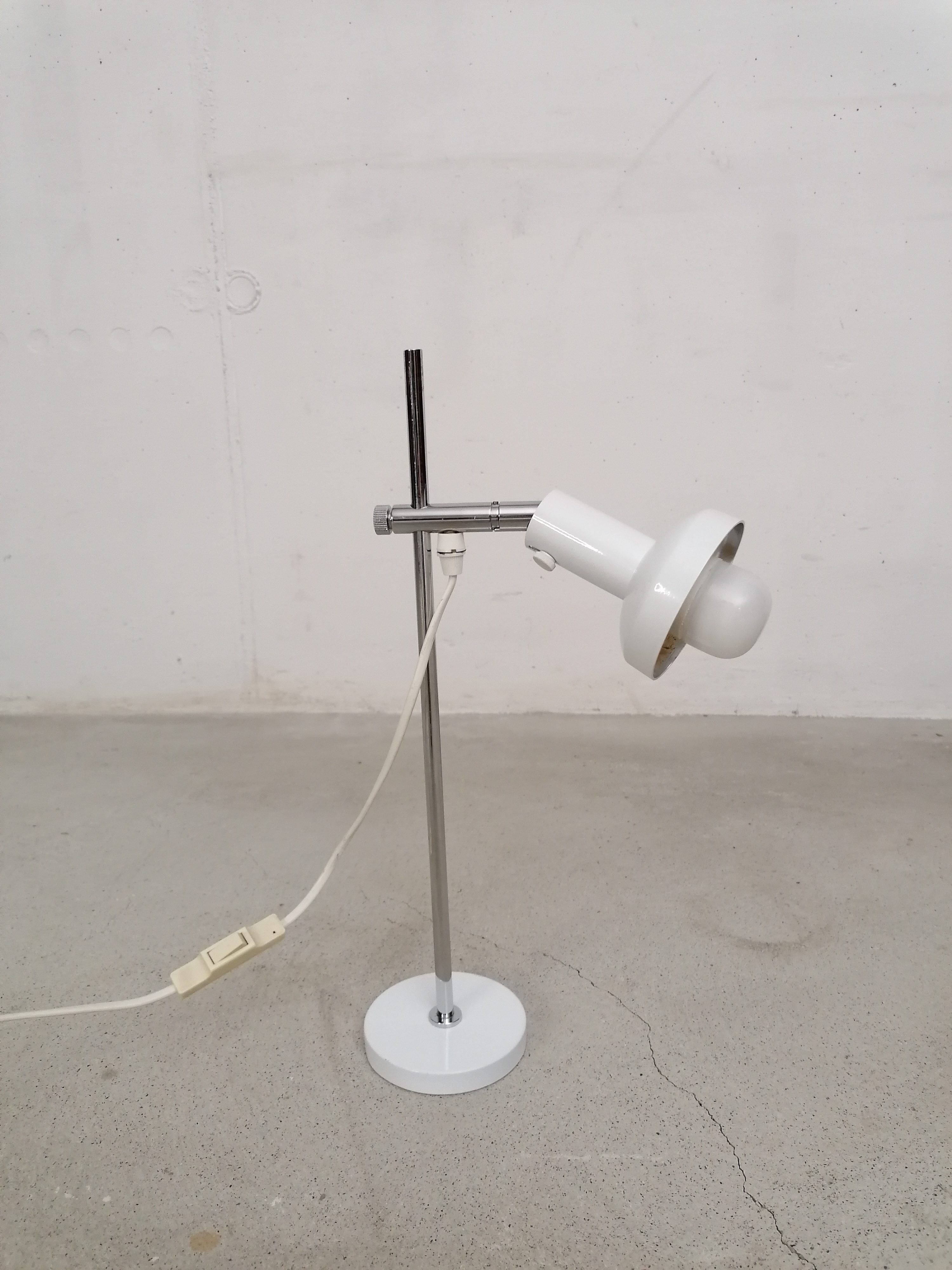 Produit venduLampe de table vintage avec spot et socle en métal blanc et tige en métal chromé. L’abat-jour peut être orienté dans toutes le directions et la hauteur est réglable. Interrupteur sur le fil.