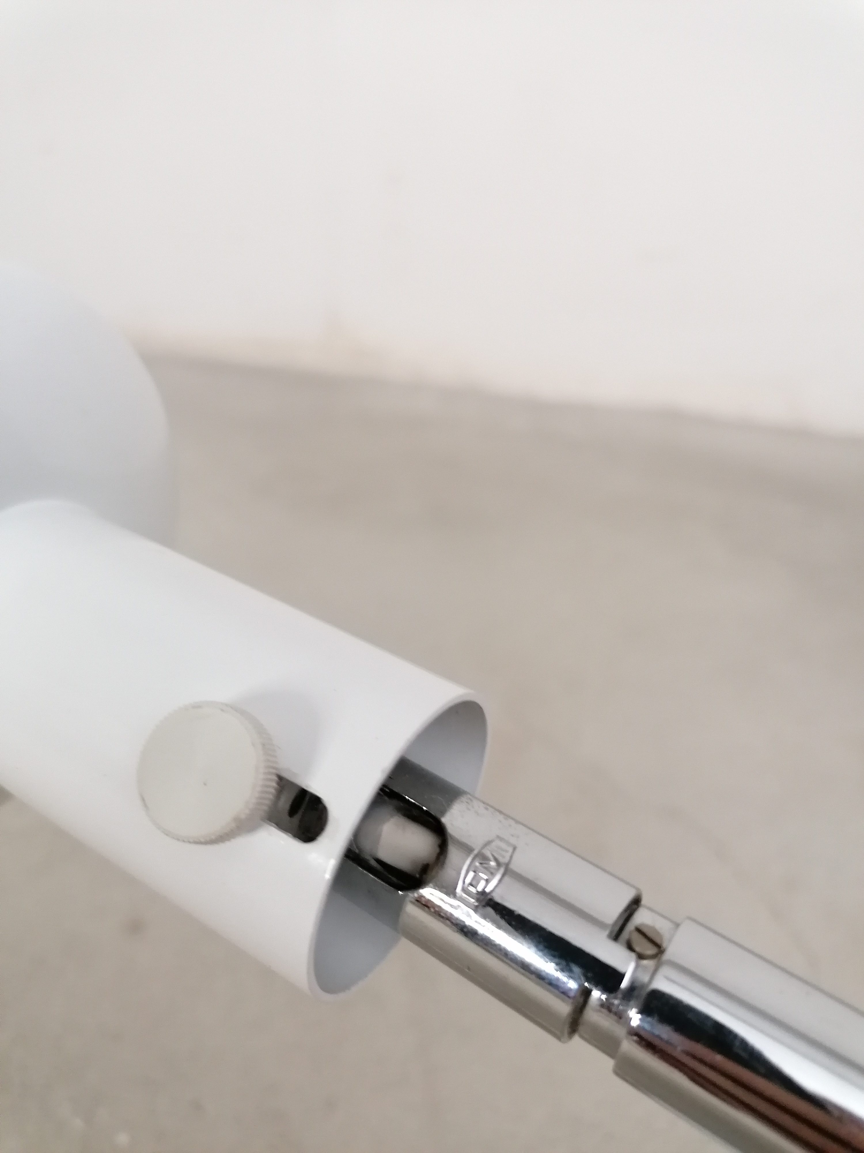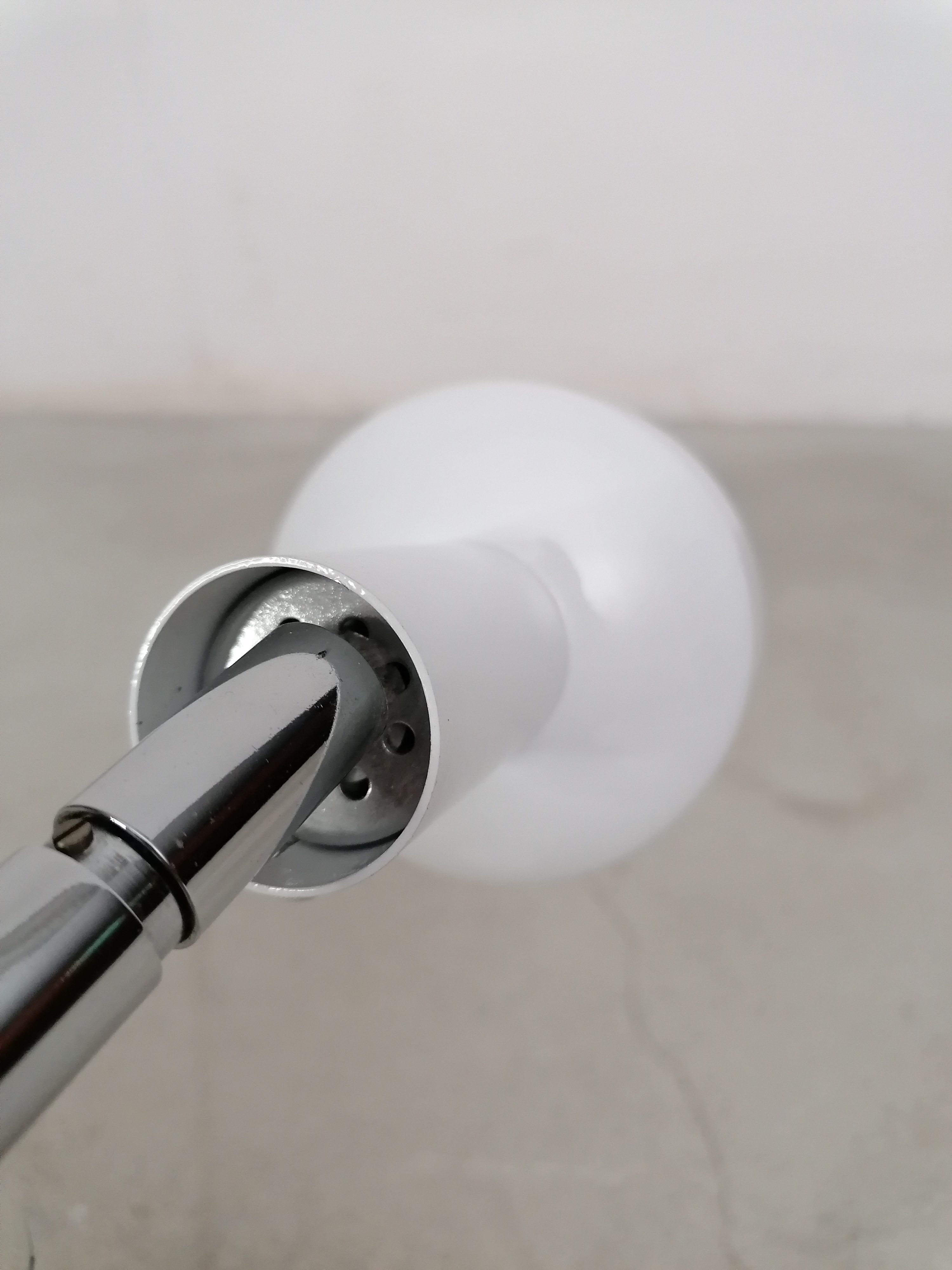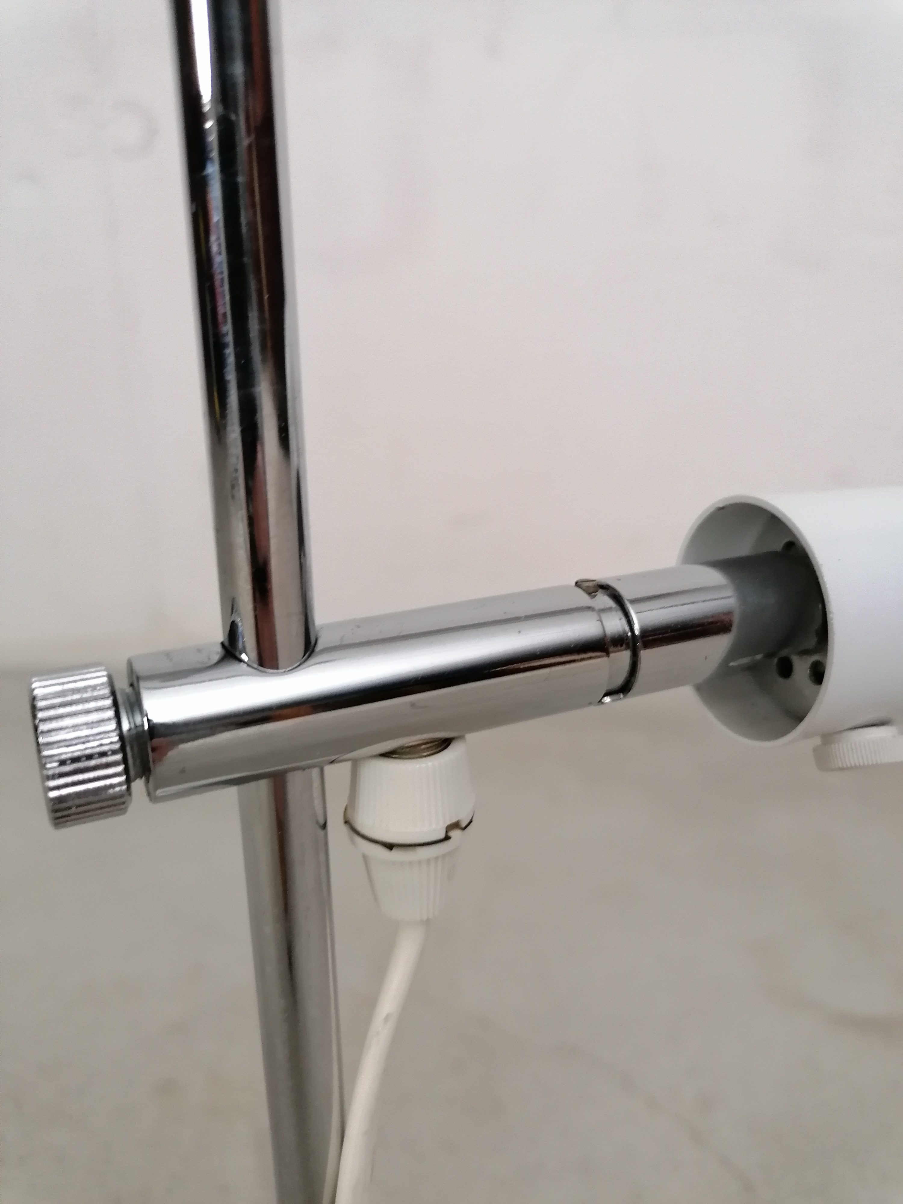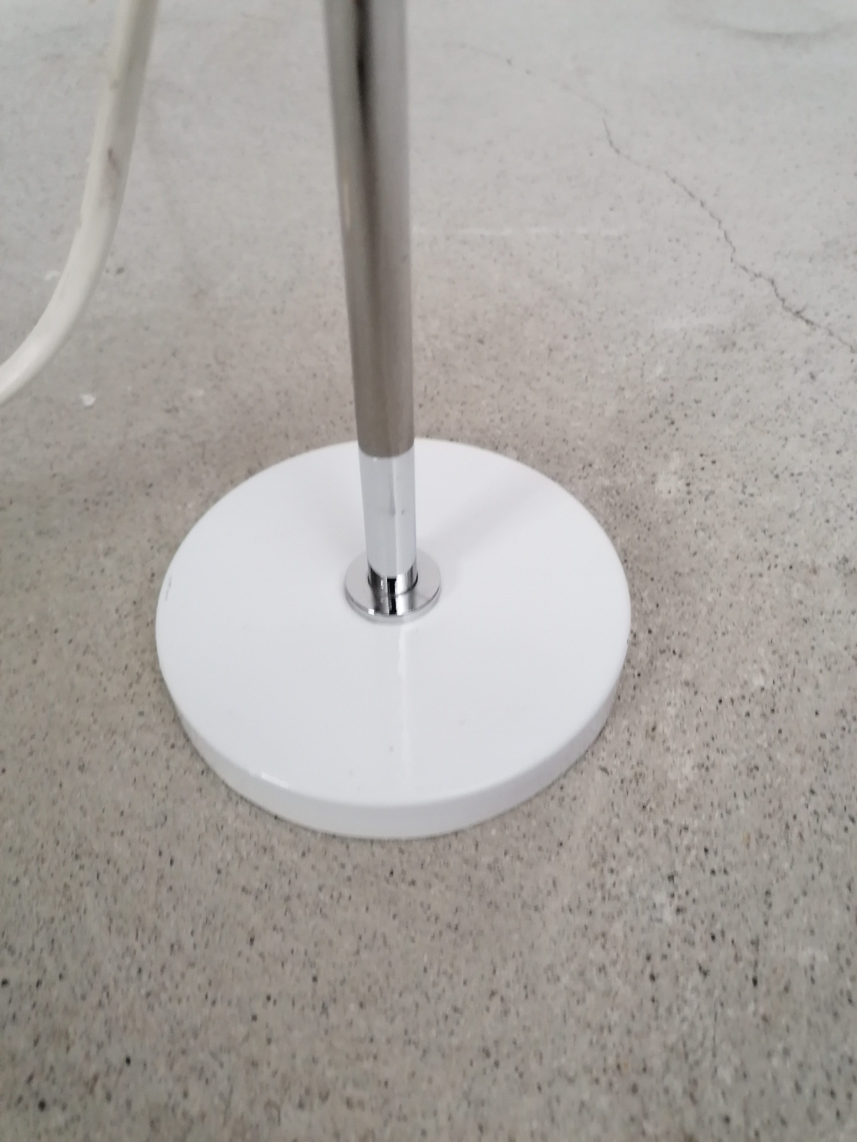 Produit venduLampe de table vintage avec spot et socle en métal blanc et tige en métal chromé. L’abat-jour peut être orienté dans toutes le directions et la hauteur est réglable. Interrupteur sur le fil.