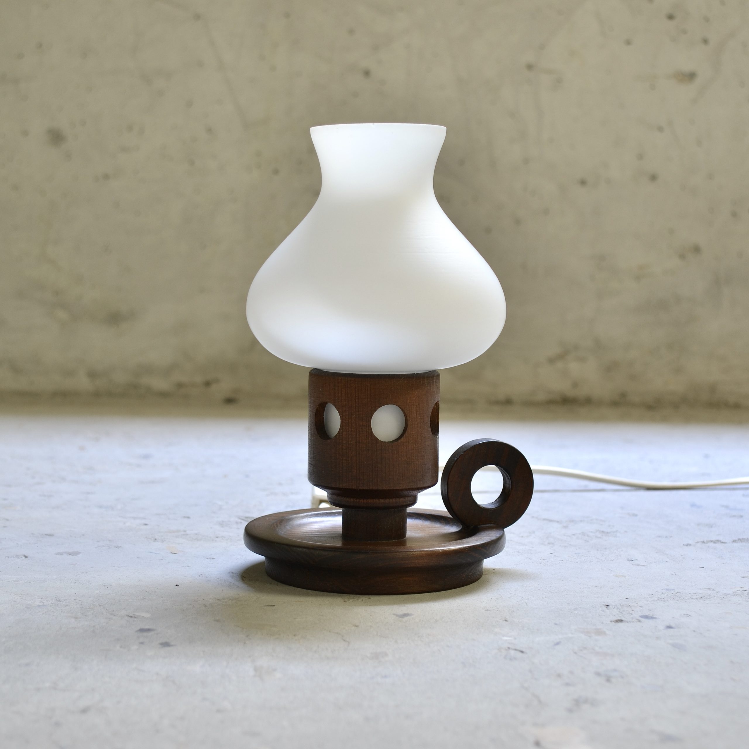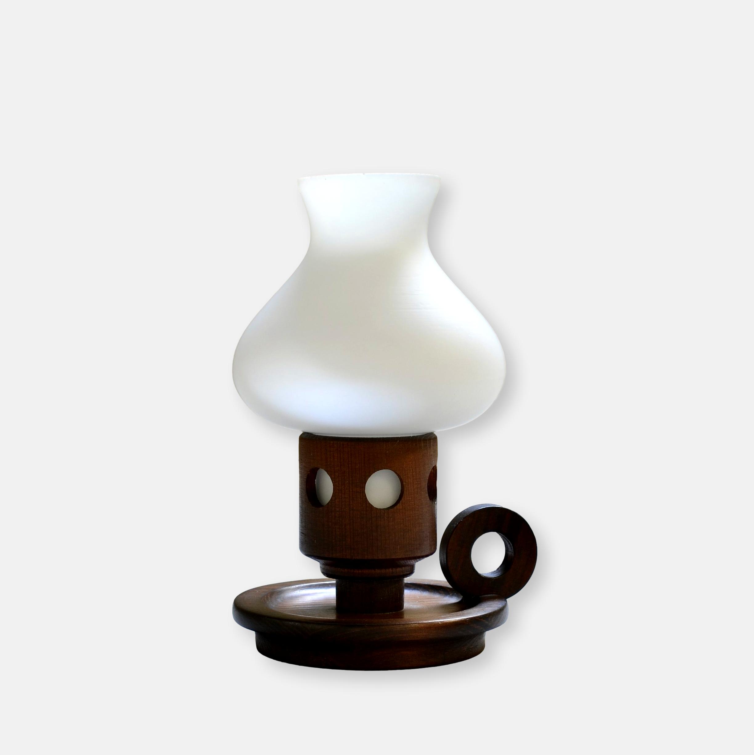 Une lampe à huile des “temps modernes” qui esthétiquement mise sur des formes géométriques épurées en associant un abat-jour en verre opaline avec un support en pin.