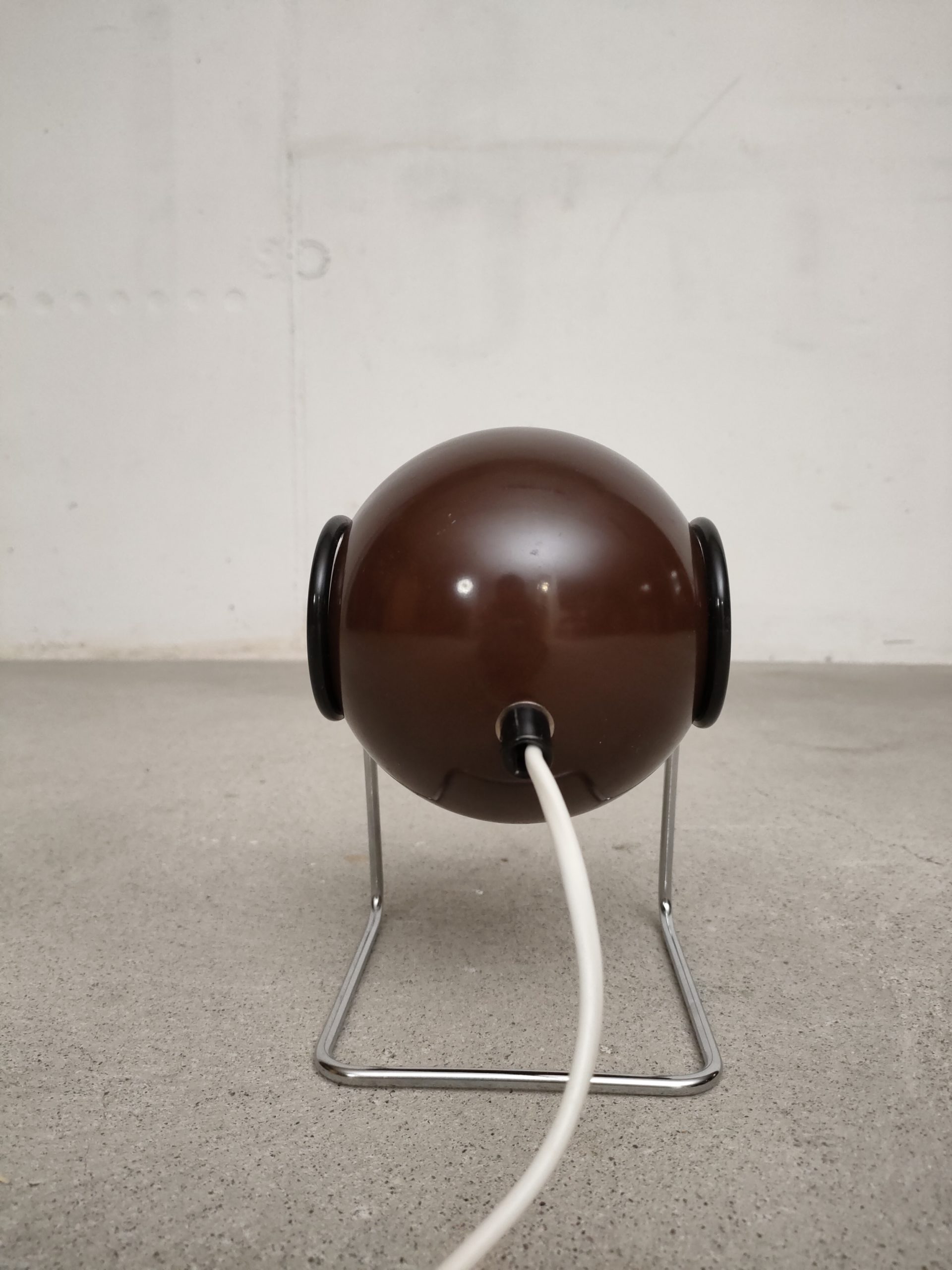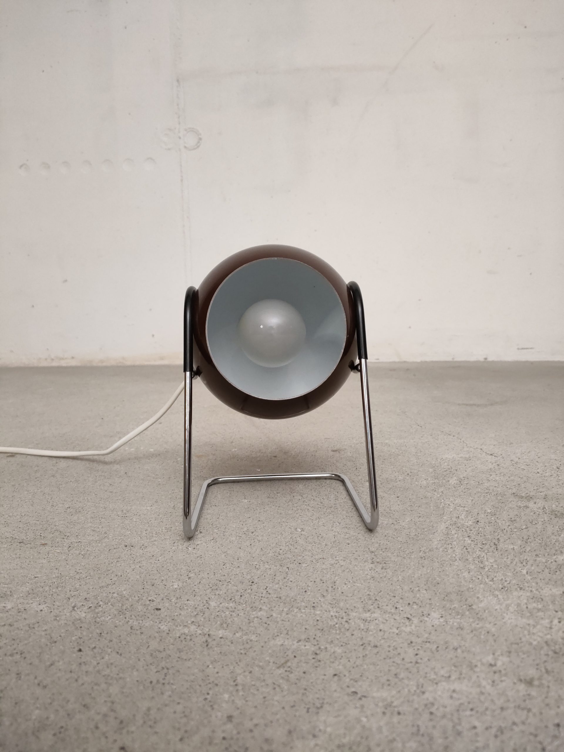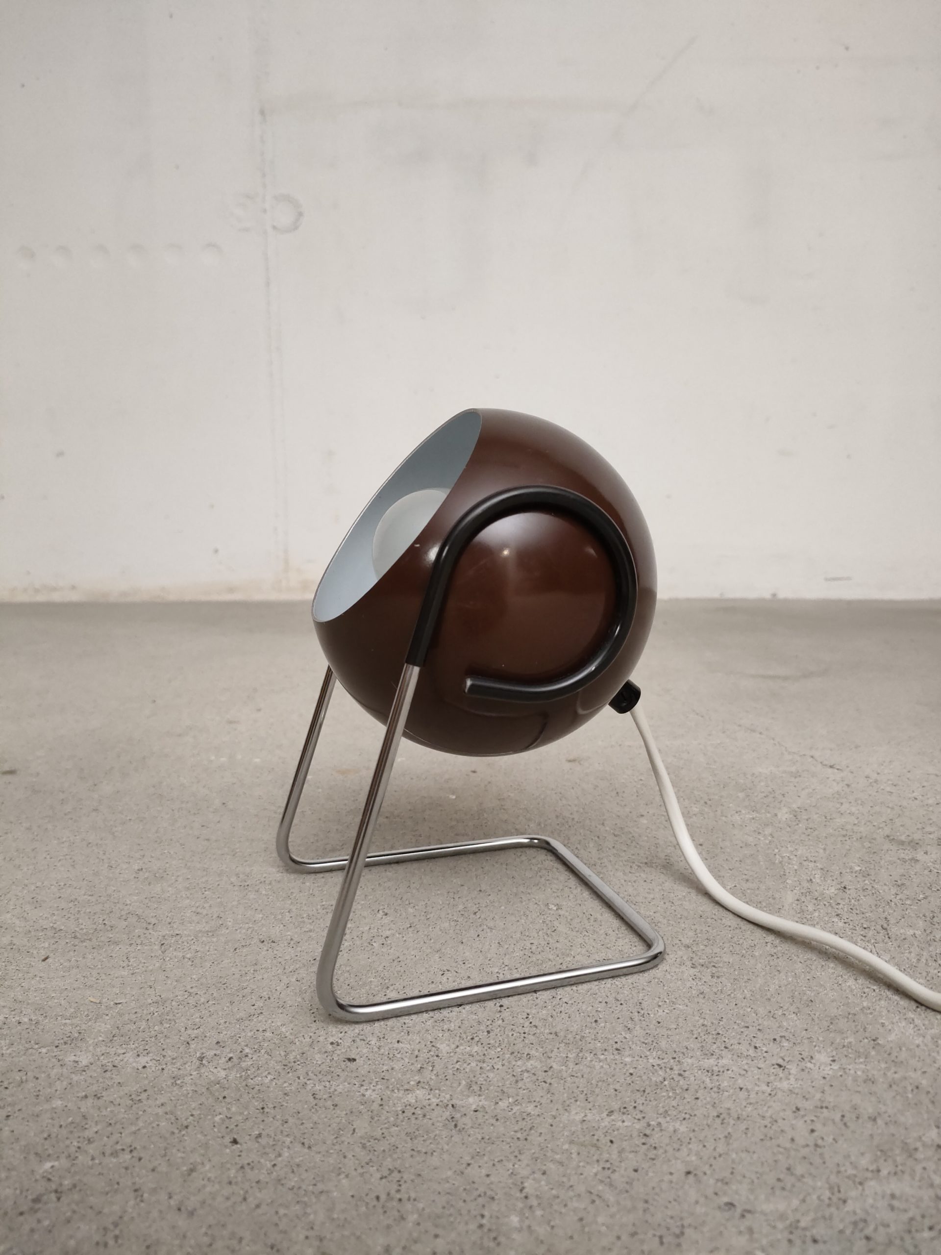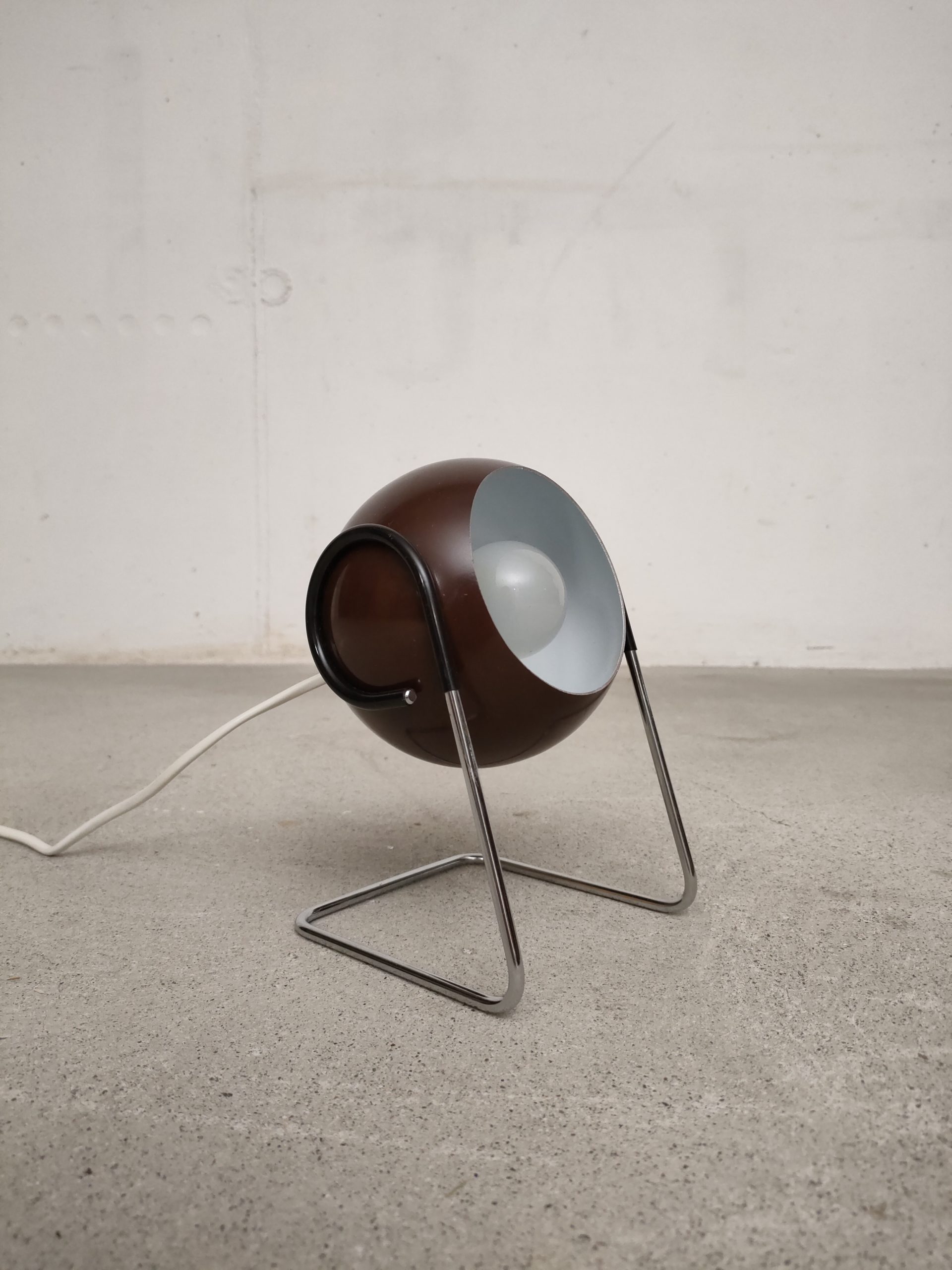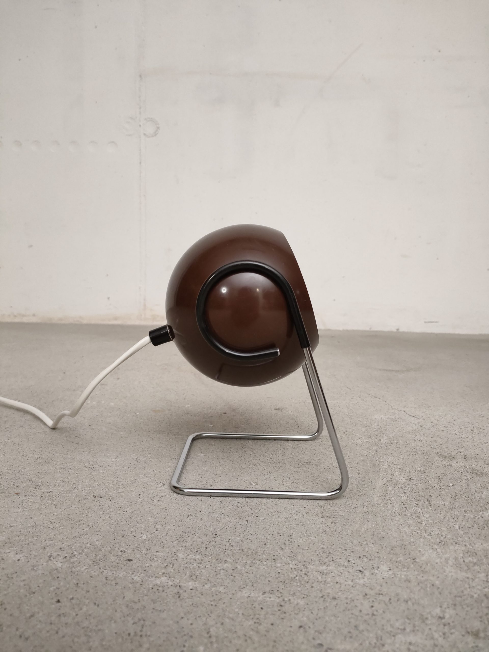 Produit venduLampe de table vintage de type Eyeball avec boule orientable en métal marron et support en métal chromé. Interrupteur sur le câble. Elle fonctionne avec une ampoule de type E14 (non fournie).